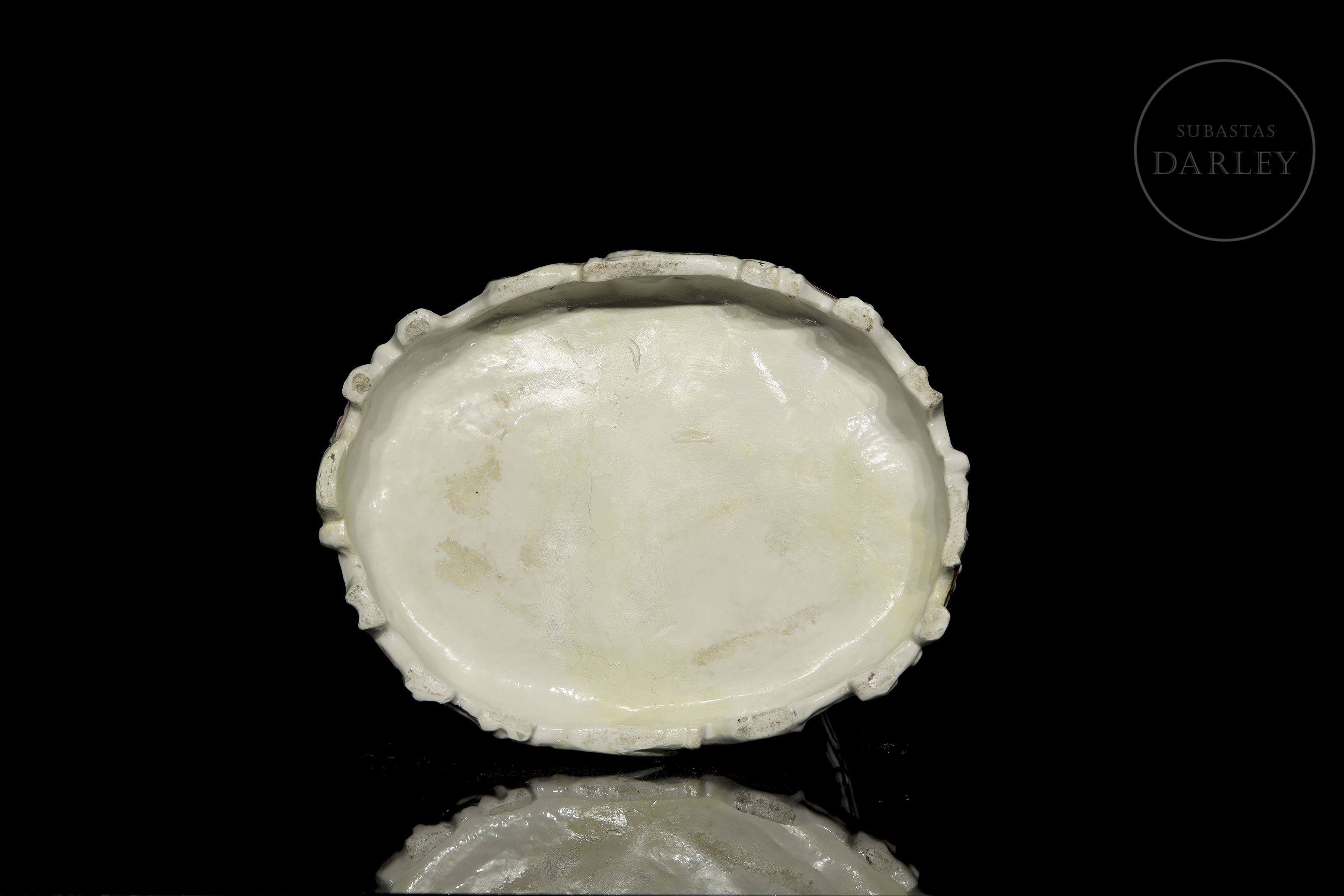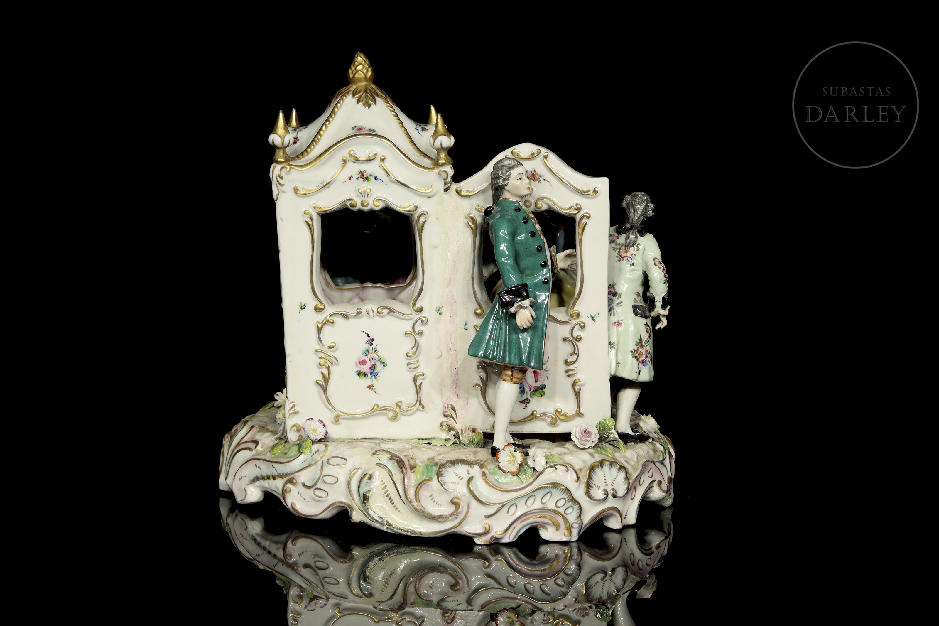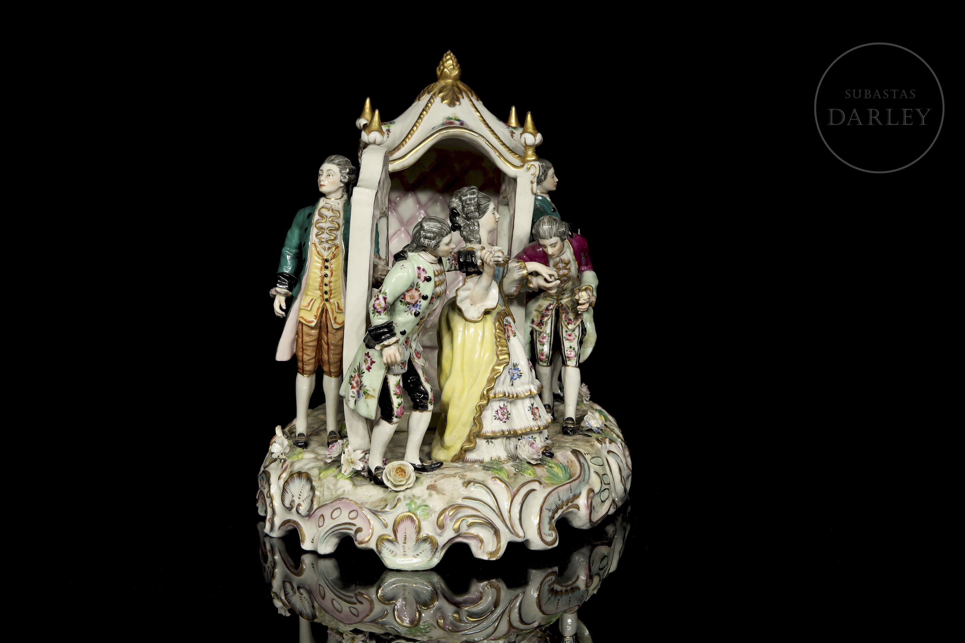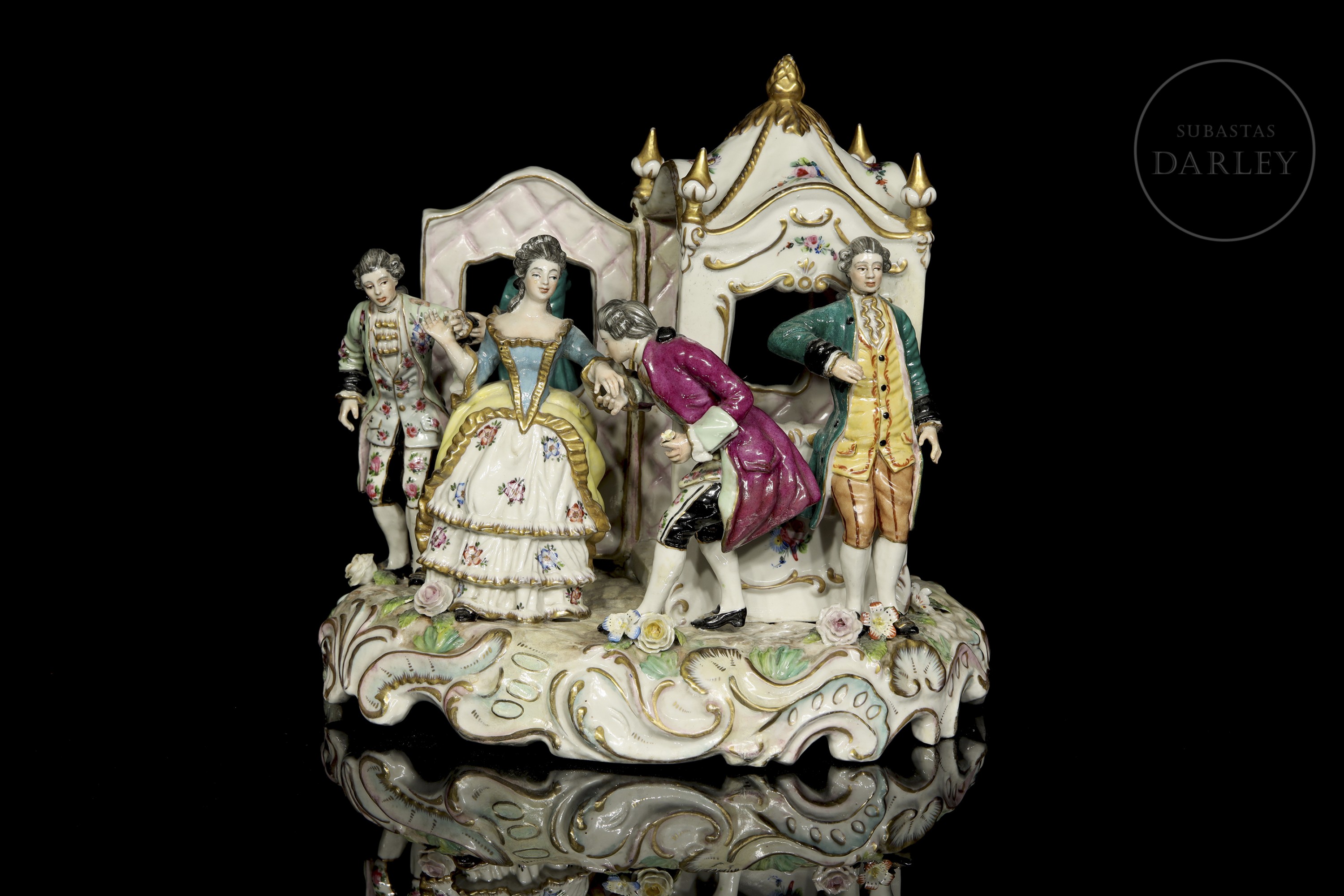 乌特韦斯巴赫瓷厂瓷雕组,描绘精巧的动物拉车,配有两位风度翩翩的人物——一位女士与一位绅士。彩绘作品,装饰繁复的洛可可细节。存在缺损及多次修复痕迹。