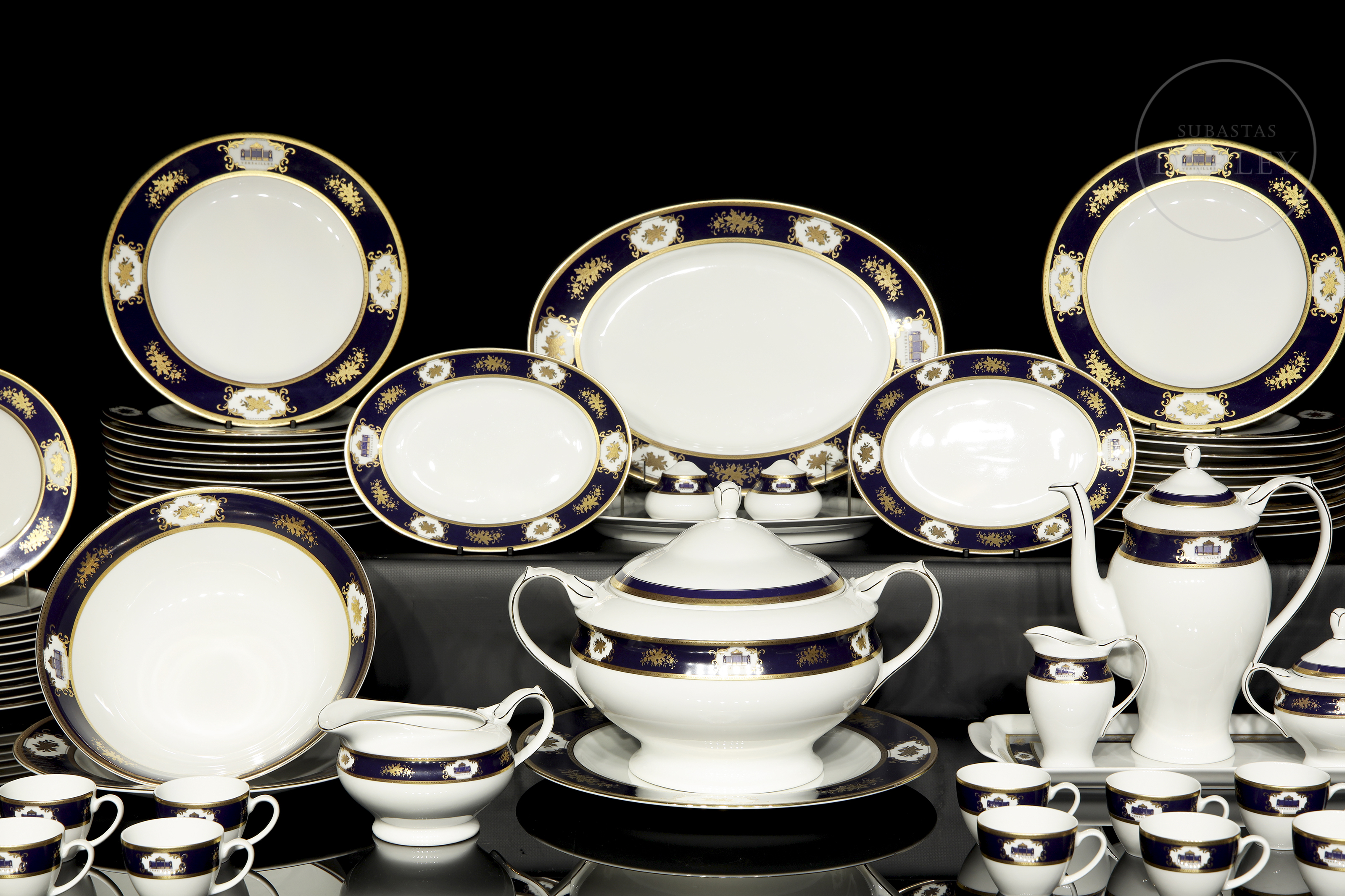 Fine porcelain. White porcelain tableware with a wide decorative band in cobalt blue and gold plant motifs. It consists of tea cups with saucers (12), coffee cups with saucers (12), soup bowls (10), oval platters of various sizes (4), milk jug (1), sugar bowl (1), teapot (1), coffee pot (1), salt and pepper shakers on a tray (1), gravy boat (1), soup tureen (1), and four sets of plates (12). Stamped “Versailles Collection Fine Porcelain” on the base.