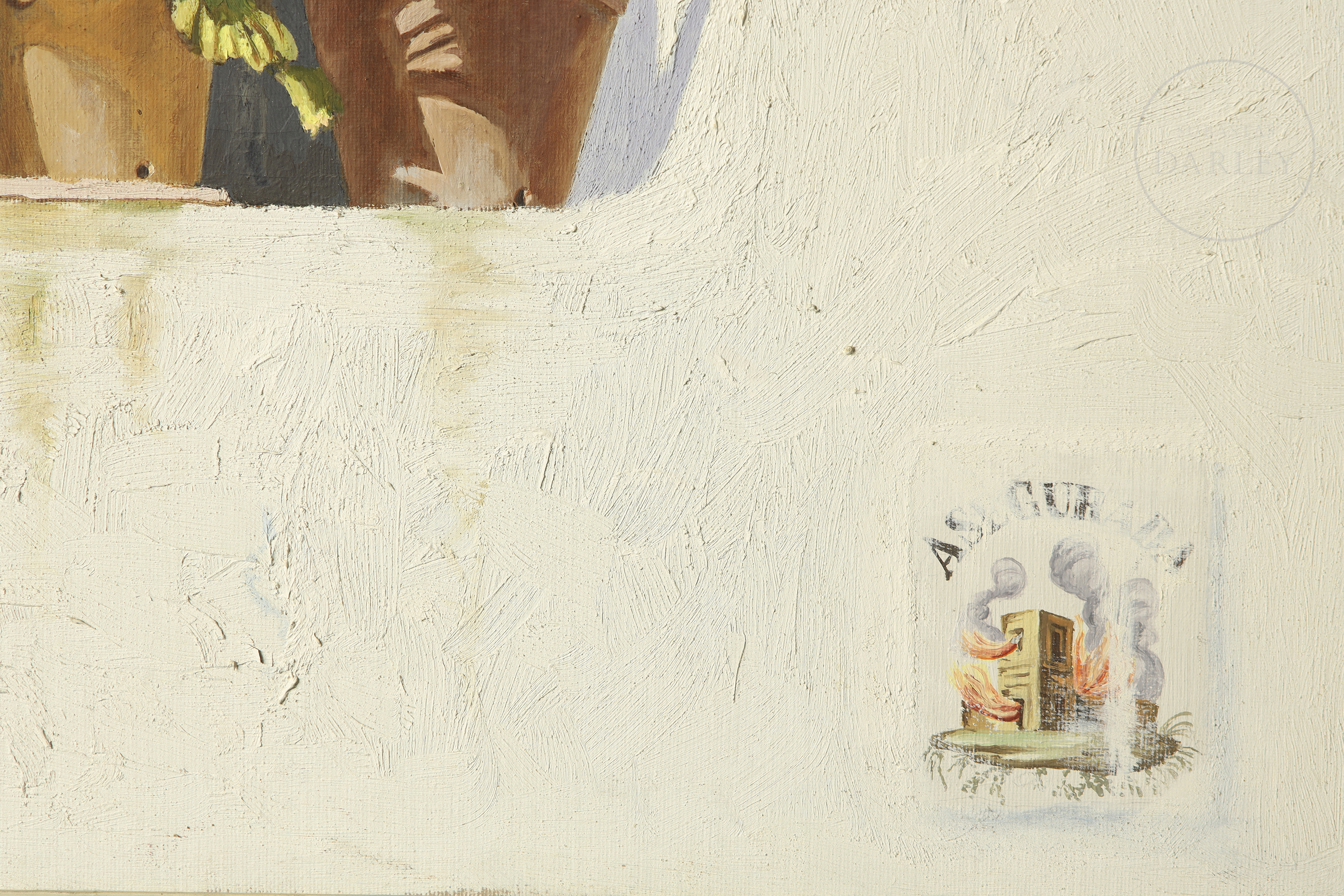 油画布。画面描绘一扇窗户及白墙房屋的屋顶,窗台上摆放着两个花盆,窗玻璃上有一道裂痕。作品左下角签名“Moreno i Mira”。背面签名、题名并注明日期。