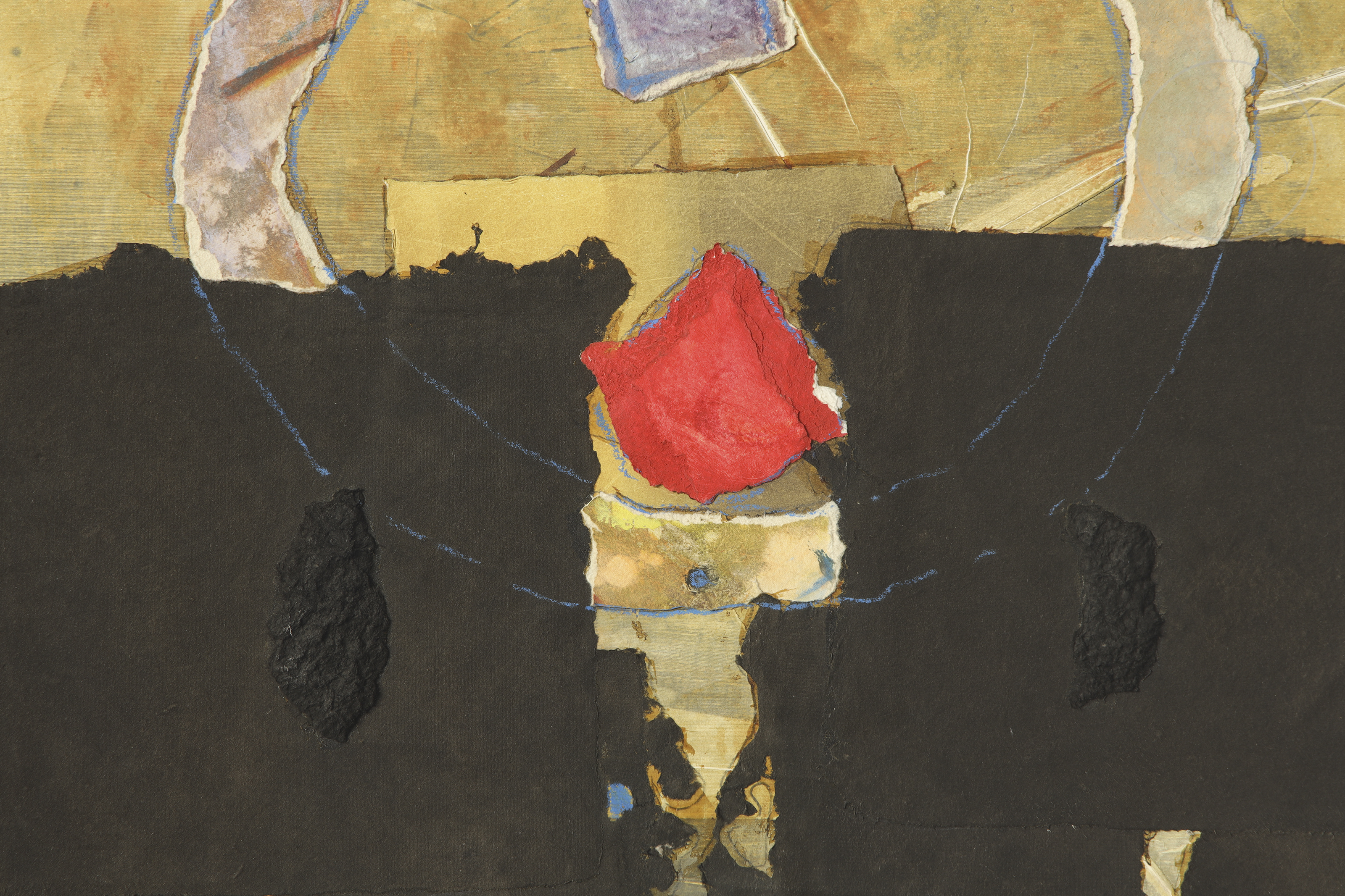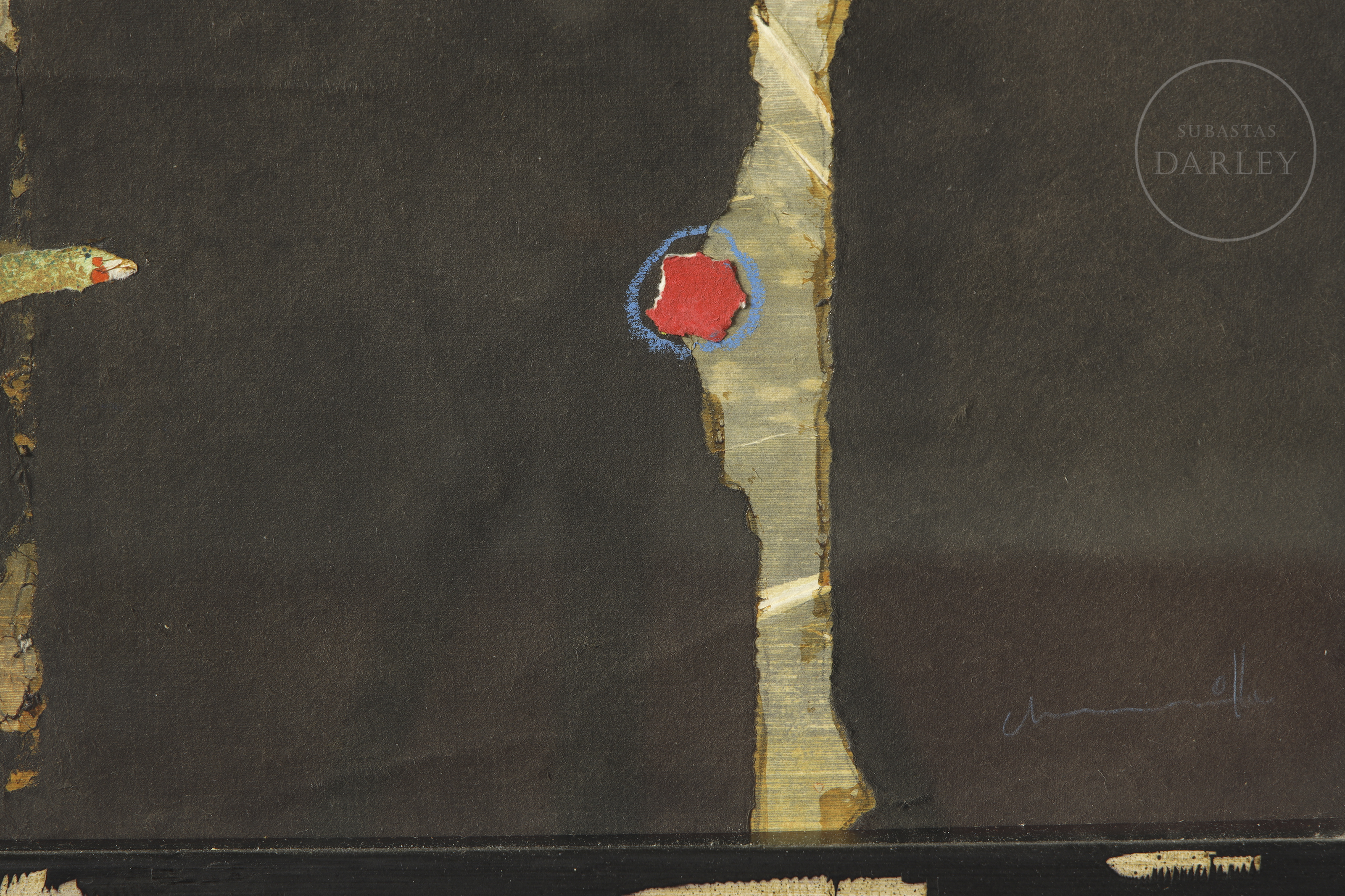 混合媒介与纸上拼贴。右下角签名“Chumilla”。