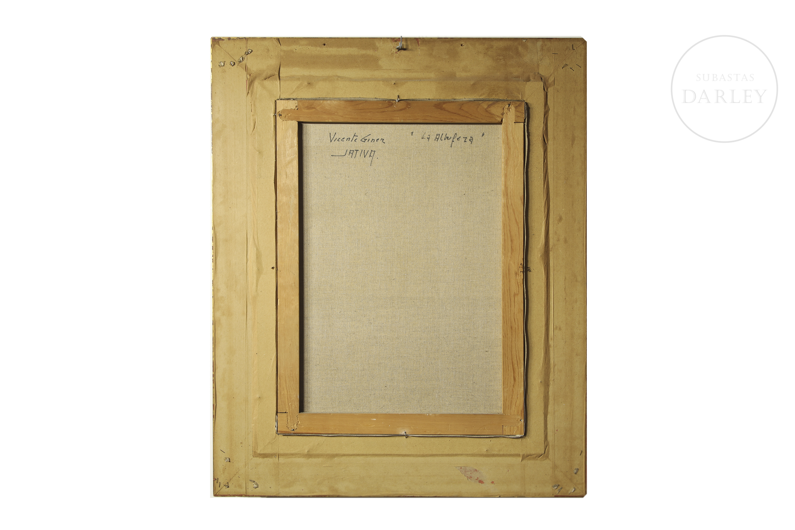 油画布。描绘阿尔布费拉水畔传统场景:身披披肩的母亲与戴草帽的女孩。右下角签名“Vicente Giner”。