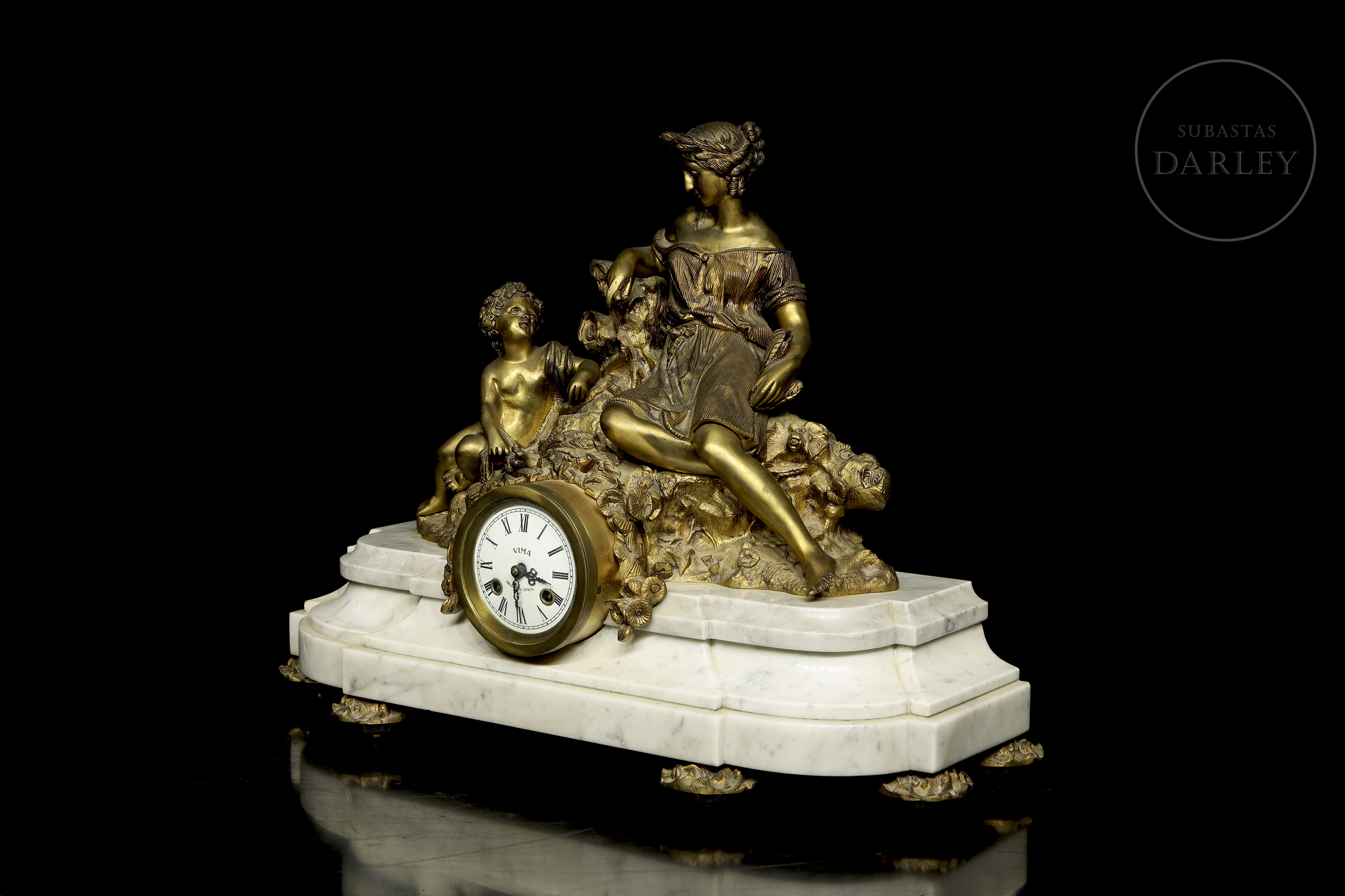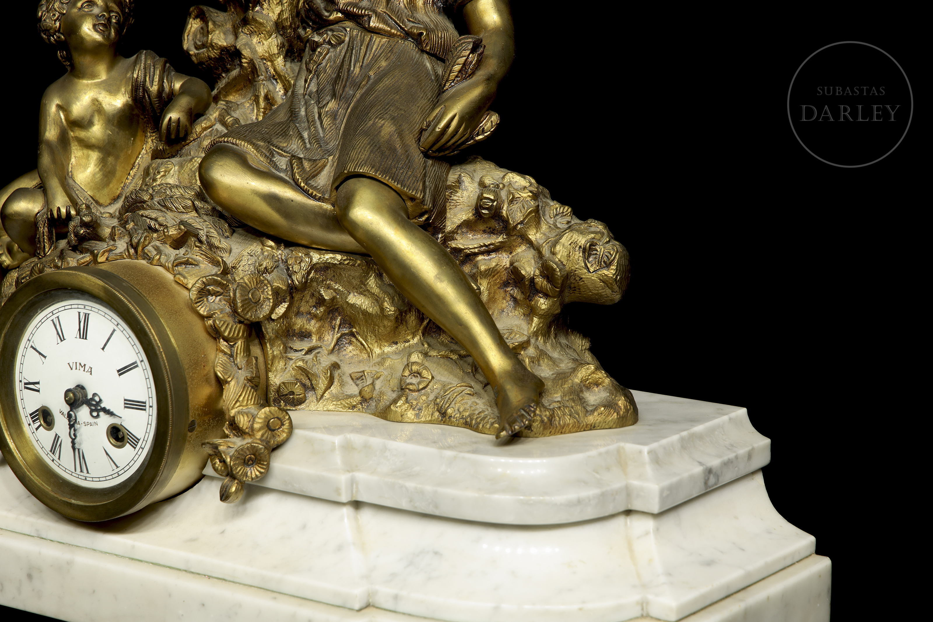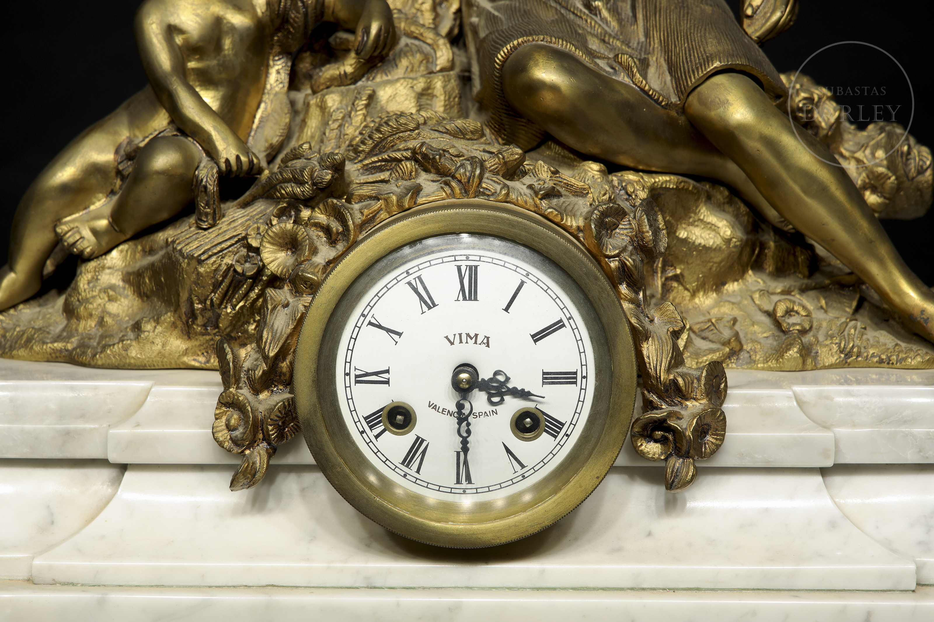 Bronze or gilt metal, on a whitish marble base. Dial with Roman numerals indicating ‘VIMA’, ‘Valencia Spain’.