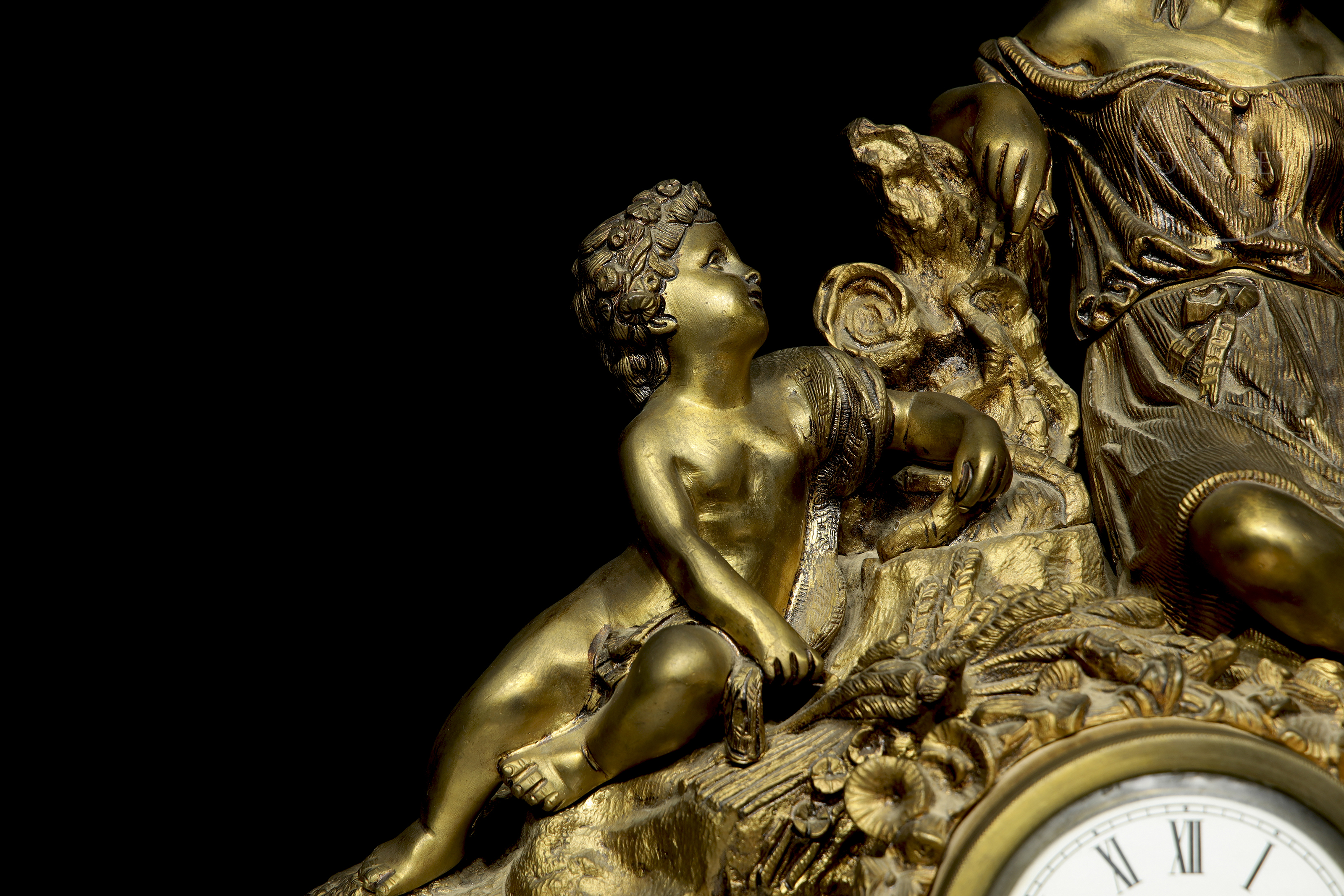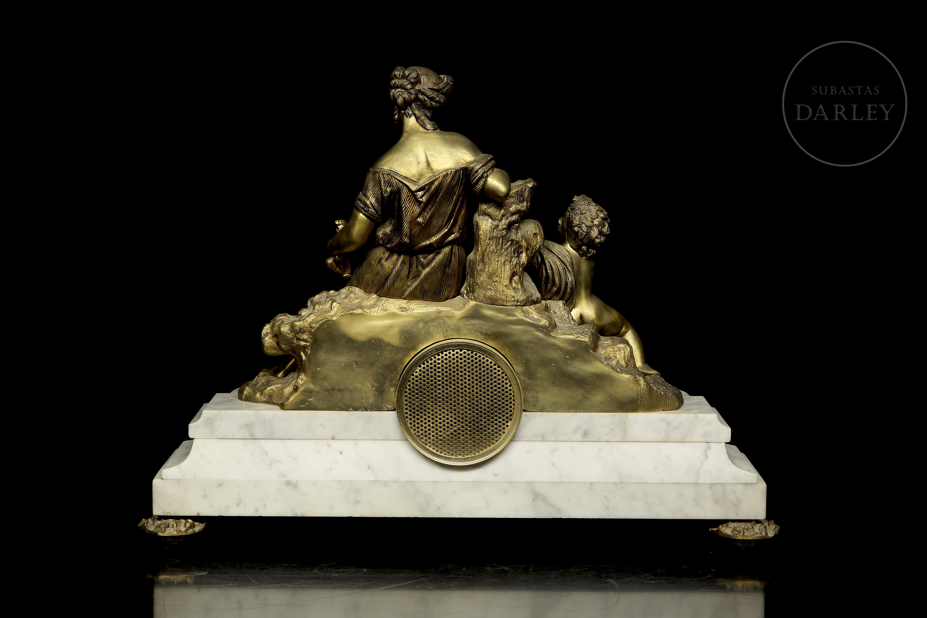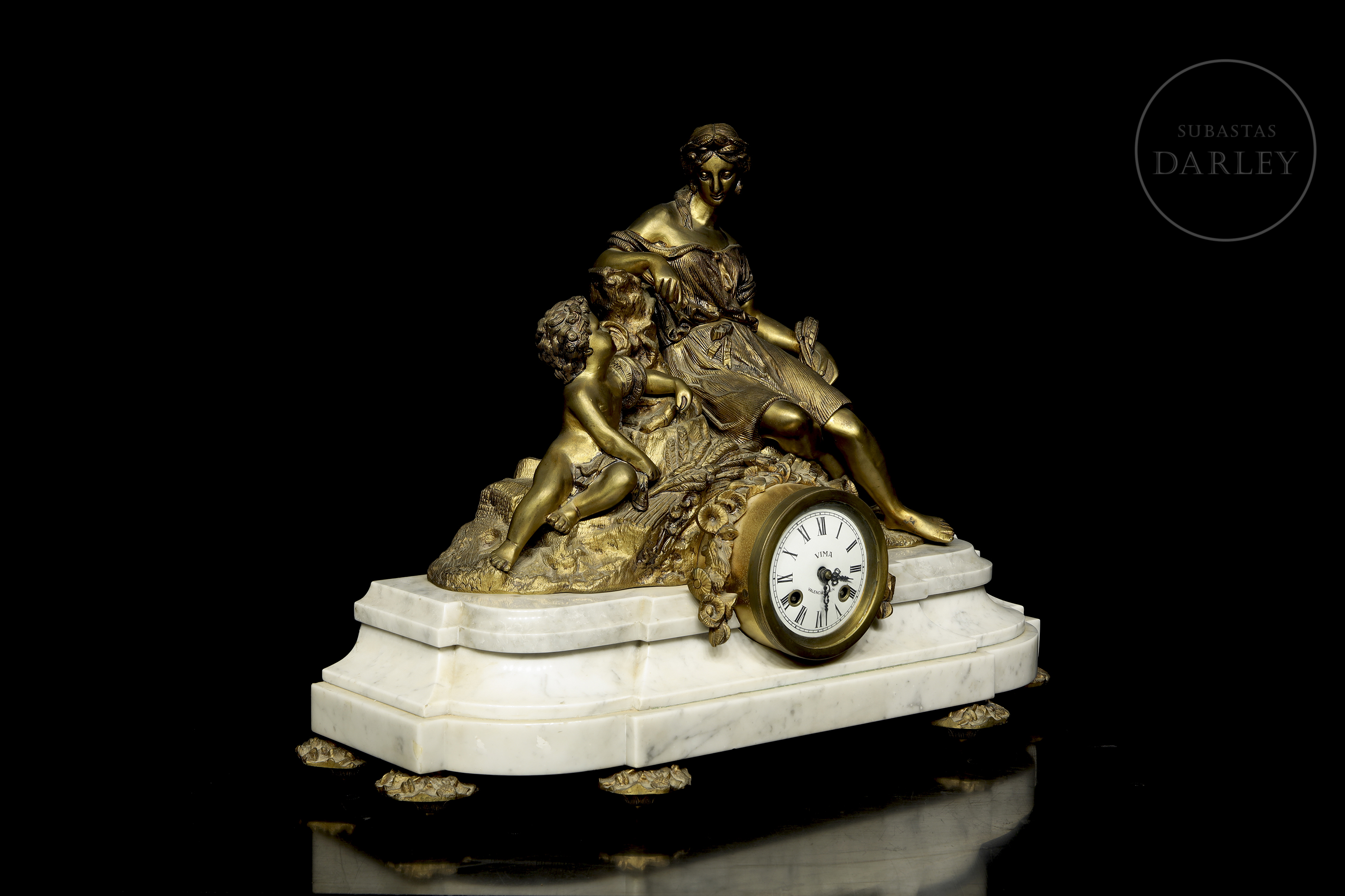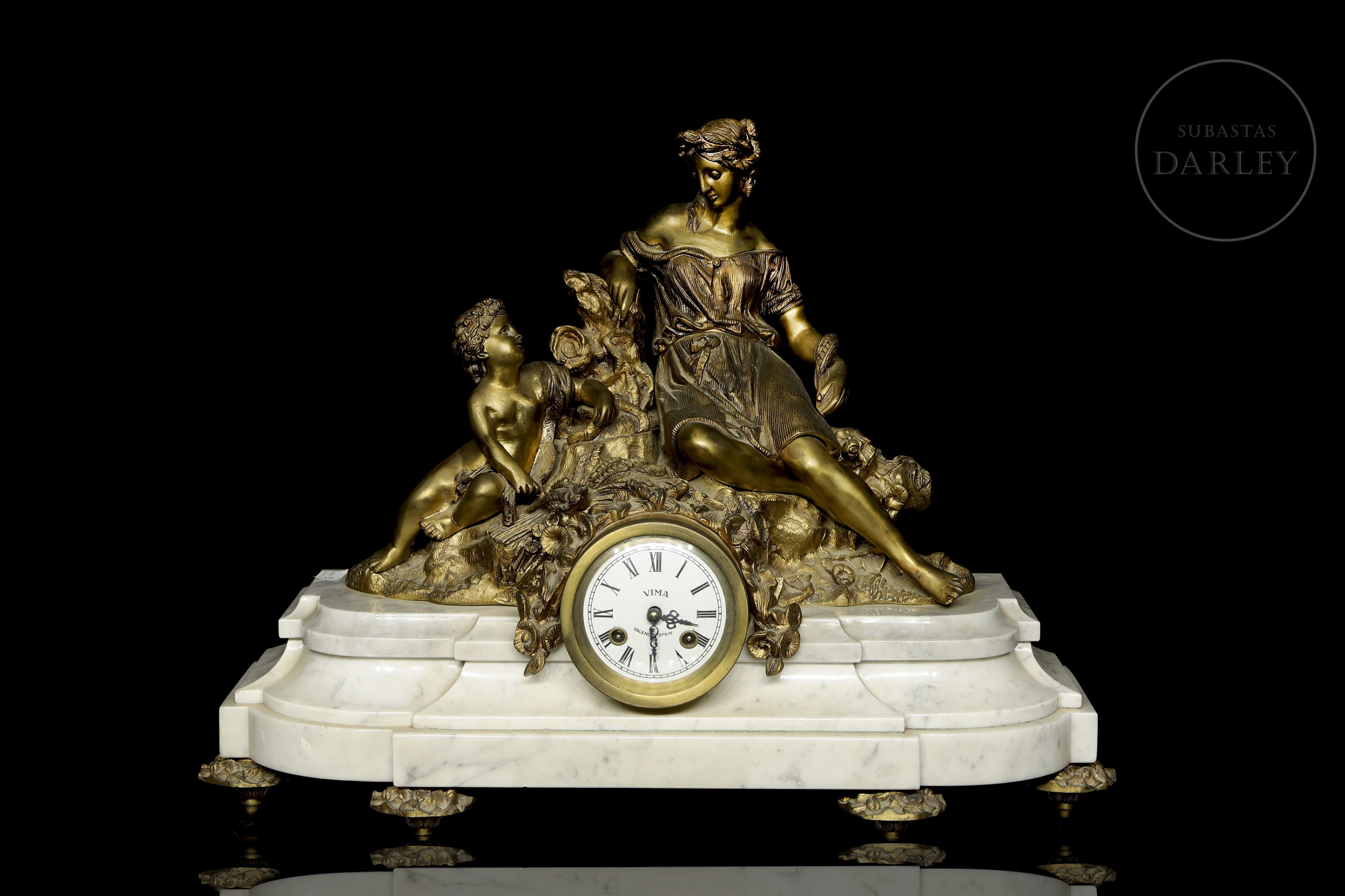 Bronze or gilt metal, on a whitish marble base. Dial with Roman numerals indicating ‘VIMA’, ‘Valencia Spain’.