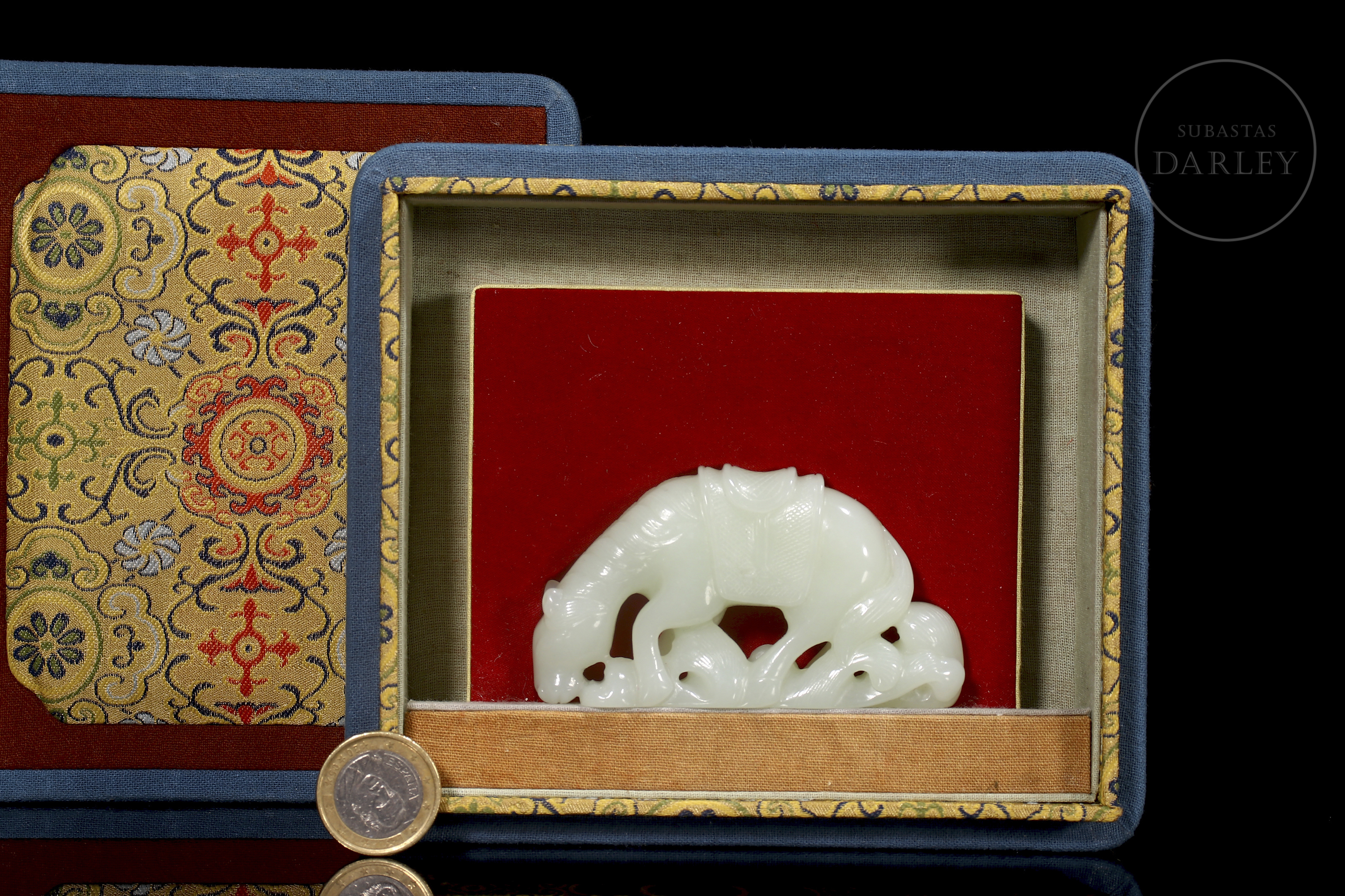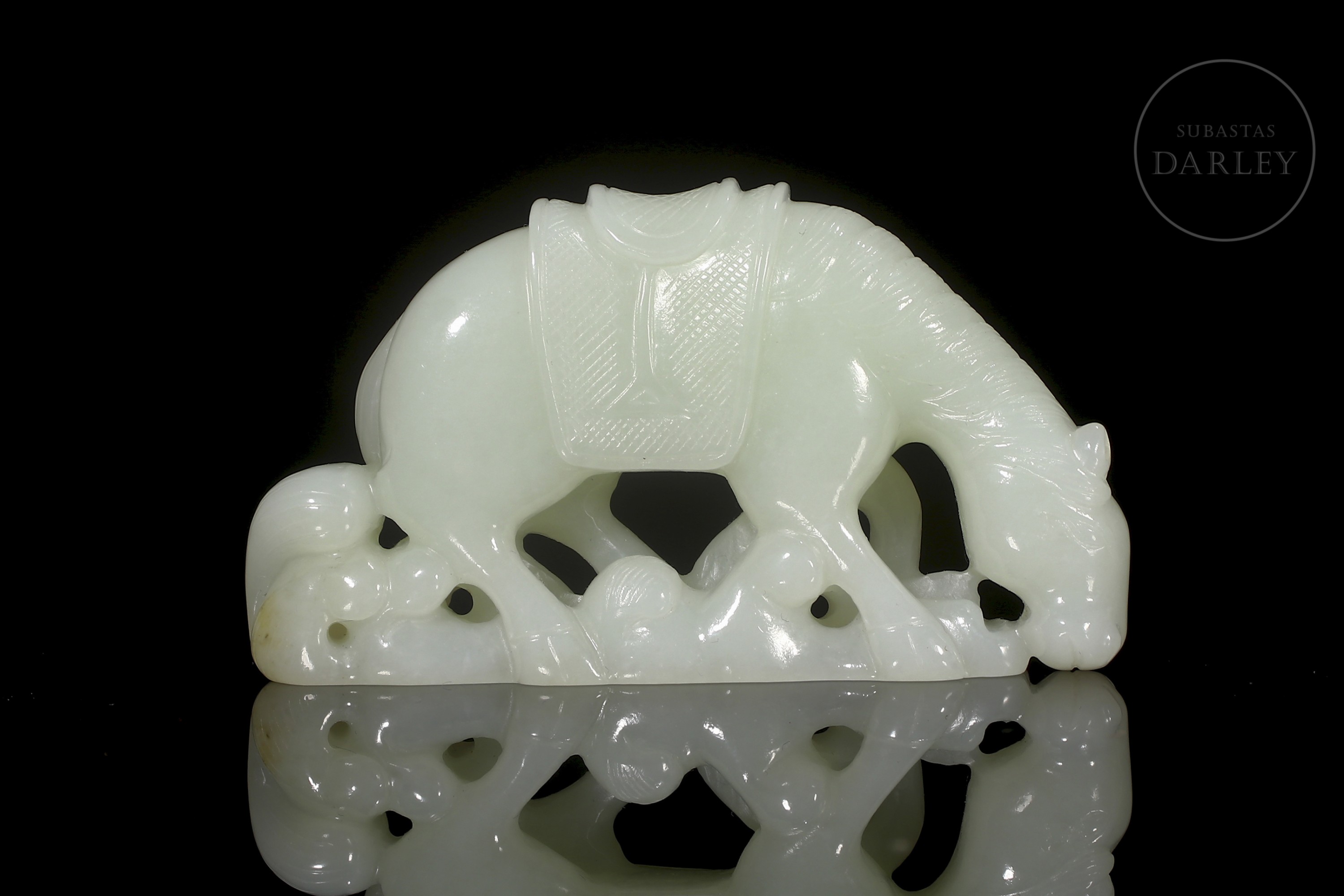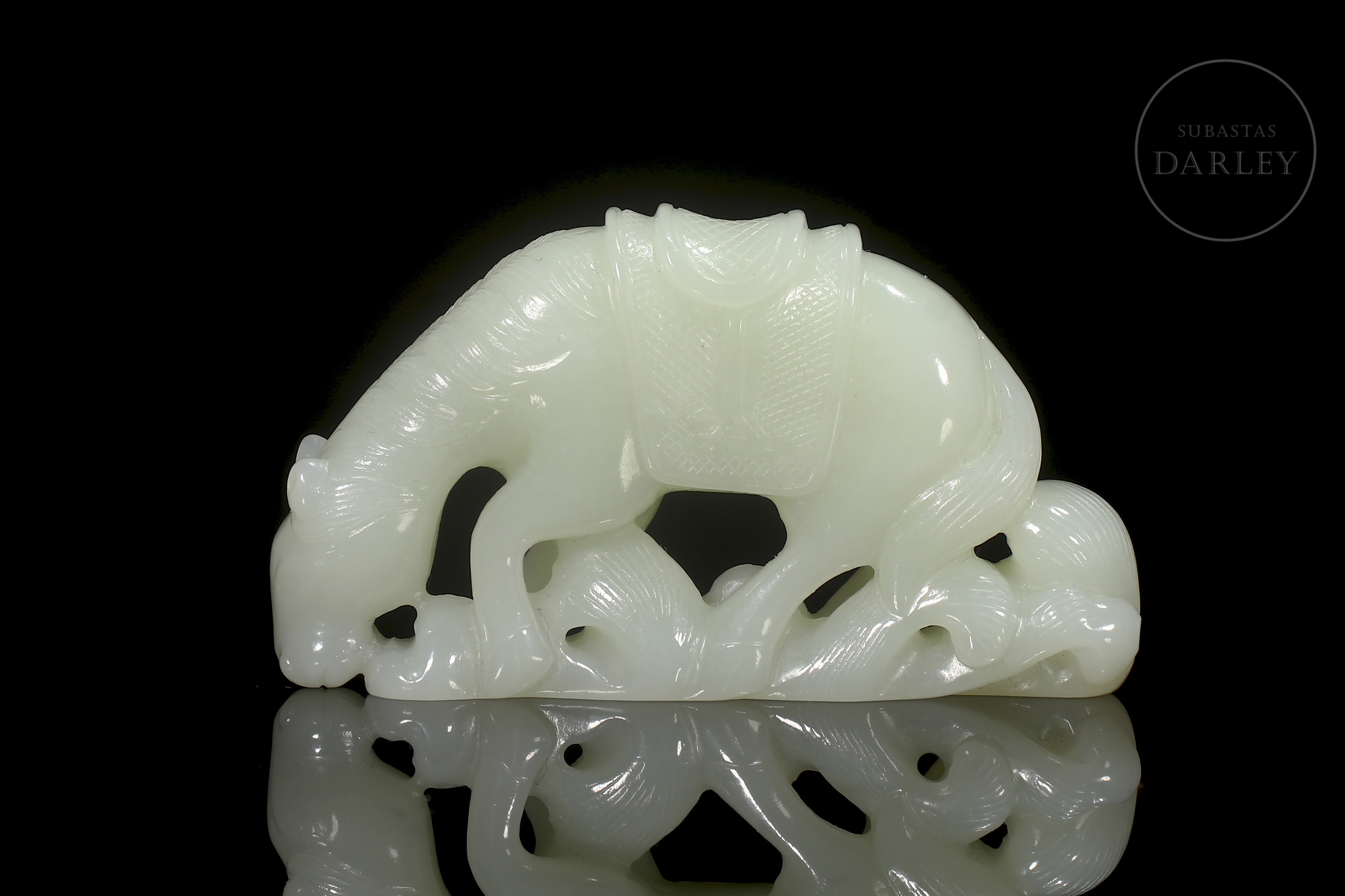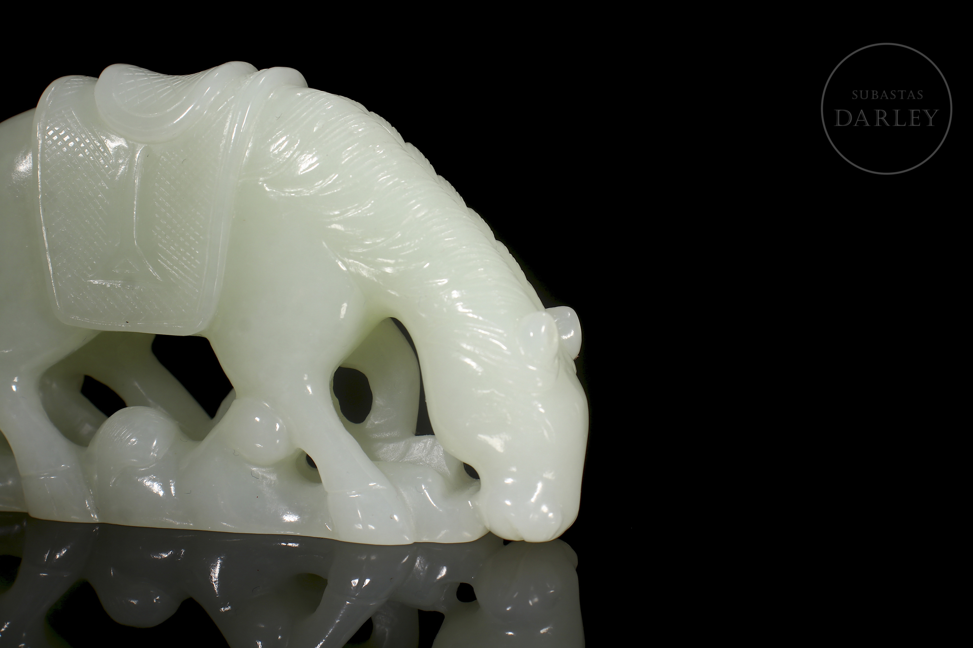 Hetian white jade carving depicting a horse leaning toward the ground, with its head lowered in a grazing posture. The animal carries a saddle decorated with incised geometric patterns and rests on an openwork base, suggesting rocks and waves. Comes with a custom-made box.