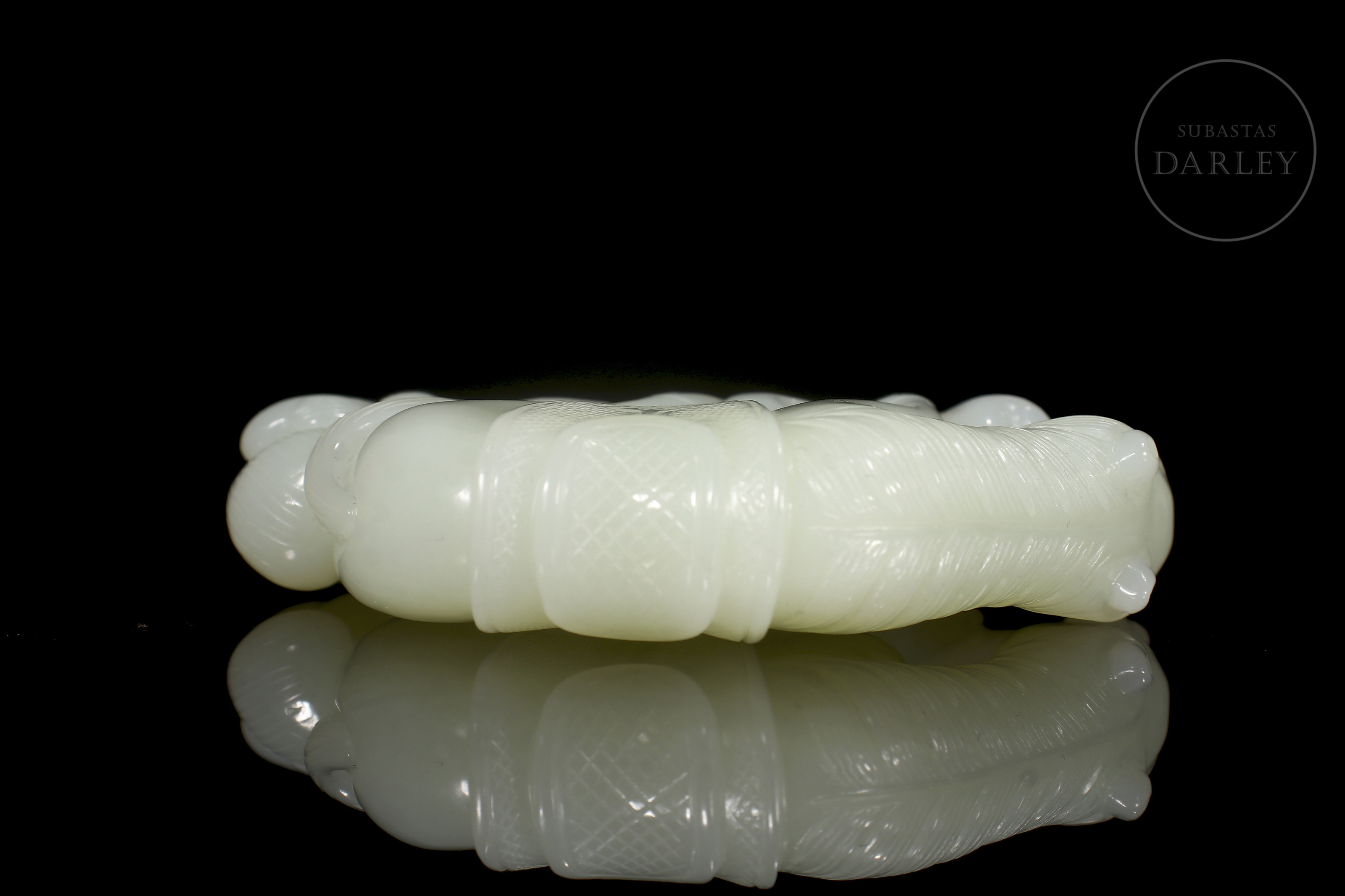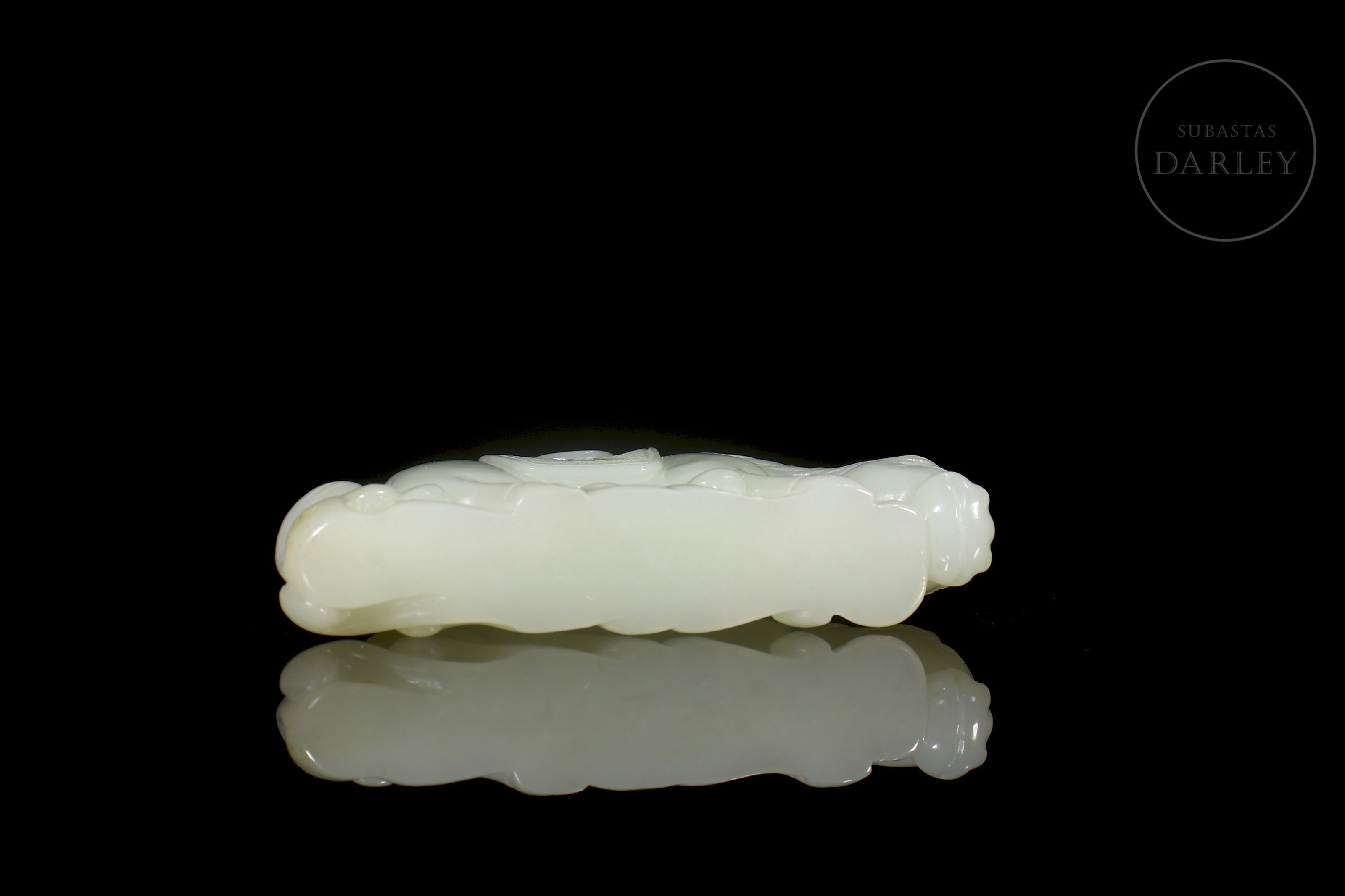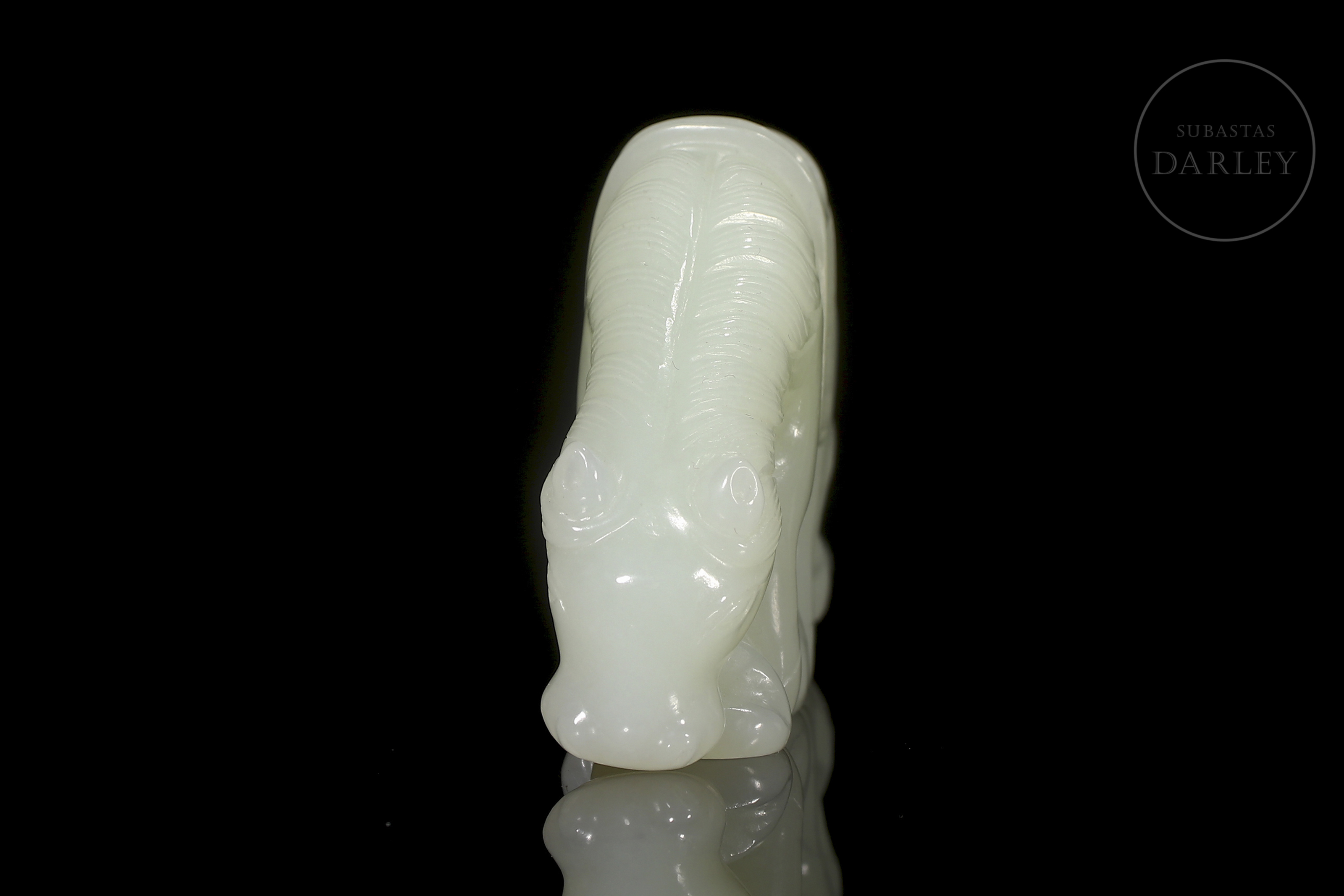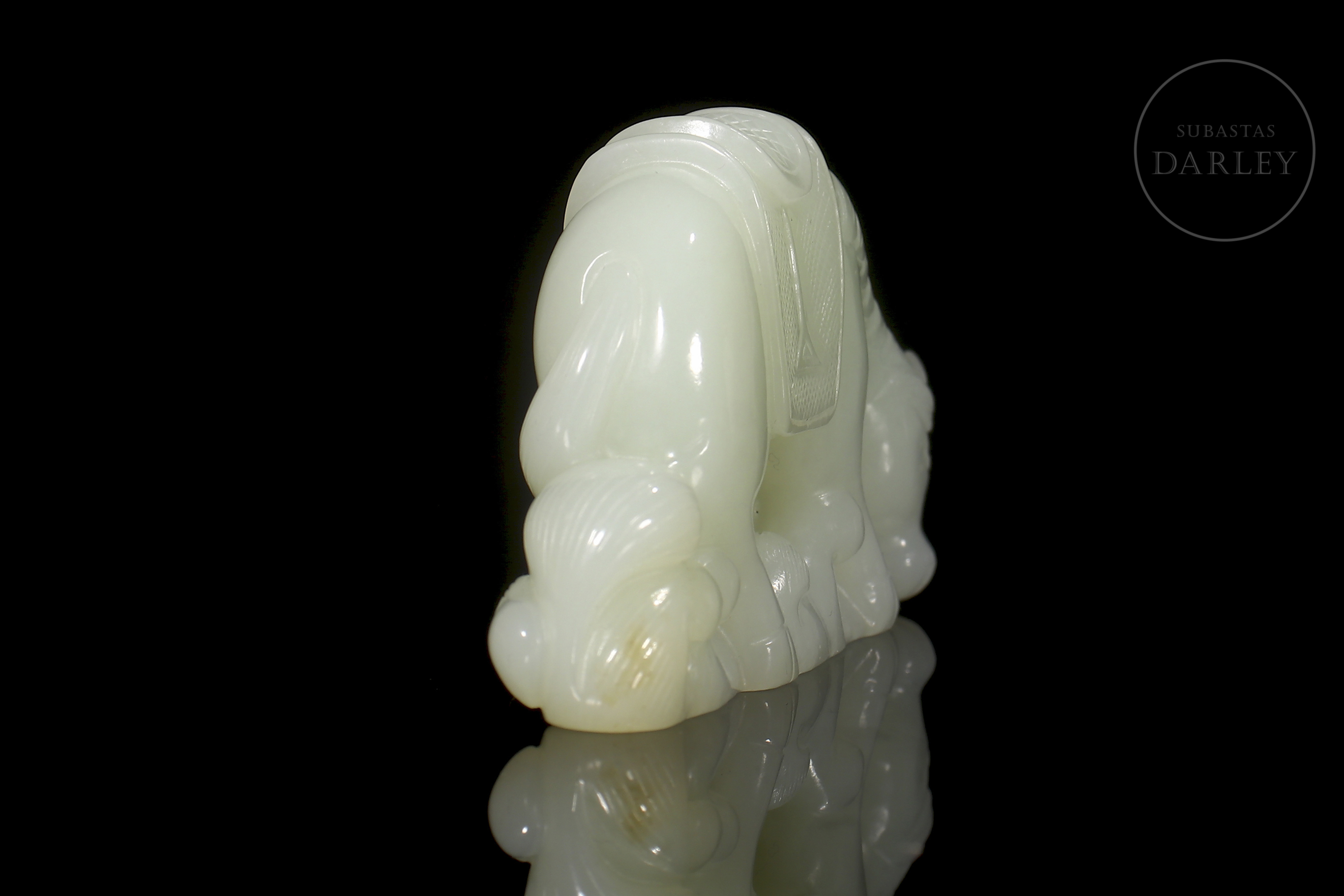 Hetian white jade carving depicting a horse leaning toward the ground, with its head lowered in a grazing posture. The animal carries a saddle decorated with incised geometric patterns and rests on an openwork base, suggesting rocks and waves. Comes with a custom-made box.