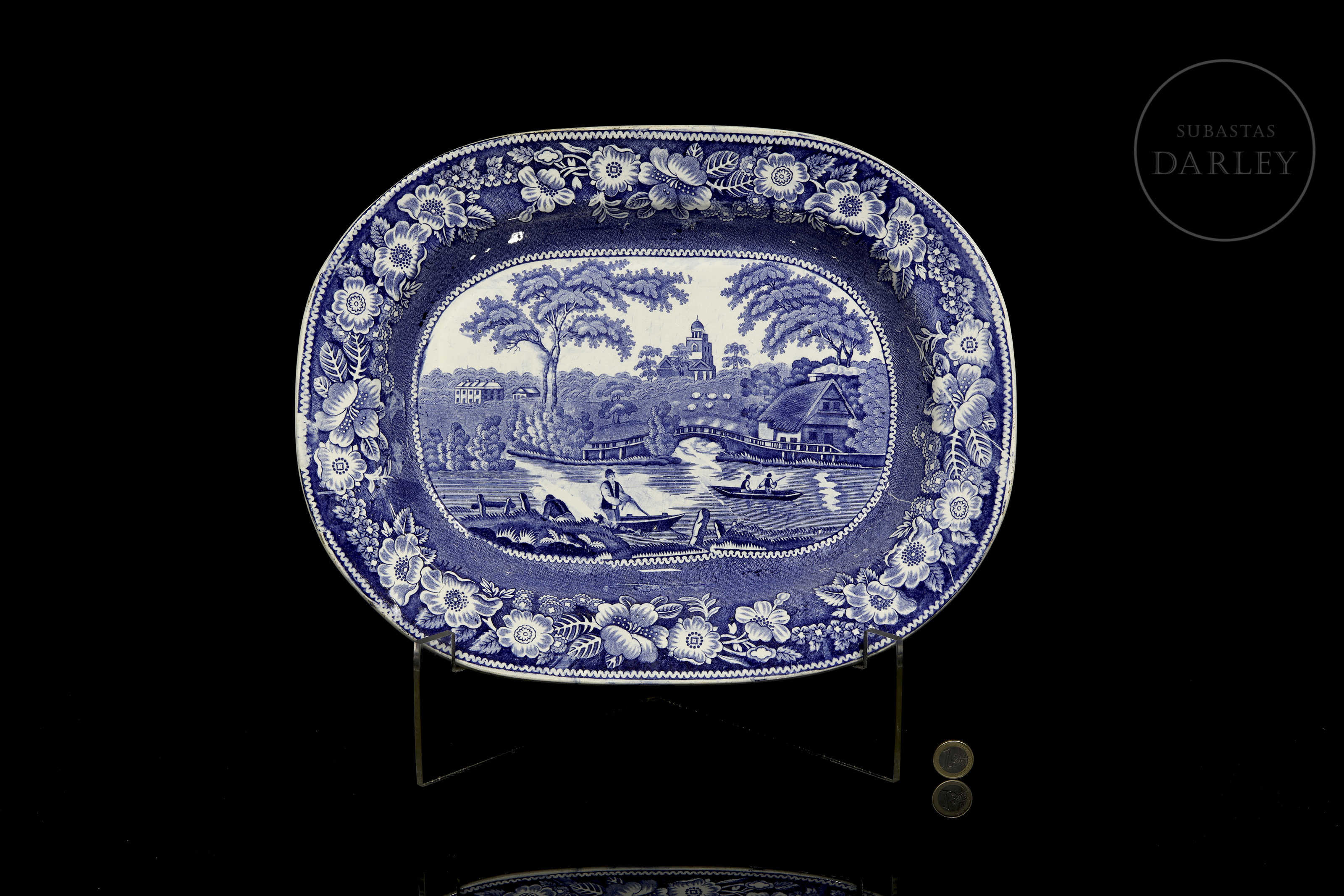 这款蓝白相间的转印瓷托盘饰有广受欢迎的“野玫瑰”图案,代表着英国牛津郡的纽纳姆·考特尼庄园。它由斯塔福德郡的陶艺家于19世纪(约1830-1860年)制作,是维多利亚时期陶器的经典之作。