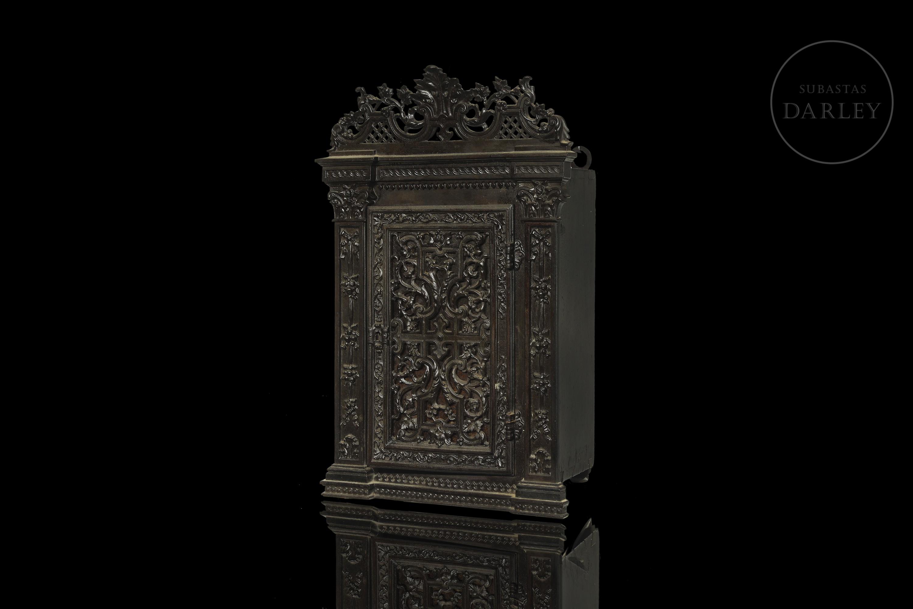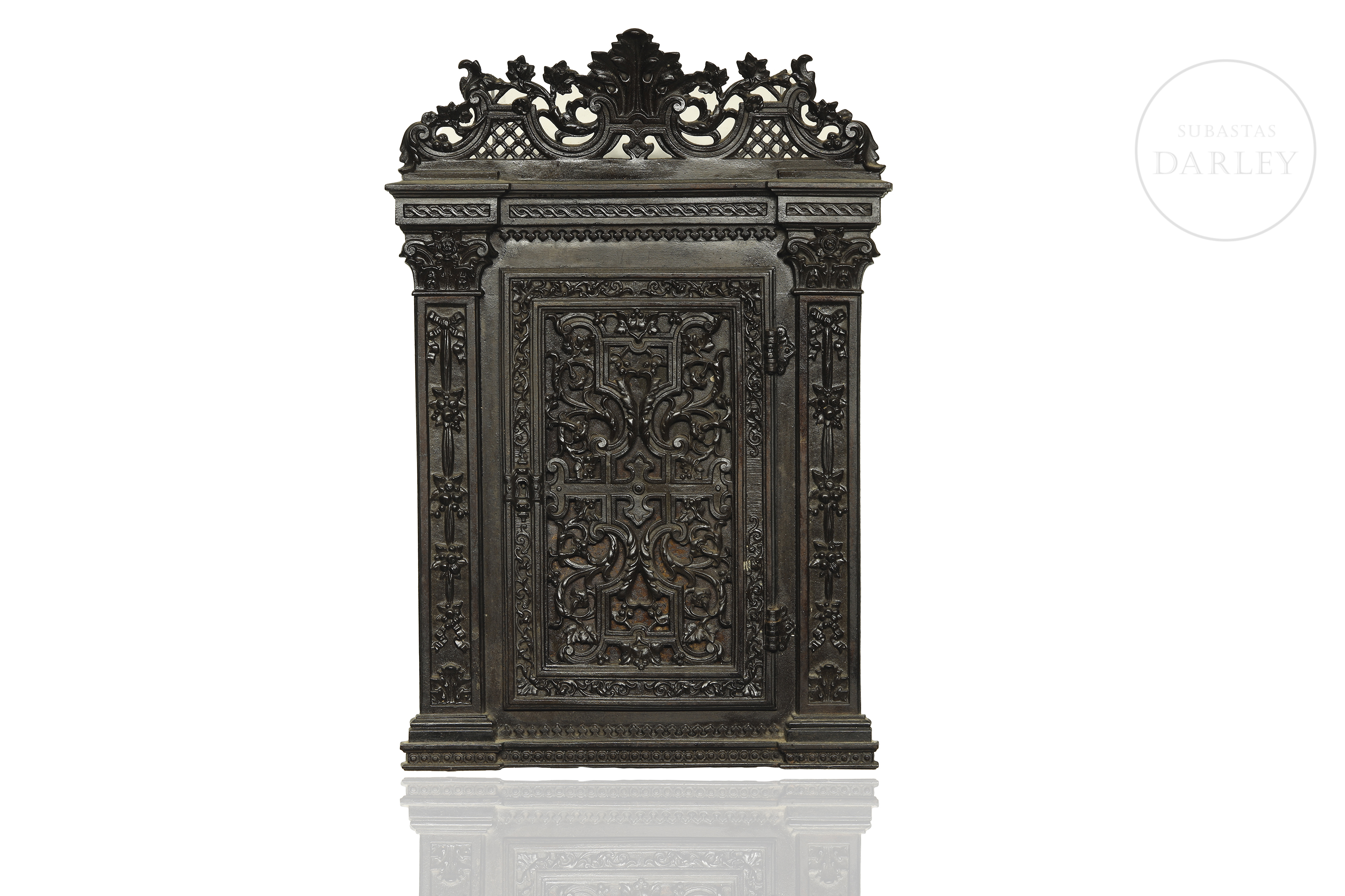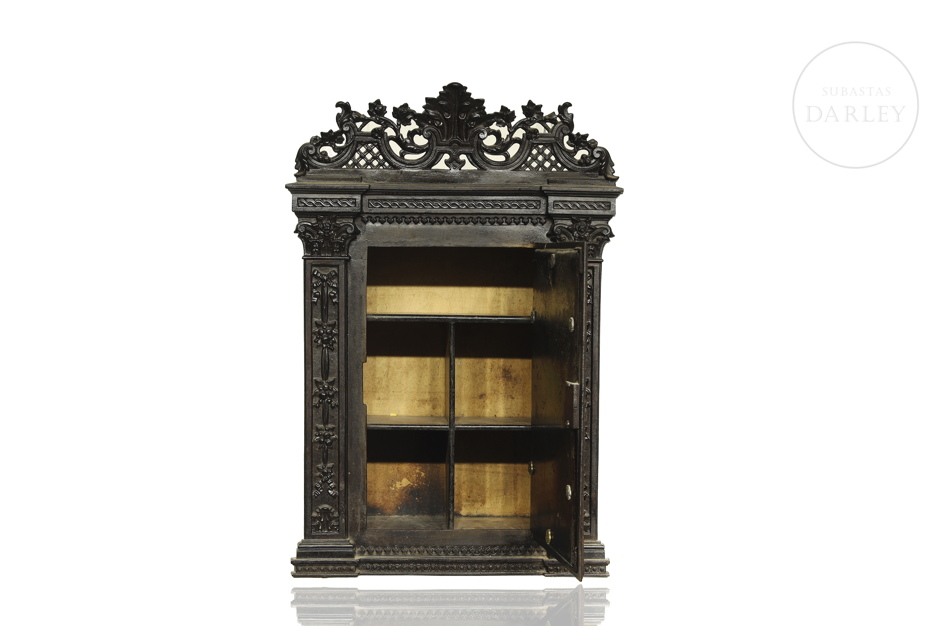 小型壁柜饰有繁复的新巴洛克风格装饰,配有镂空檐口与雕花侧柱。正面门板镶嵌精美铸铁饰板,饰以卷草纹与阿拉伯式卷曲纹样。内部划分为多个隔层。因年代久远及使用痕迹,可见磨损。无钥匙。