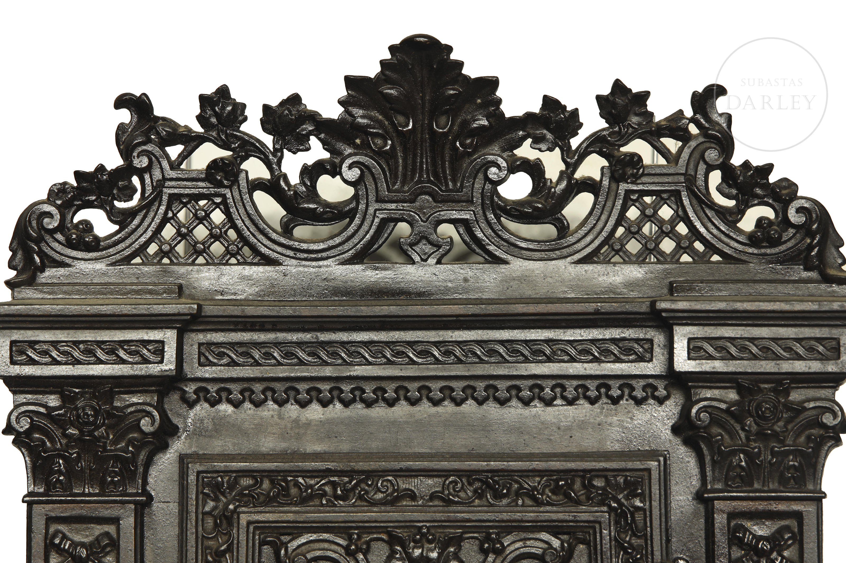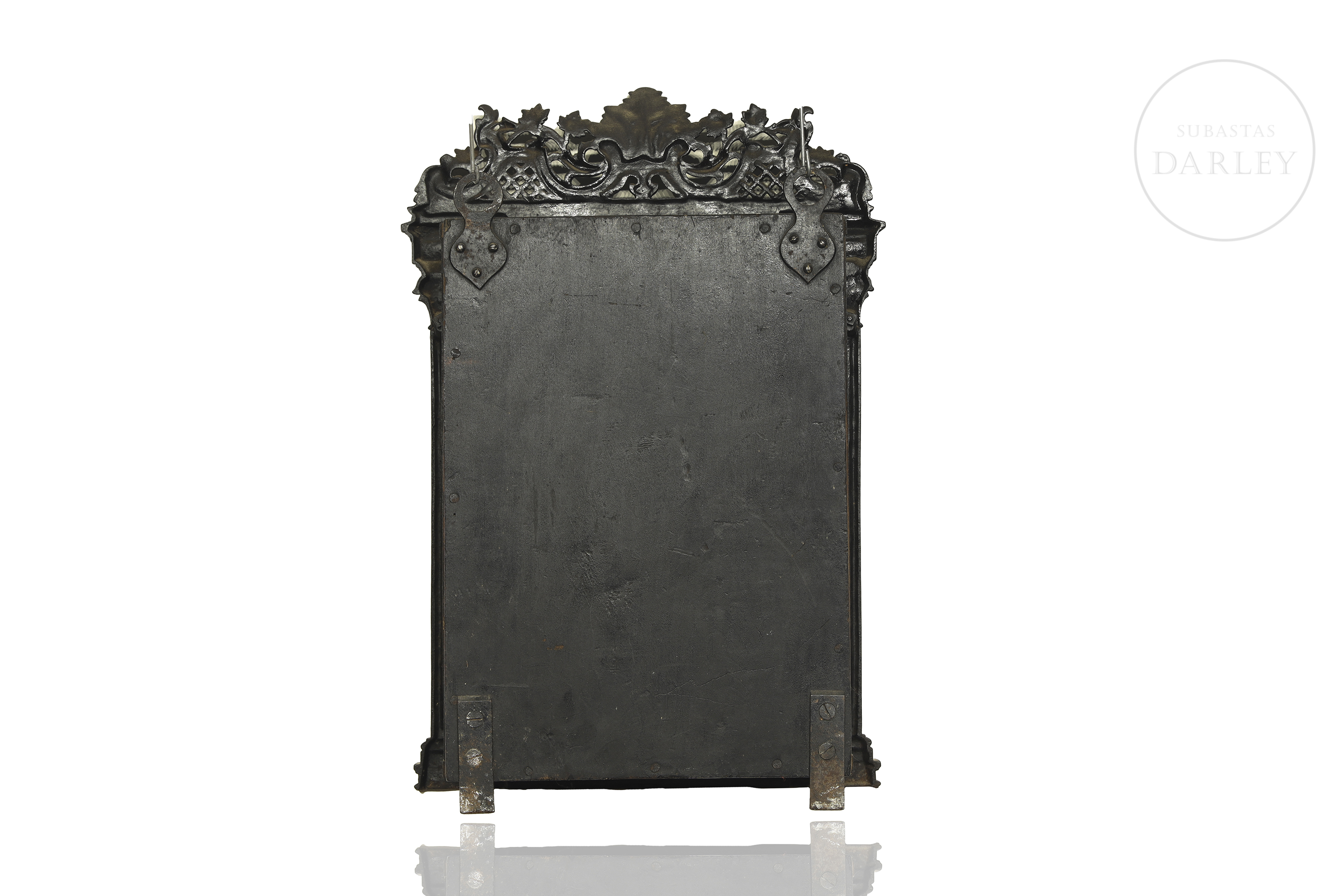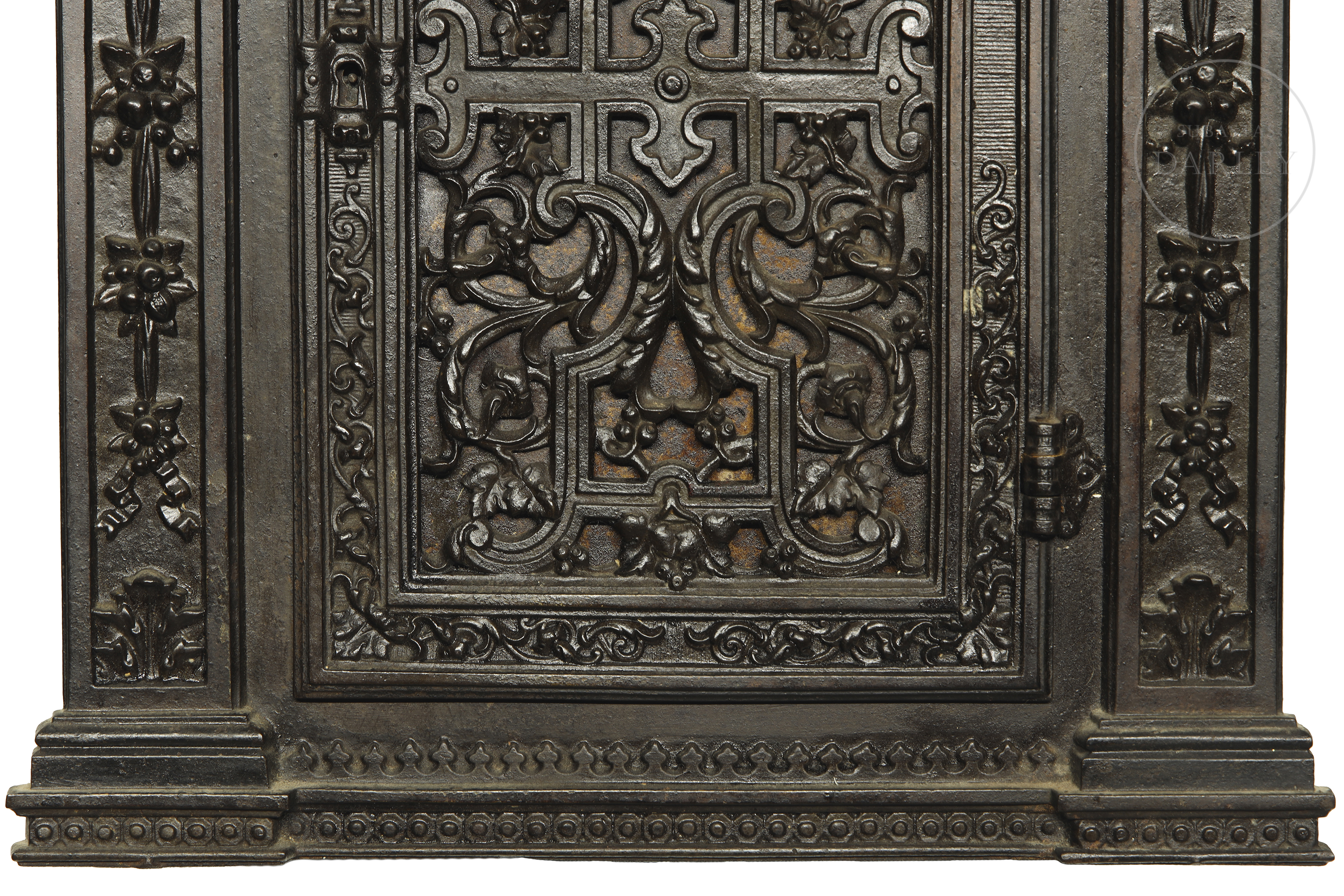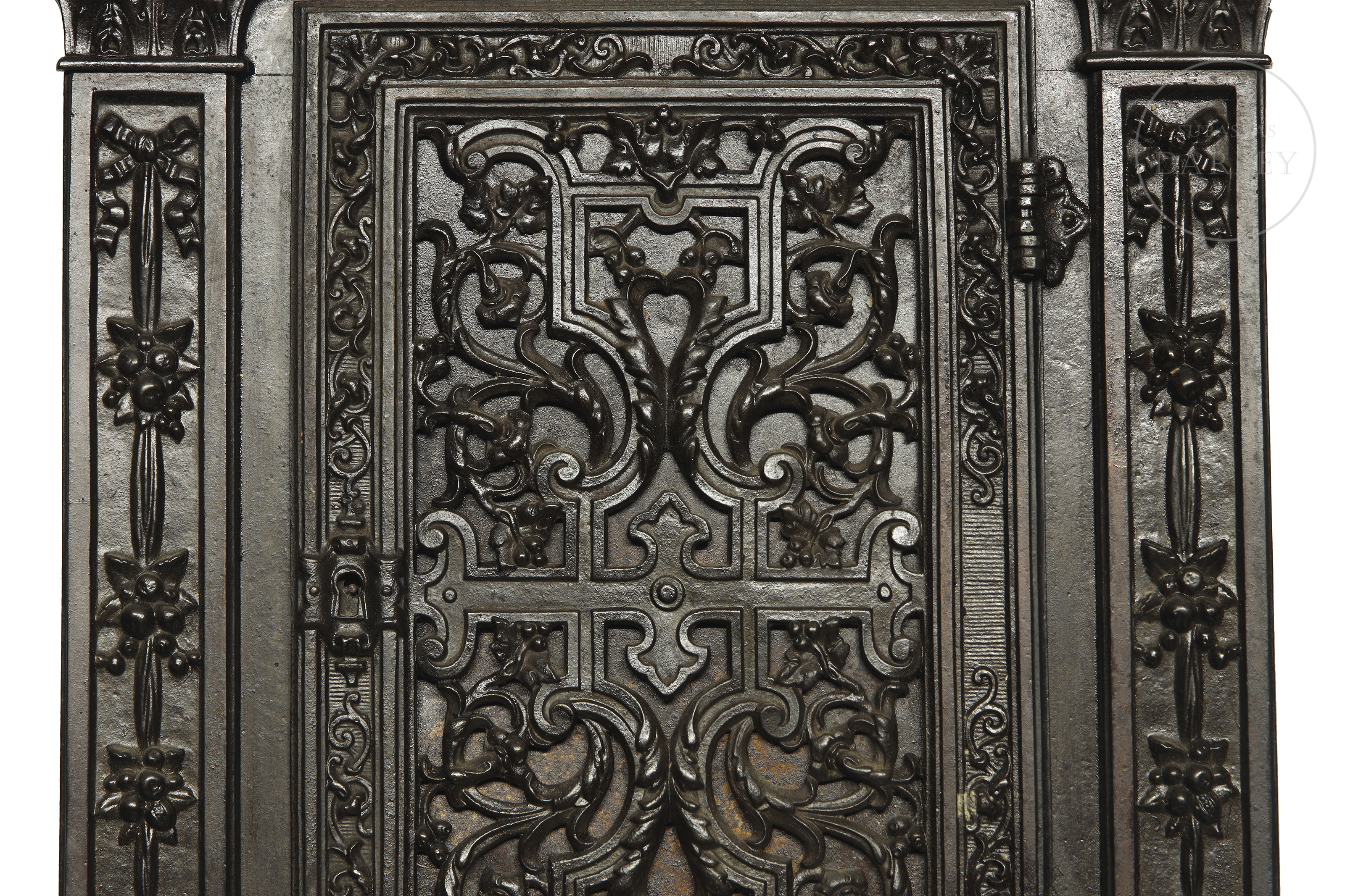 小型壁柜饰有繁复的新巴洛克风格装饰,配有镂空檐口与雕花侧柱。正面门板镶嵌精美铸铁饰板,饰以卷草纹与阿拉伯式卷曲纹样。内部划分为多个隔层。因年代久远及使用痕迹,可见磨损。无钥匙。