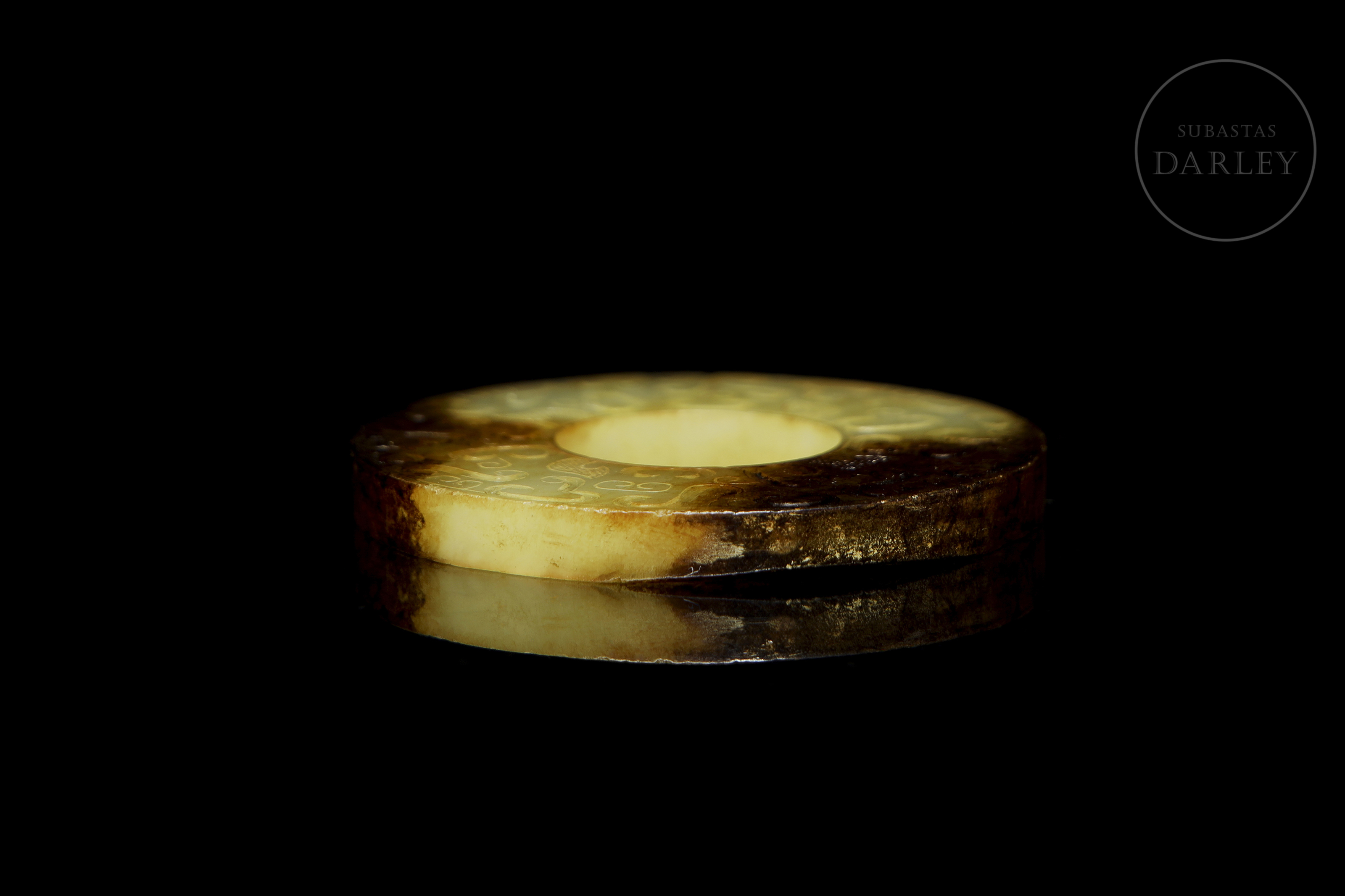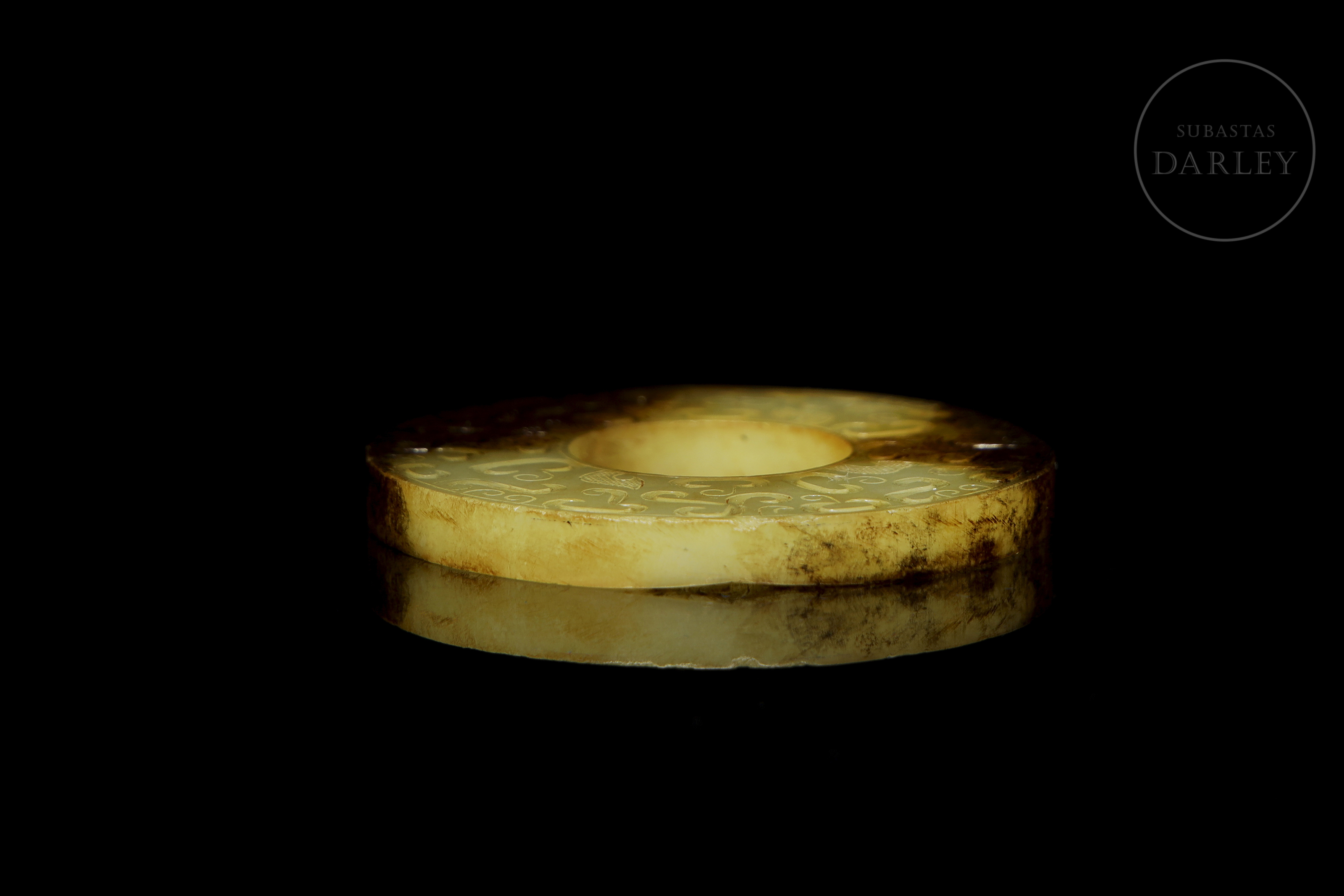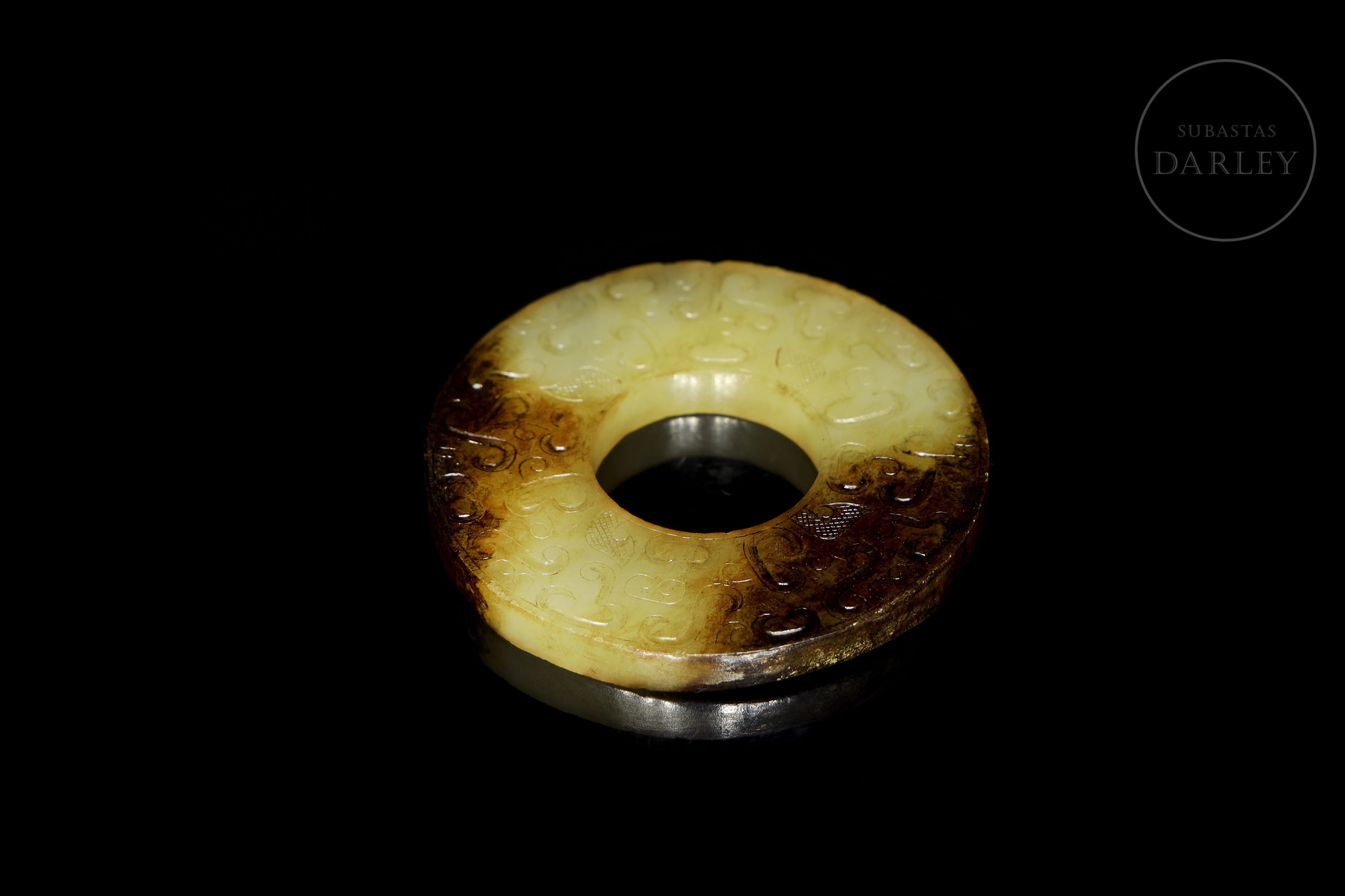 Archaic ritual disc made of jade or bi. The piece is carved from a yellowish stone, which shows large areas of dark brown discolouration caused by the natural passage of time. Both sides are finely decorated in bas-relief with a dense pattern of C-shaped scrolls and spirals, all in an archaic style.
