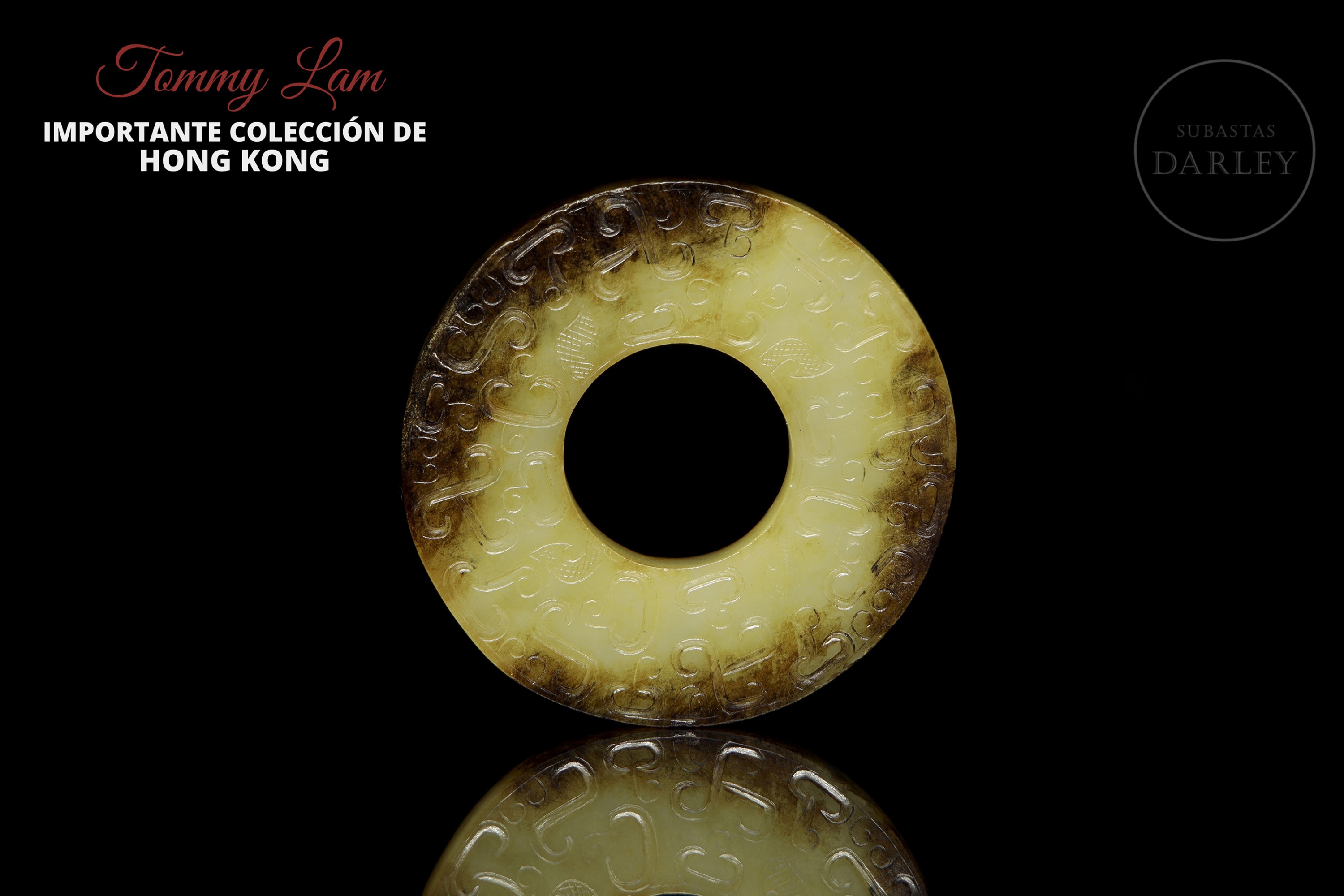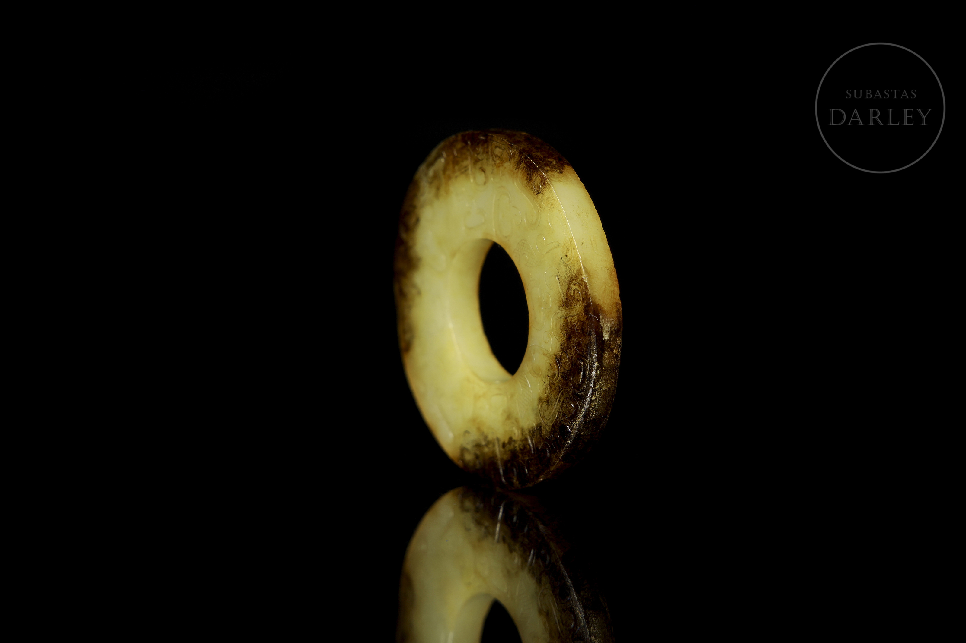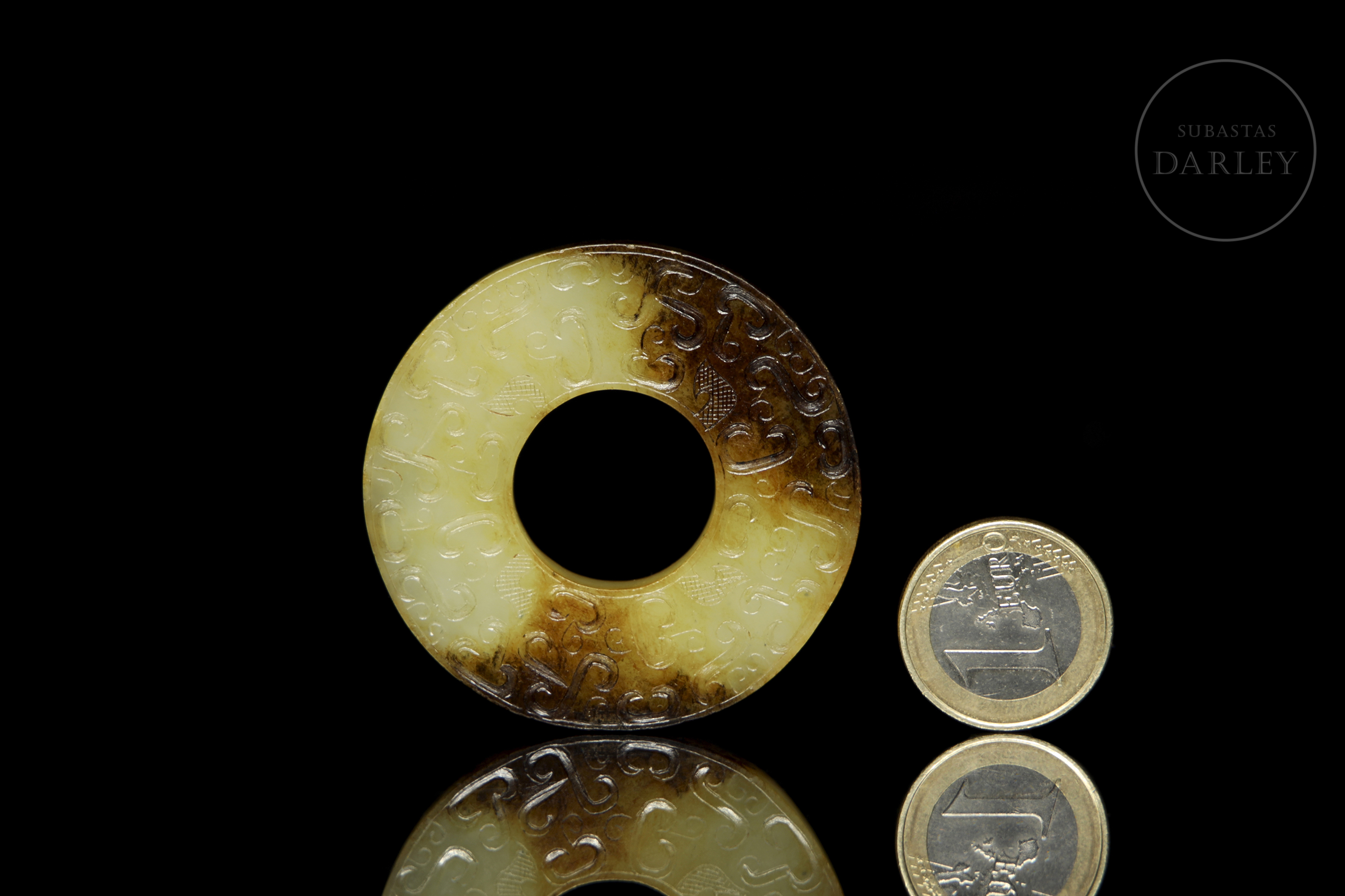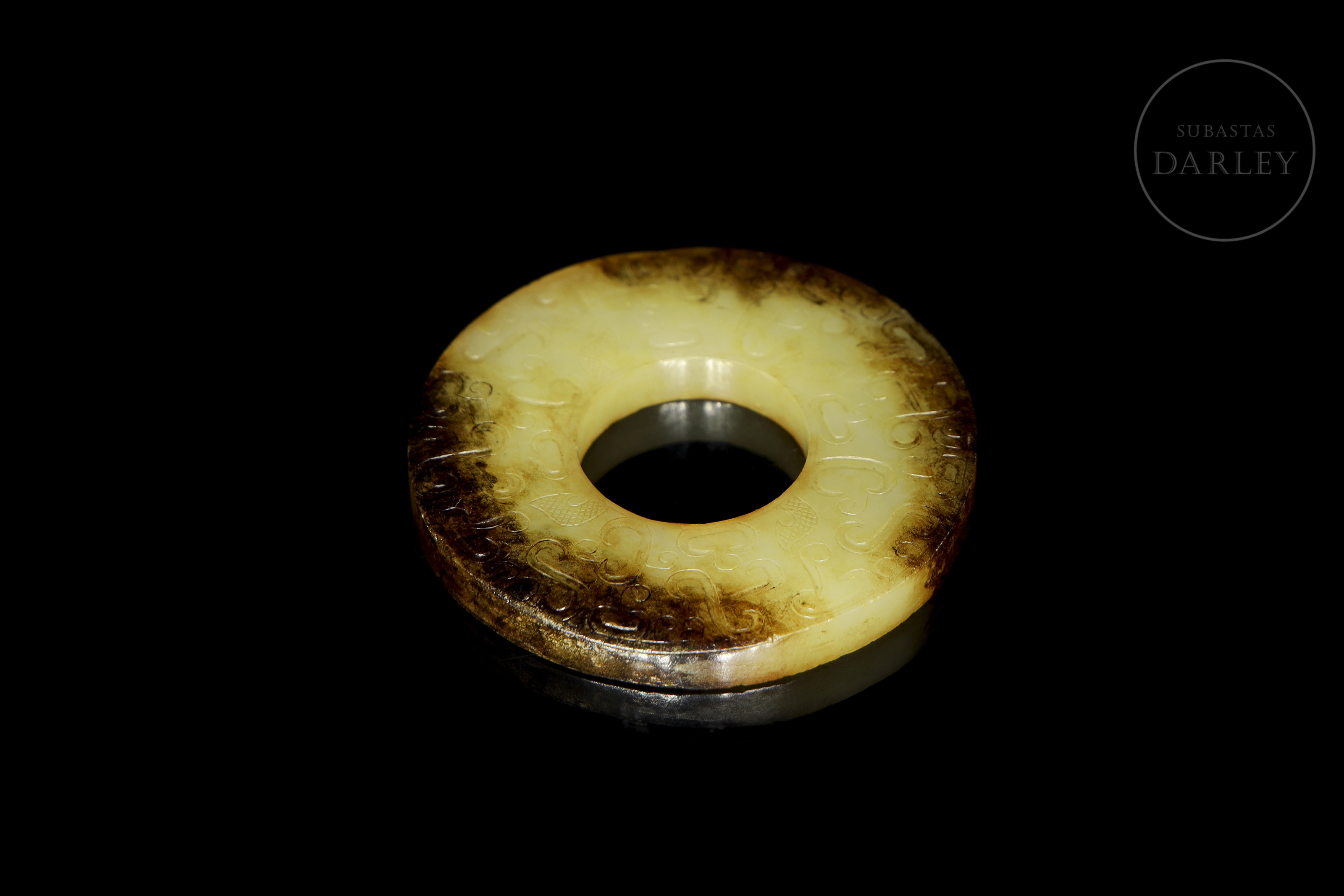 Archaic ritual disc made of jade or bi. The piece is carved from a yellowish stone, which shows large areas of dark brown discolouration caused by the natural passage of time. Both sides are finely decorated in bas-relief with a dense pattern of C-shaped scrolls and spirals, all in an archaic style.