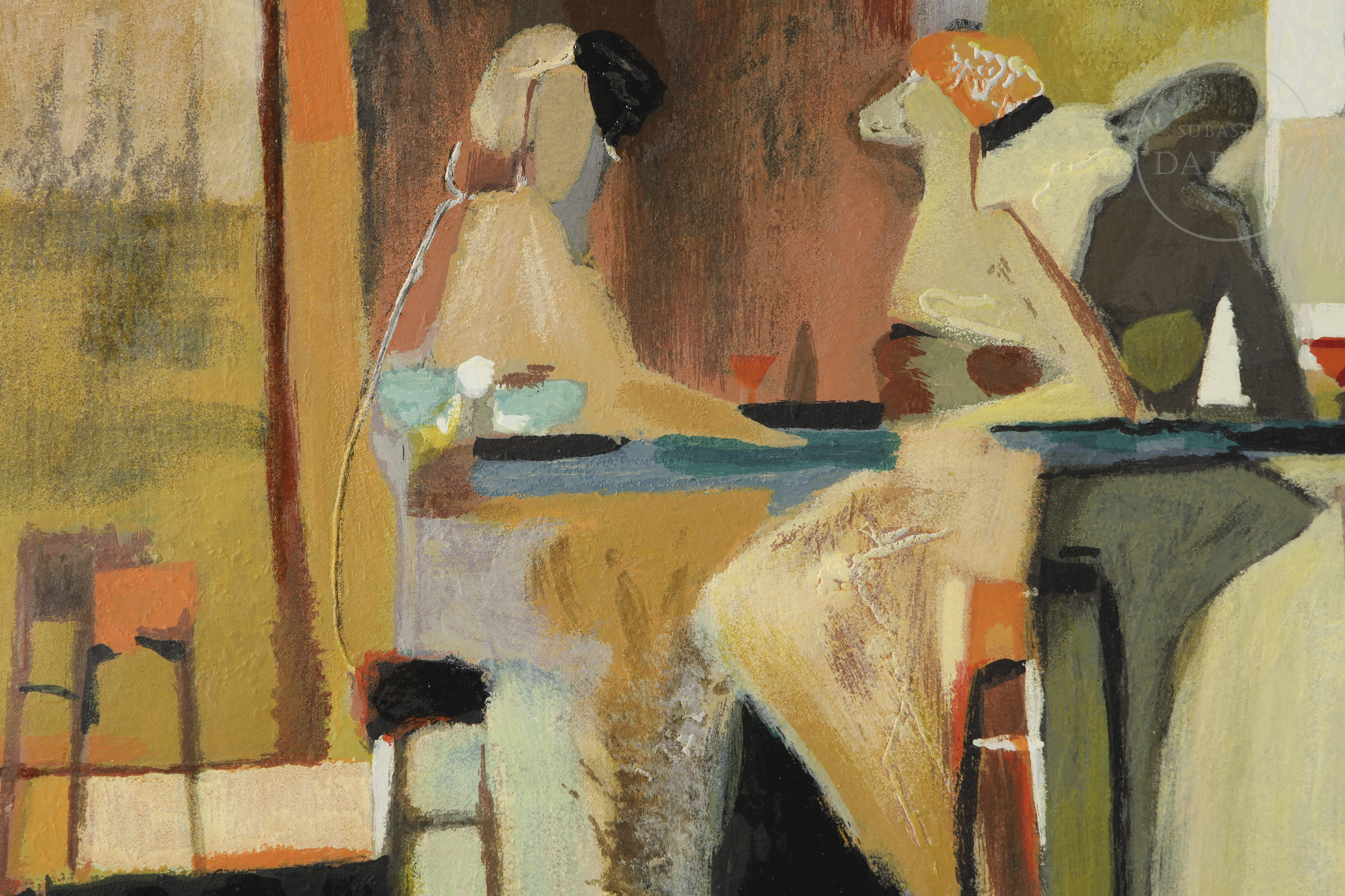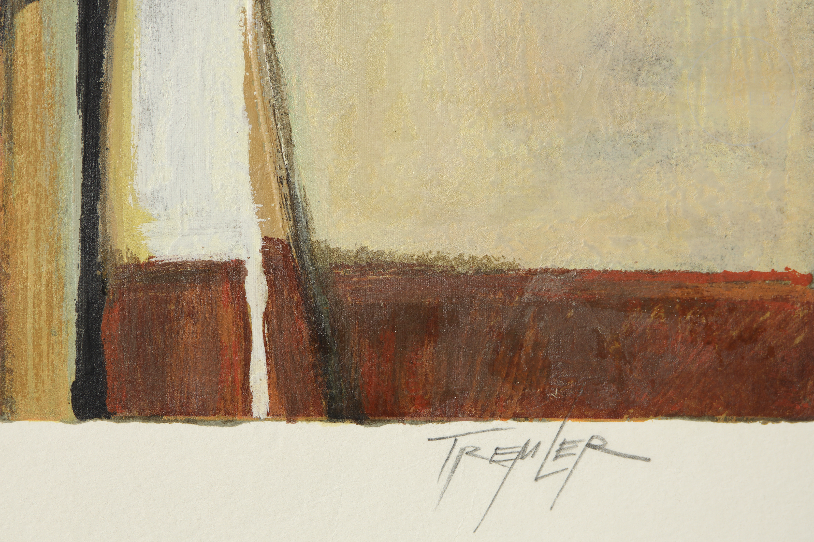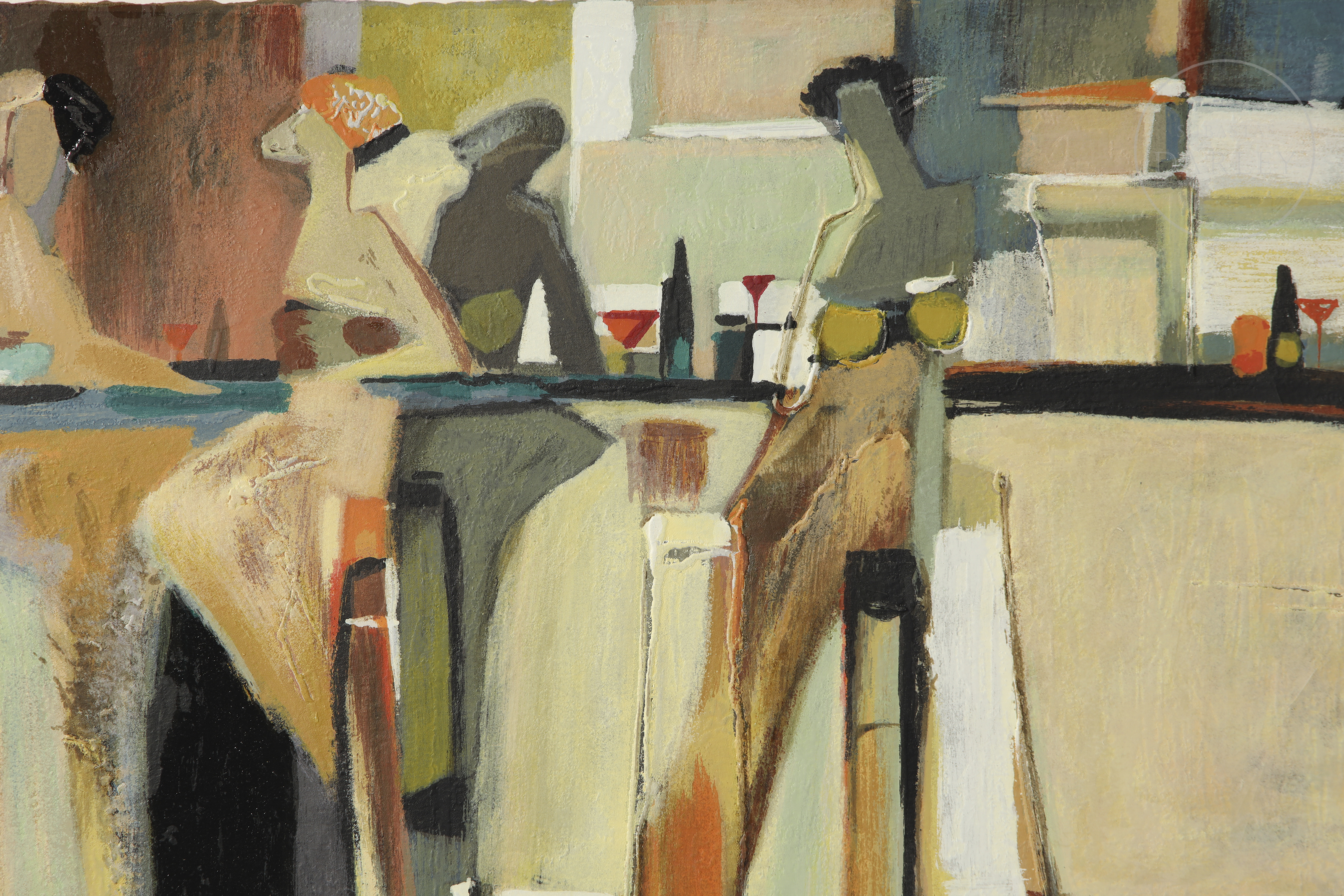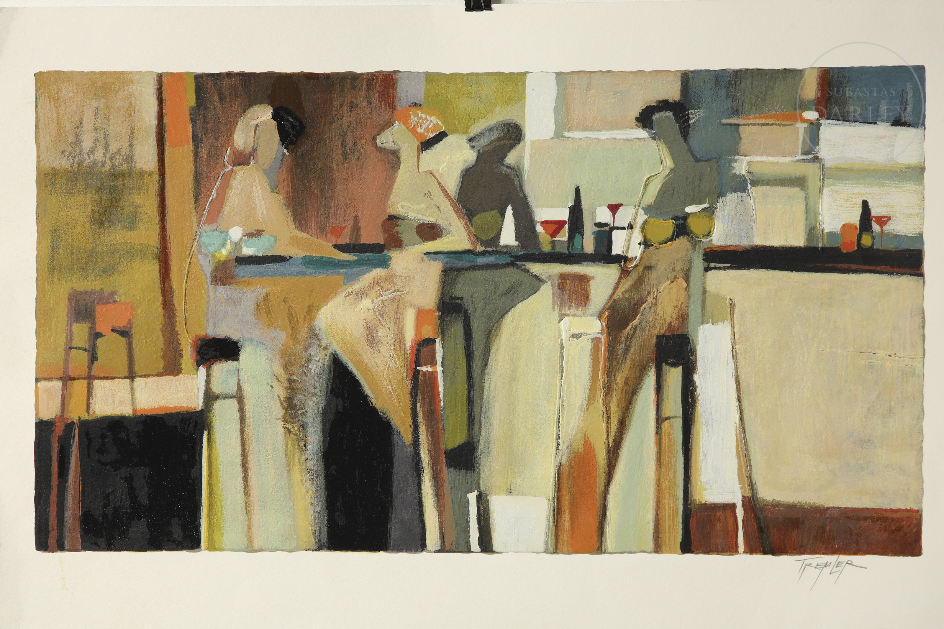 丝网印刷于纸上。作品采用大地色调,描绘一间拥挤的酒吧。右下角签名“Tremler”。无可见编号。