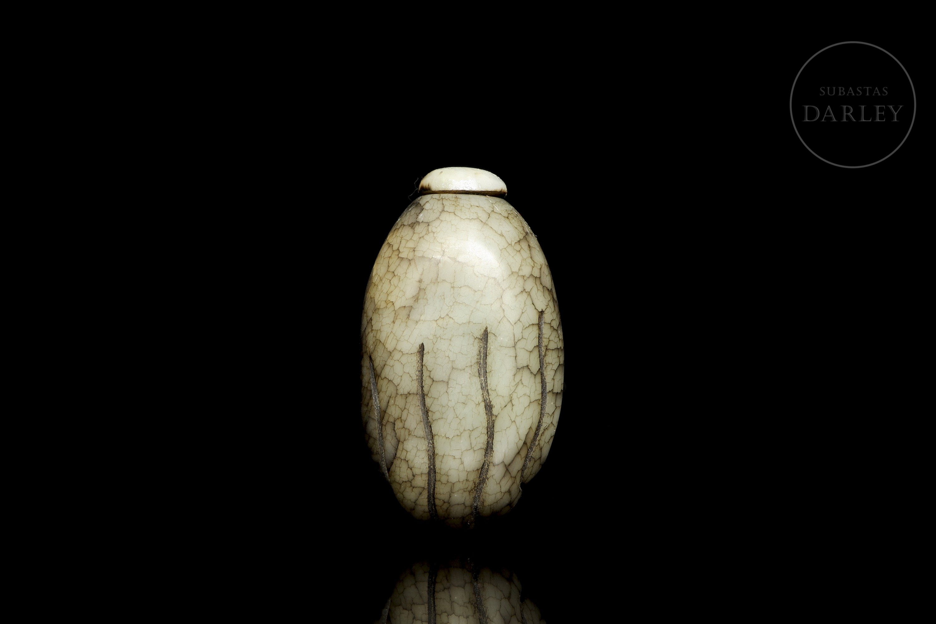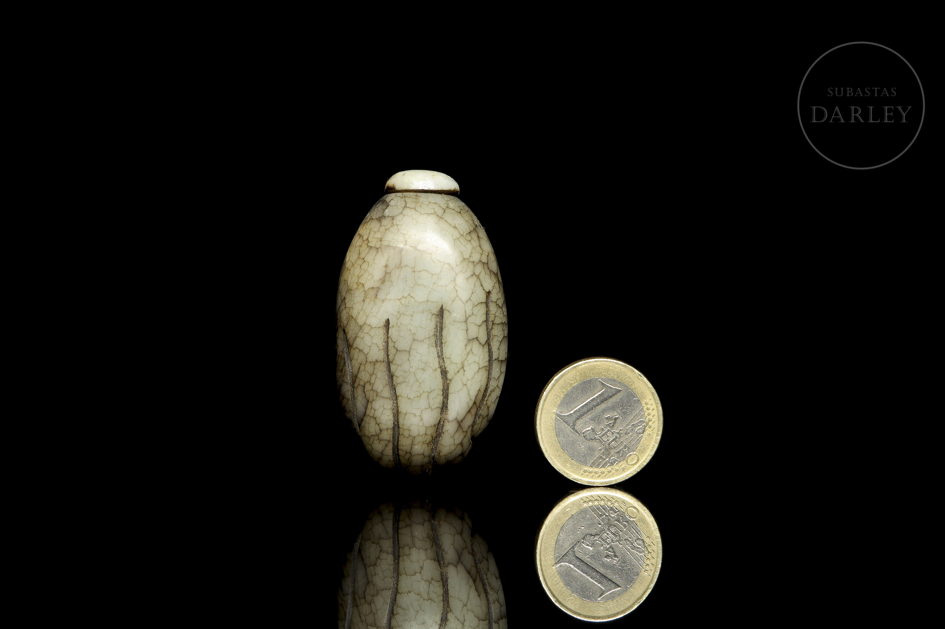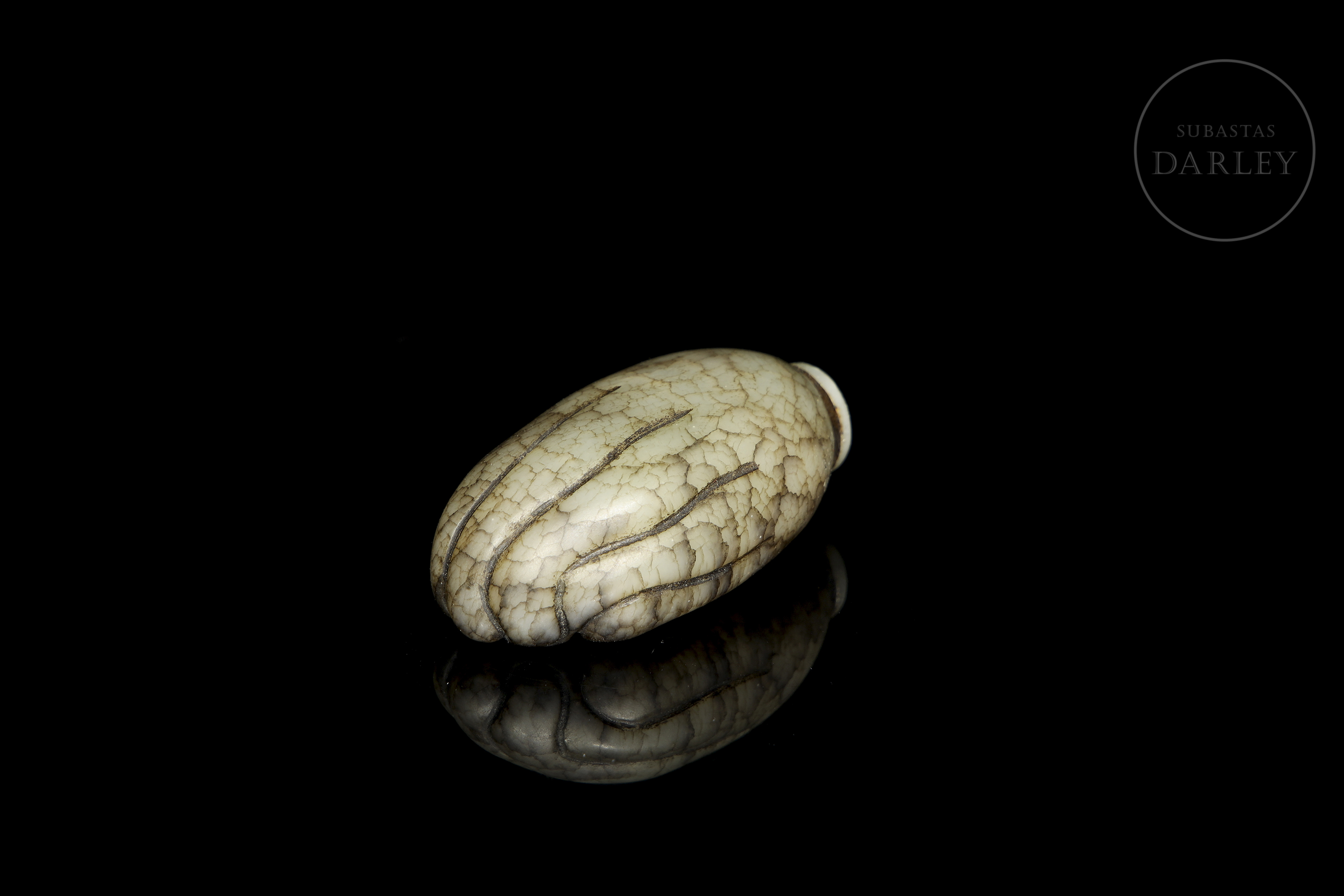 白玉器,表面布满明显的龟裂纹。器形仿柠檬果实,即俗称的“佛手柑”,以刻线勾勒其形态。器身呈卵形,颈短,顶部配有同质白玉塞。清代(1644–1912)。