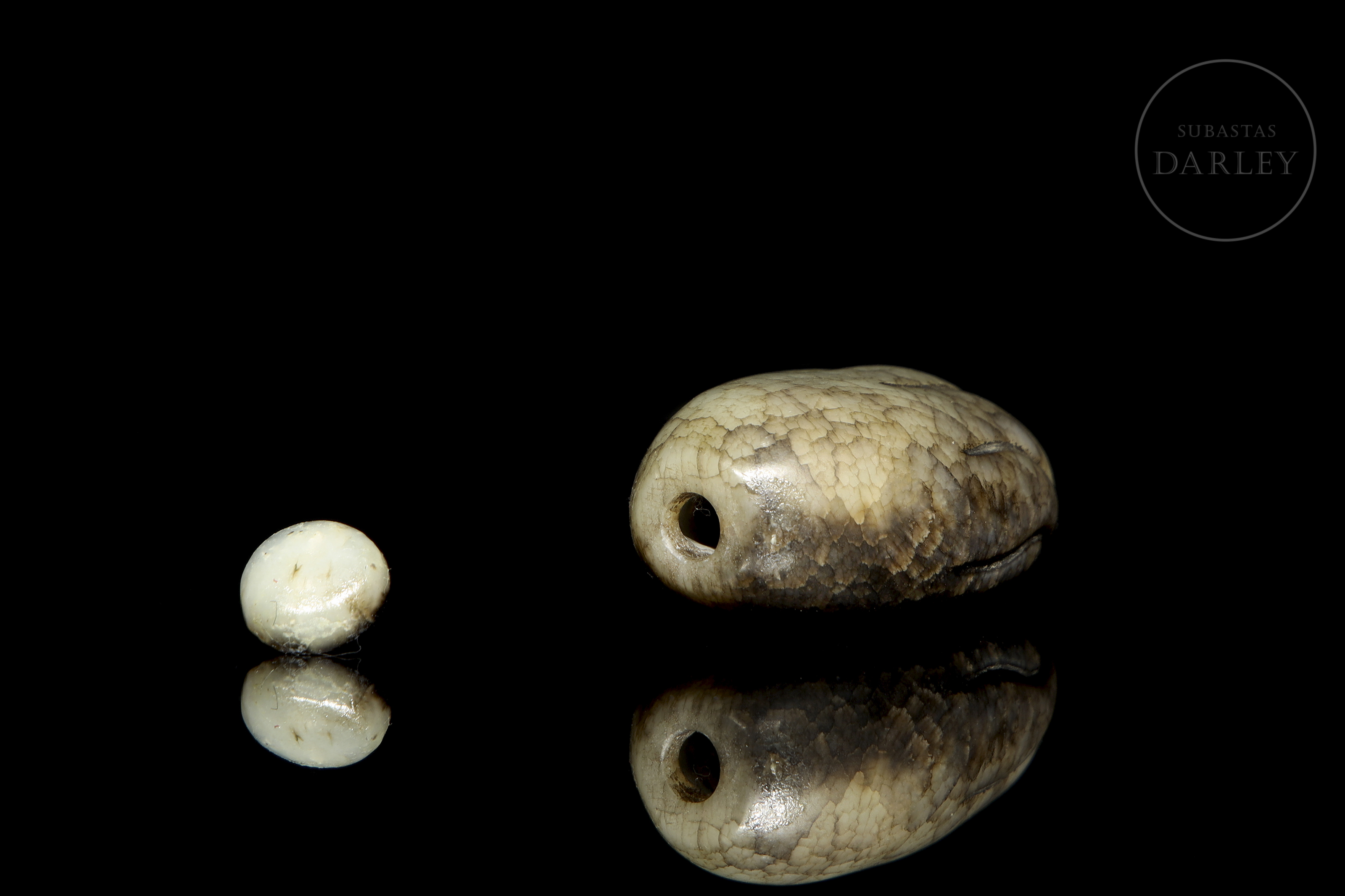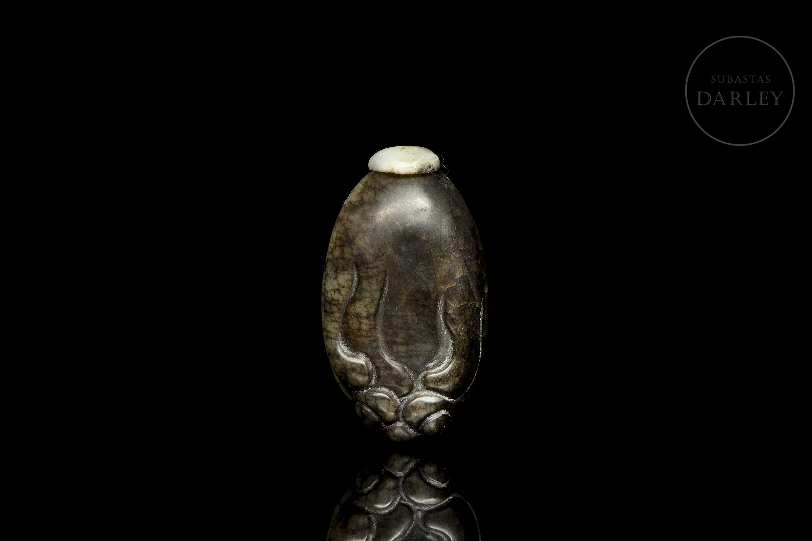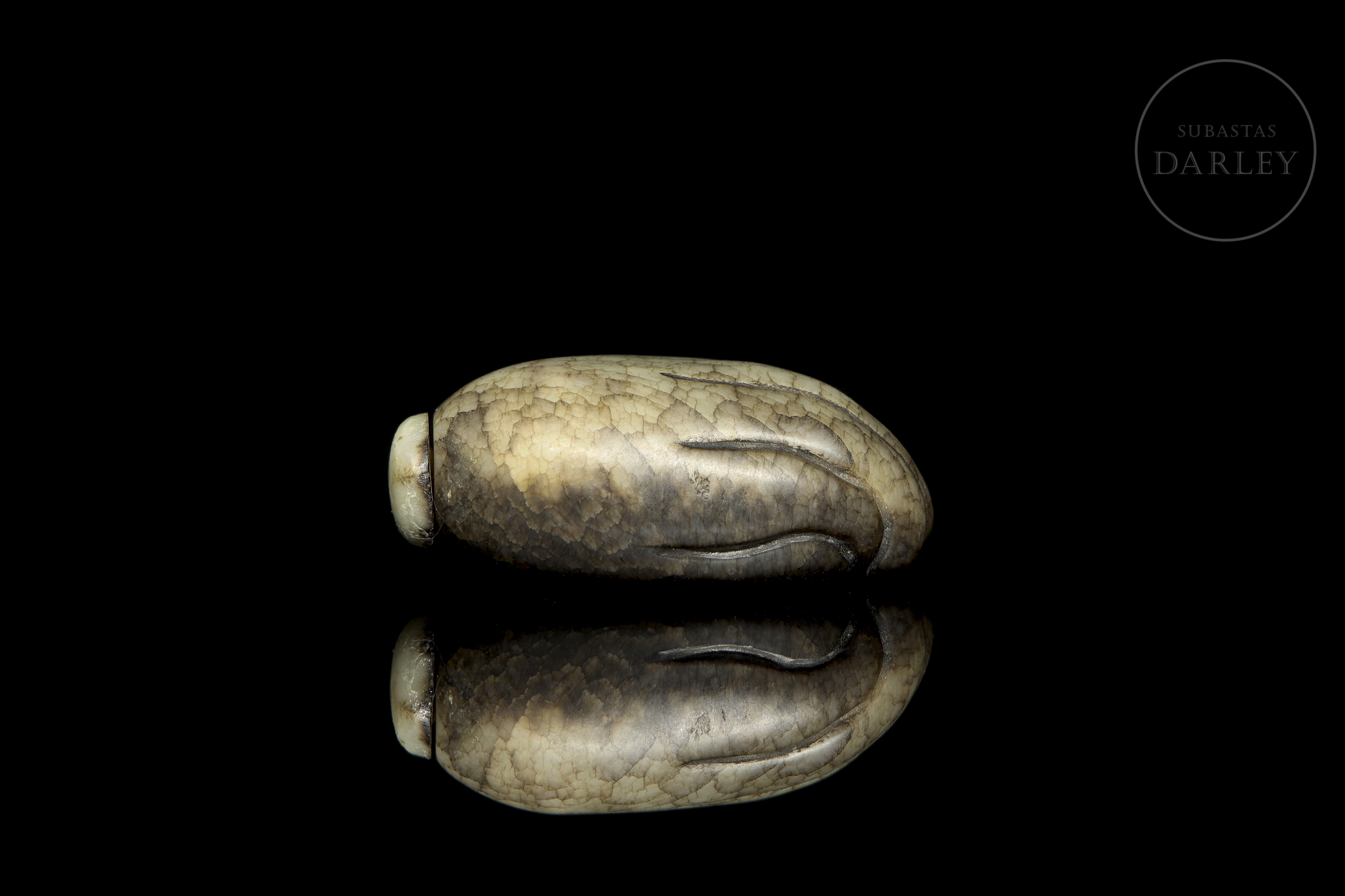 白玉器,表面布满明显的龟裂纹。器形仿柠檬果实,即俗称的“佛手柑”,以刻线勾勒其形态。器身呈卵形,颈短,顶部配有同质白玉塞。清代(1644–1912)。