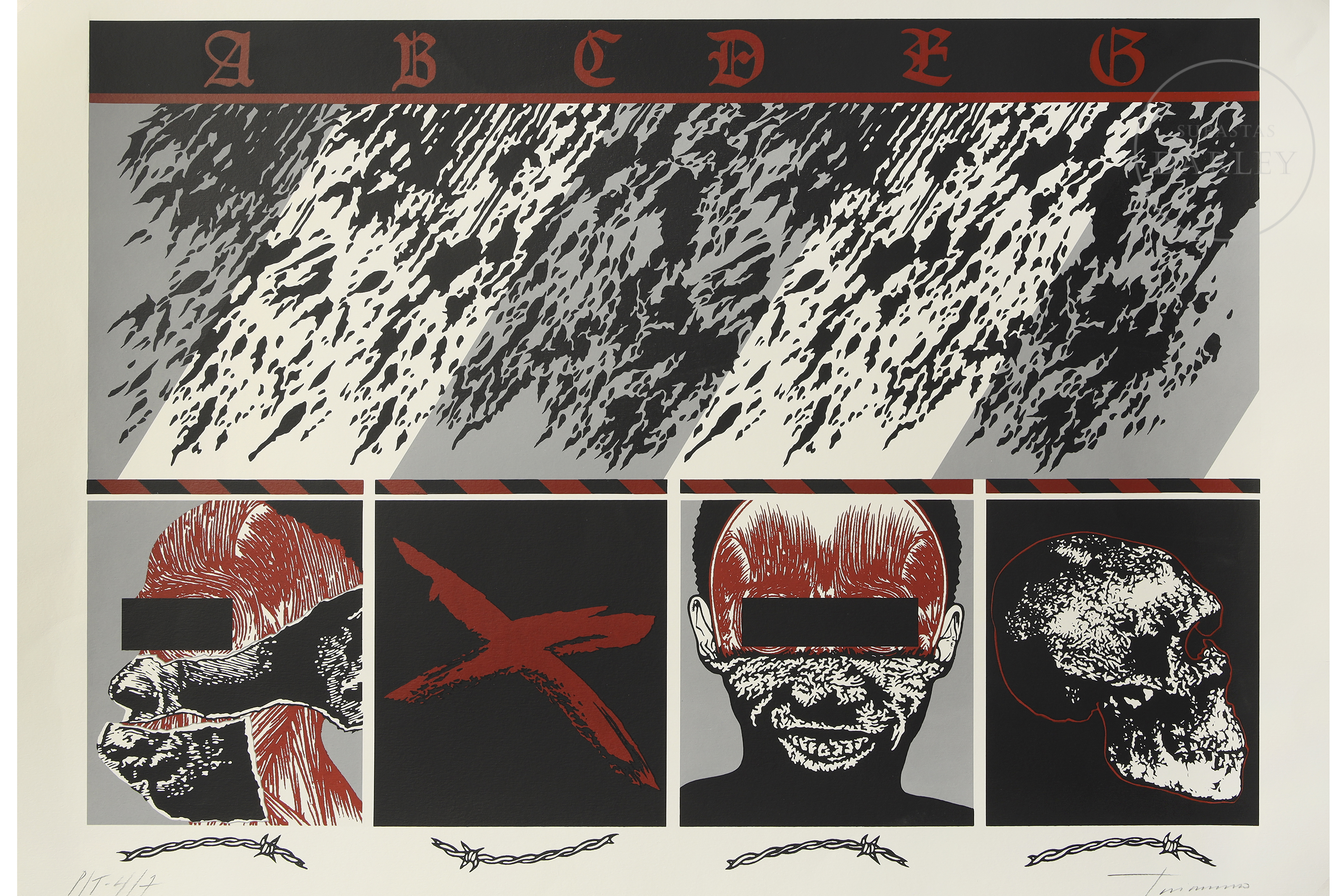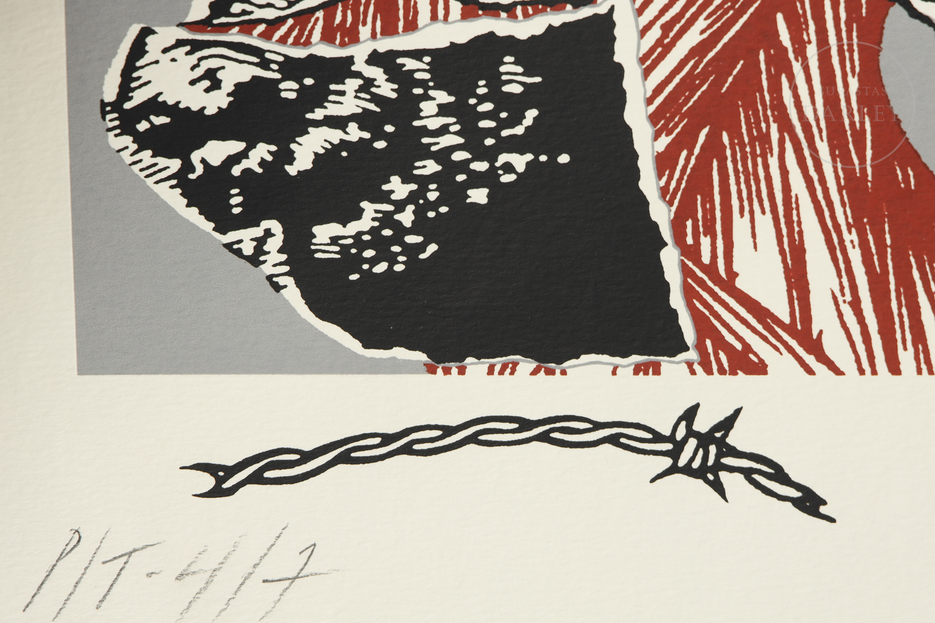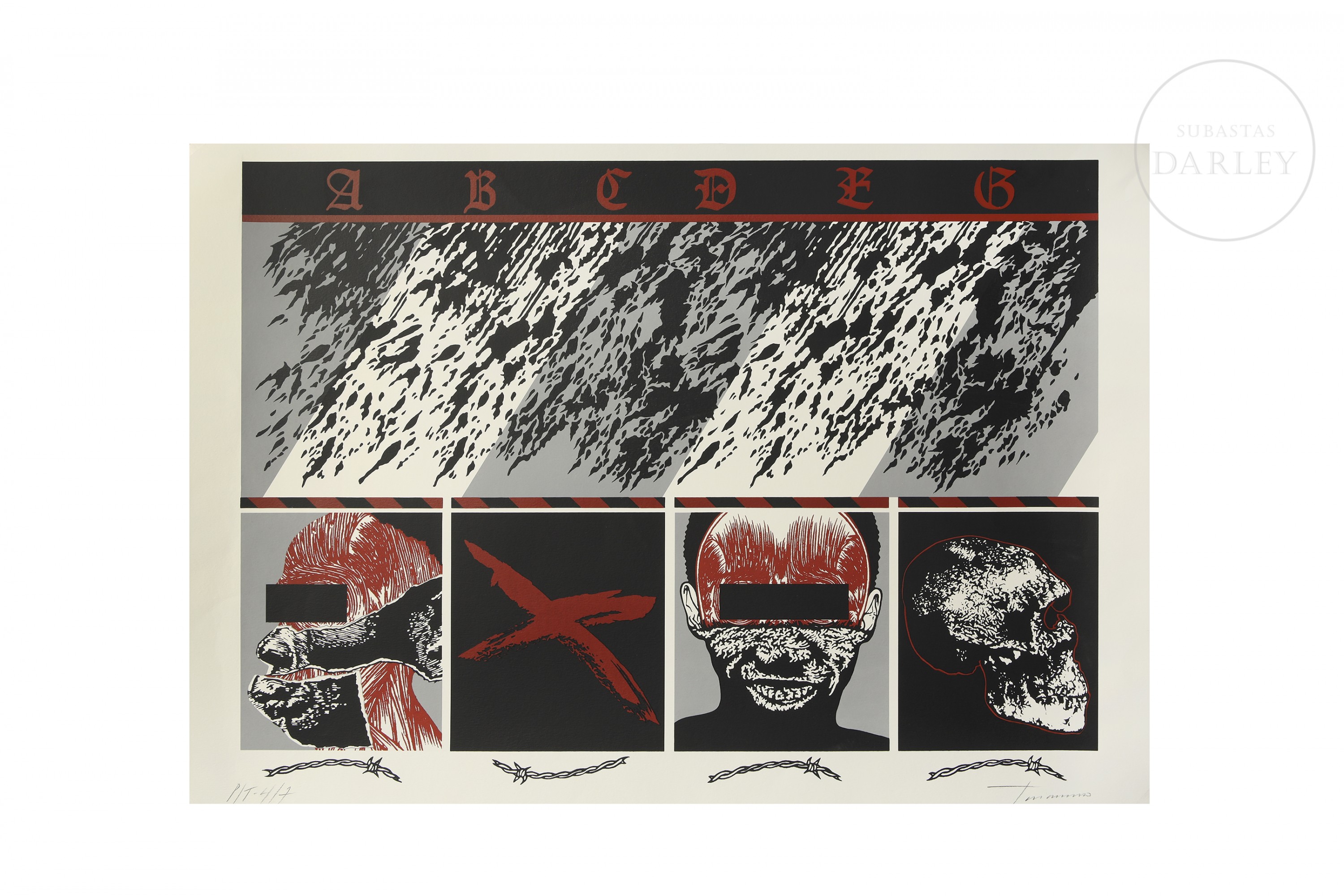 丝网印刷于纸上。画面由网格构成,顶部为字母排列,底部为中性背景上的拼贴人物。右下角签名,左下角铅笔编号“4/7”。