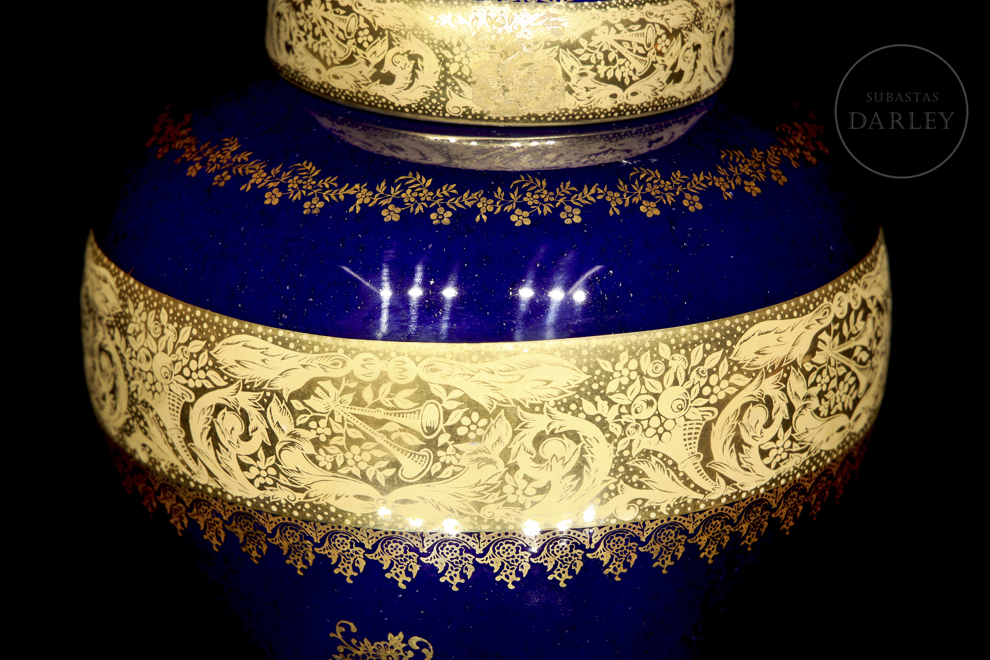 带盖的球形装饰瓷罐,采用瓷质材质,饰以浓郁的钴蓝色釉彩。罐身饰有繁复的金色带纹,图案包含镂空纹样、丰饶角及乐器。底座刻有制造商标记“Limoges FRANCE”。