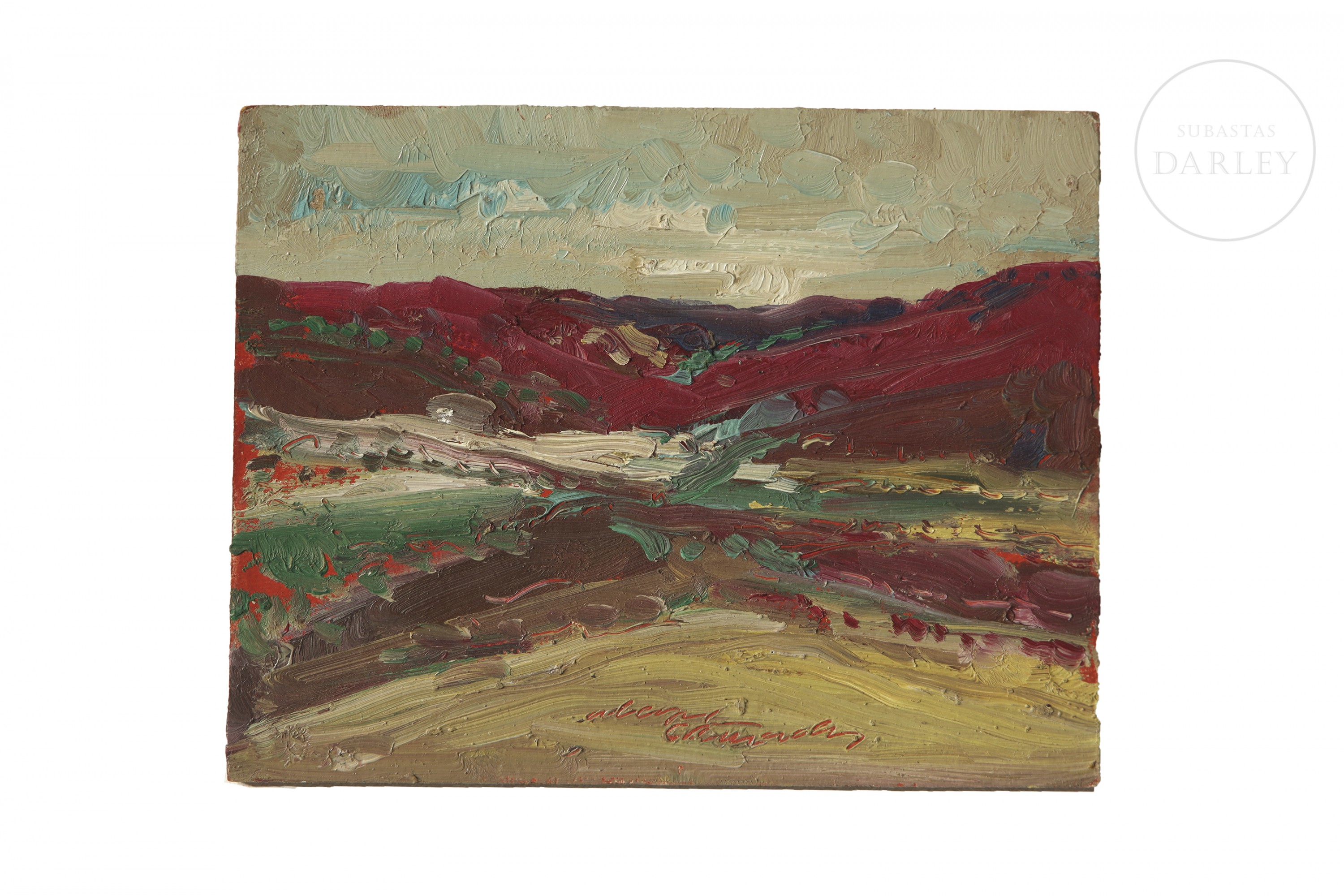 油画布上油画。小型风景习作,描绘晴空下的岩峰景致。左下角签名“Alegre Cremades”。作品底部中央位置。背面签名、标注位置及创作日期。