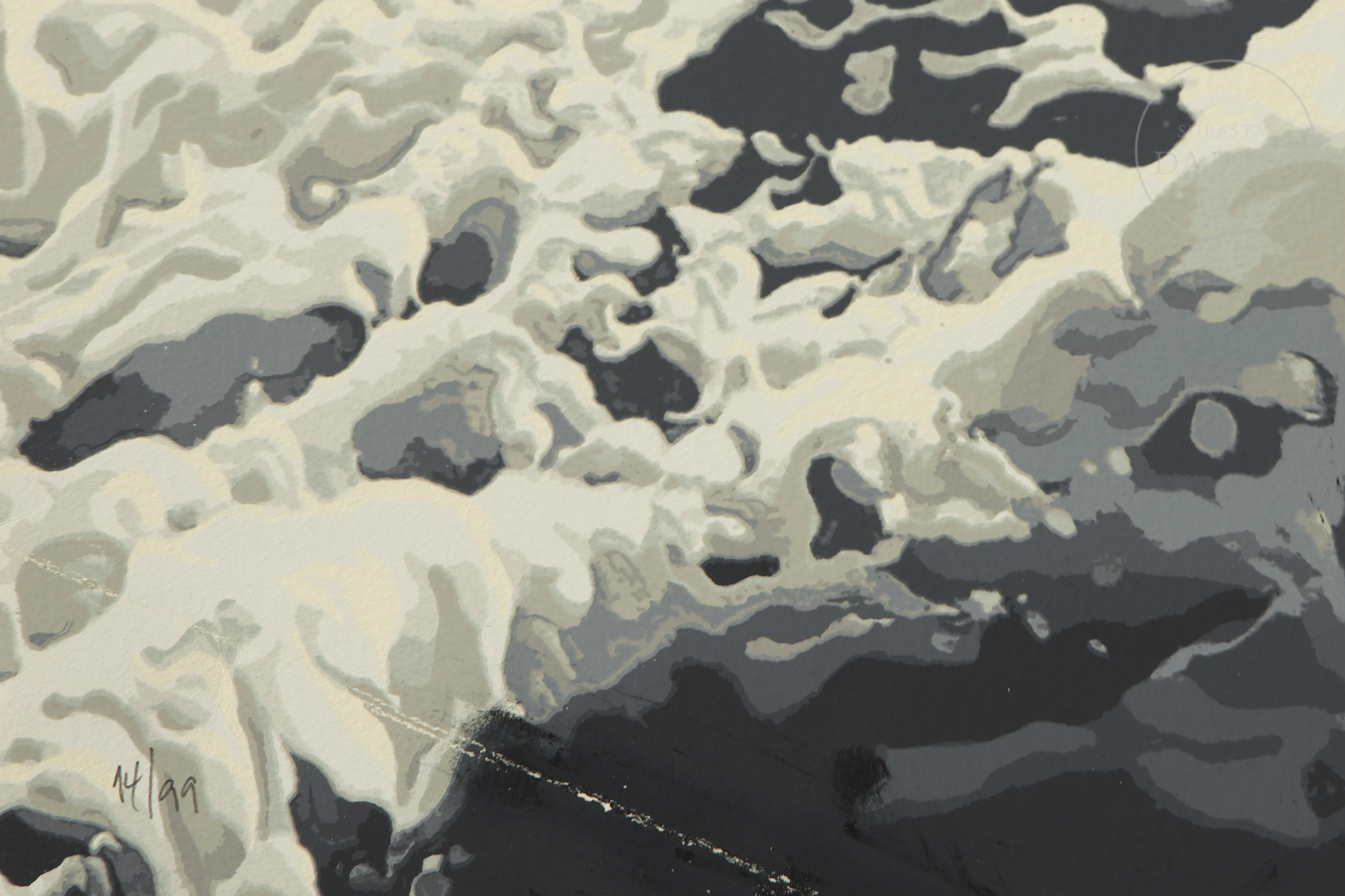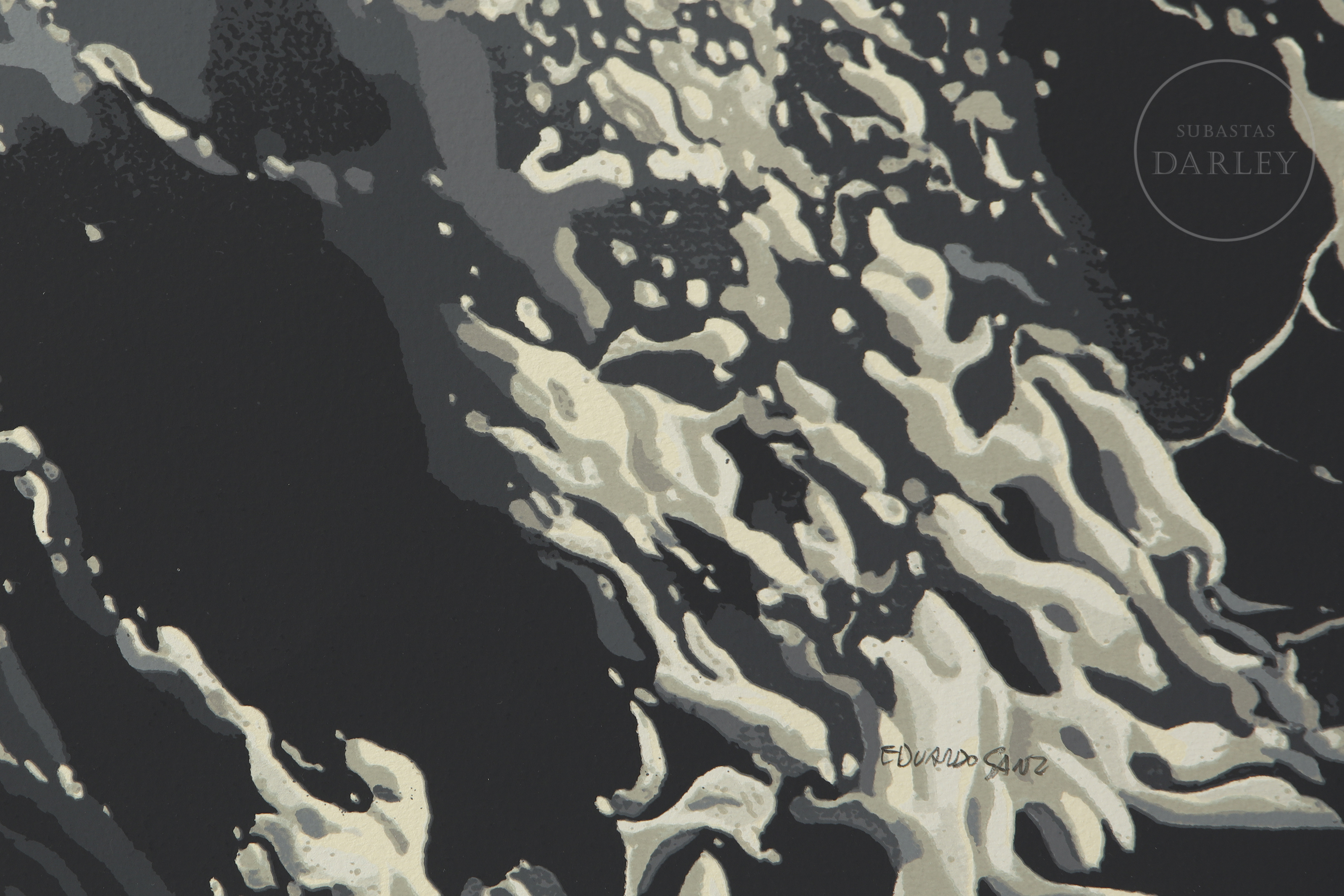 丝网印刷作品,纸本,喷枪提亮处理。描绘海浪拍岸的海洋场景。右下角签名“EDUARDO SANZ”,左下角铅笔编号“14/99”。