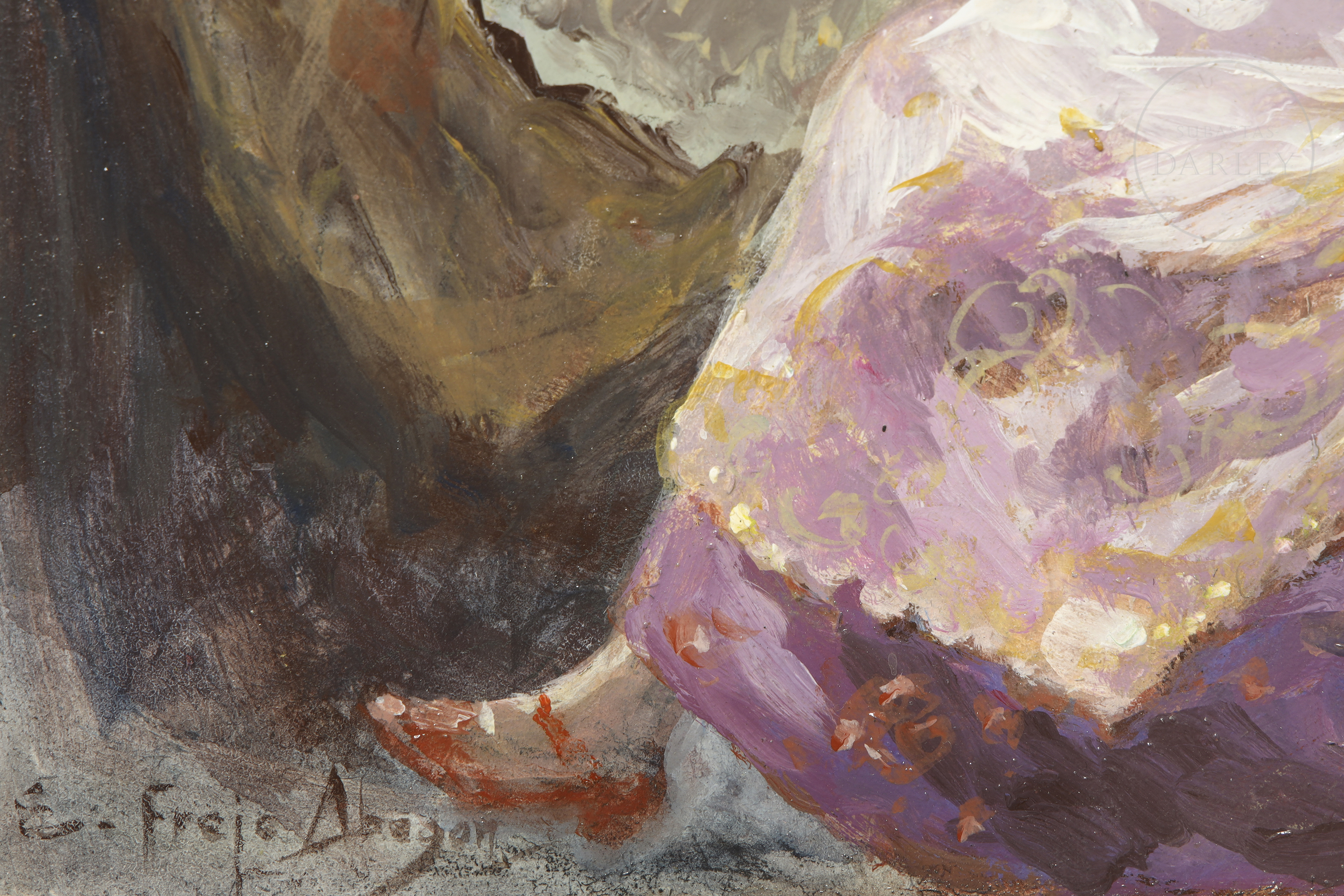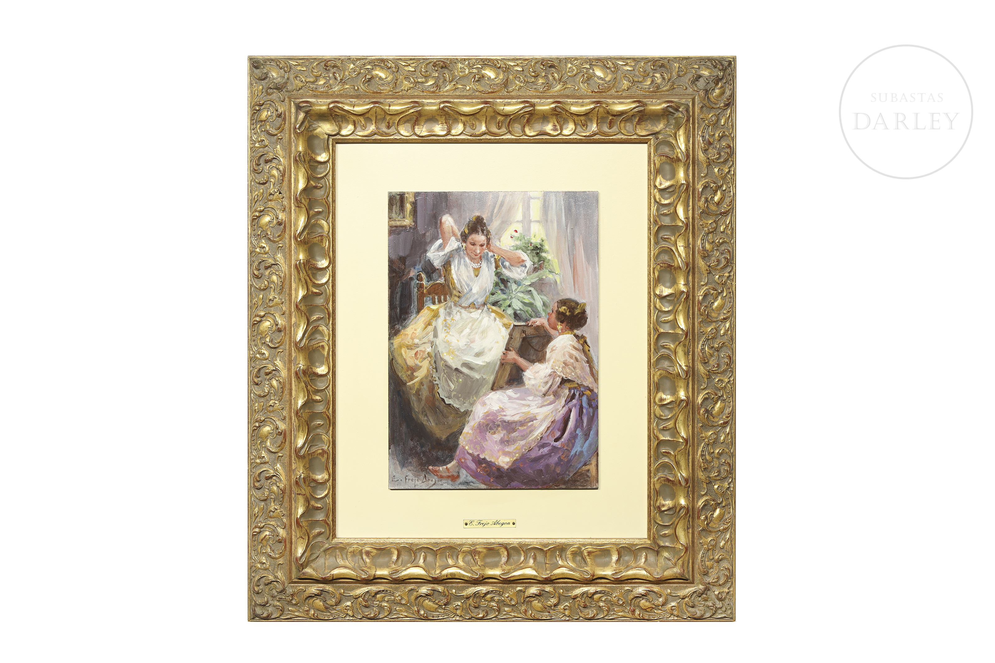 油画板。描绘两位身着传统瓦伦西亚服饰的女性在室内场景的風俗画。左下角签名“E. Frejo Abegón”。背面题名并题献。