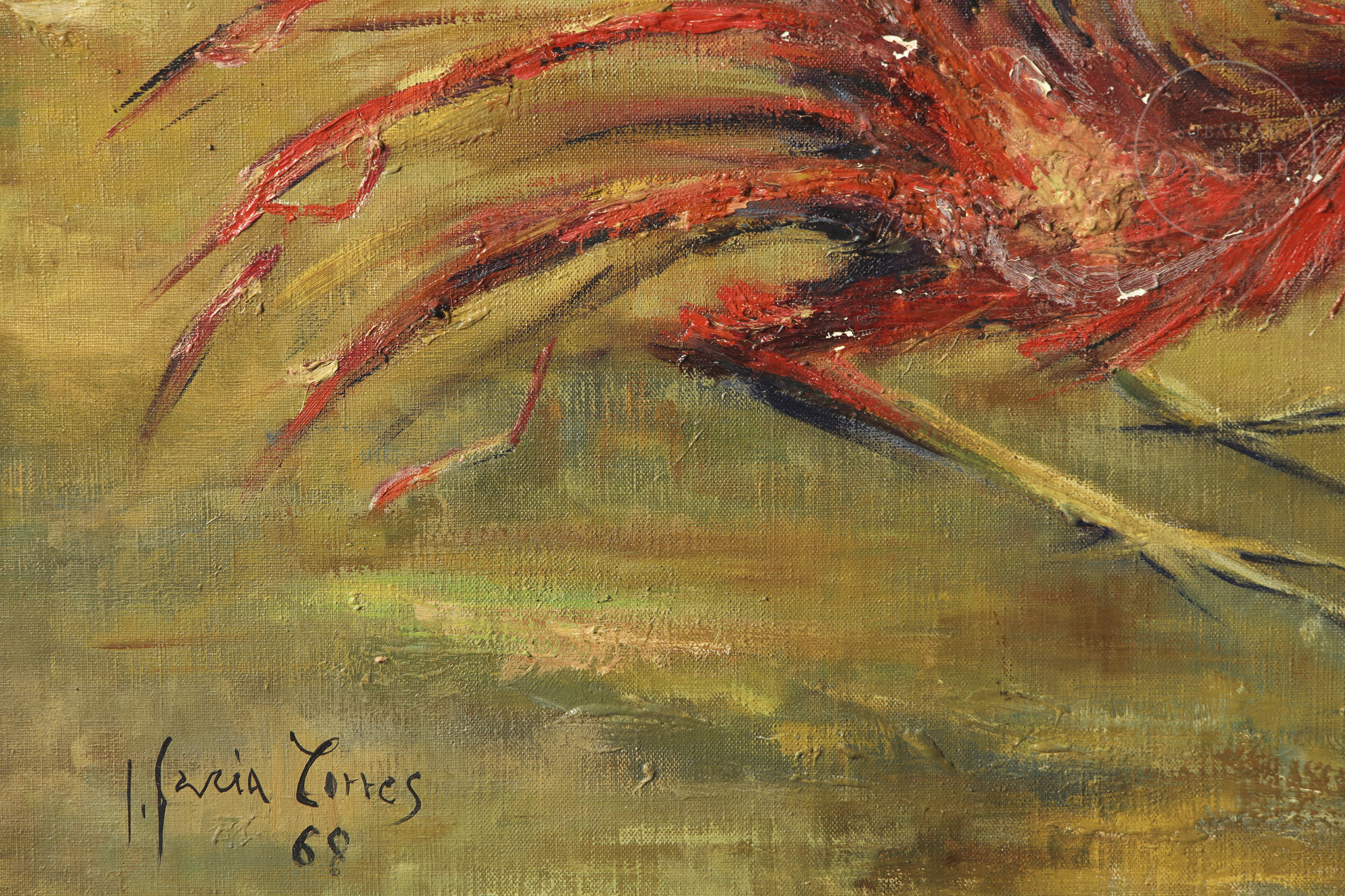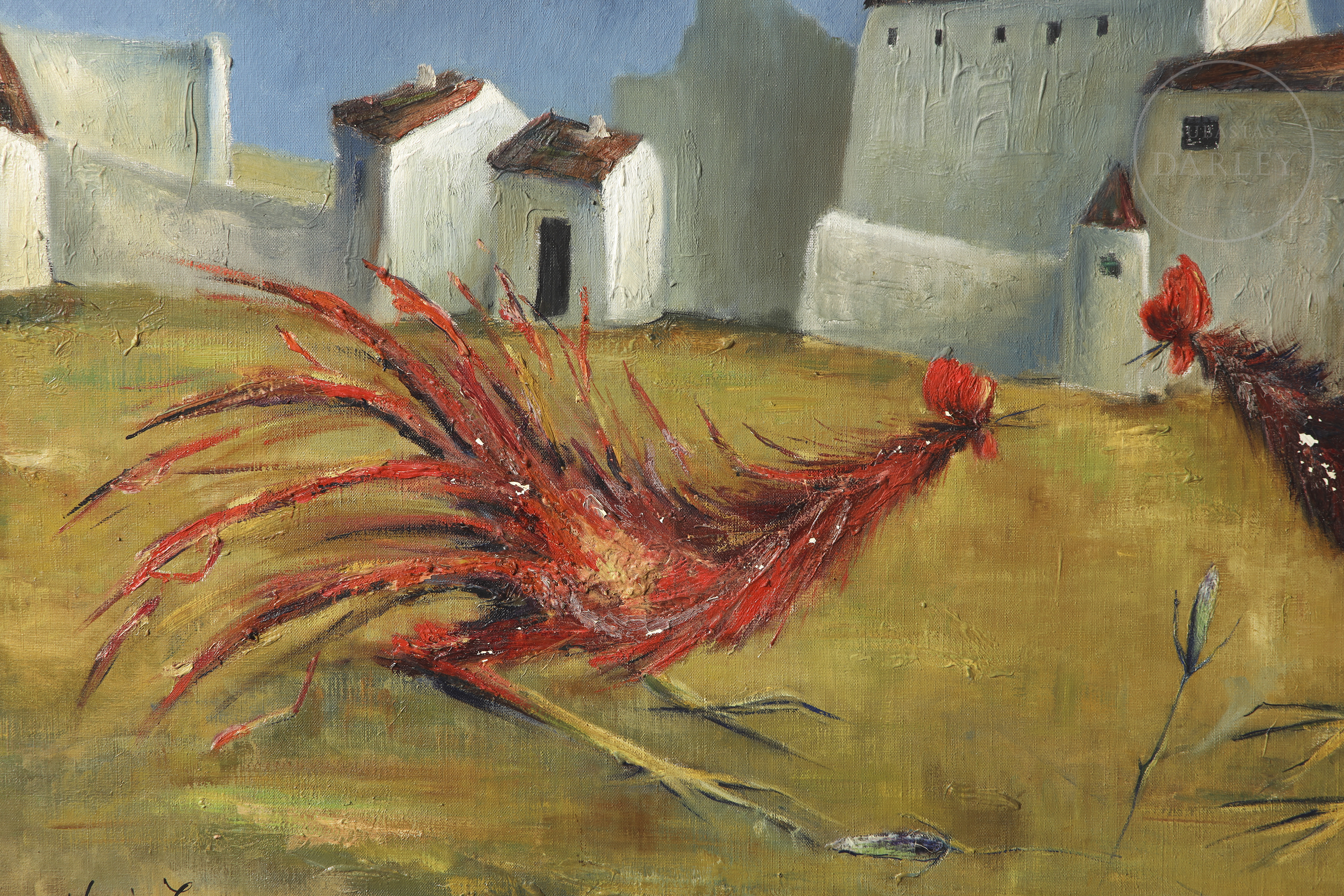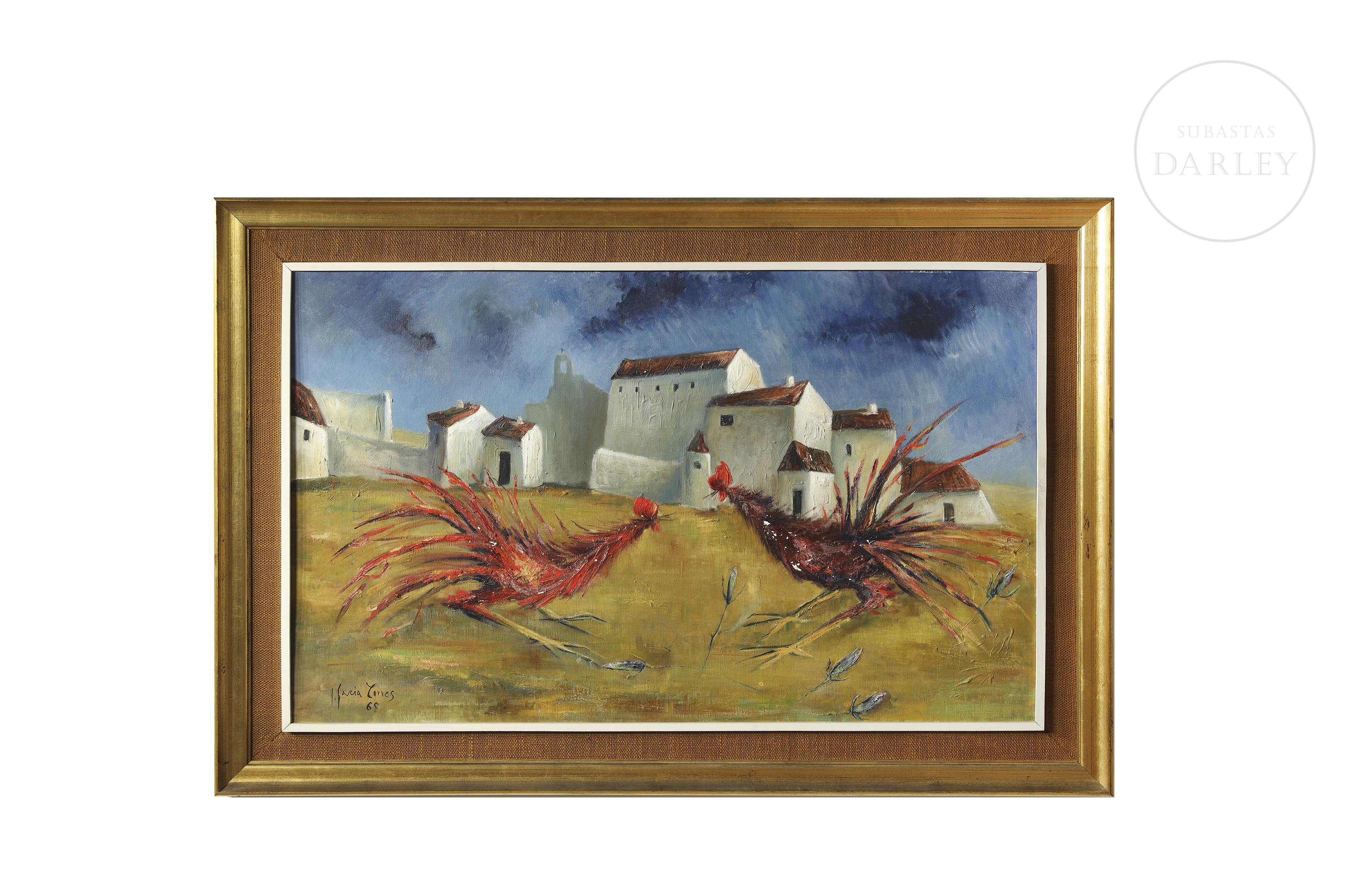 丙烯酸画布作品。大型具象构图描绘两只公鸡在白色房屋群前摆出搏斗姿态。左下角签名并标注日期“J. García Torres/68”。