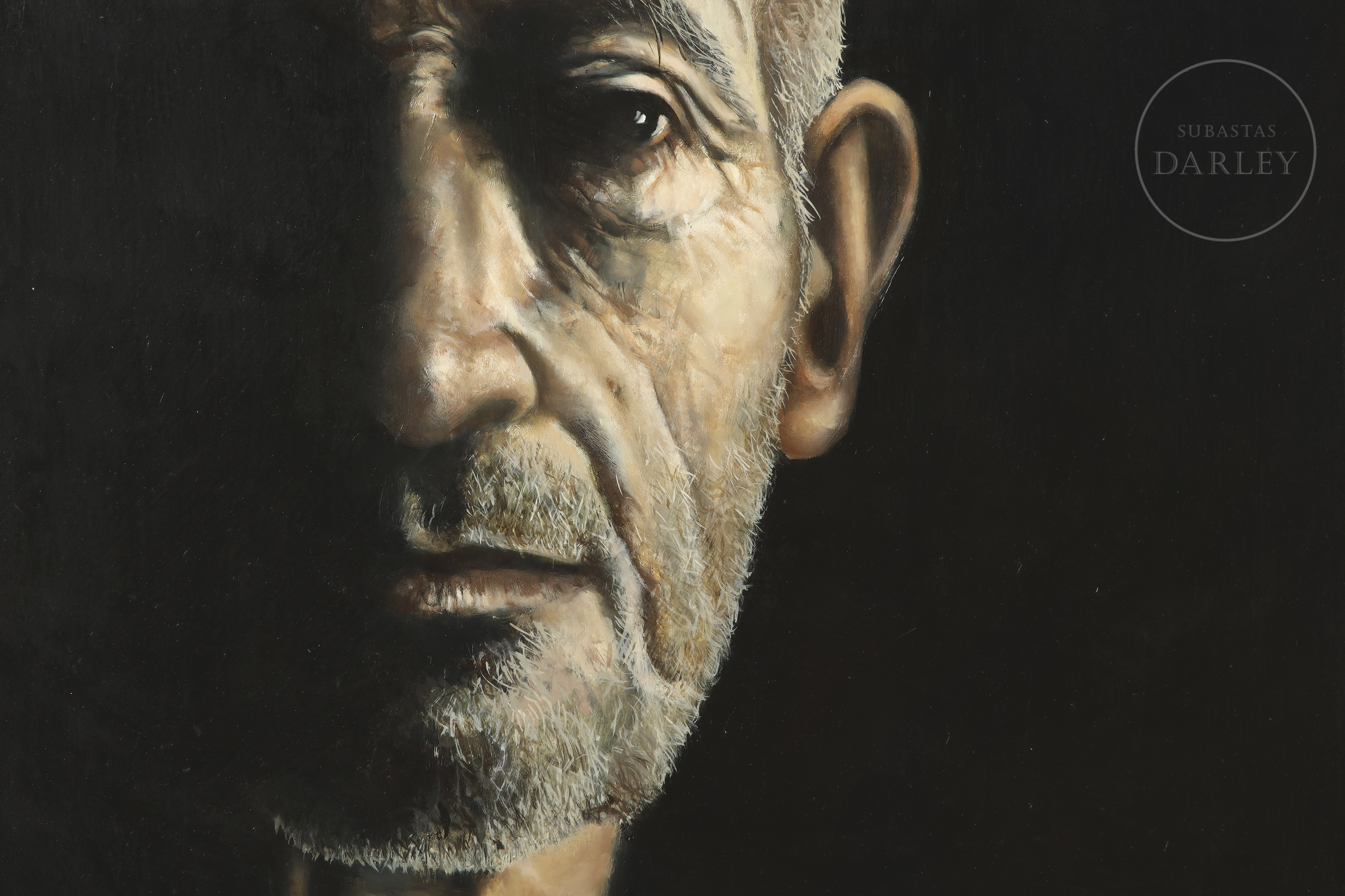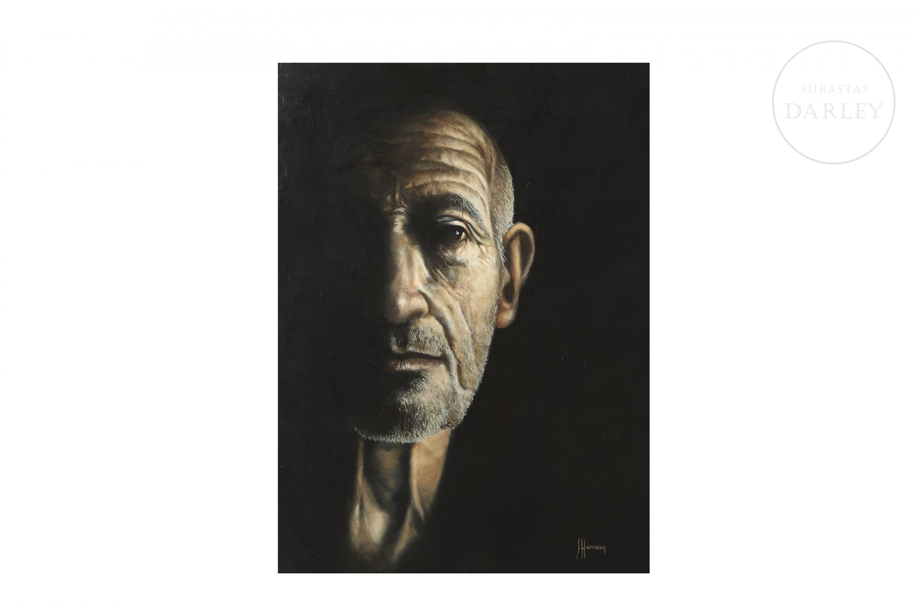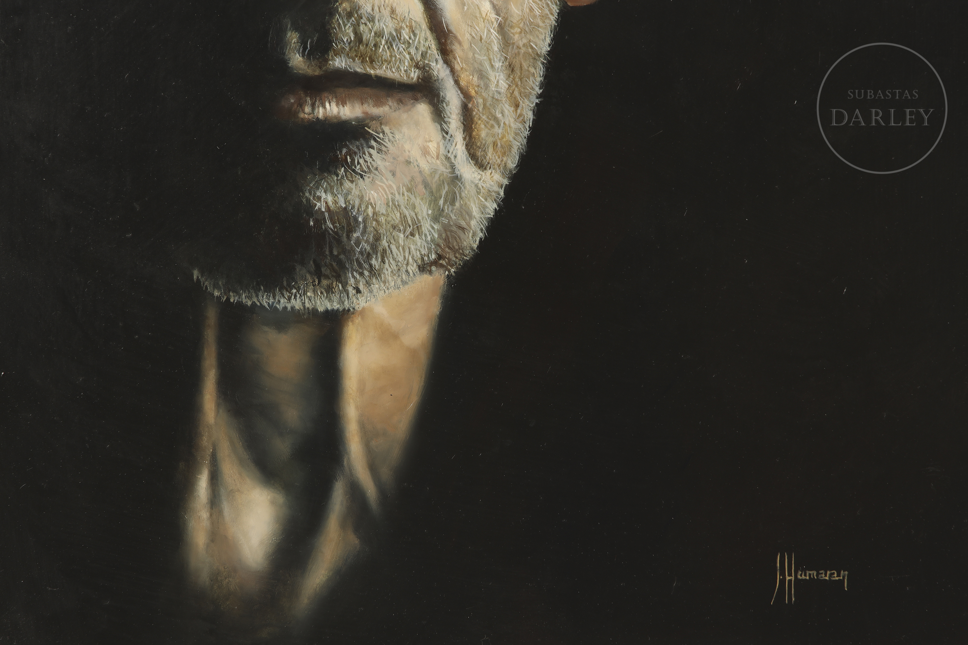 油画板油画。超写实男性特写肖像,黑色背景衬托。右下角签名“J. Humaran”。