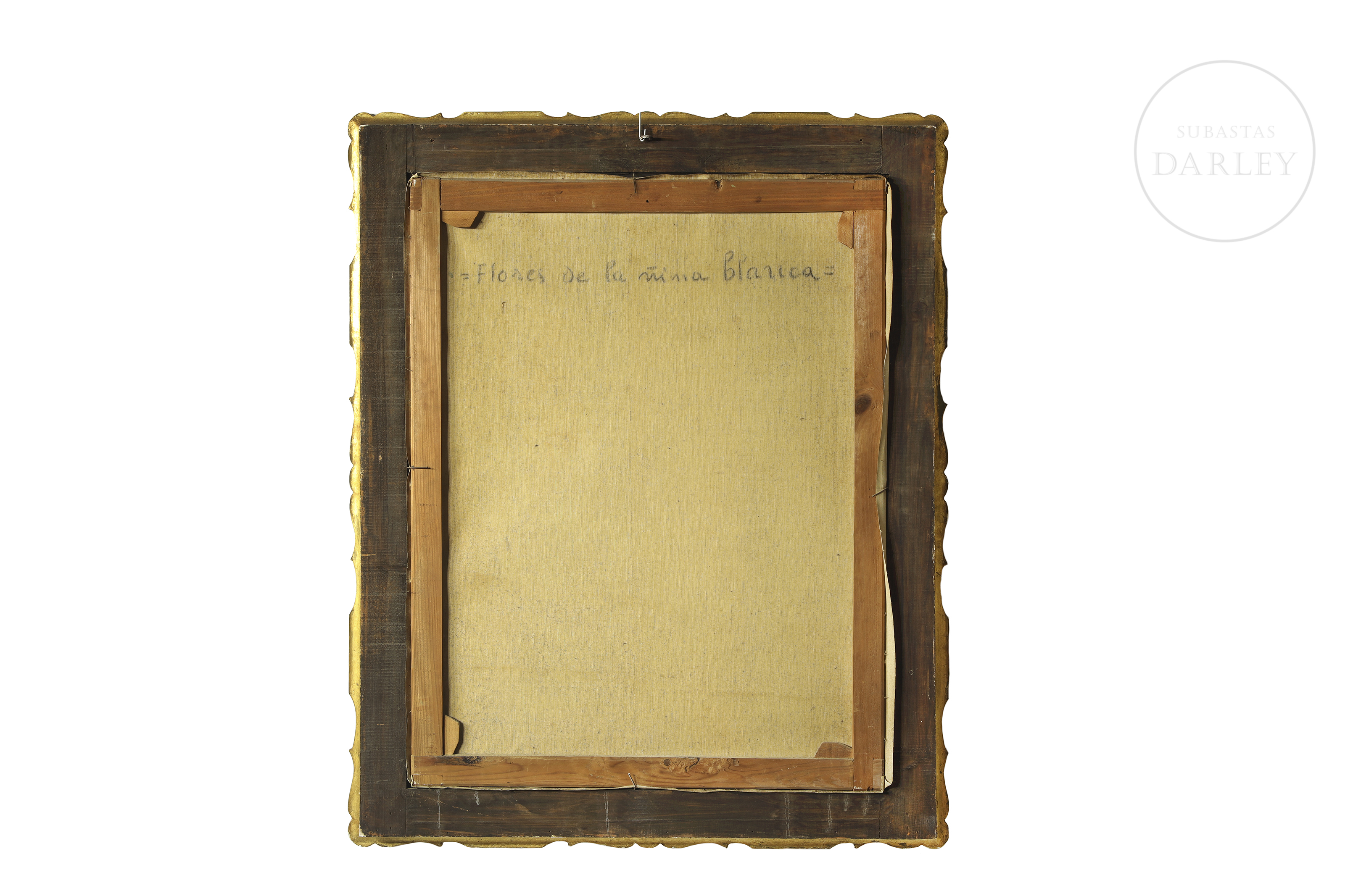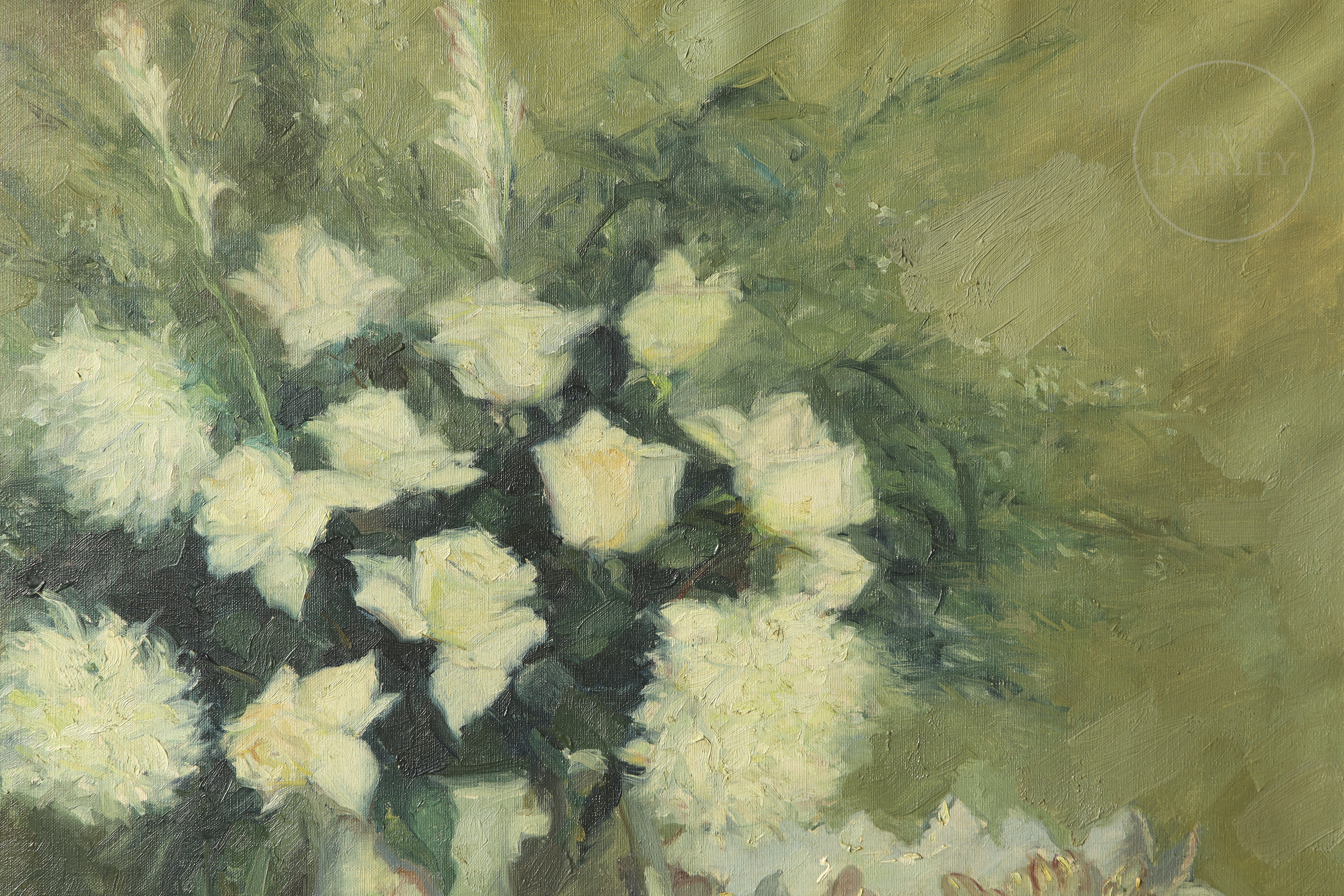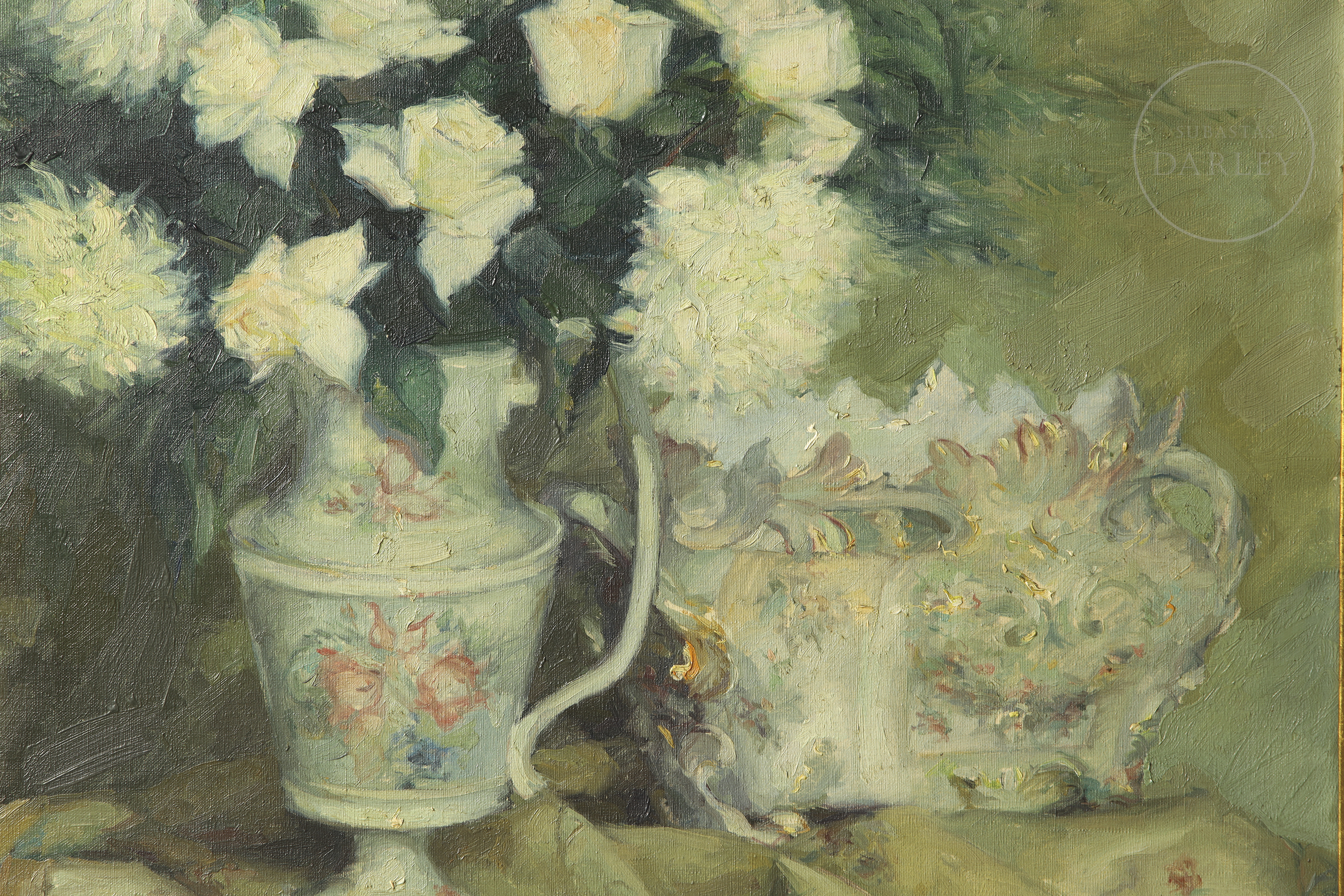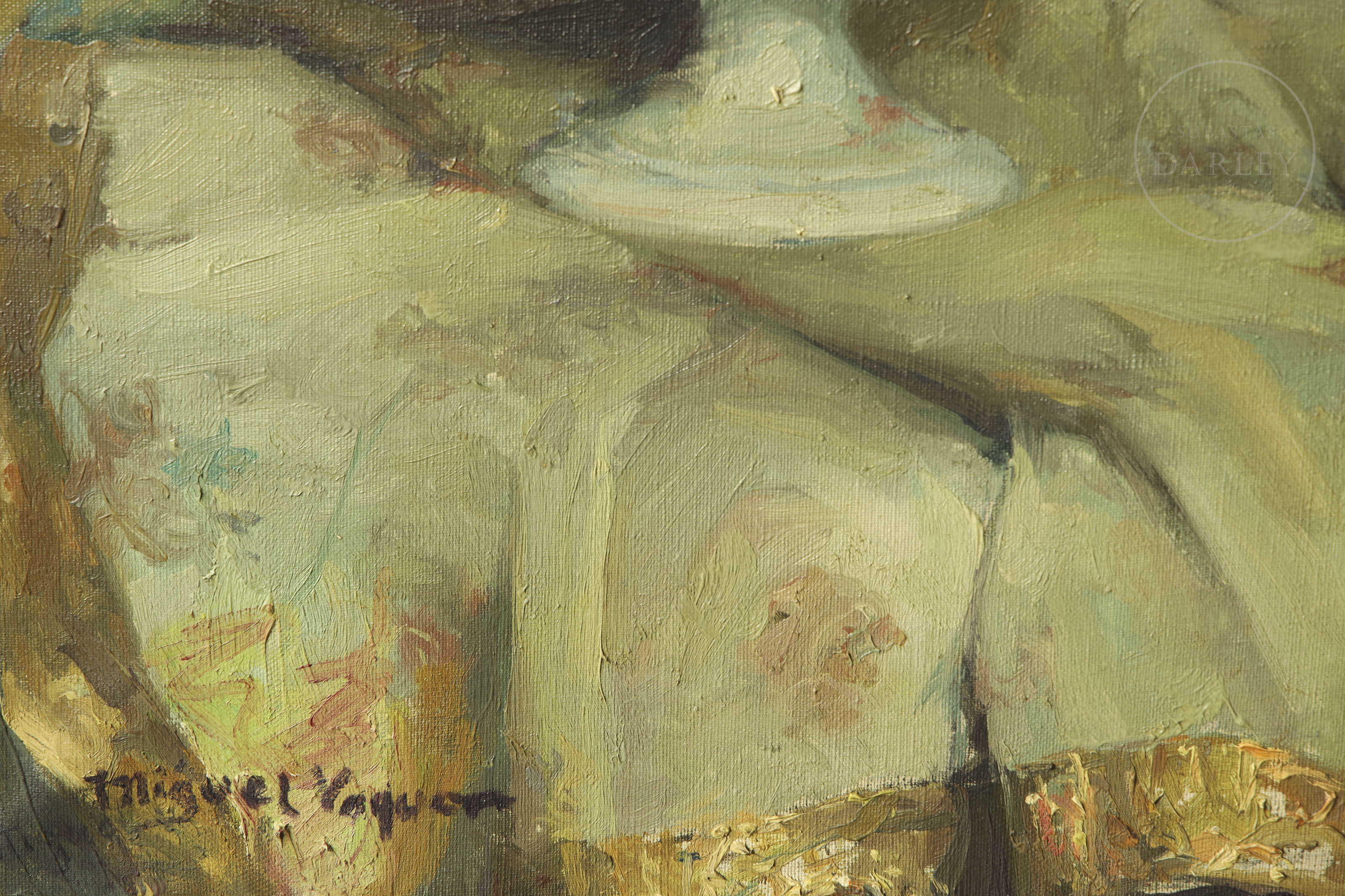 油画布。印象派风格静物画,描绘陶瓷花瓶中盛放的繁茂白花,一旁陈列瓷质汤盅。左下角签名:“Miguel Vaquer”。背面题名。