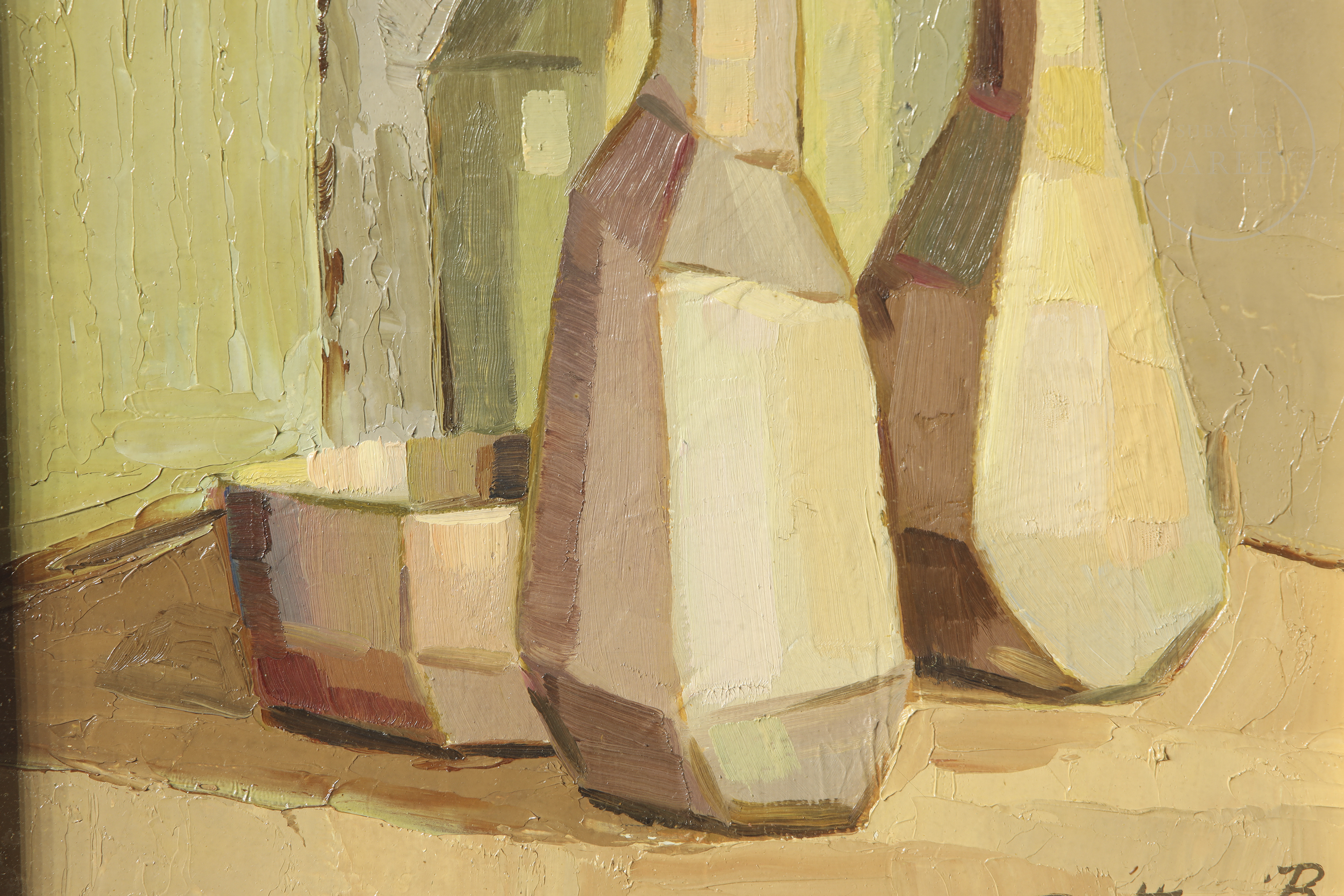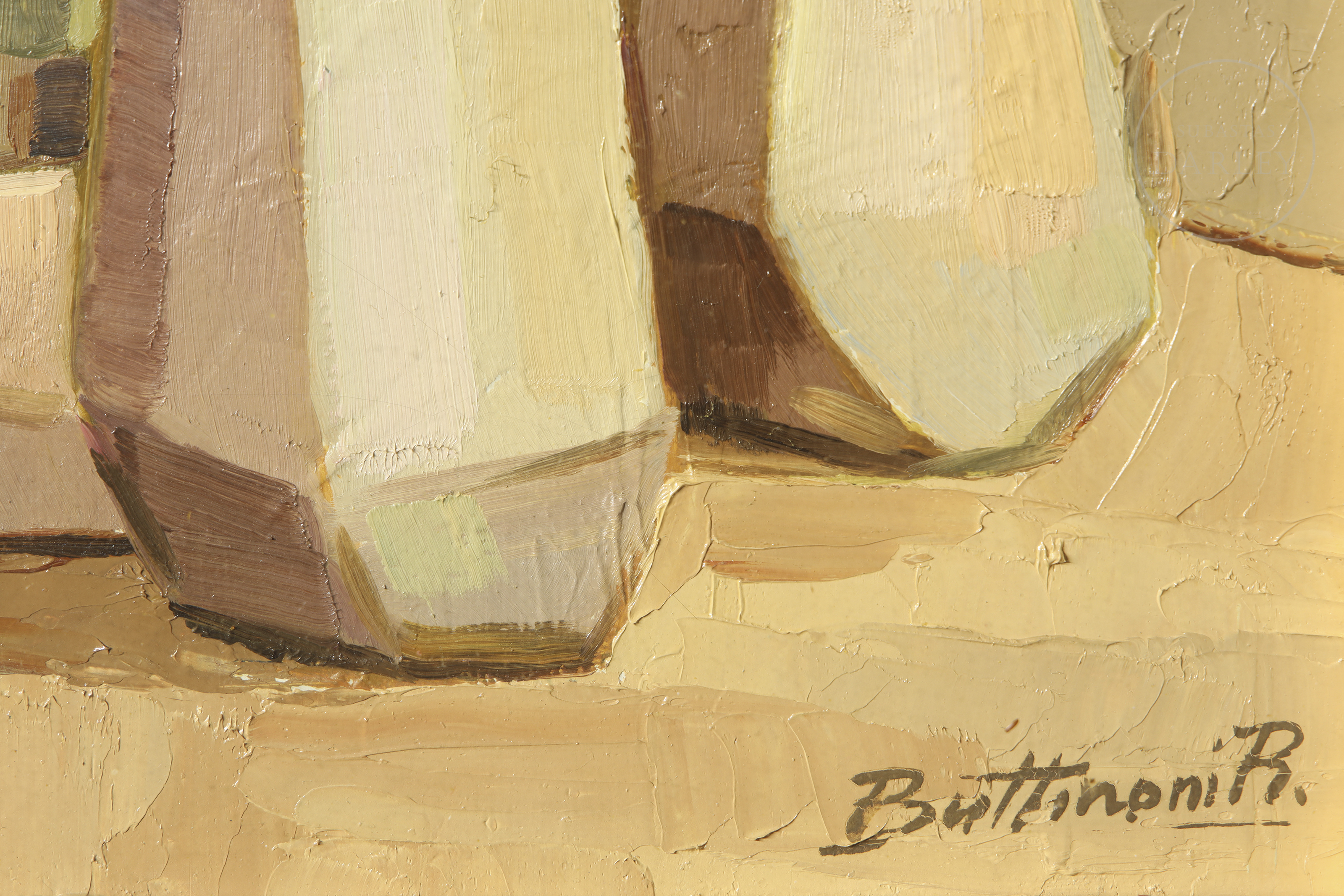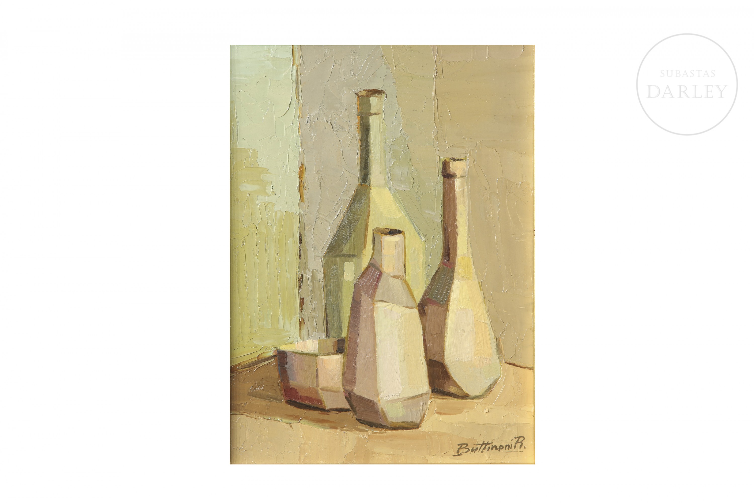 油画板油画。受立体主义启发的赭石色调静物画。右下角签名“Buttinoni R.”。背面签名、题款并注明日期。