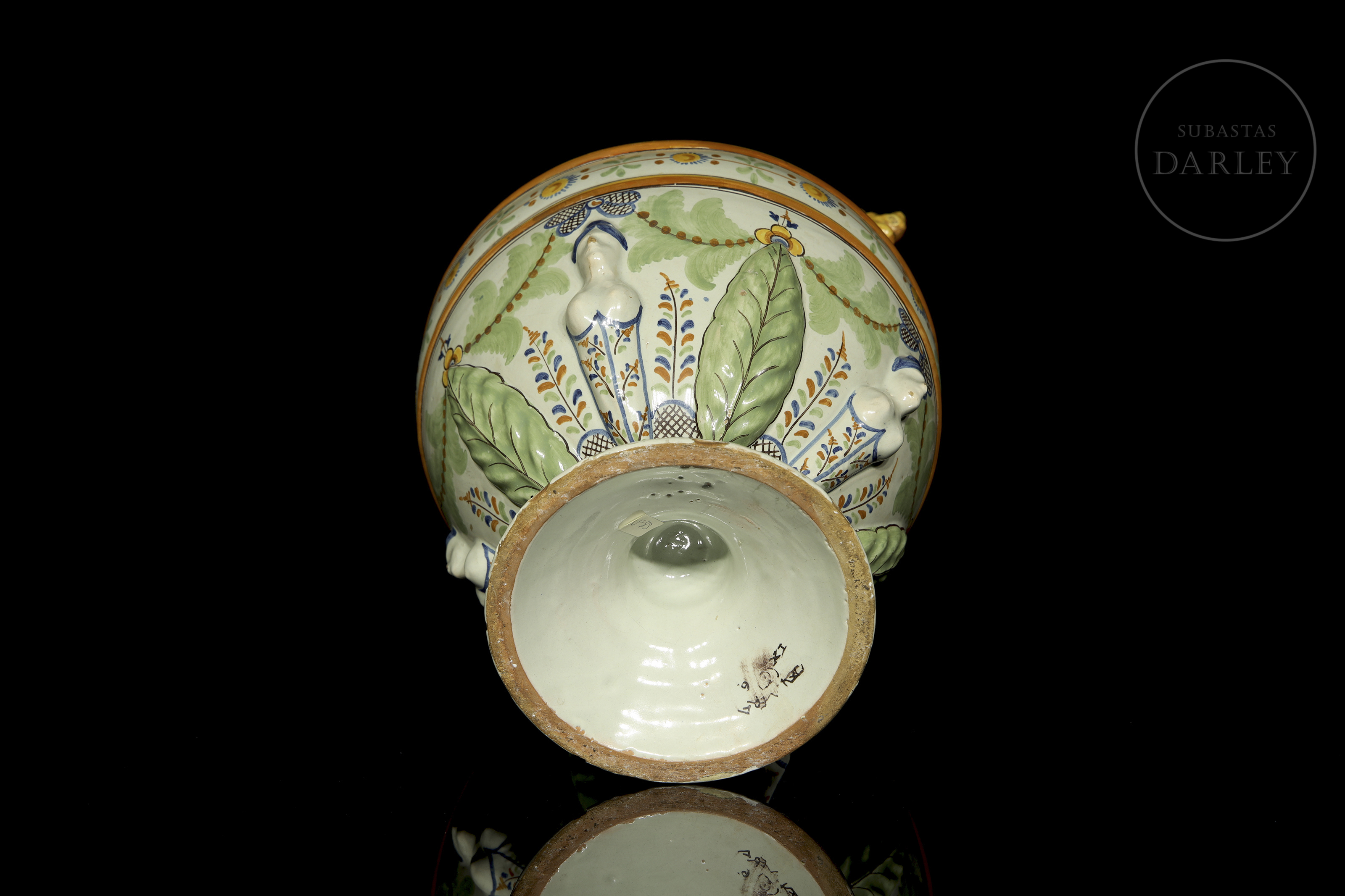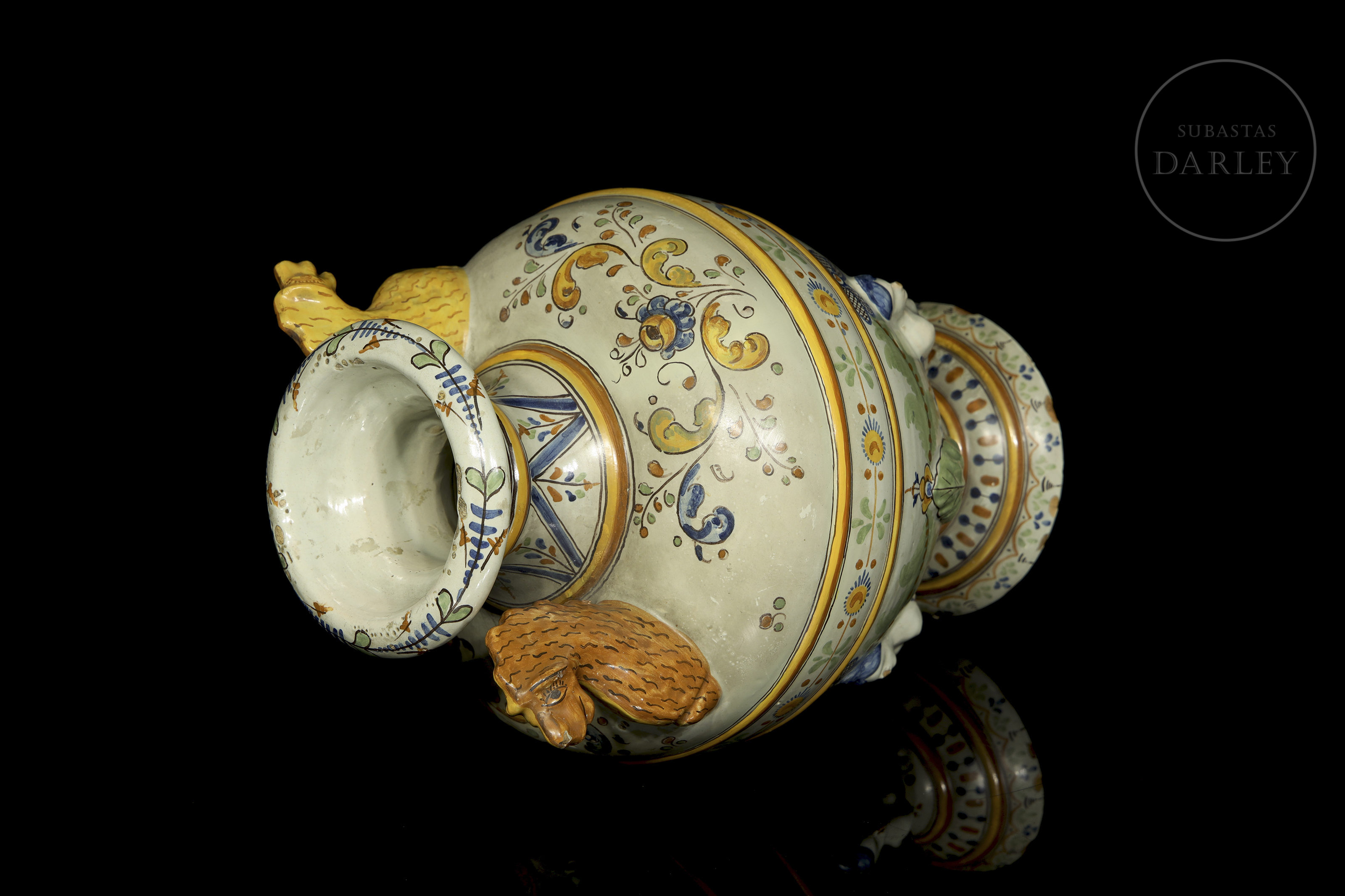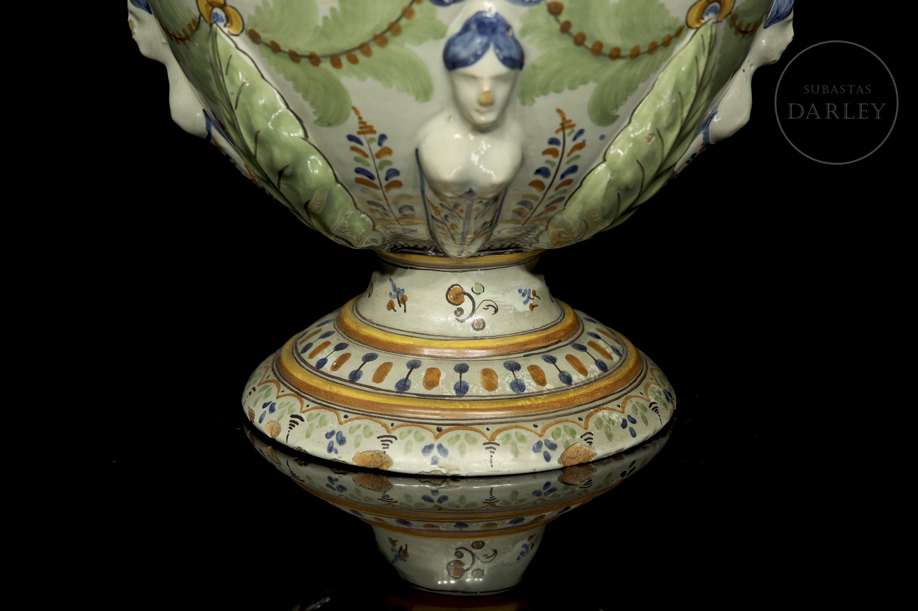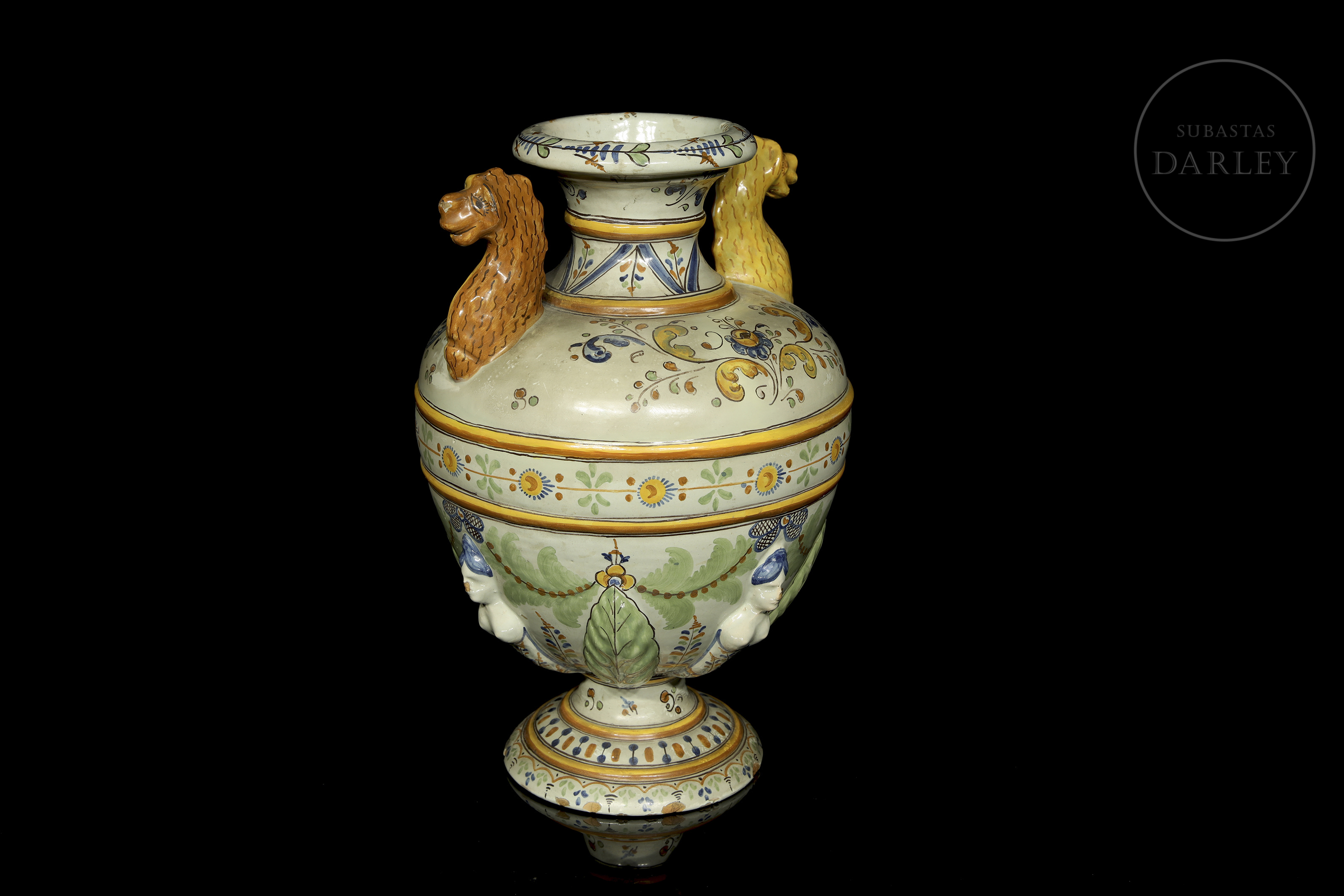 多色釉双耳瓶,饰以17世纪塔拉韦拉风格纹样。瓶身饰有浮雕花卉纹、熊掌叶纹及女性头像。瓶耳以焦糖赭石色调塑成狮首造型。蓝、绿、黄三色釉彩绚丽夺目。