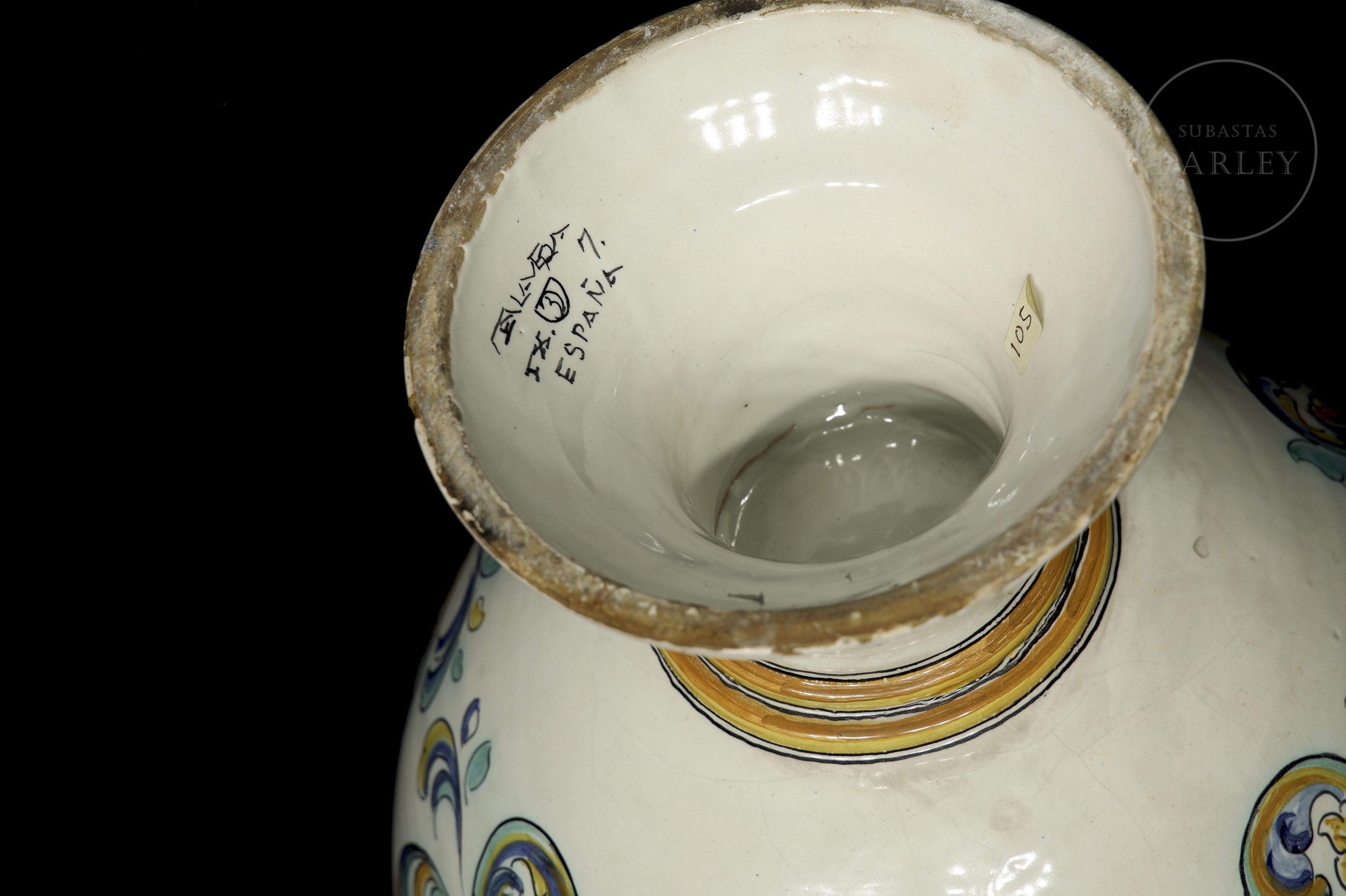 釉面陶瓷(马约利卡陶)。高身球形器,以17世纪塔拉韦拉风格装饰:白色底上饰有蓝、绿、黄色大型花卉纹样与莨苕叶卷草纹。中央纹饰为赭黄双色康乃馨。器底留有艺术家签名缩写,可能属于其创作第三时期。经修复。