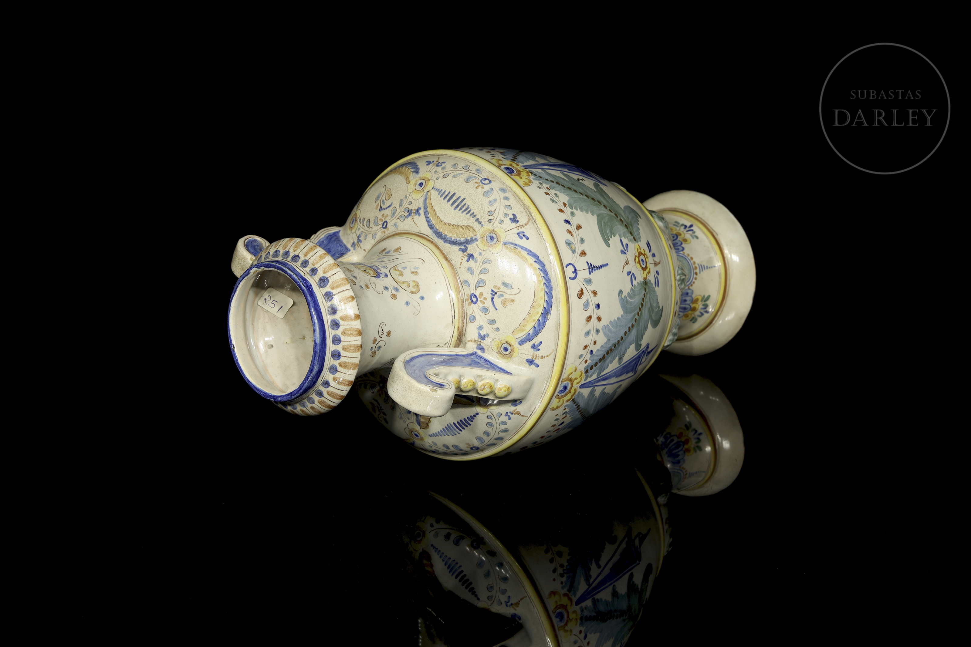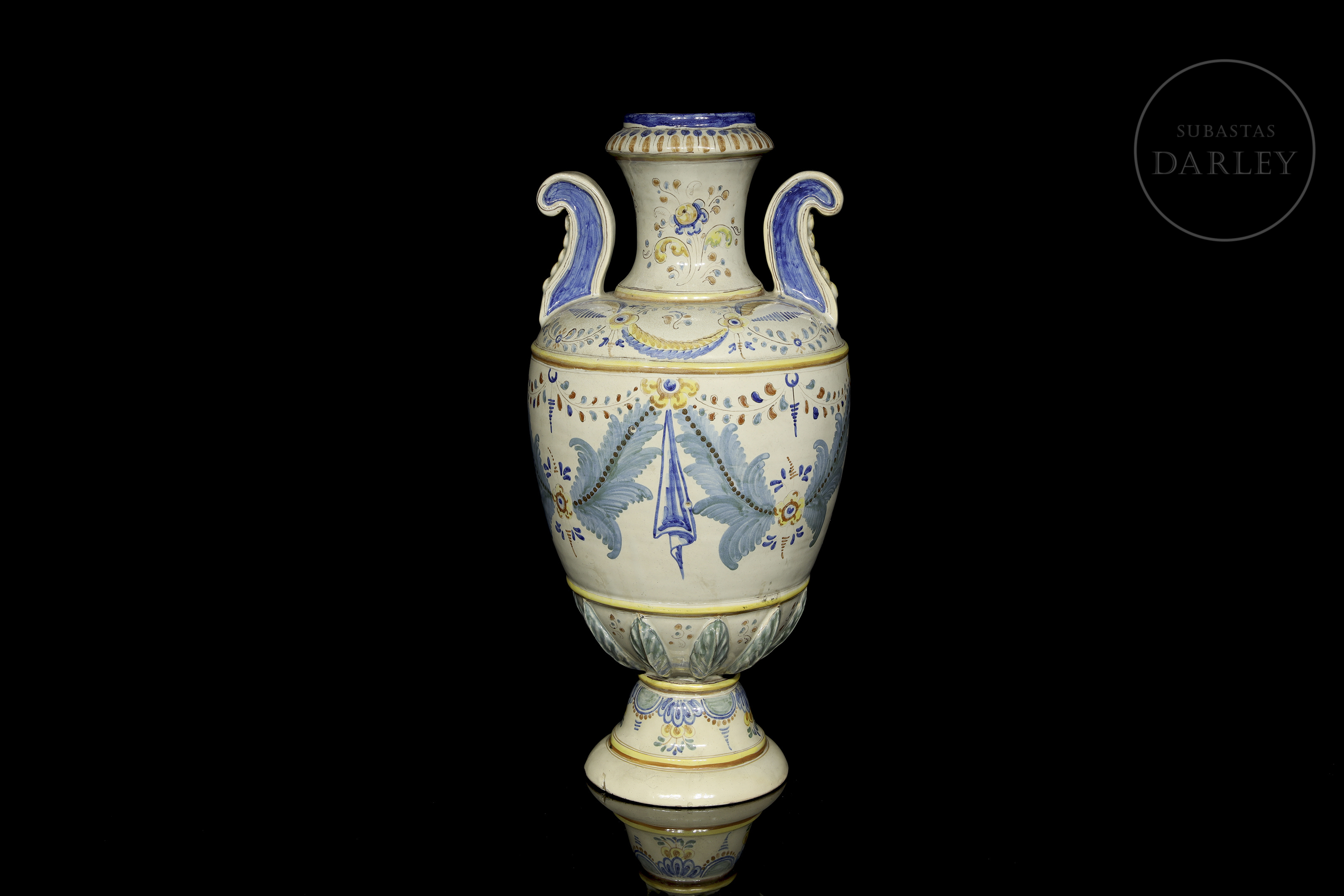 釉面陶瓷(马约利卡陶)。大型双耳罐,带模制底座,饰以钴蓝、绿色与赭石色。罐身饰有悬垂于花环上的大型莨苕叶纹样。弯曲的把手呈深蓝色。罐口内侧刻有艺术家签名缩写。出自艺术家首部作品目录中的31号作品。