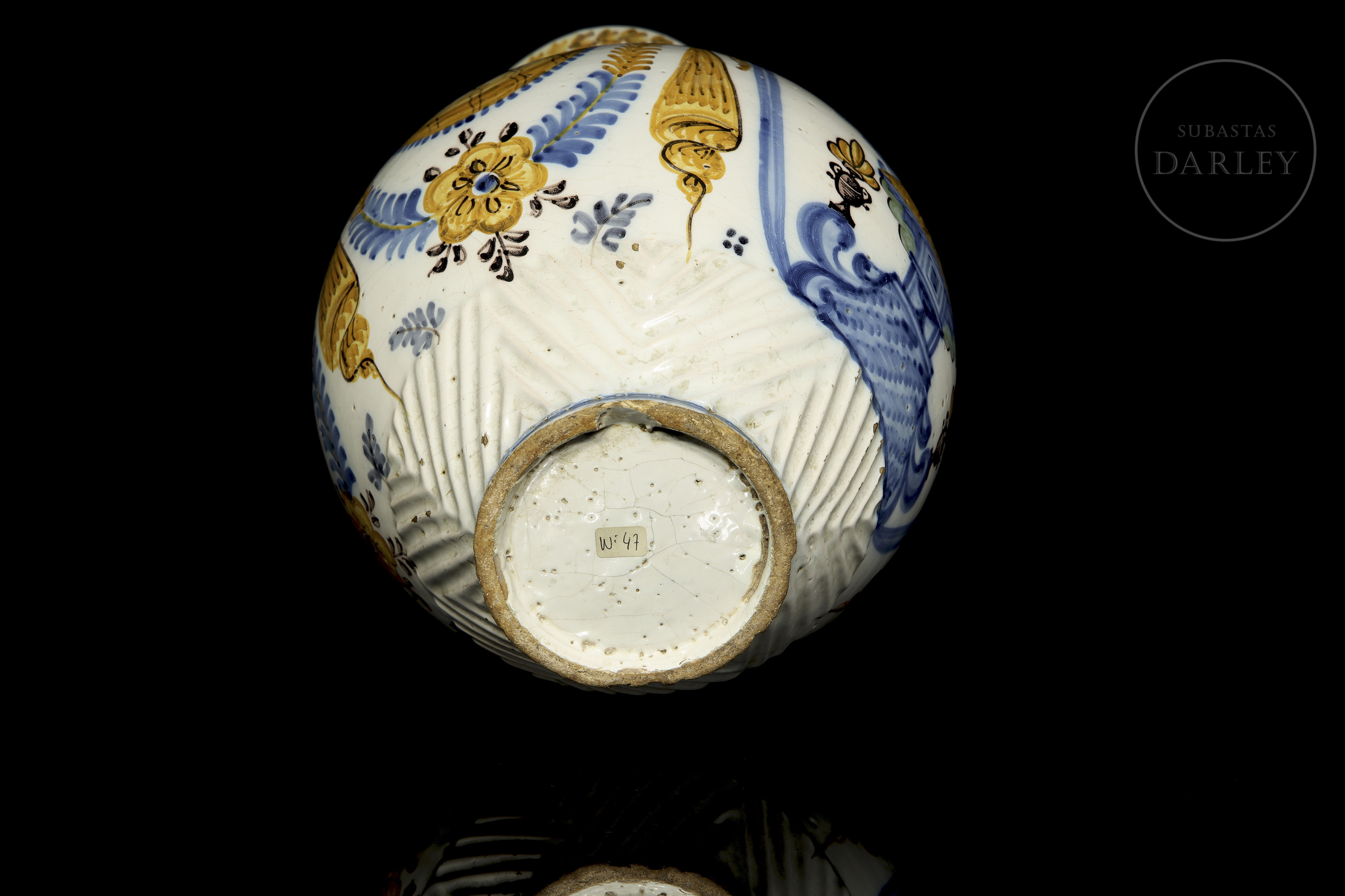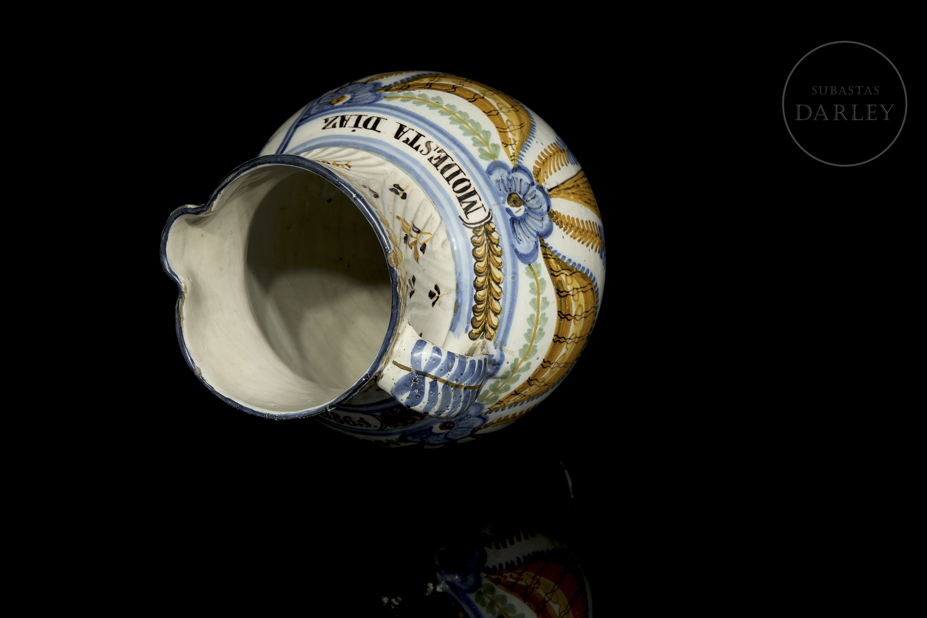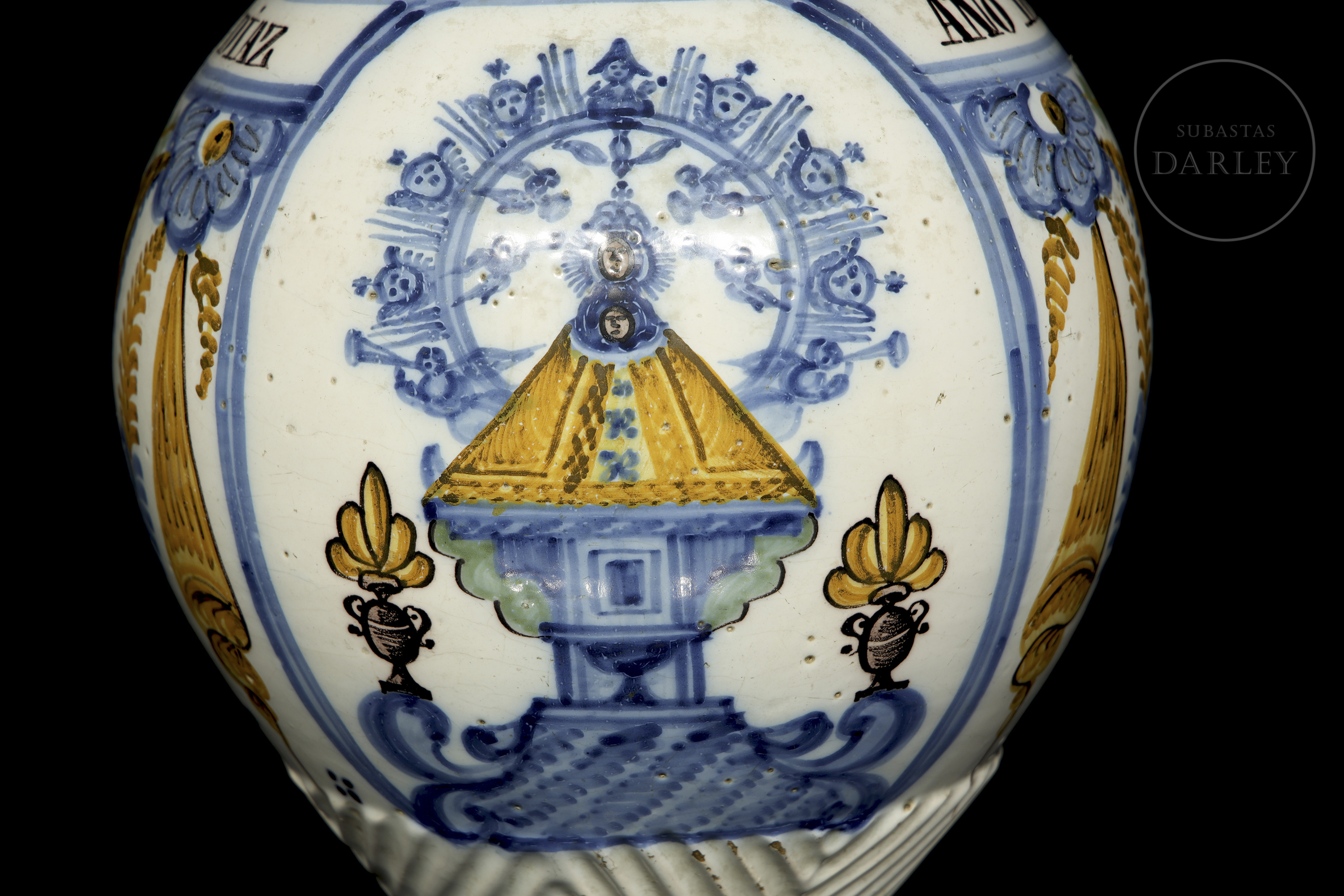 釉面陶瓷(马约利卡陶)。塔拉韦拉德拉雷纳产球形壶,饰以蓝、黄、赭三色釉彩。壶肩刻有“莫德斯塔·迪亚斯”与“1865年”铭文,两侧饰有神庙与花卉纹样的圆形徽章。壶身其余部分饰以花环纹与条纹纹理,中央绘有圣母像。