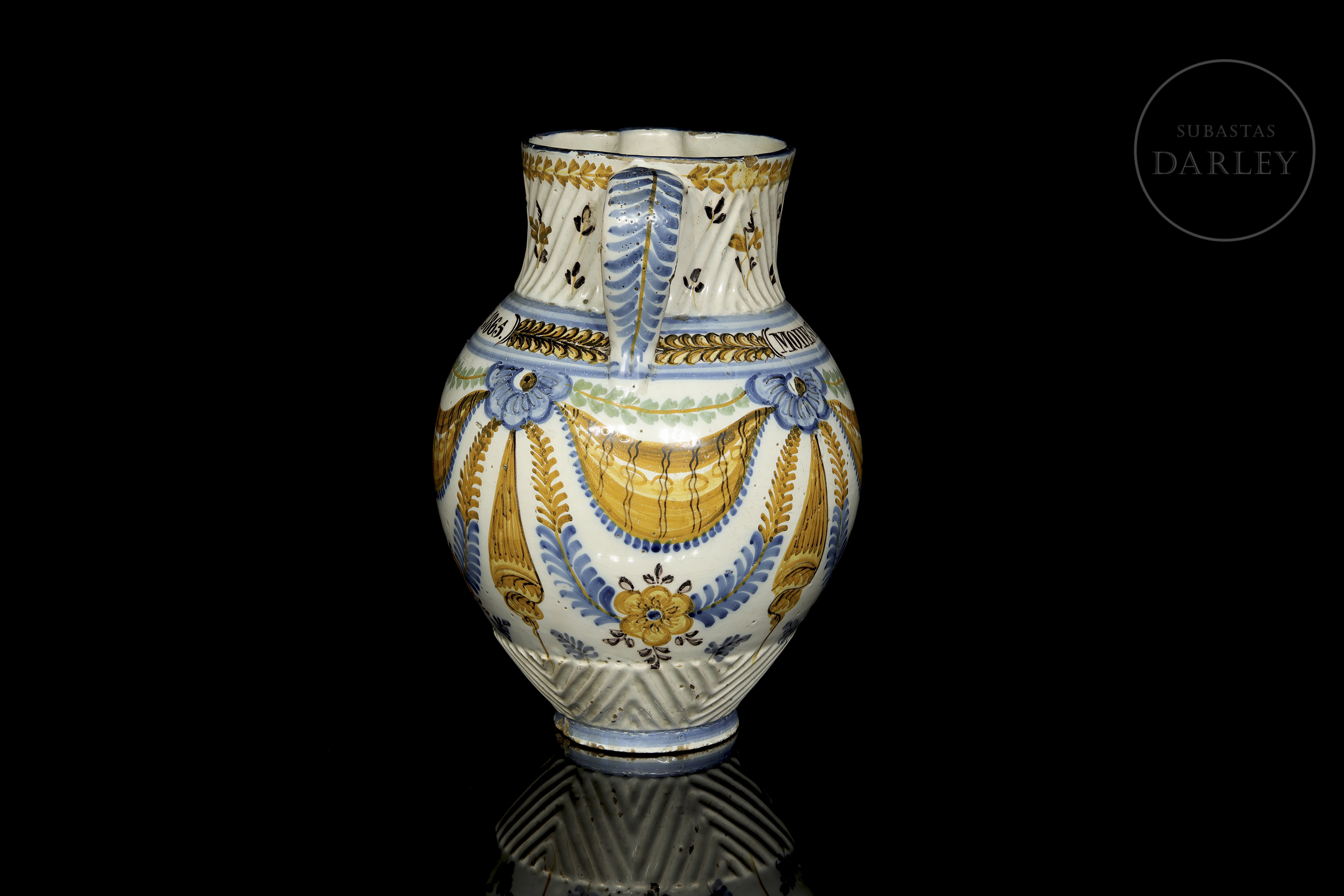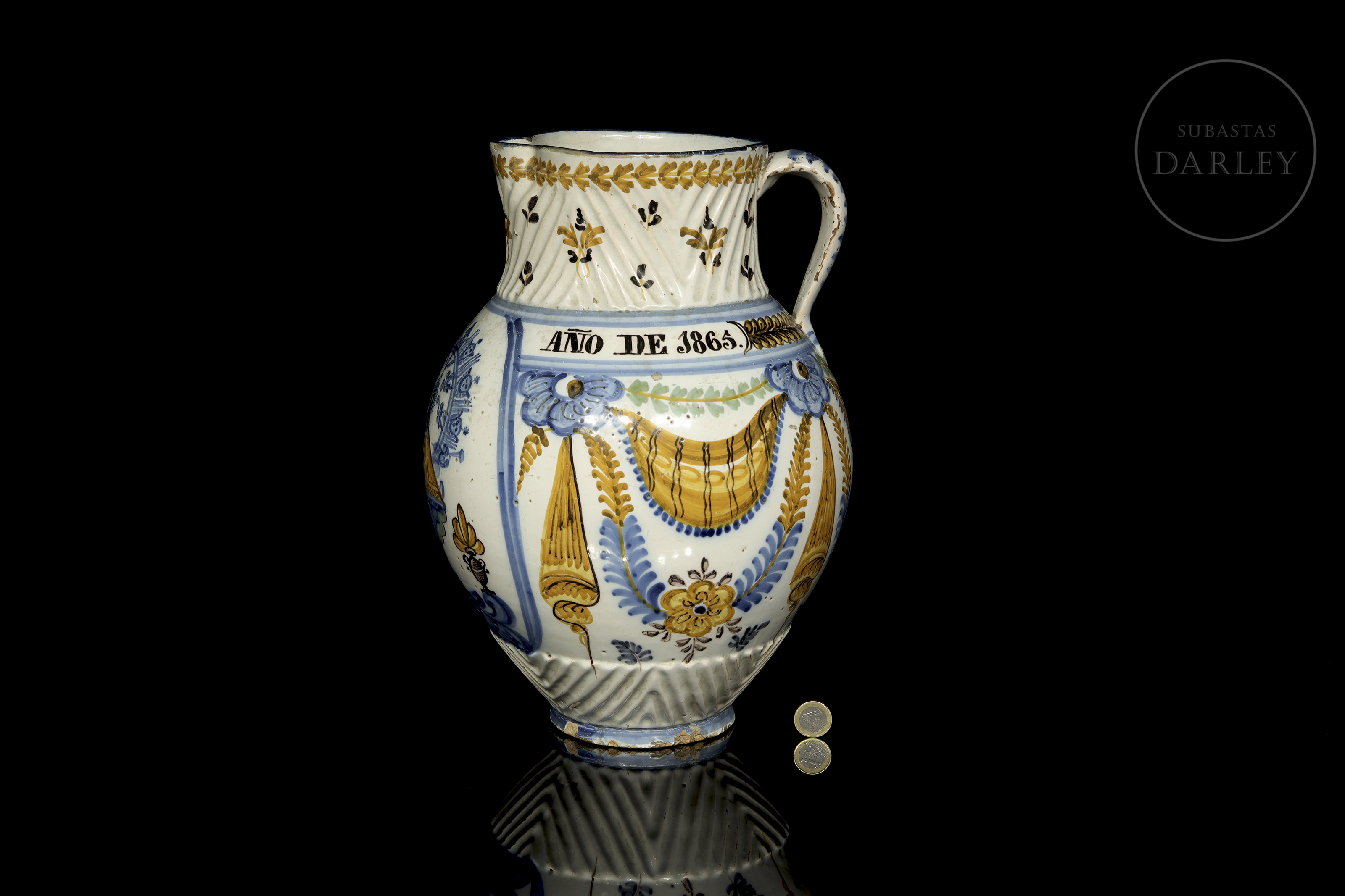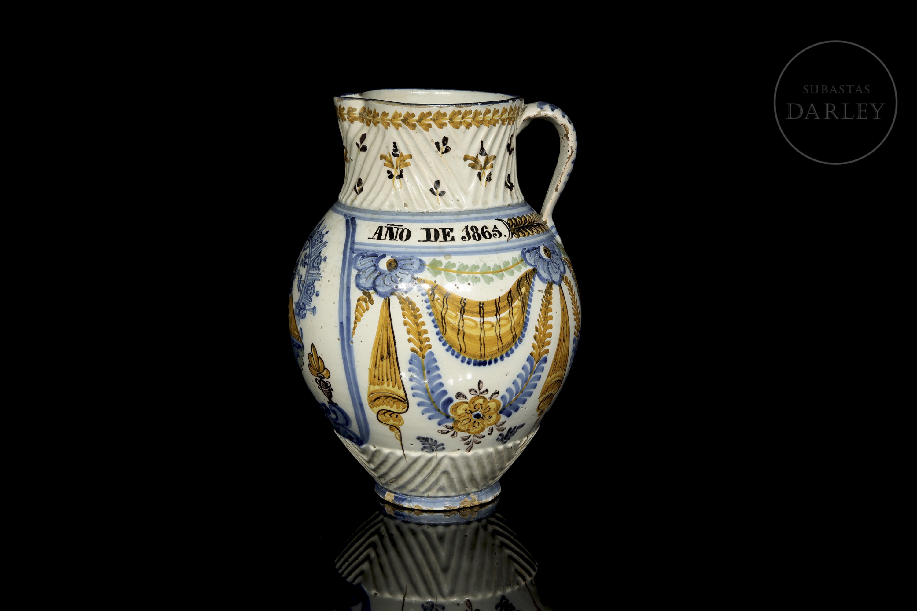 釉面陶瓷(马约利卡陶)。塔拉韦拉德拉雷纳产球形壶,饰以蓝、黄、赭三色釉彩。壶肩刻有“莫德斯塔·迪亚斯”与“1865年”铭文,两侧饰有神庙与花卉纹样的圆形徽章。壶身其余部分饰以花环纹与条纹纹理,中央绘有圣母像。