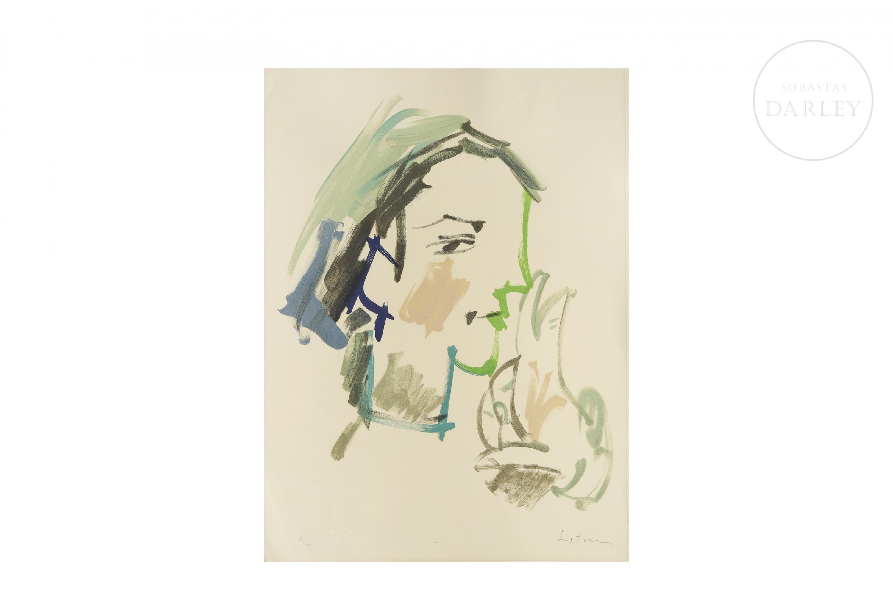 石版画,纸本。现代构图描绘女性侧面肖像,采用表现主义笔触与平面色彩处理。右下角签名“Litvinovsky”,左下角标注编号13/200,毗邻“MOURLOT PARIS”干印。