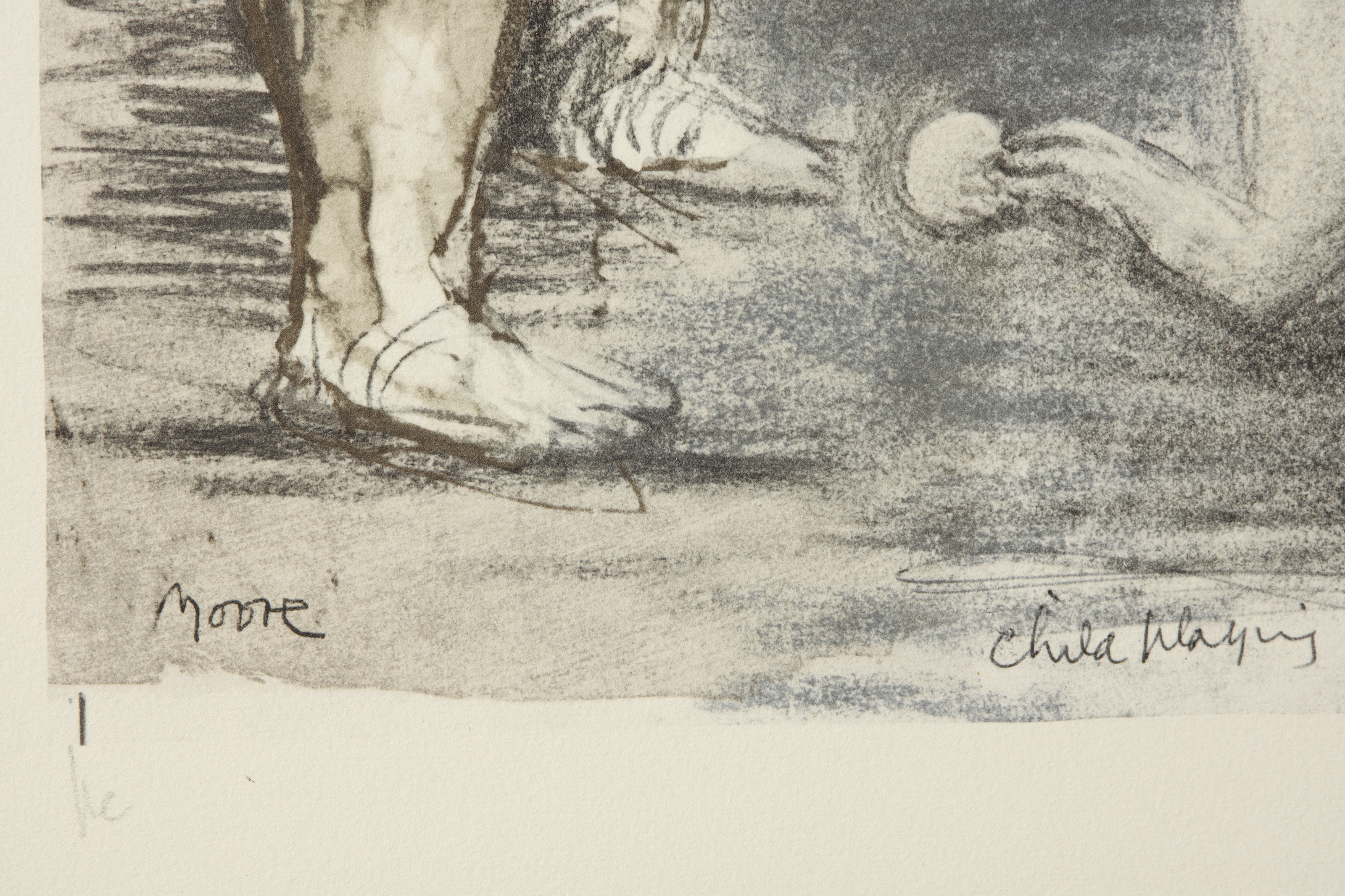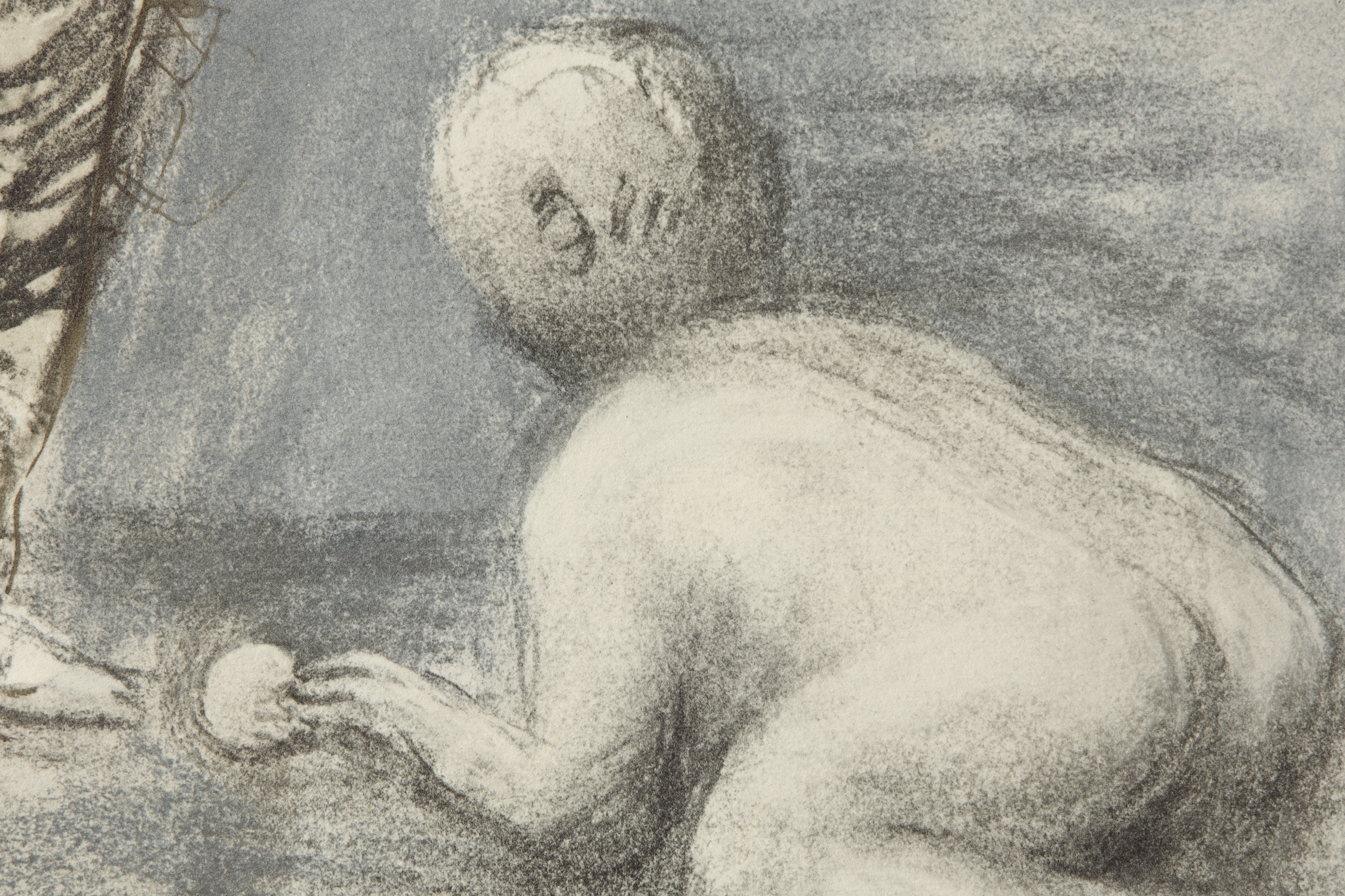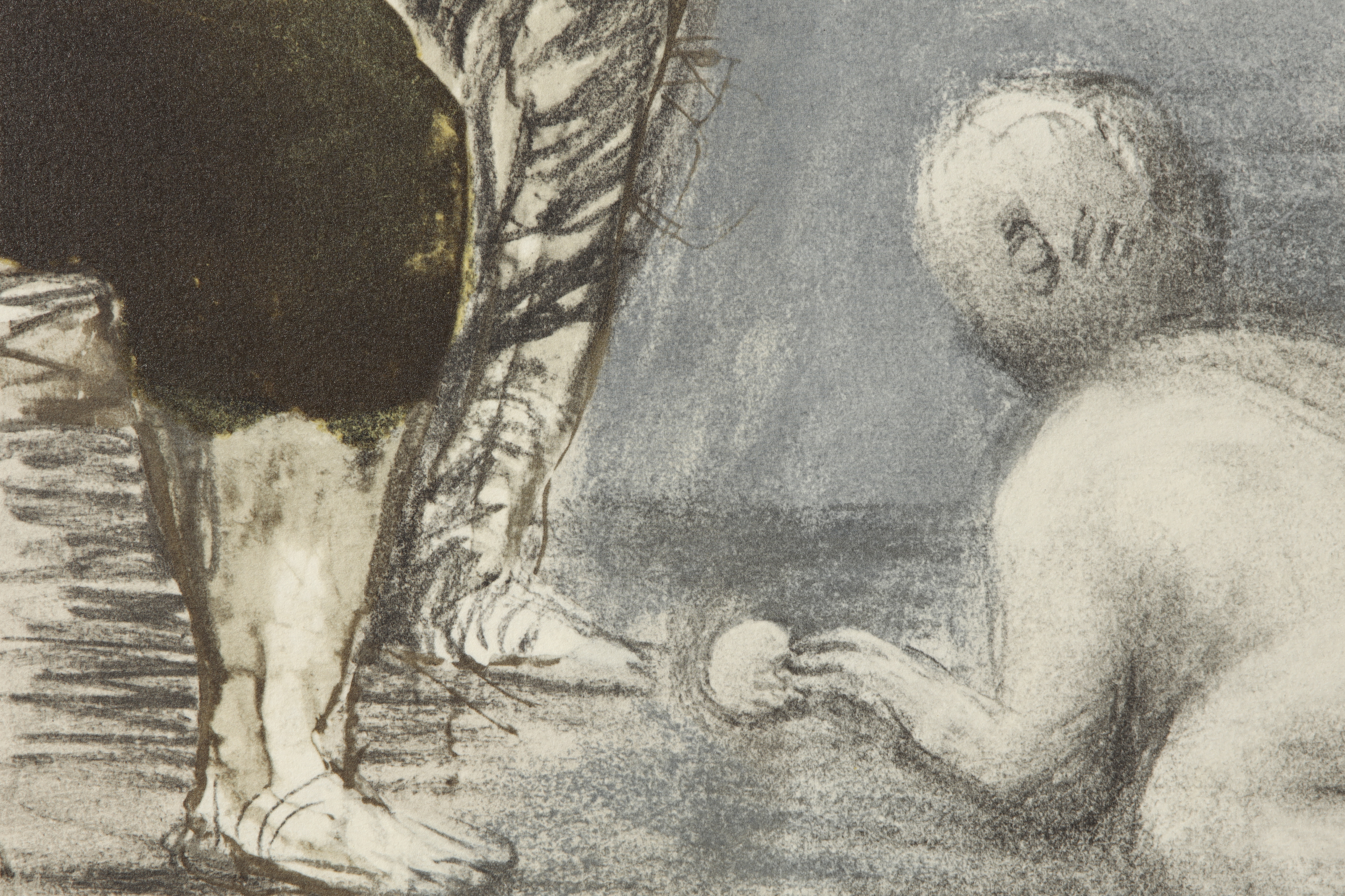彩色平版印刷画,描绘一名婴儿蜷卧于女子脚下的场景。采用米利亚尼·迪·法布里亚诺水印纸印刷。左下角有签名,下边框处题名。另以铅笔签名。