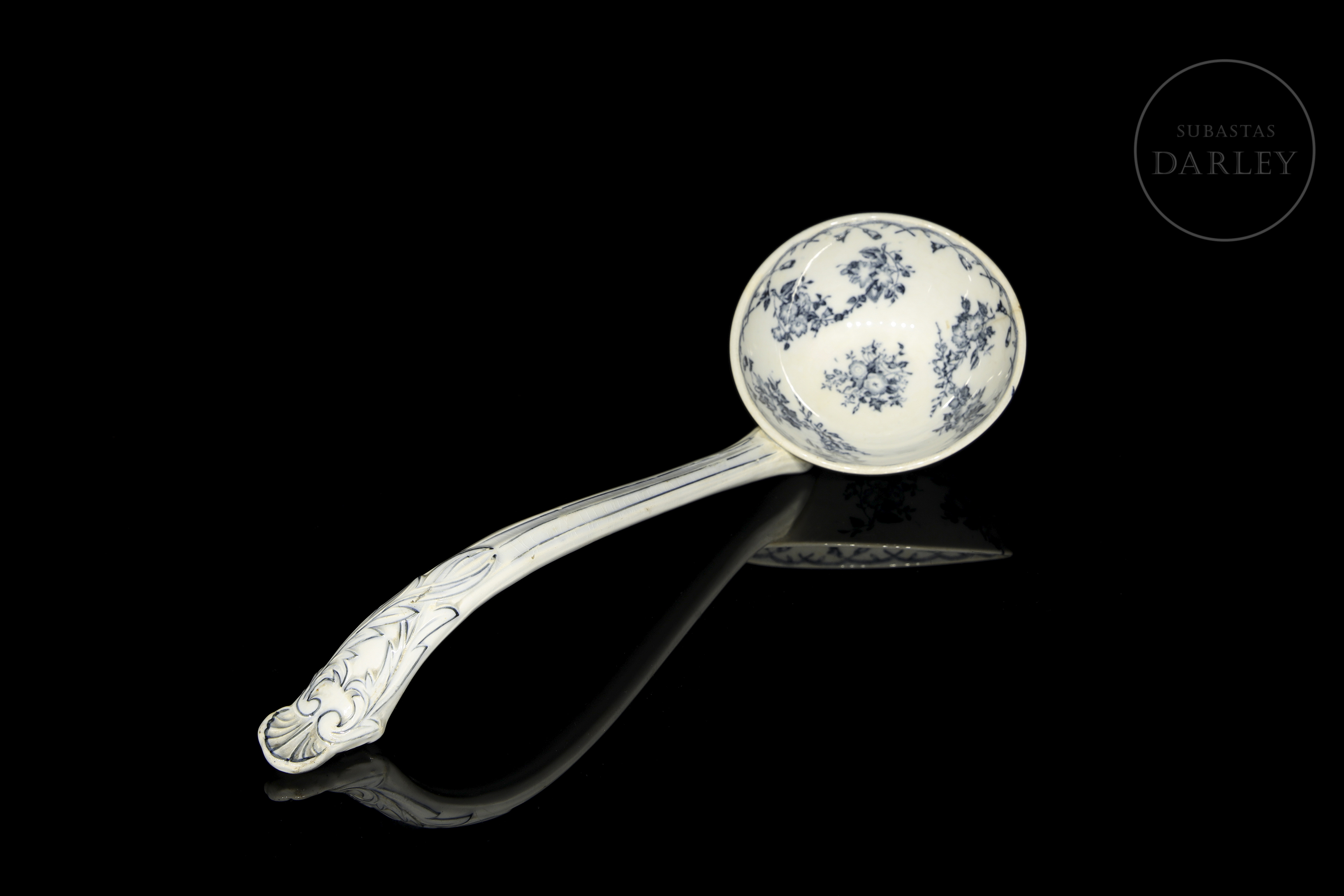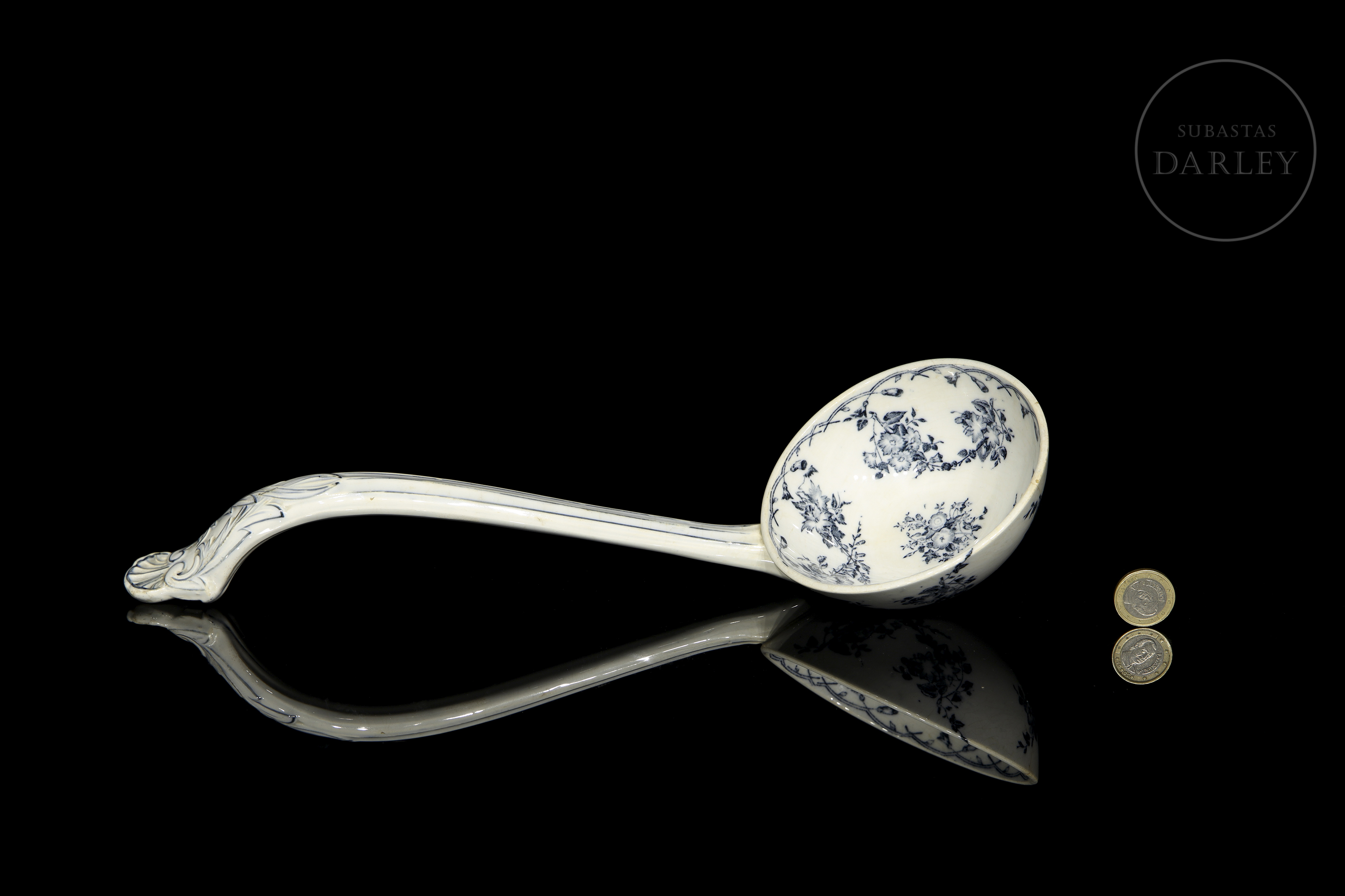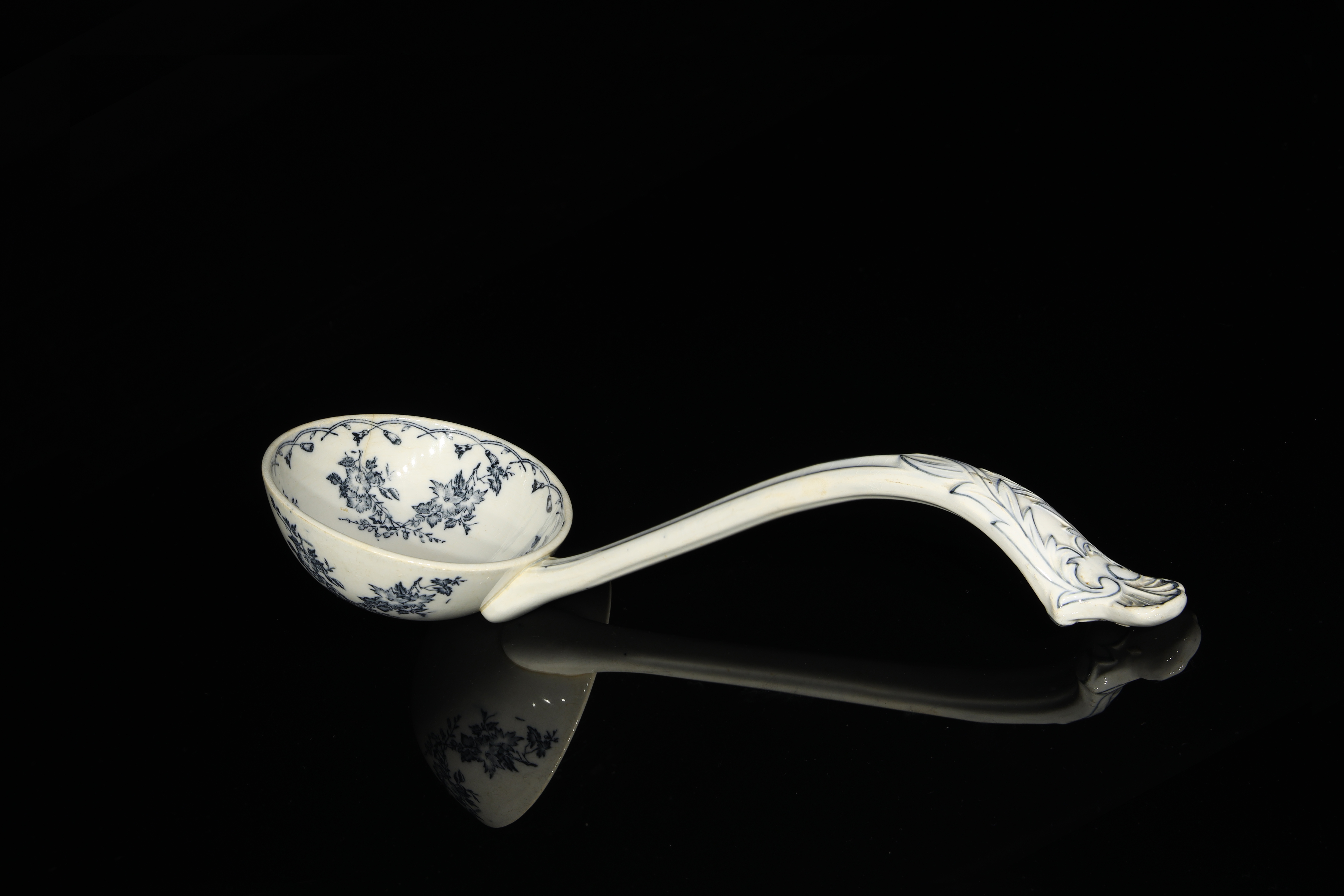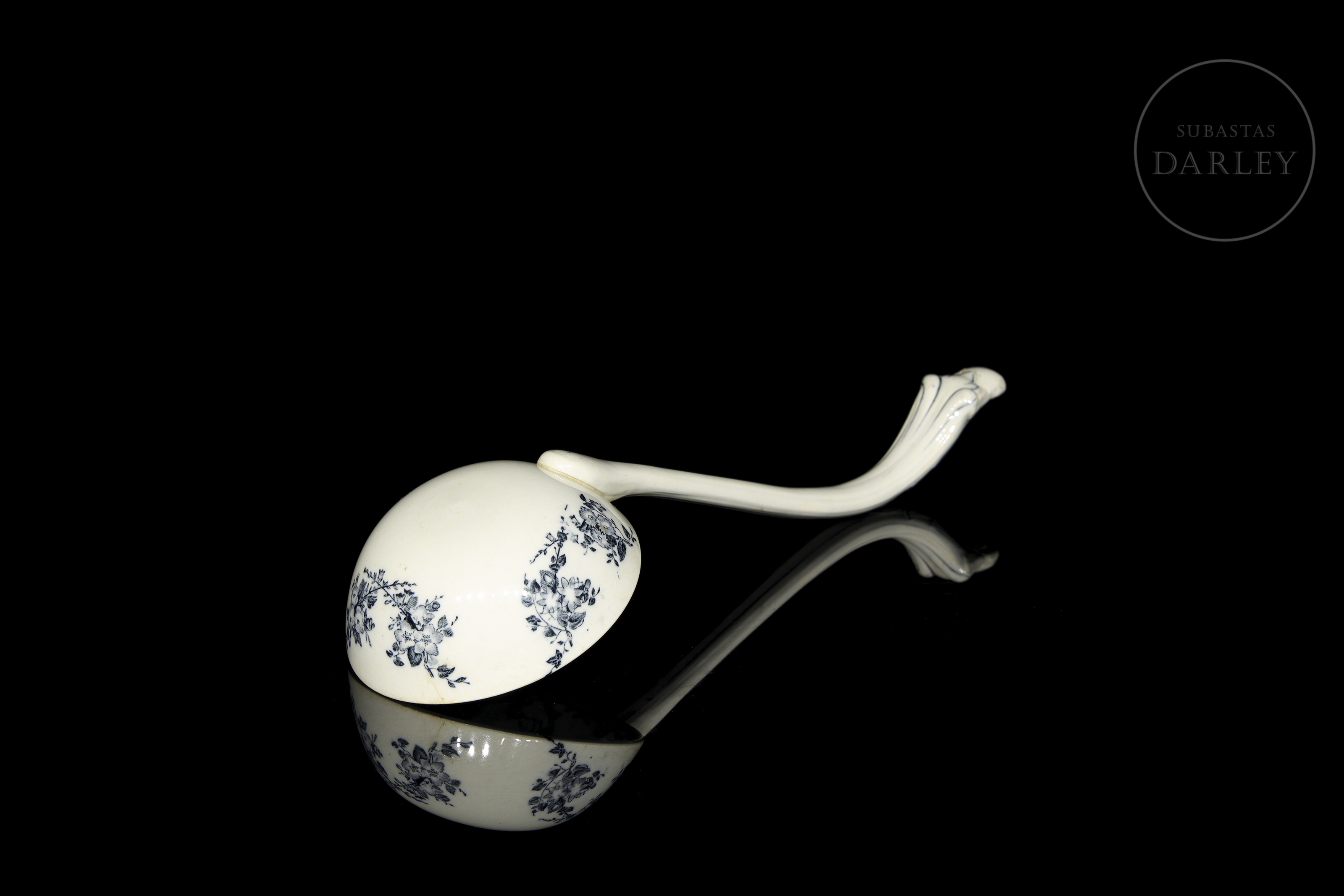 大型陶瓷汤勺,配有弯曲手柄。饰有“灰德里”花卉图案,以钴蓝色点缀于白色底纹之上。