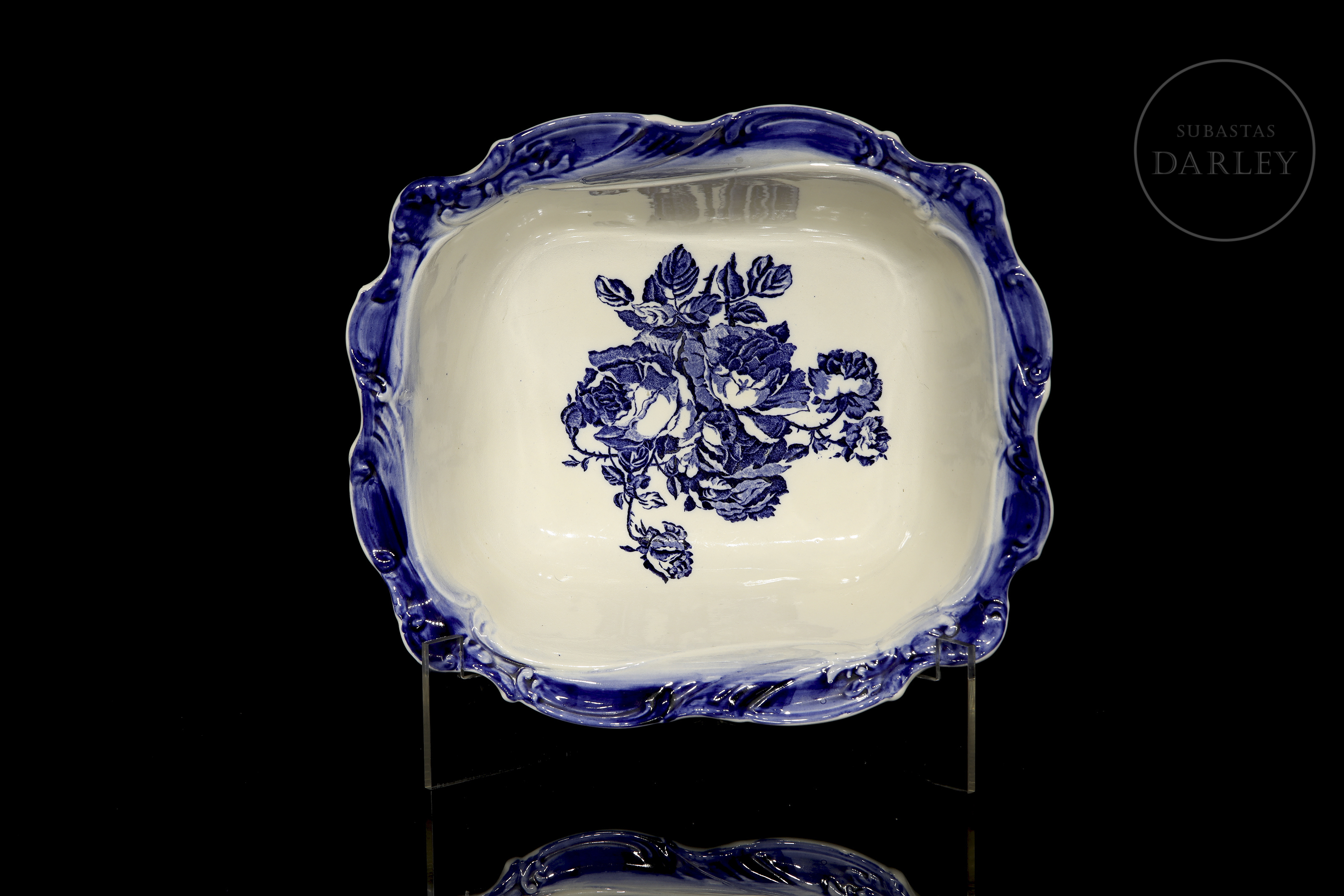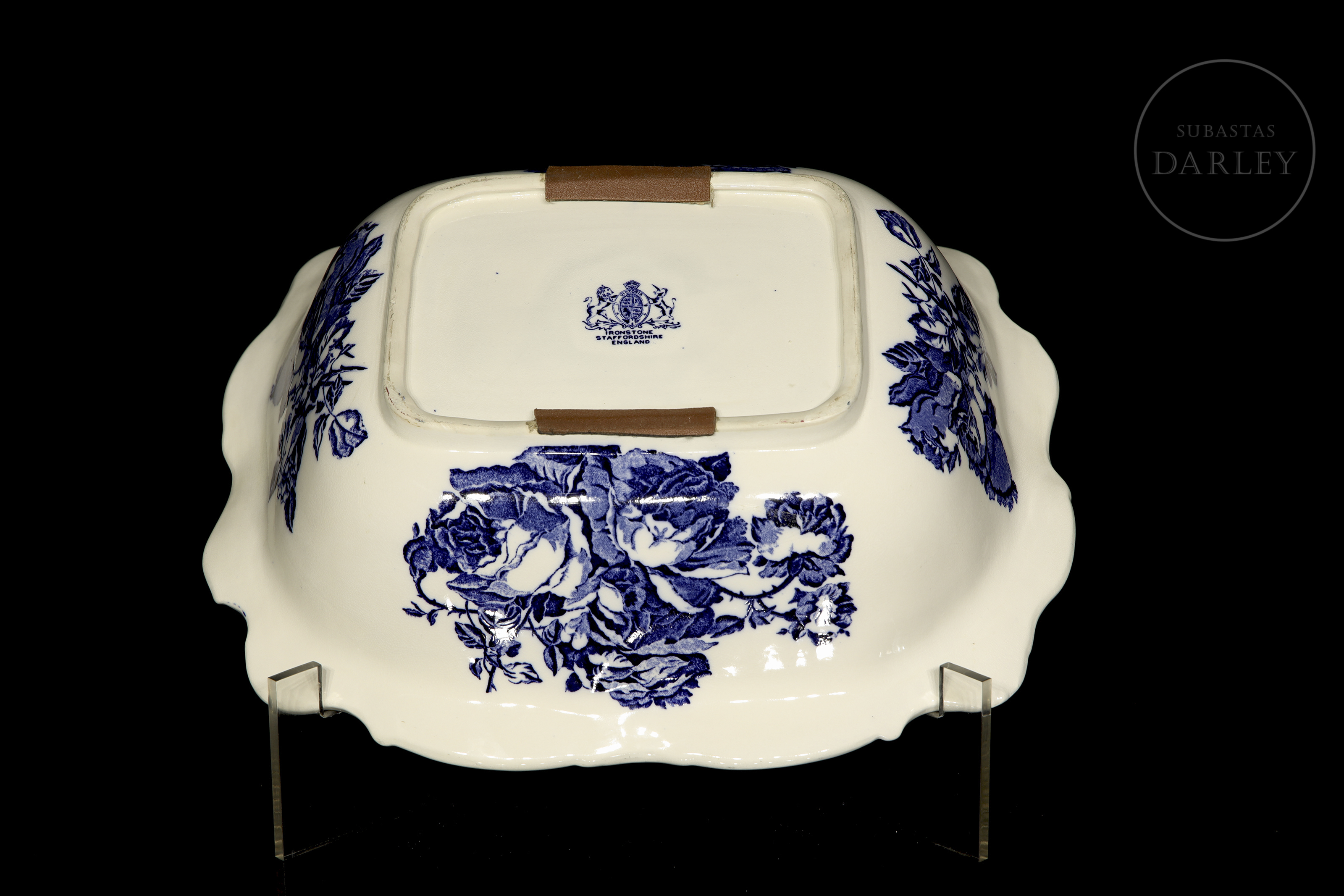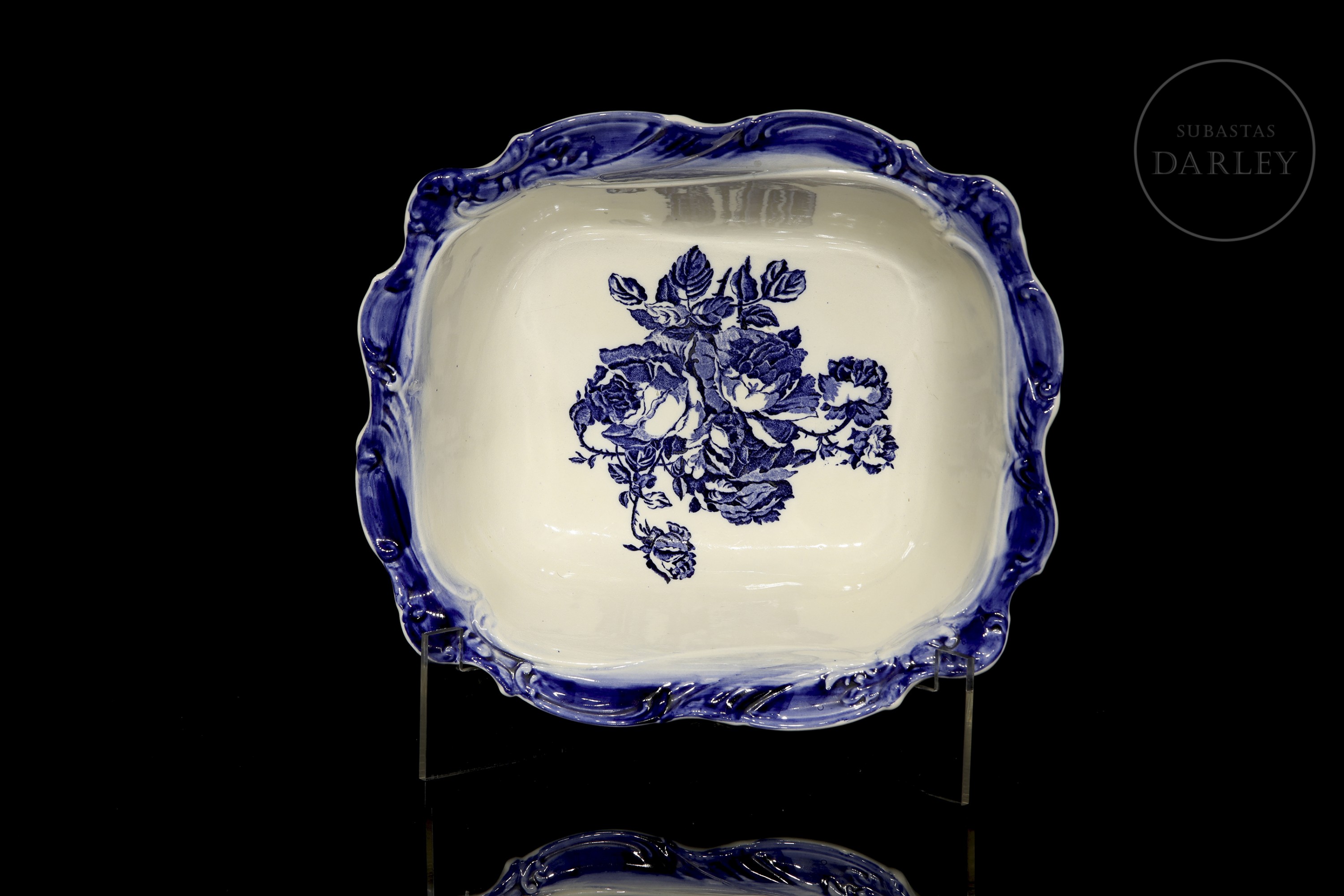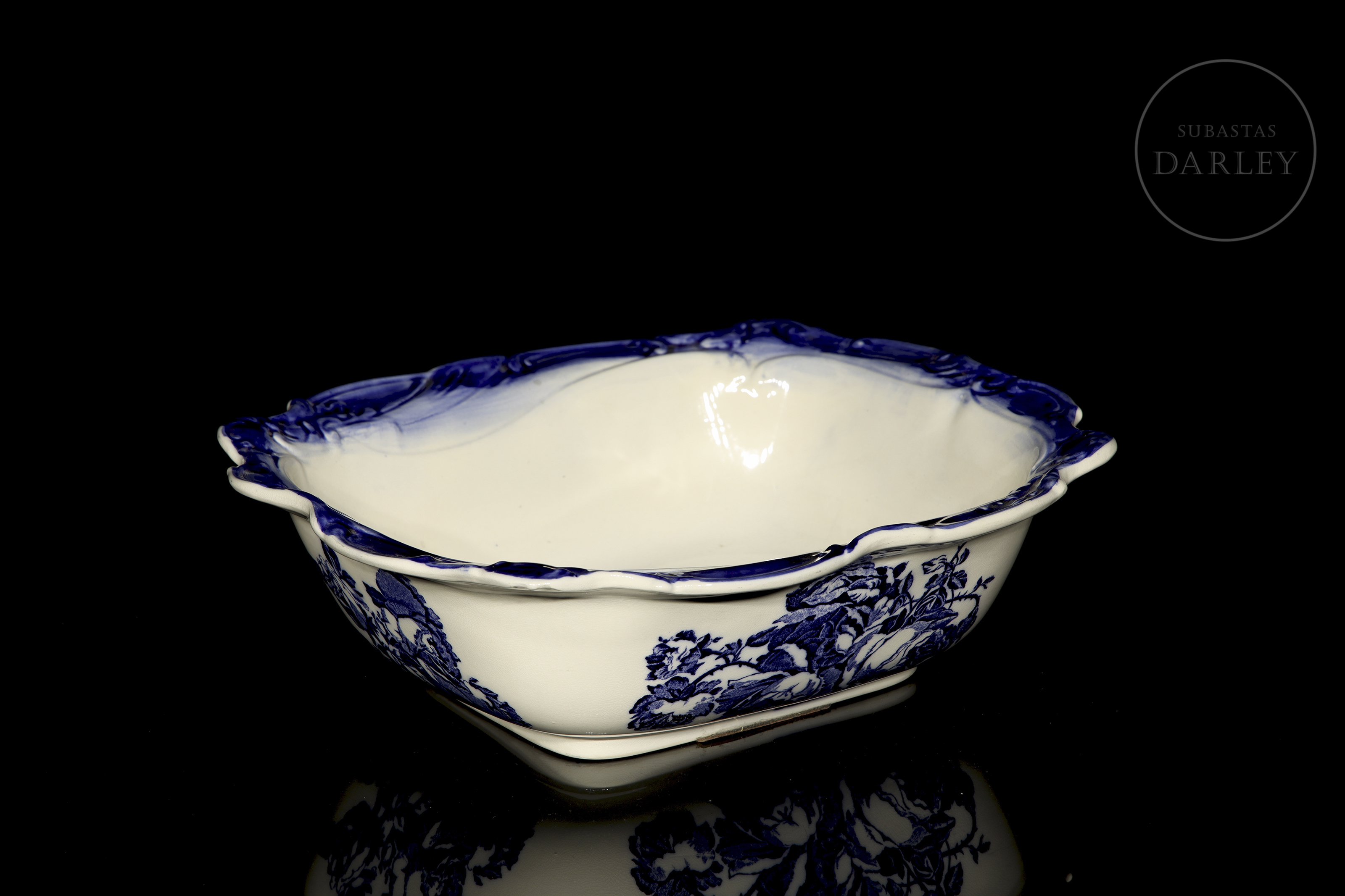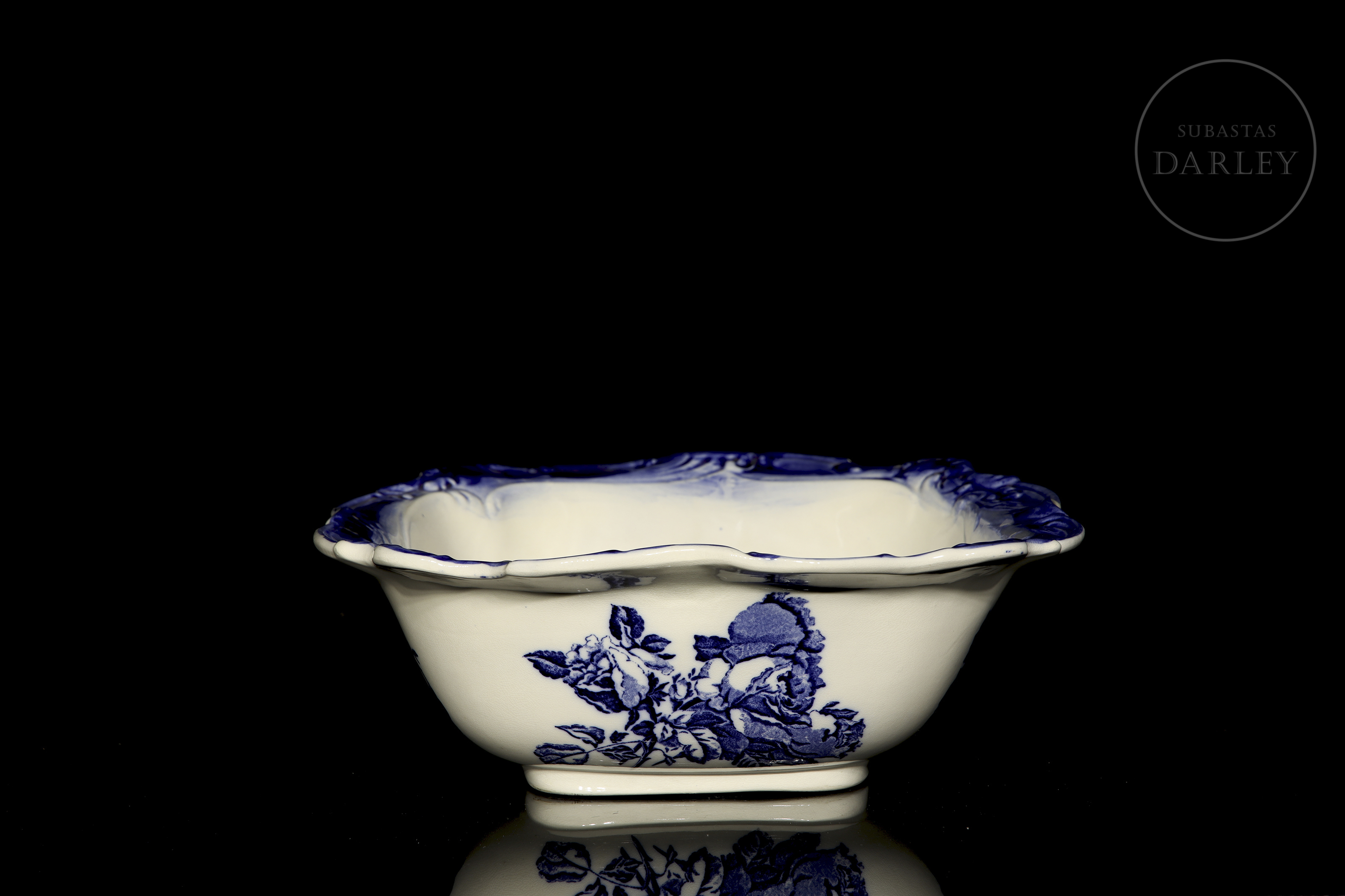 瓷质洗脸盆。器物背面刻有“铁石/斯塔福德郡/英格兰”标记。铁石瓷是19世纪在英国斯塔福德郡发展起来的一种厚重耐用的陶瓷。该洗脸盆属于完整的维多利亚时期浴室套装,通常配有配套水罐和面盆。设计特色为扇贝形边缘及玫瑰或花卉图案。