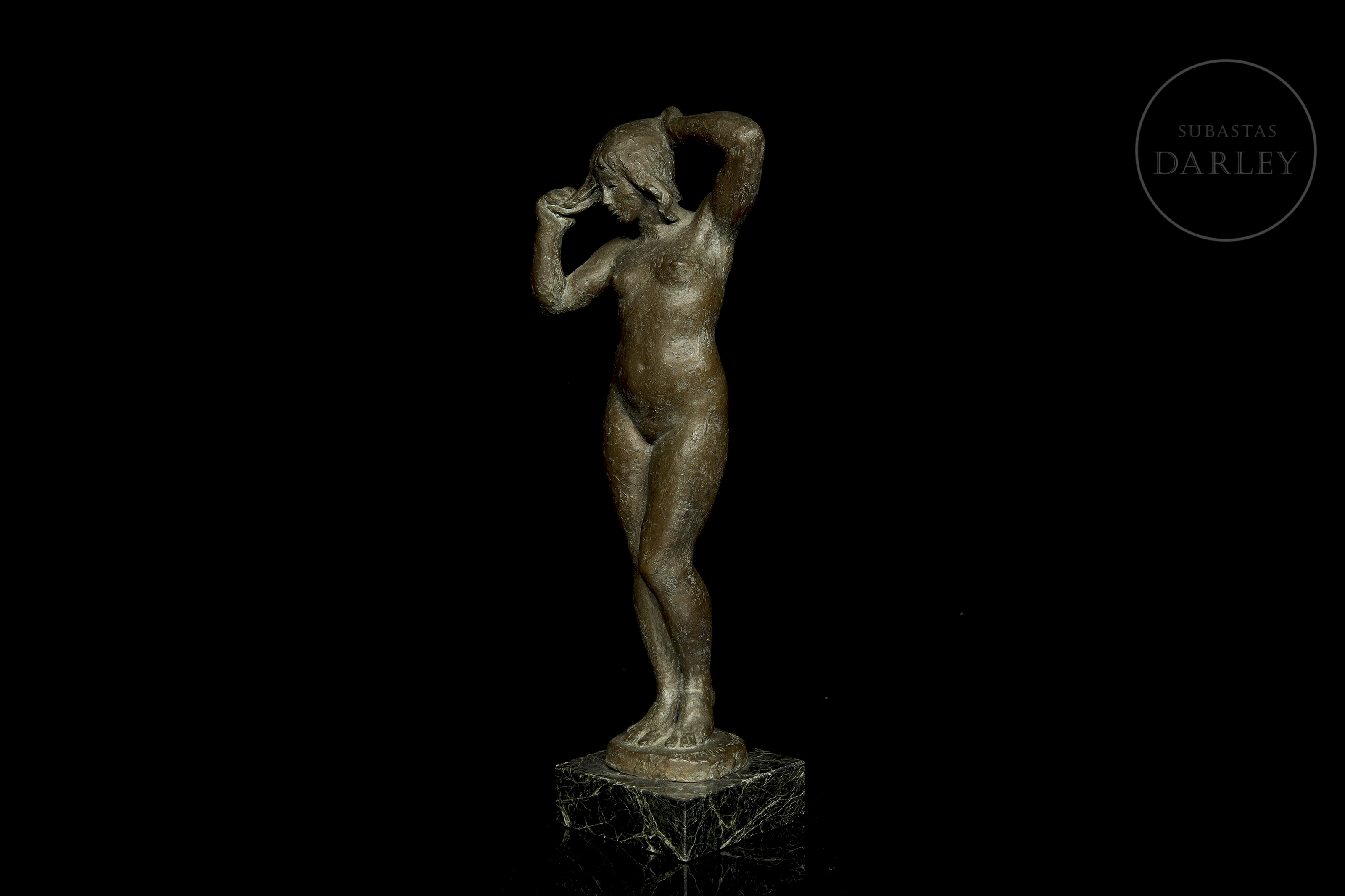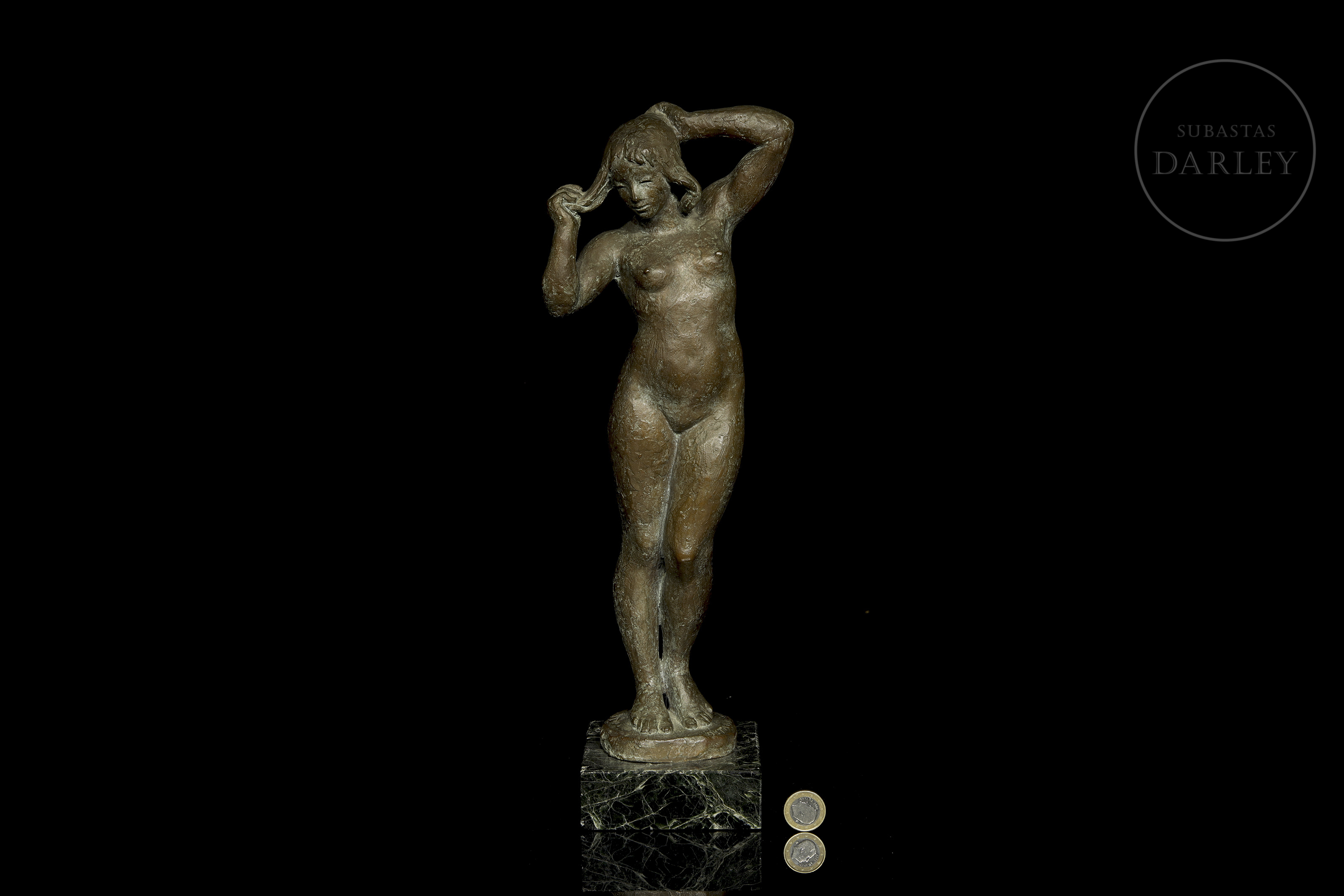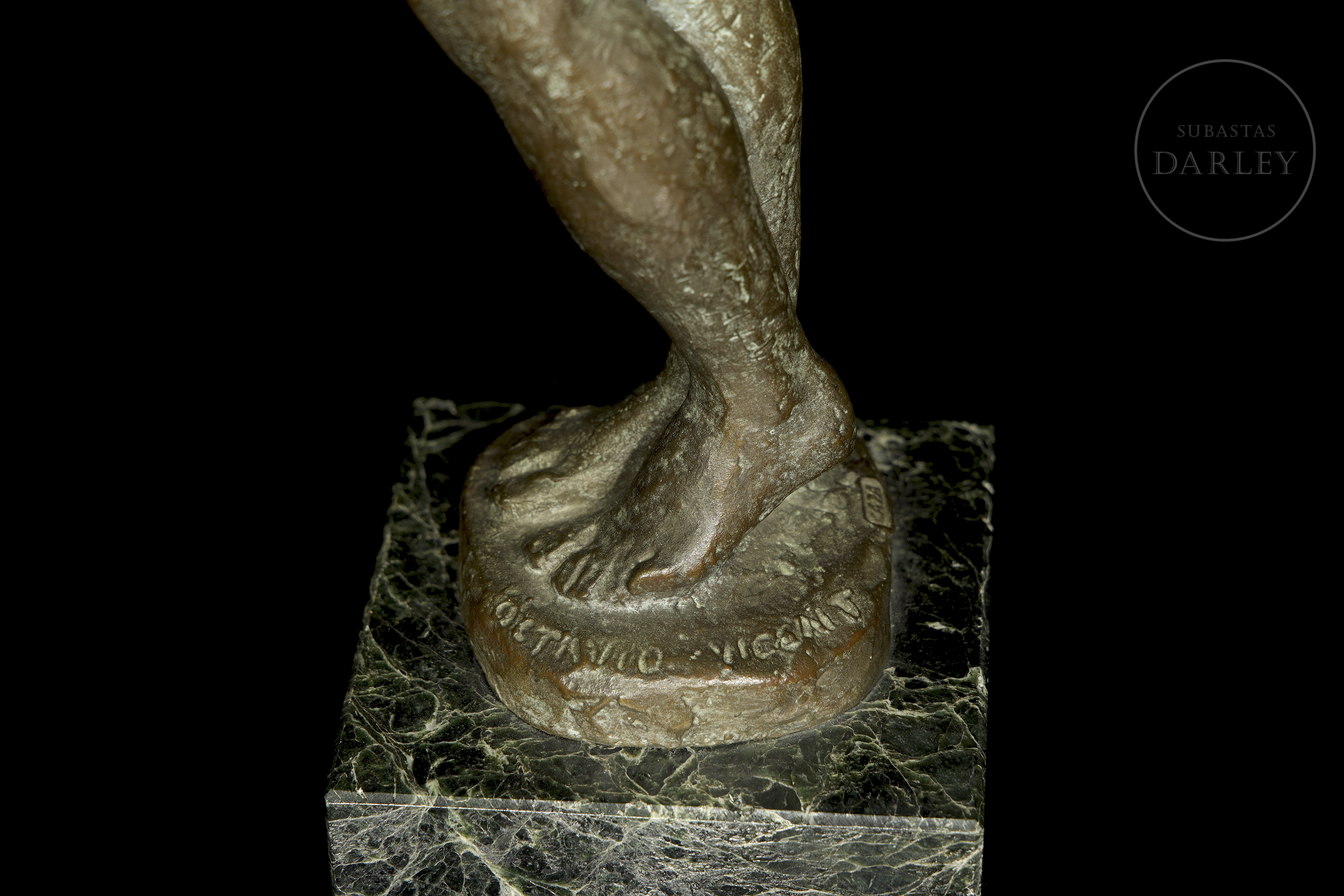 青铜雕塑置于绿色大理石基座上。圆形雕塑展现女性裸体优雅姿态。基座处镌刻签名及编号“Octavio Vicent, 161/380”。