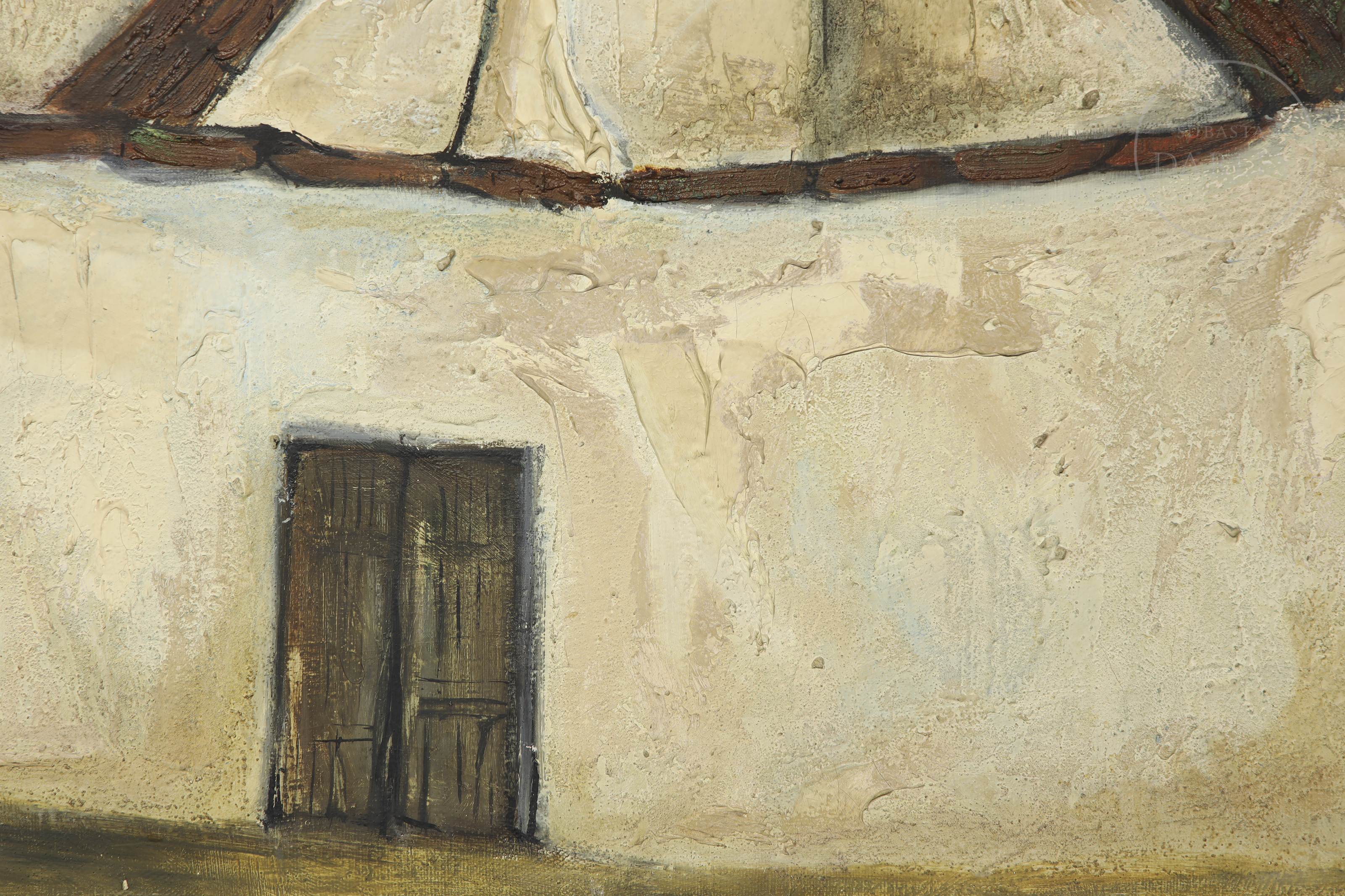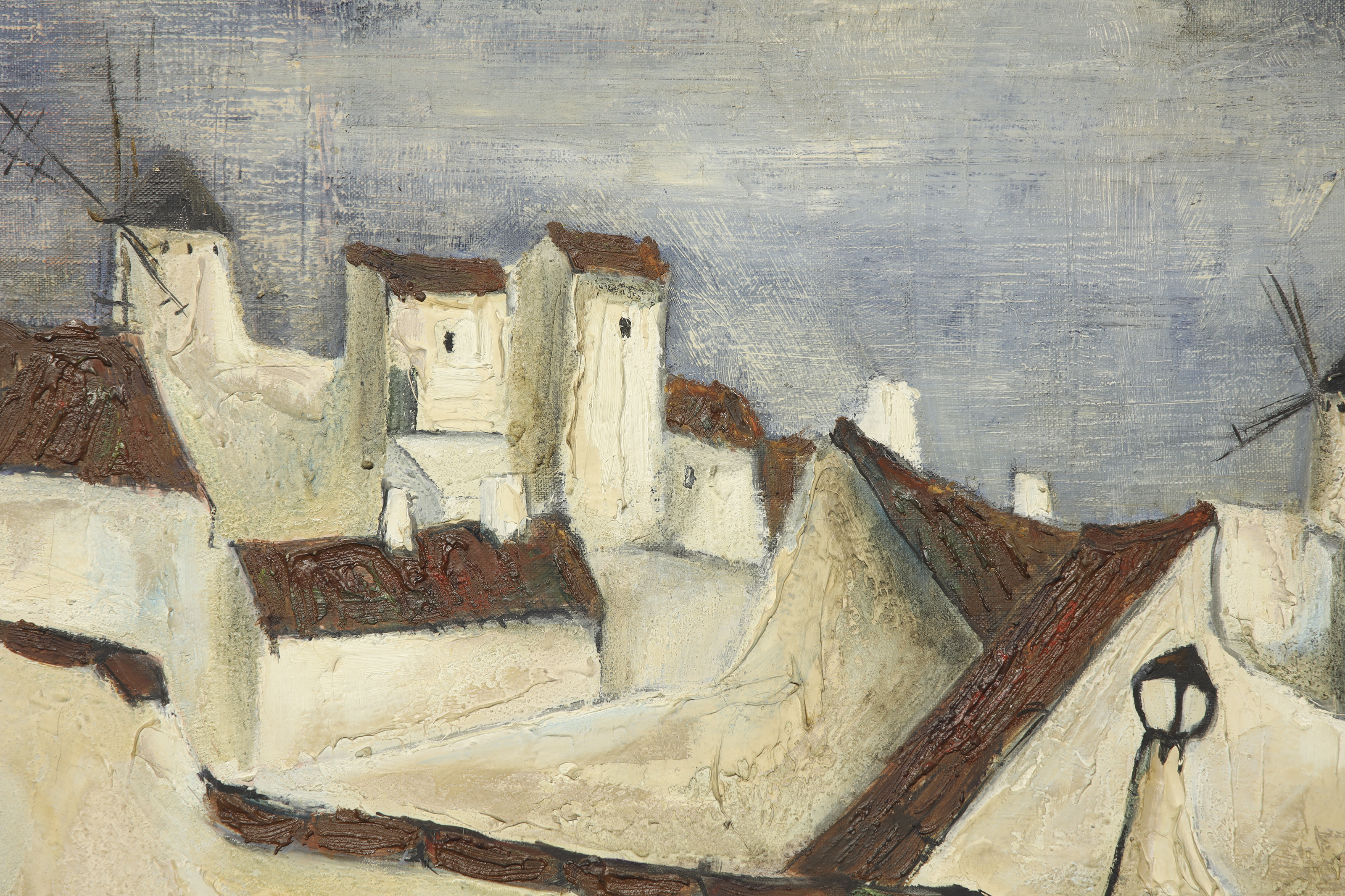 丙烯酸画布。现代合成构图描绘一组工人阶级住宅,顶部矗立着风车的剪影。左下角签名“J. García Torres”。