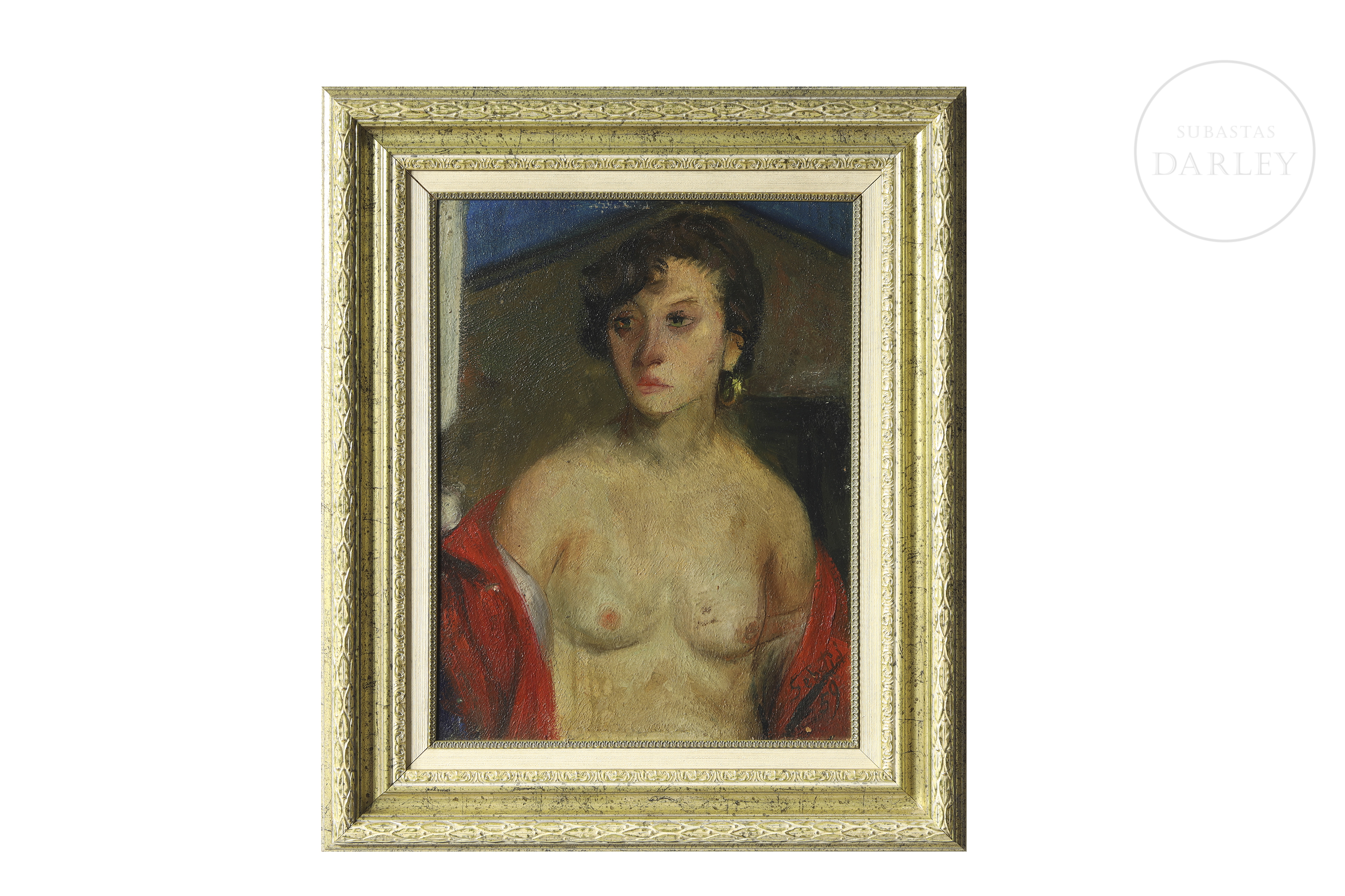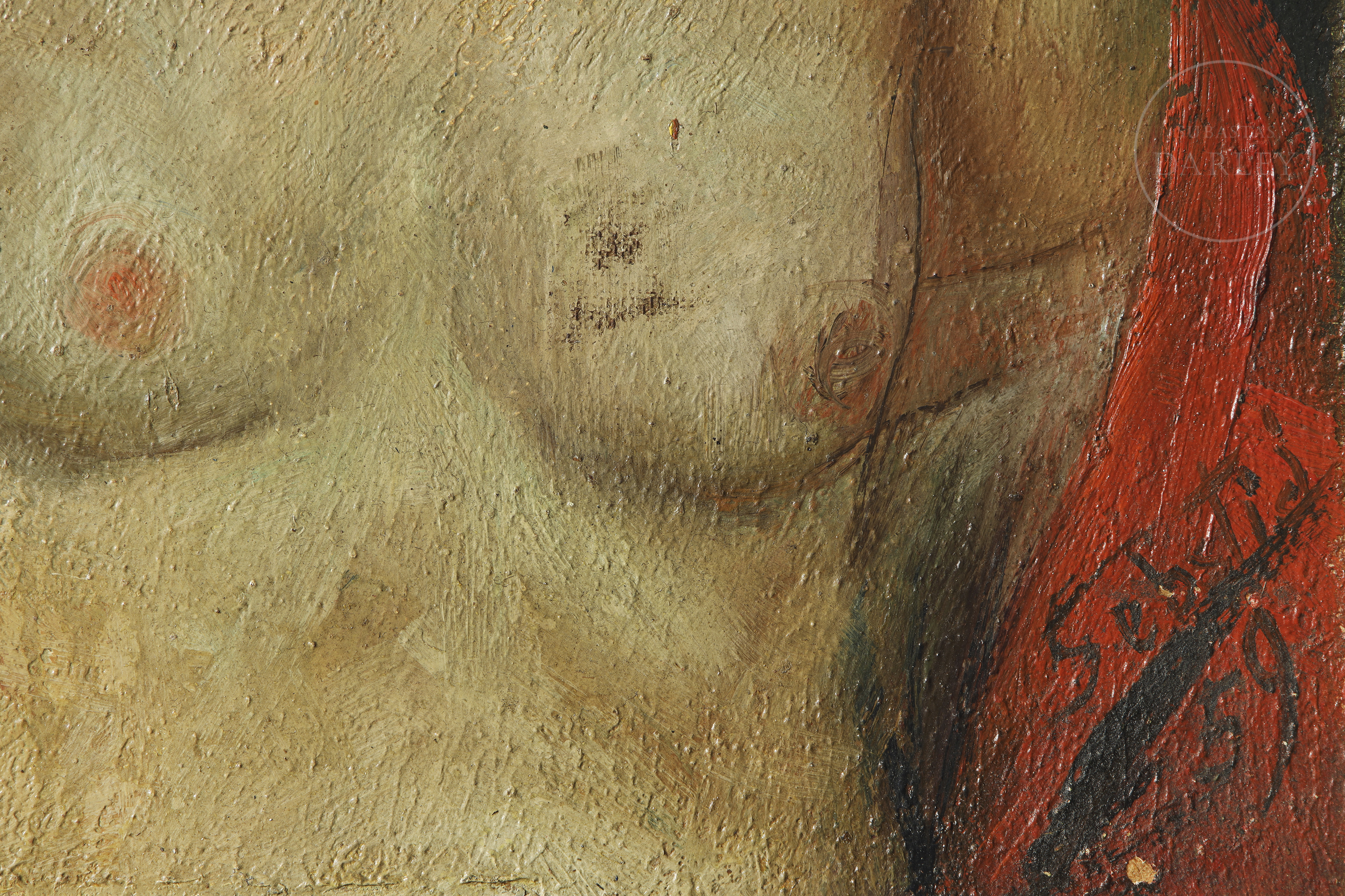 油画布面。半身肖像描绘一位半裸的年轻女子,身裹深红色布料,面露忧郁神情。右下角签名并标注日期“Sebastiá / 59”。