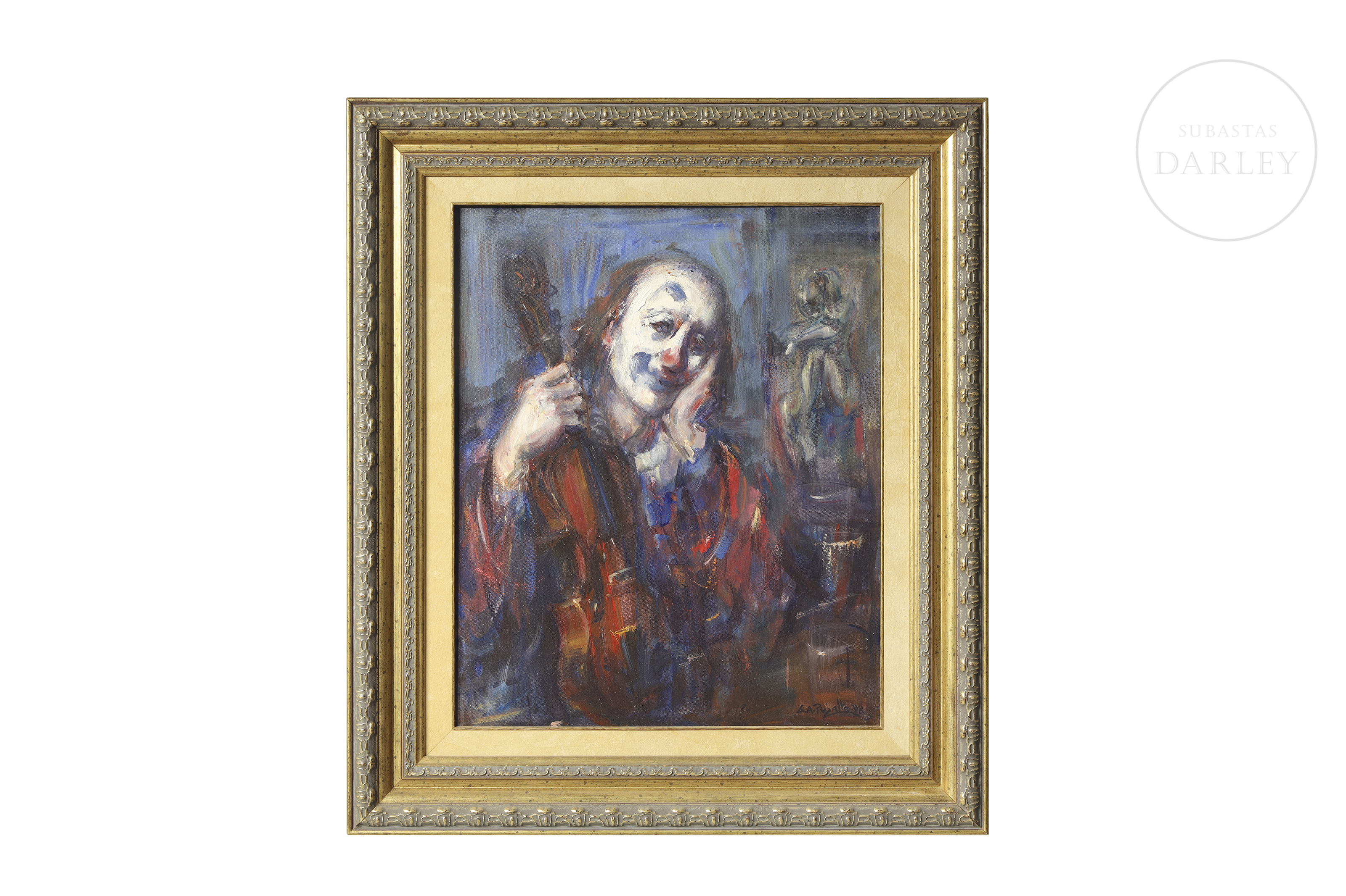 一幅描绘忧郁小丑手持弦乐器的肖像画。其松散的表现主义风格尤为突出。画面右下角签名并标注日期“G.A. Pujalte 98”。