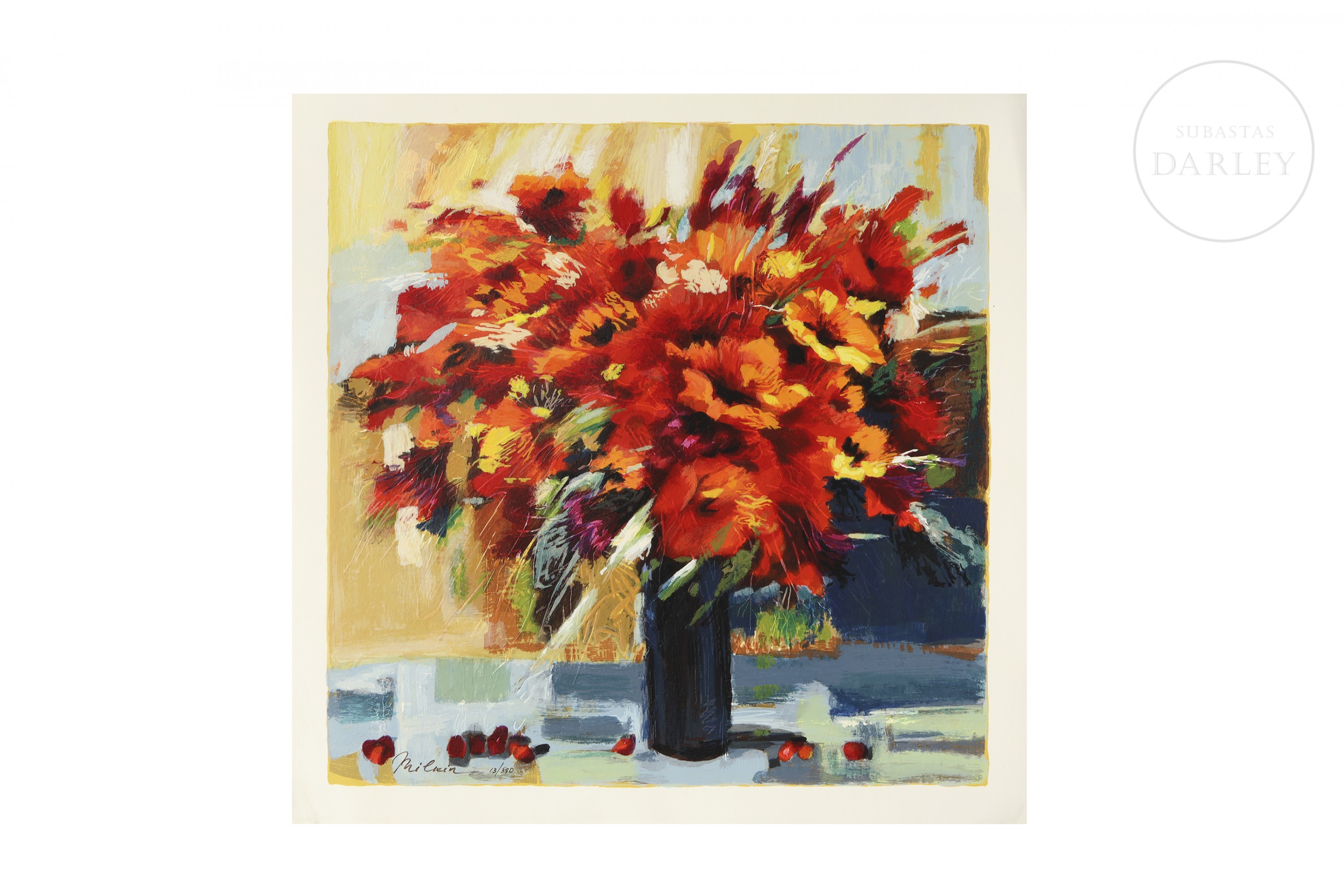 丝网印刷于纸上。当代花卉构图,以暖色调呈现浓密花束。左下角签名:“Milkin”。左下角编号:“13/390”。