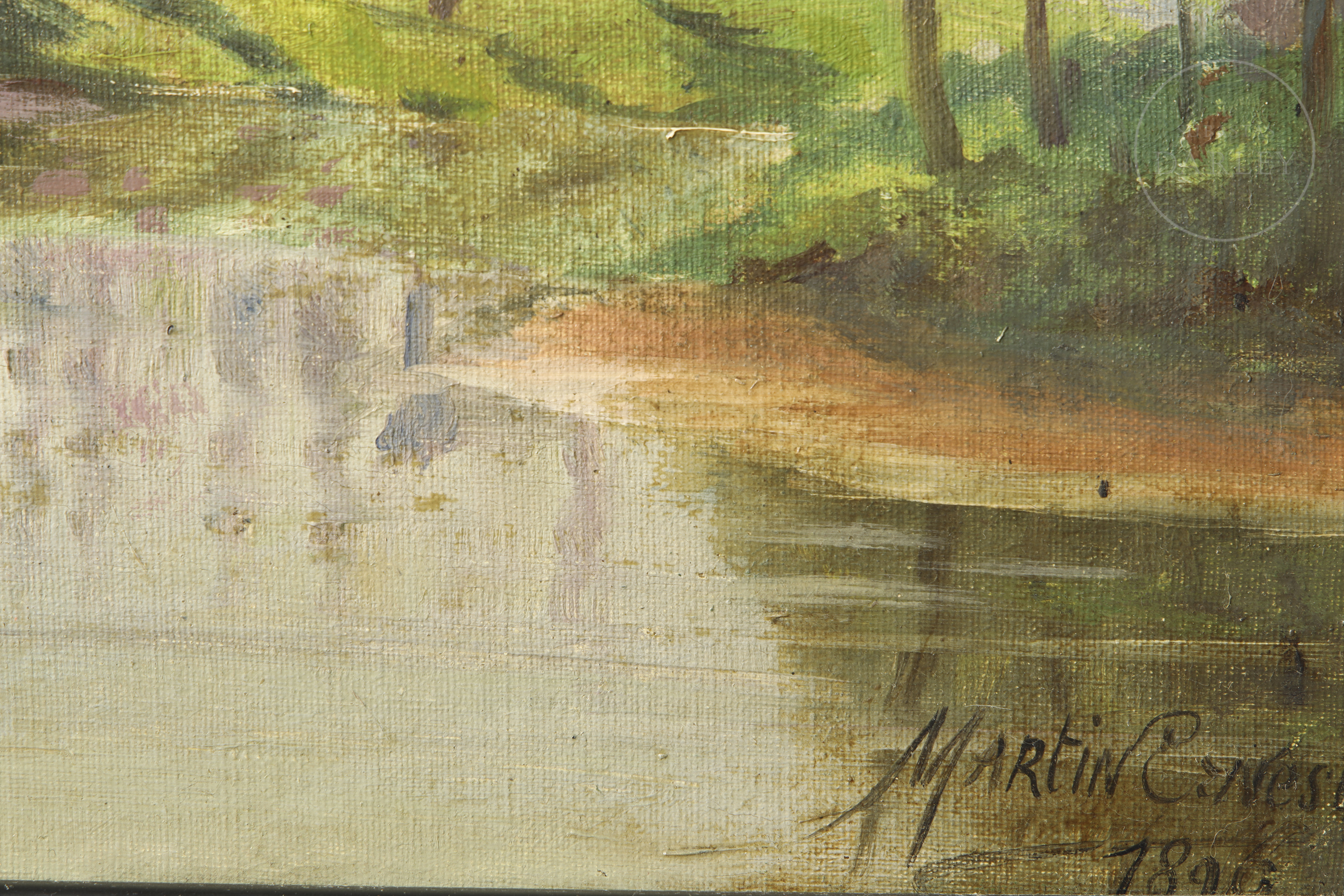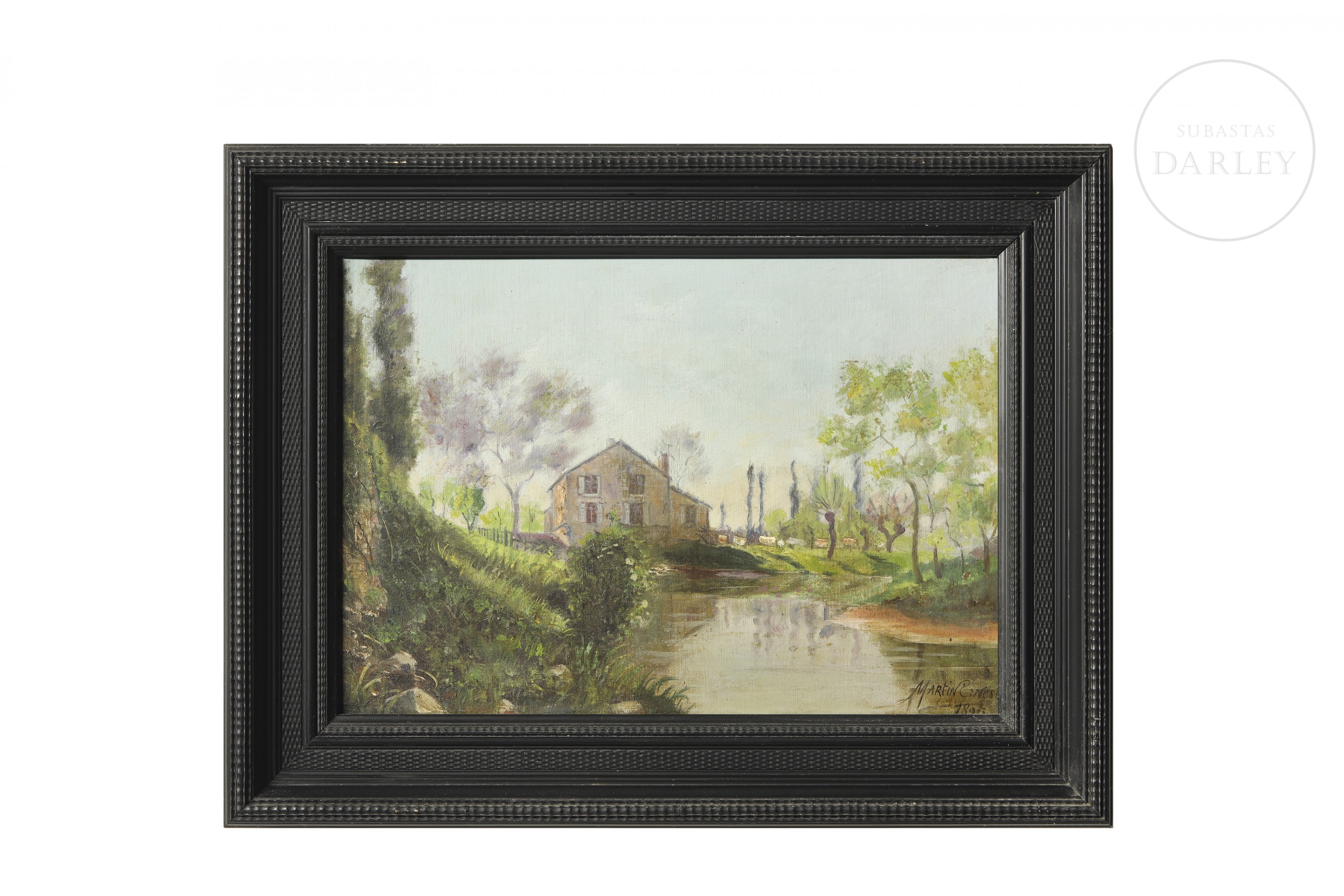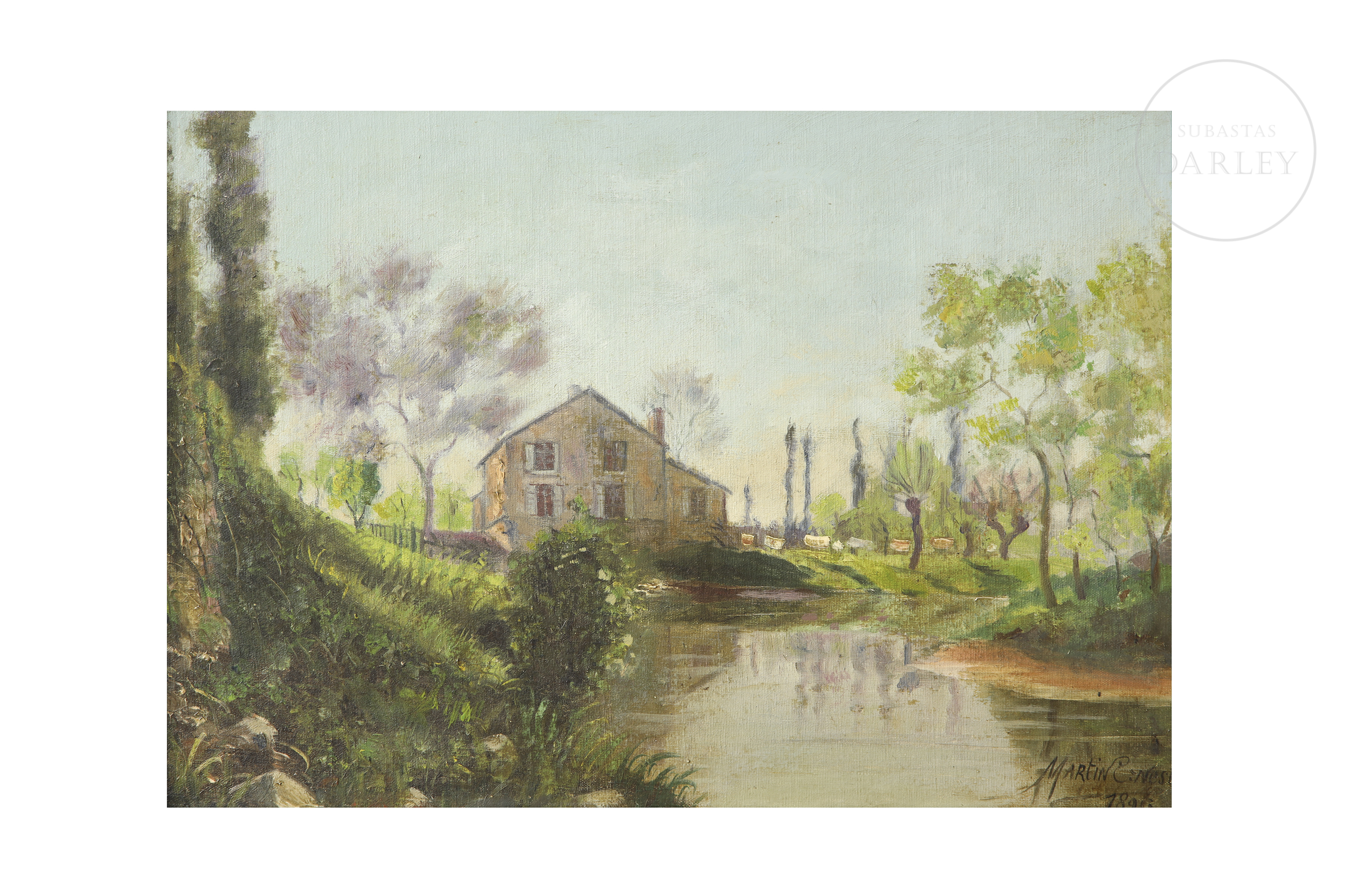 Oil on canvas, signed and dated in the lower right corner. It depicts a rural landscape with a country house reflected in a pond, surrounded by trees and meadows, in a humid and luminous atmosphere.