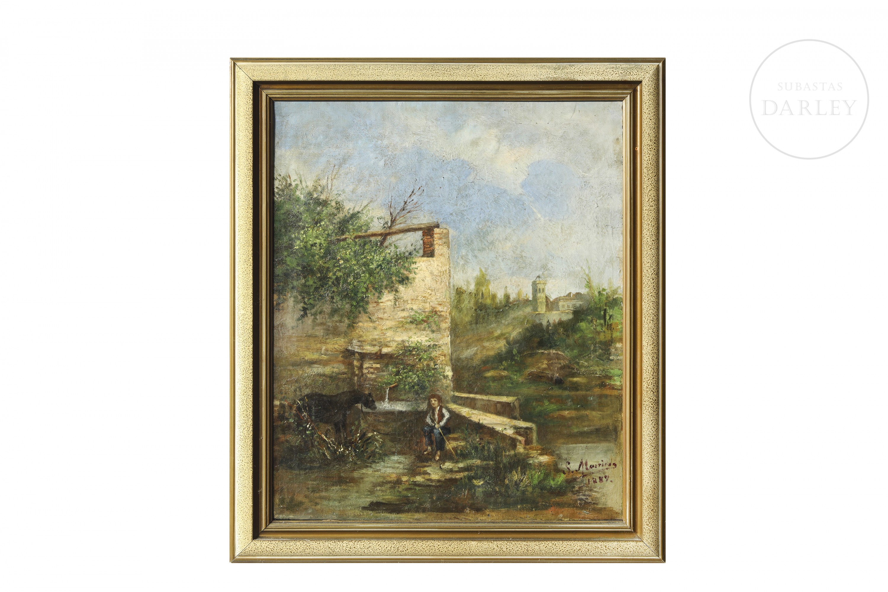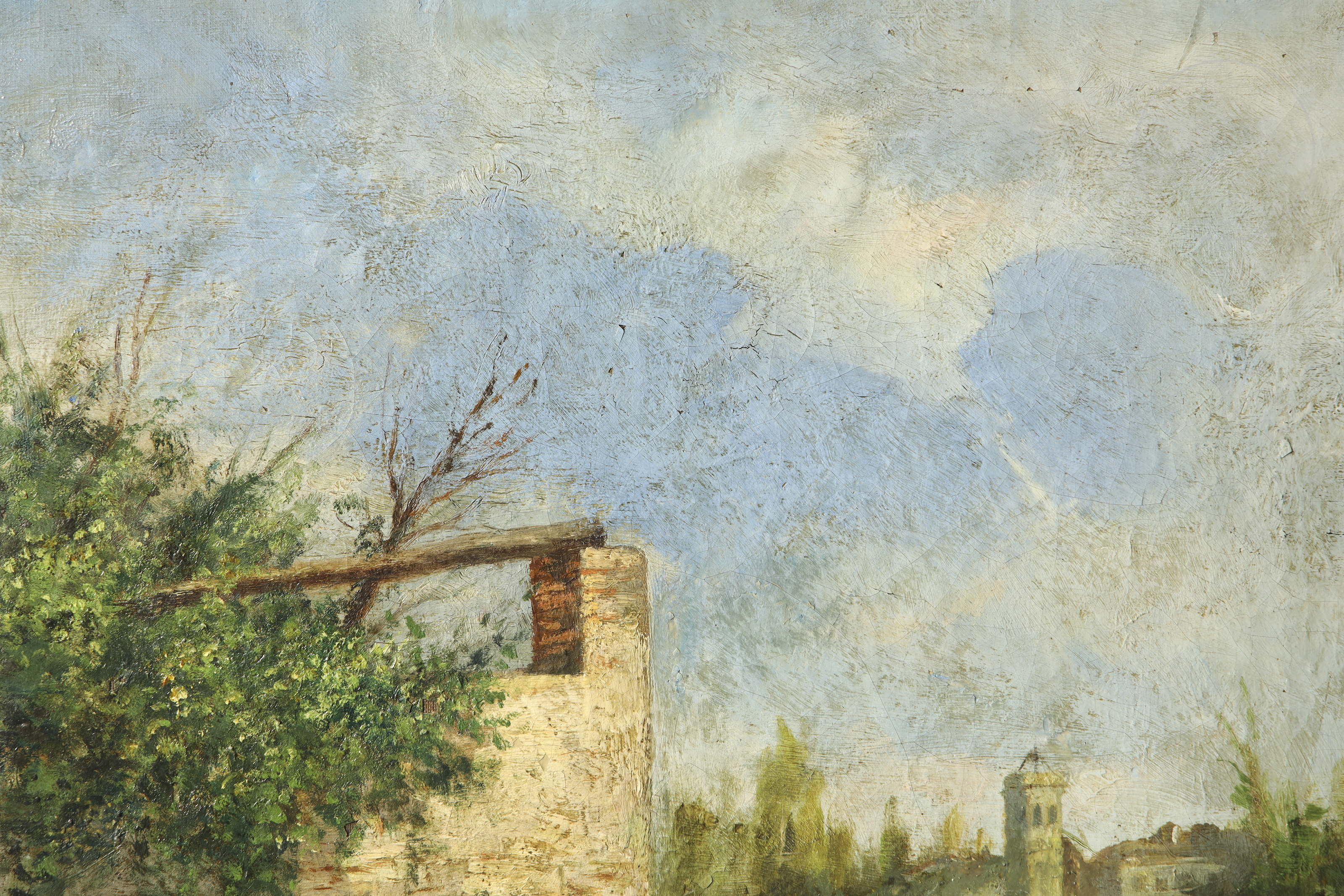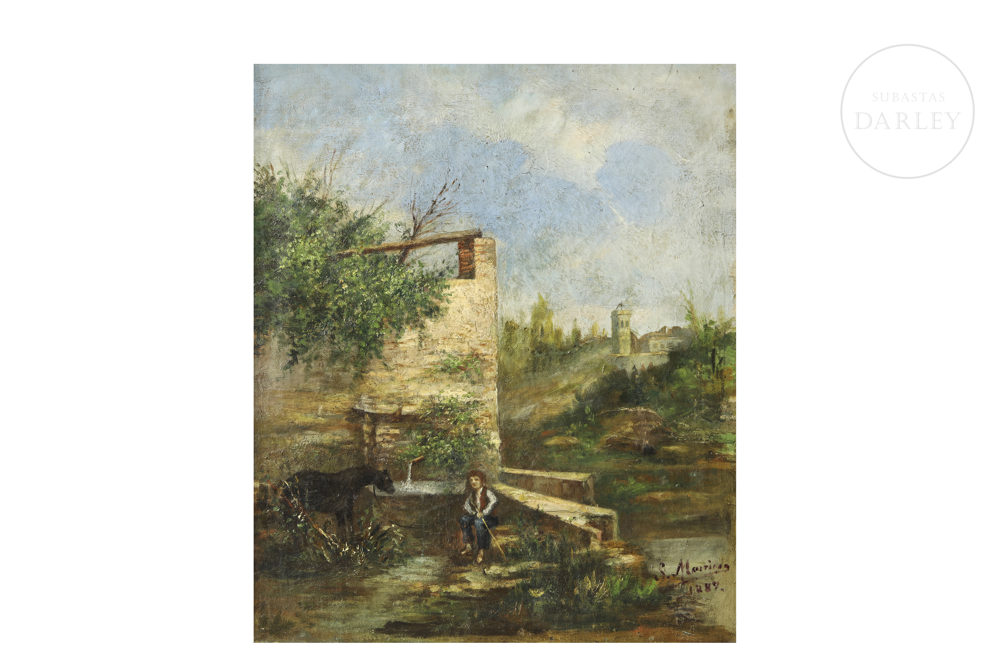 Oil on canvas. Depicts a rural scene with a peasant figure next to a horse in the foreground, with an ivy-covered wall and a village landscape in the background. Signed and dated in the lower right corner.