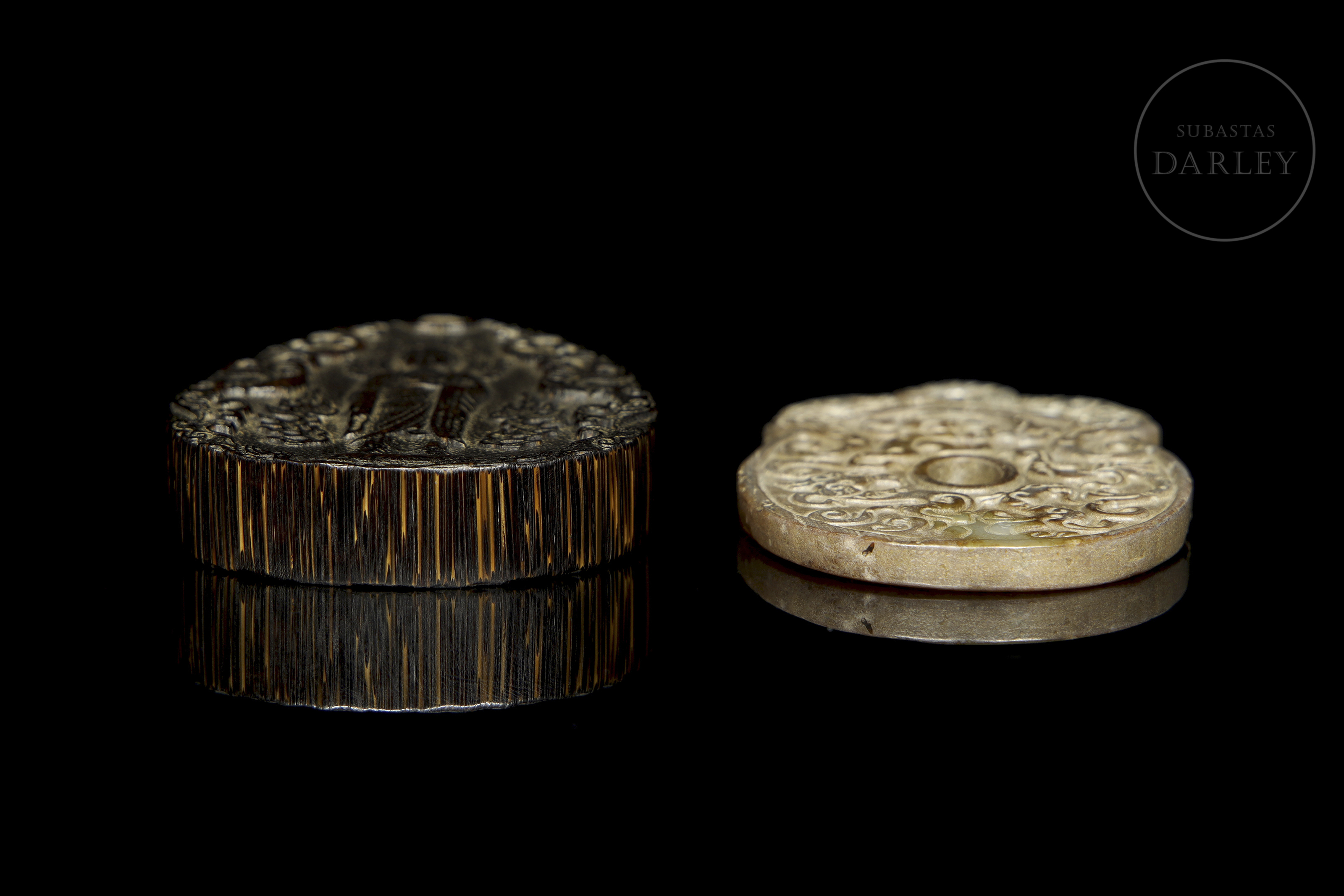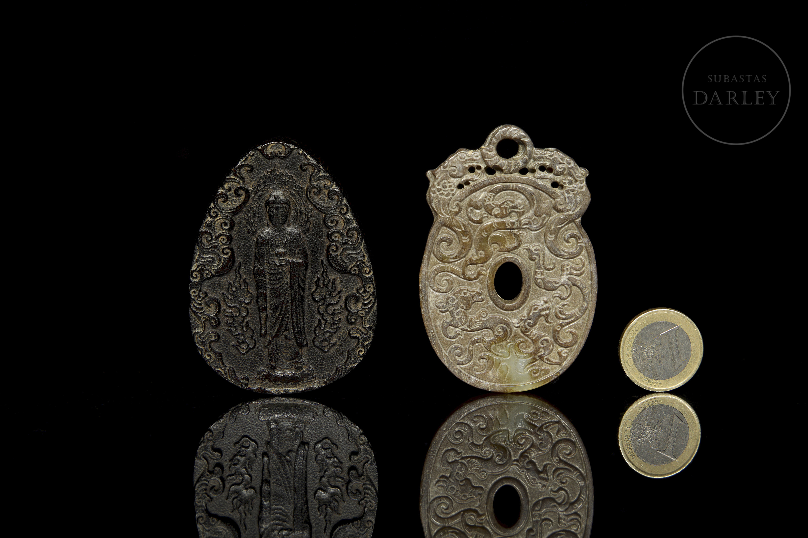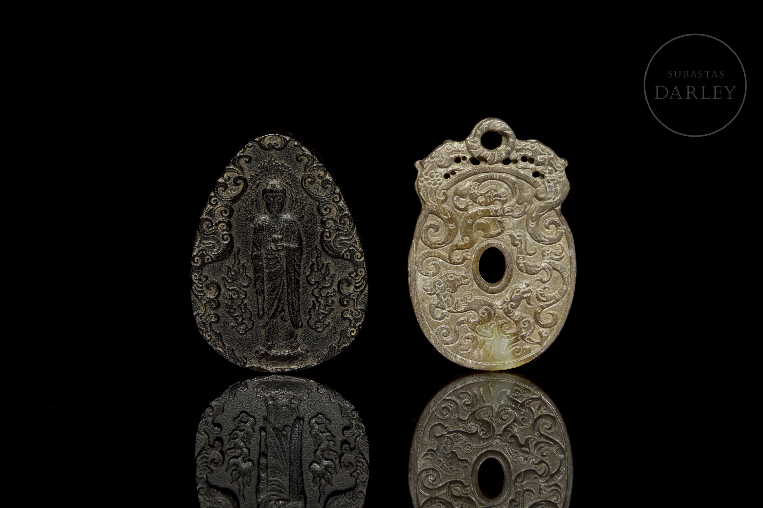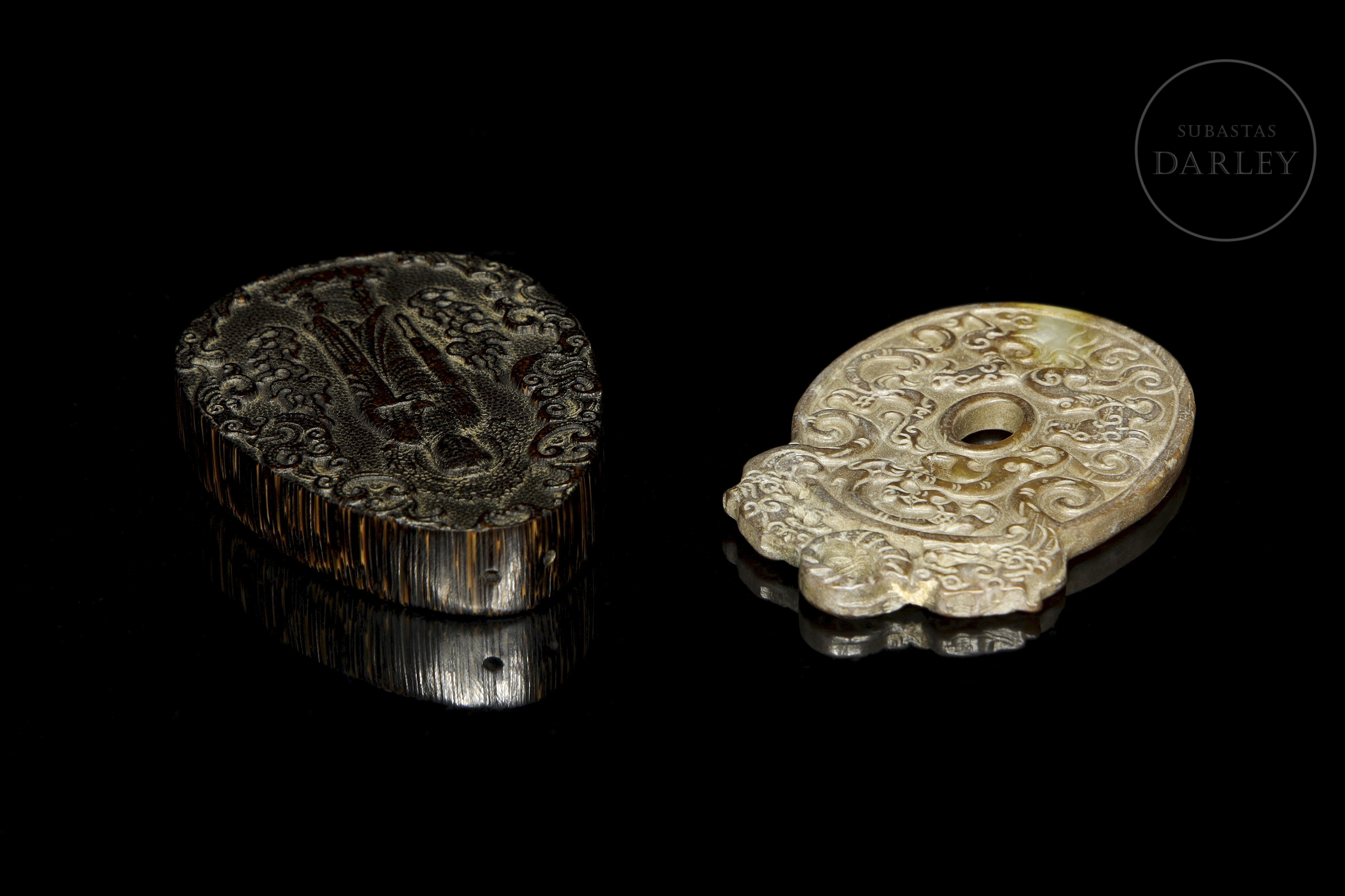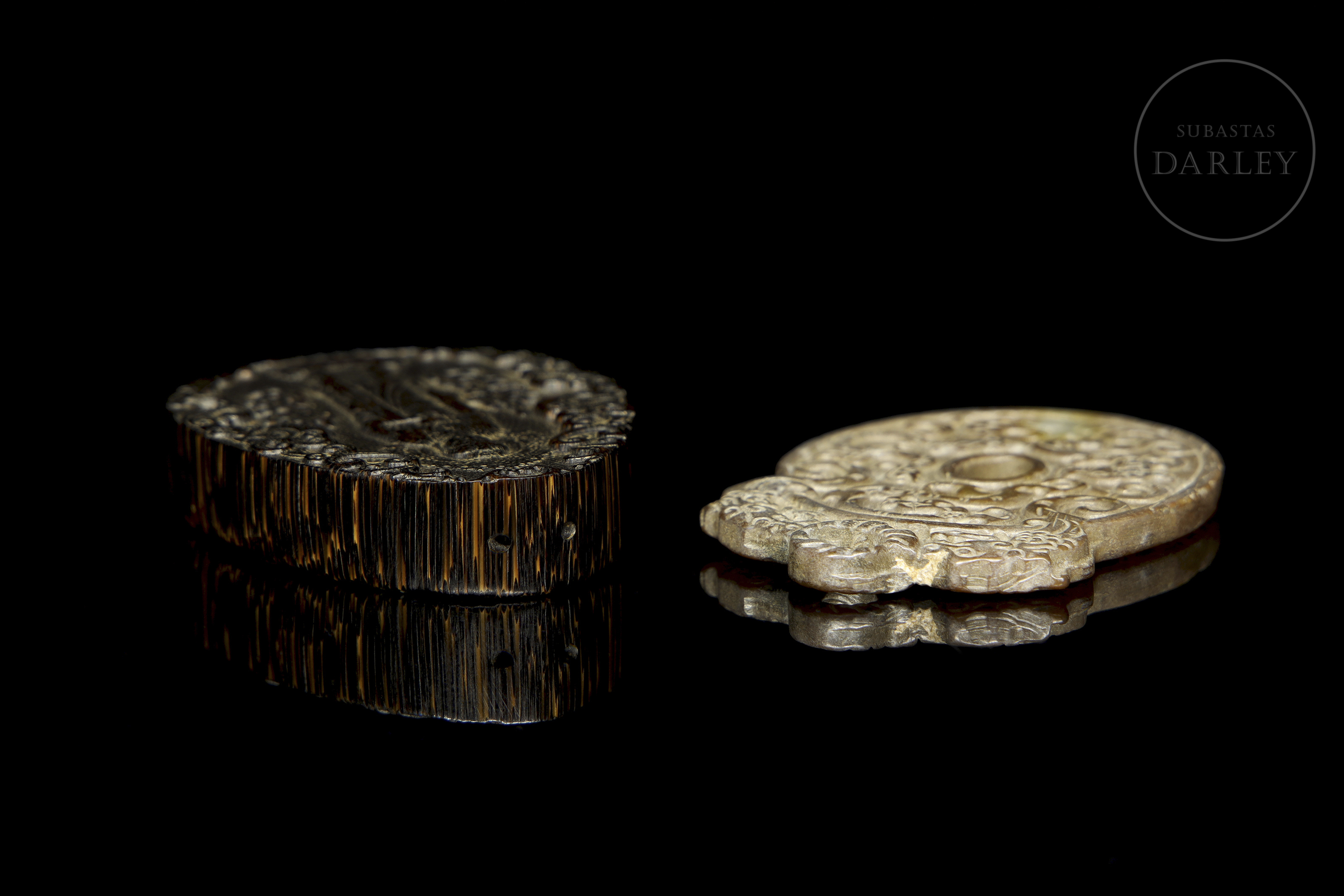 两块雕刻的牌匾,风格迥异。第一块是深色鹿角牌匾,边缘饰有橙色纹理;其上浮雕着一位神祇,身处火焰构成的椭圆光环中,手中持物。第二块牌匾由米色天然斑点石材制成,饰有精美的浮雕,刻画着古朴的盘旋龙纹。