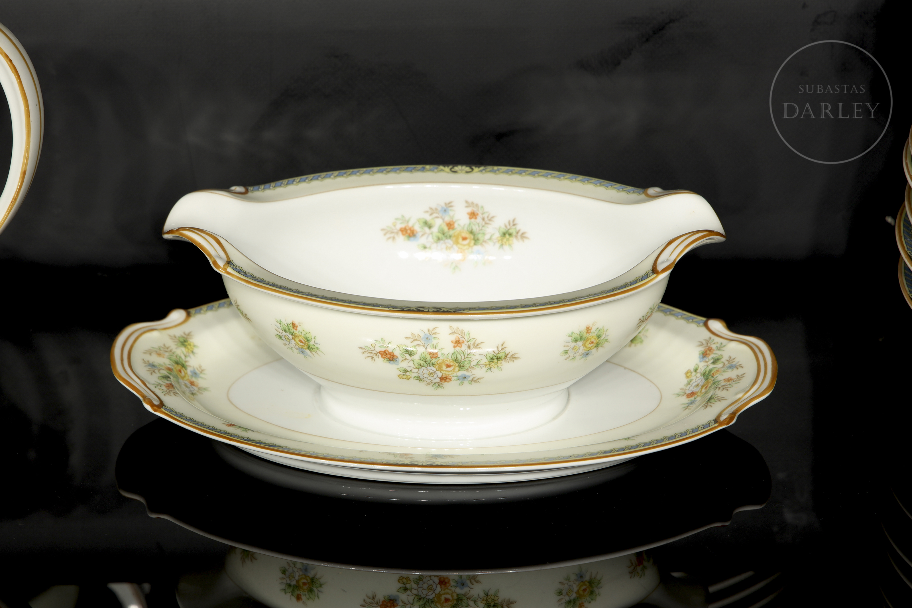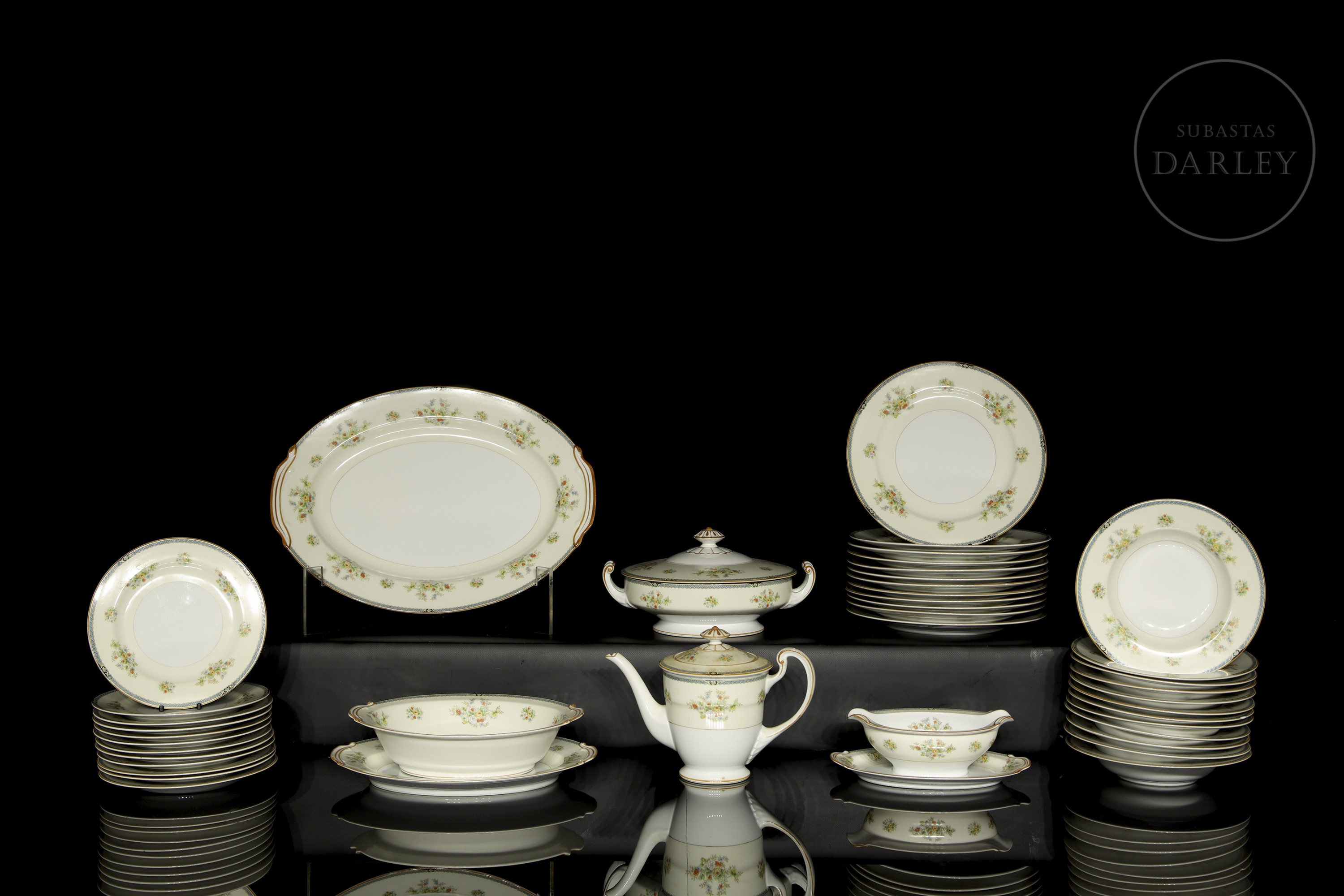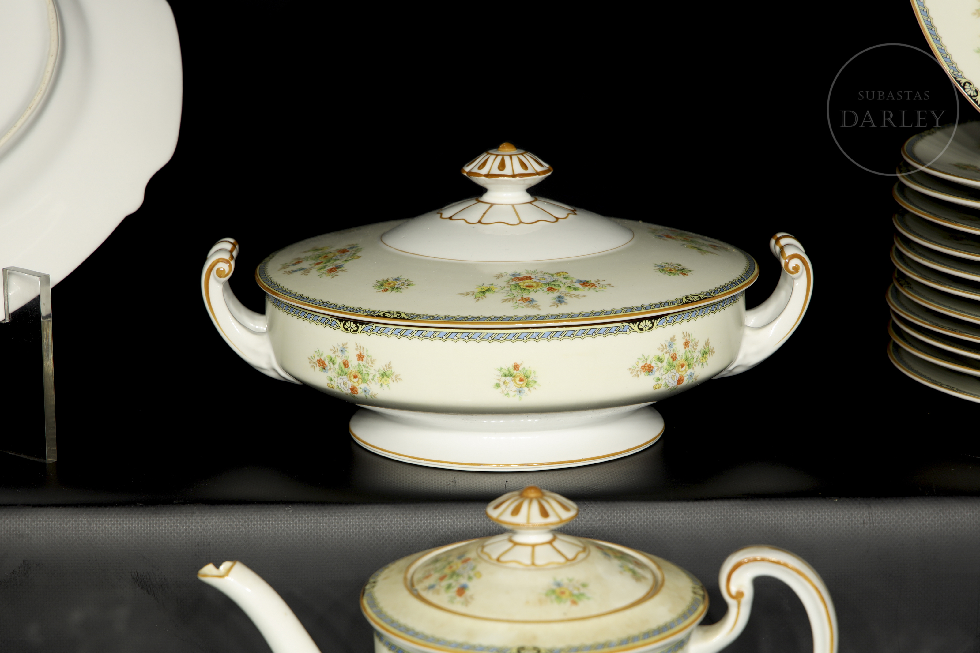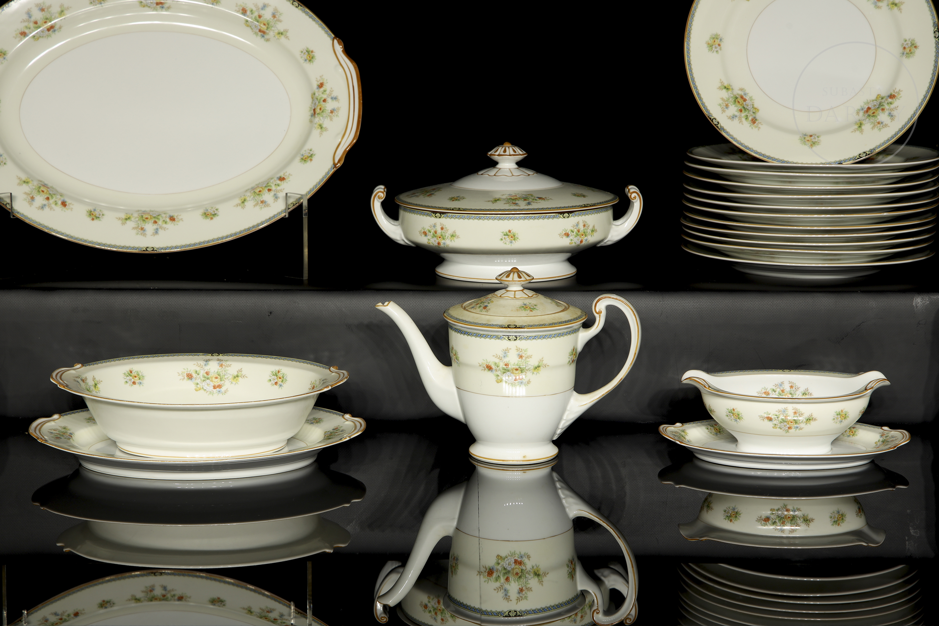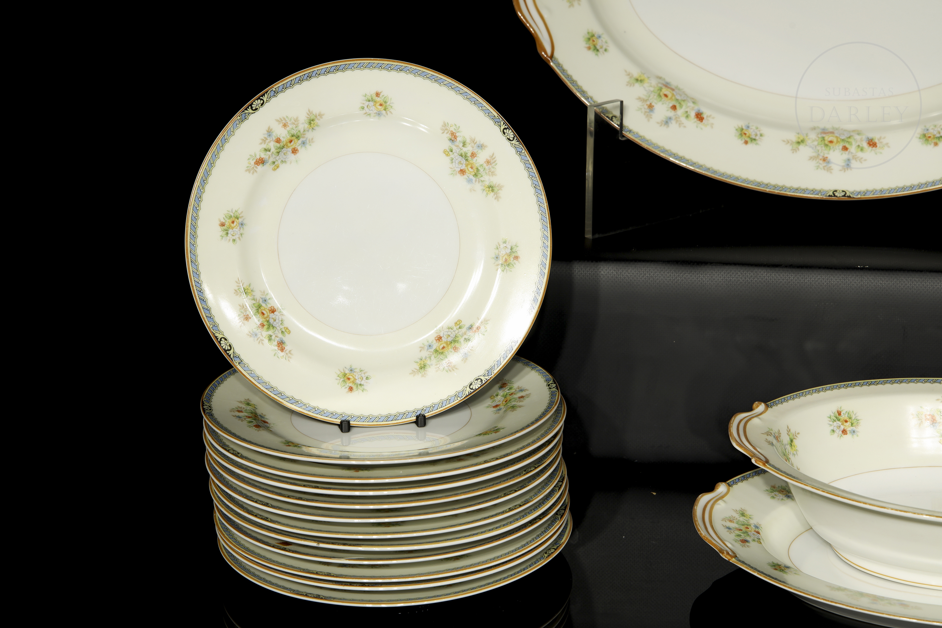 全套日本瓷器餐具(玫瑰瓷),含36只餐盘及各类盛器(水壶、汤盅、调味碟及托盘)。装饰以粉彩花束为主体,配以蓝色几何边框,边缘饰以金边。