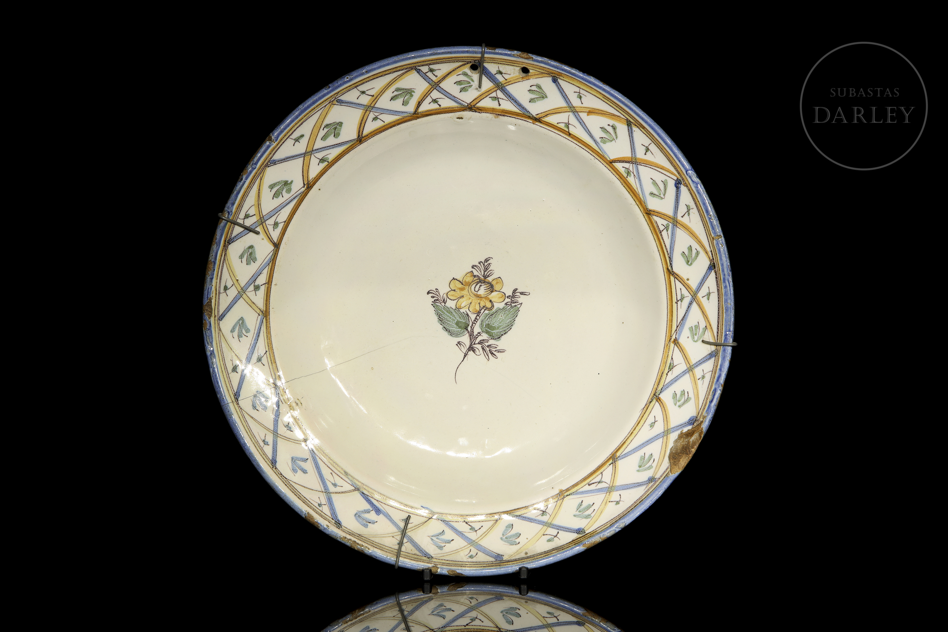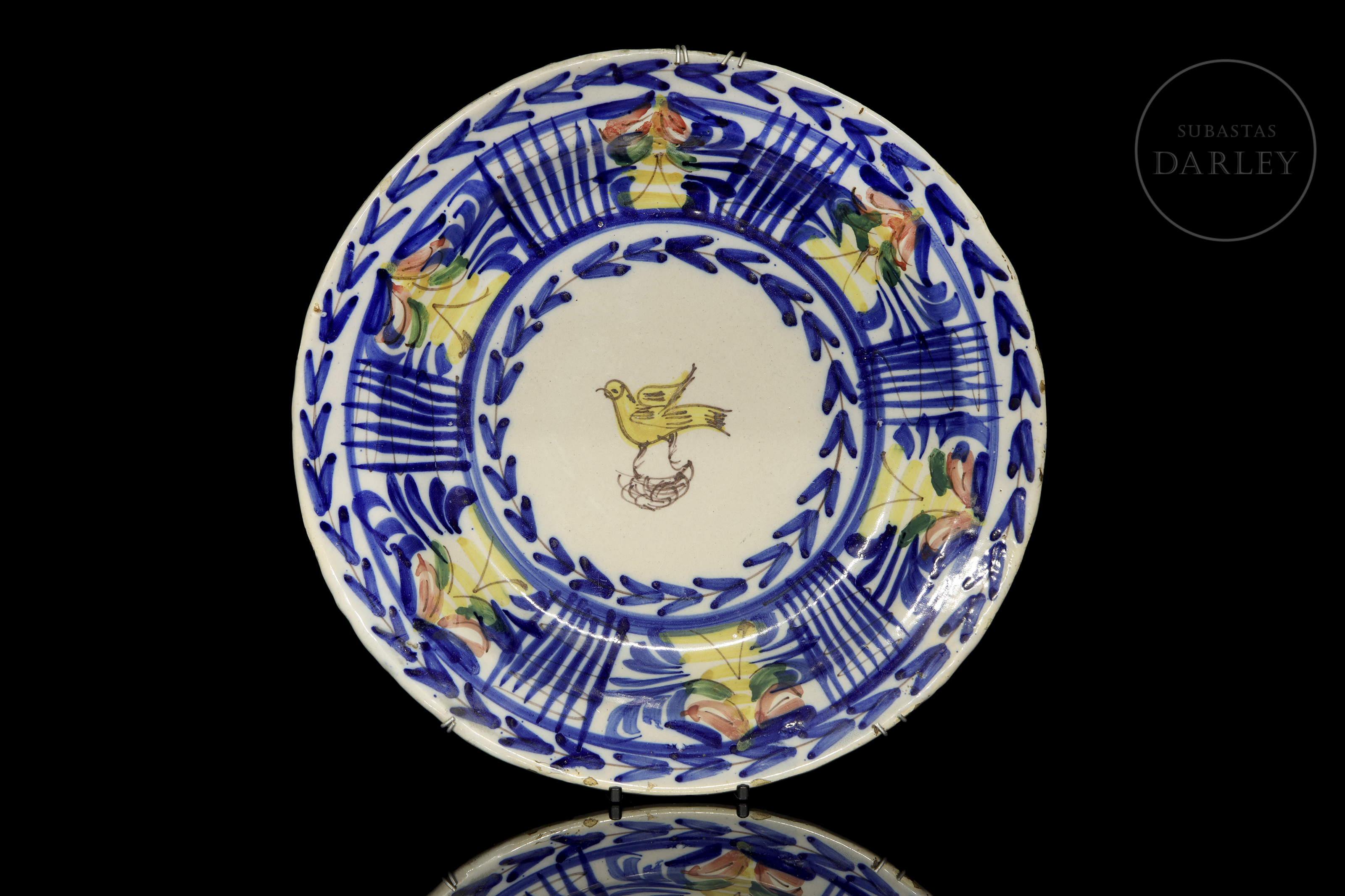 釉面陶瓷(马约利卡陶)。一套两件彩绘装饰盘及一件素面深碗。盘面饰以蓝、赭、绿三色,绘有鸟类纹样与几何网格图案。