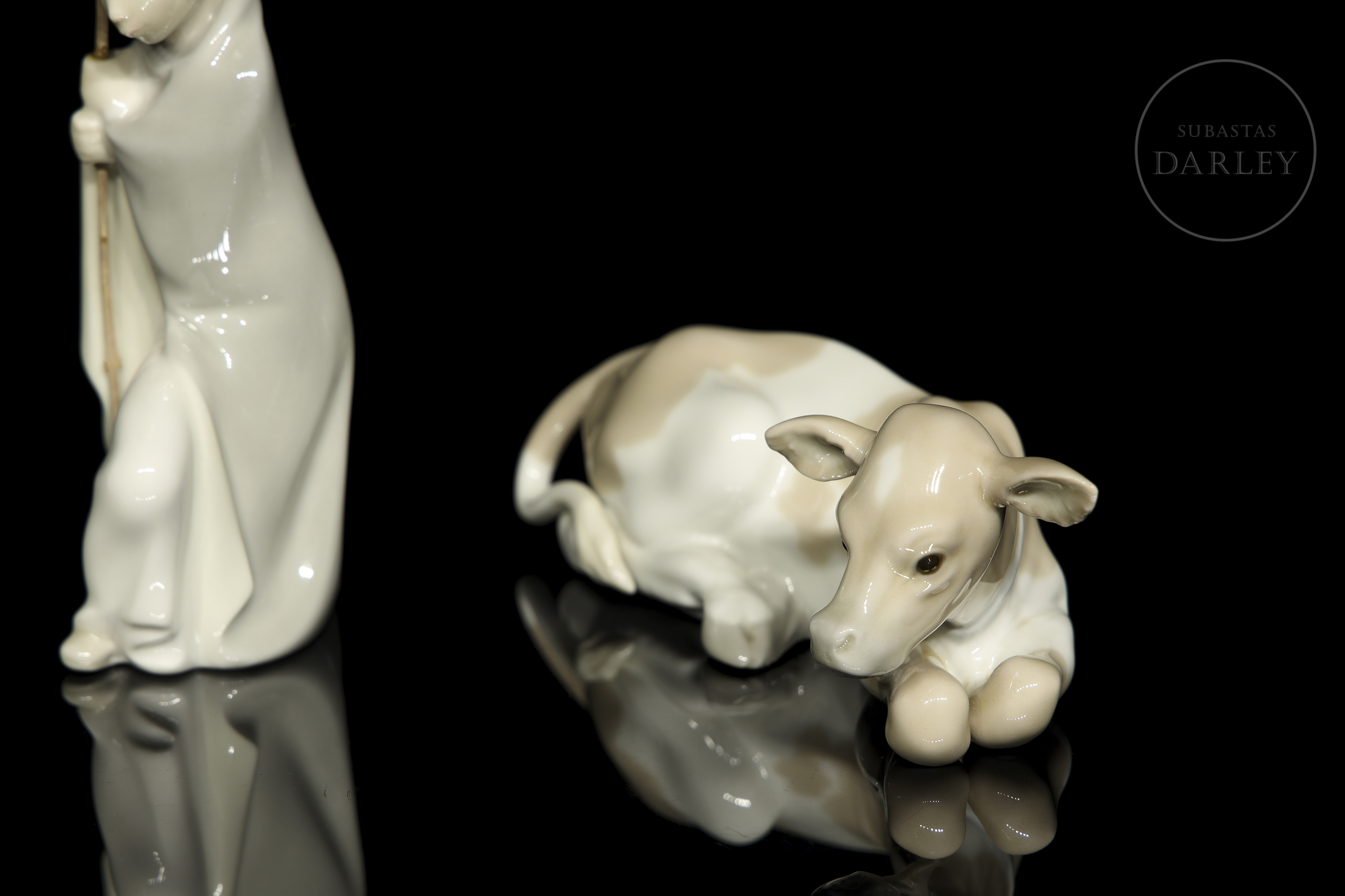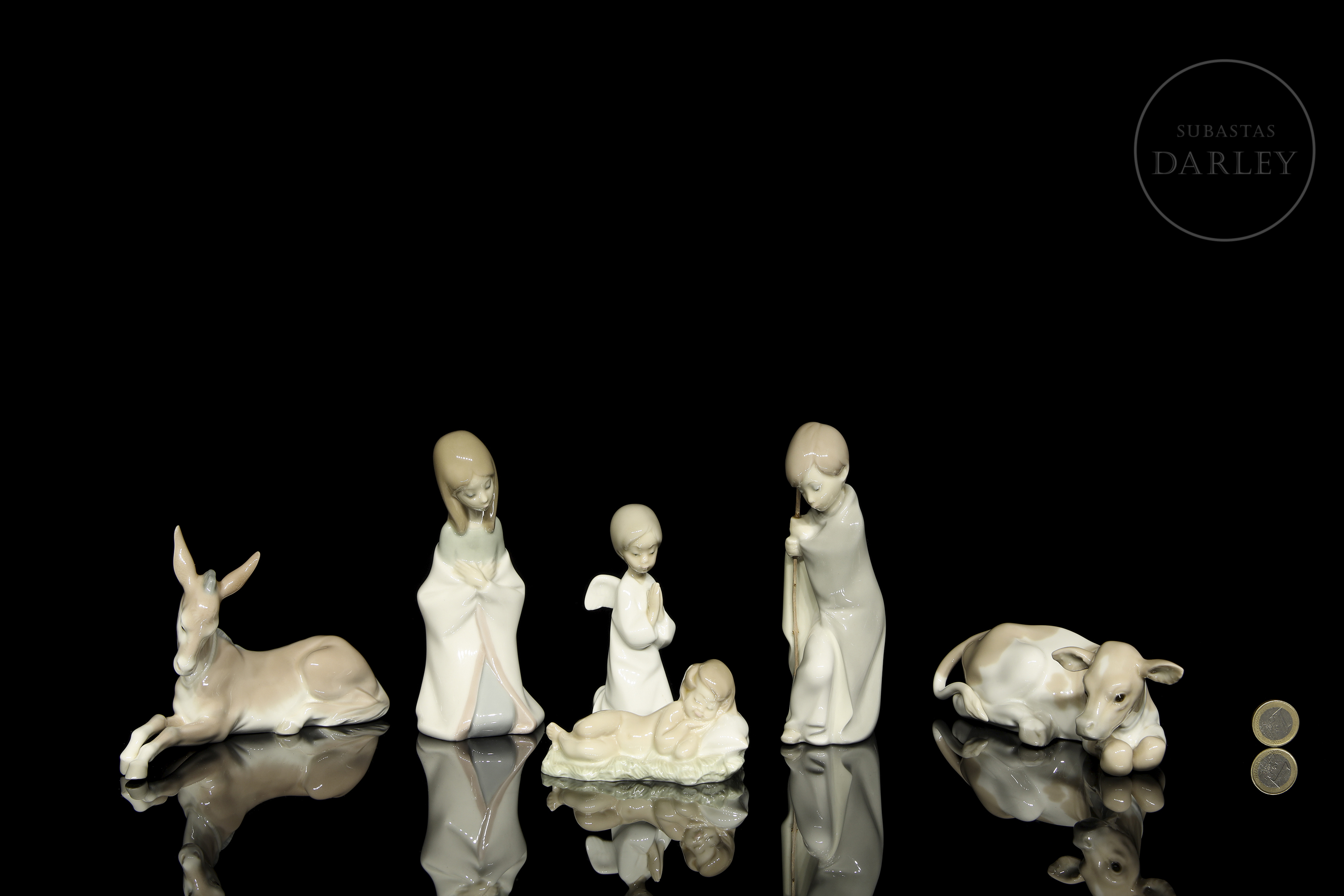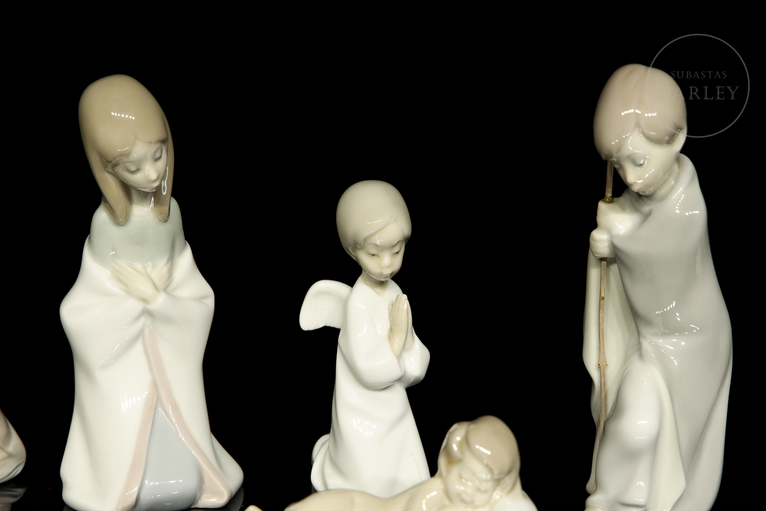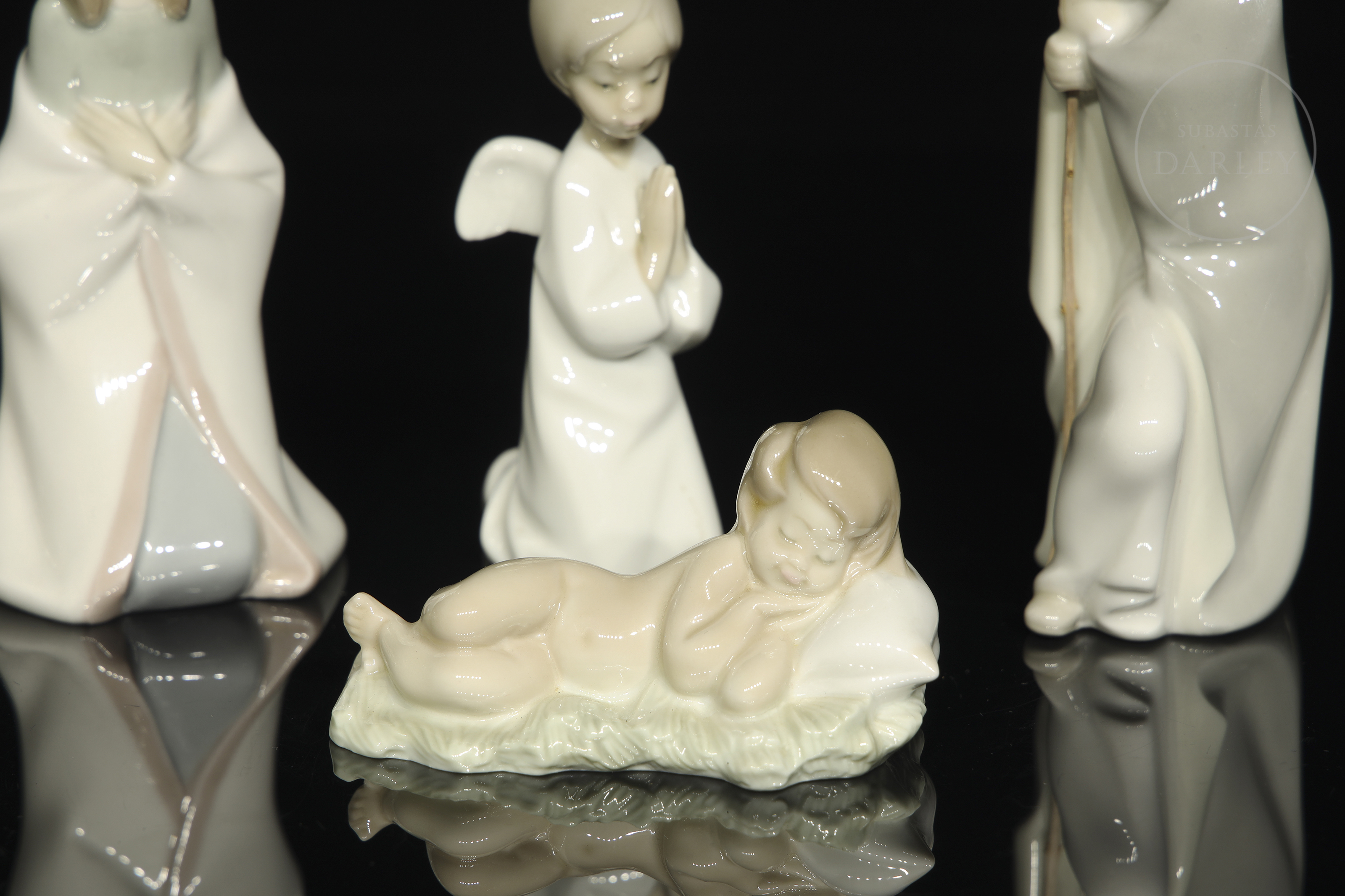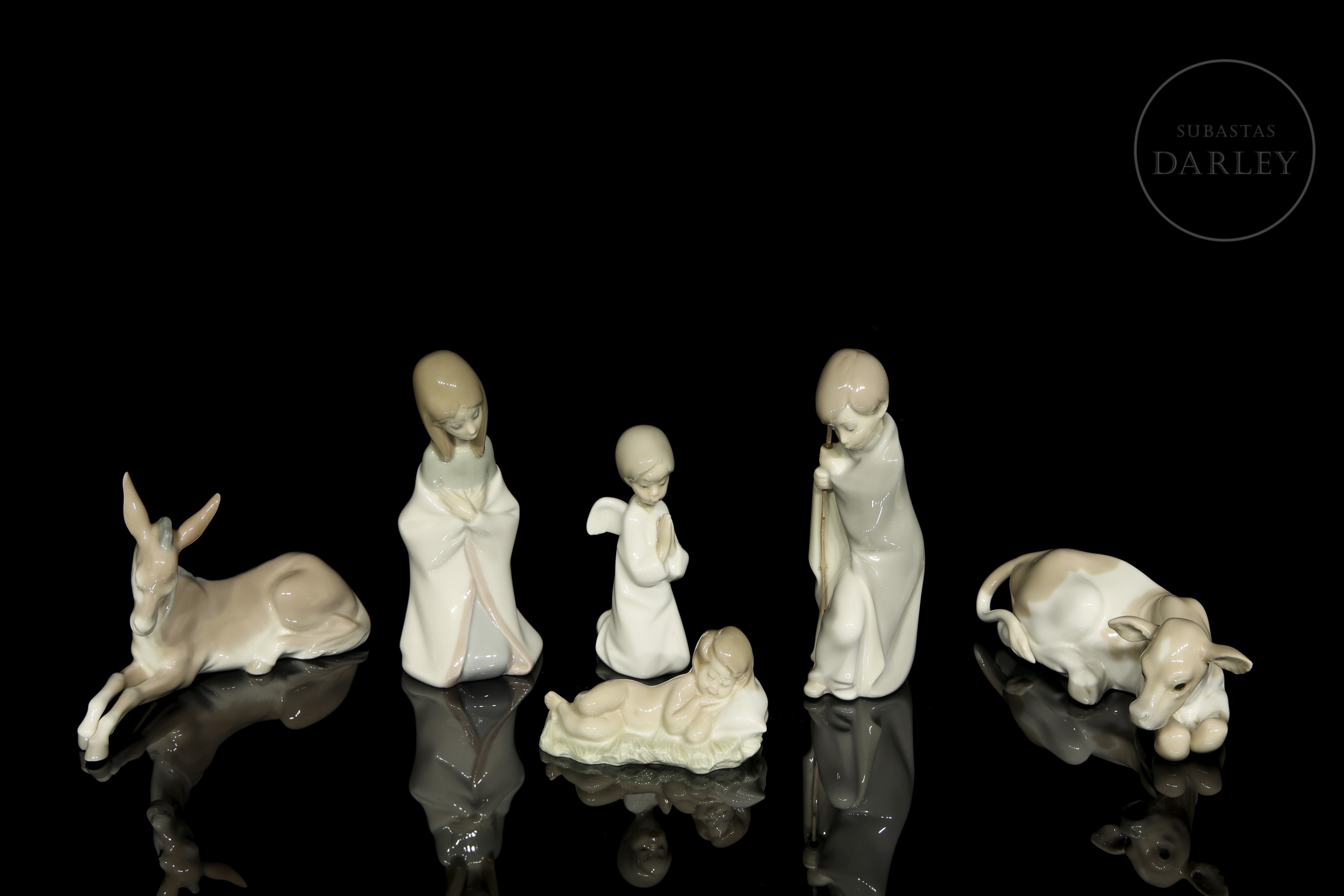 釉面瓷器。套装包含圣婴耶稣、圣约瑟、圣母玛利亚、小天使、骡子与牛。底座带有制造商标记。