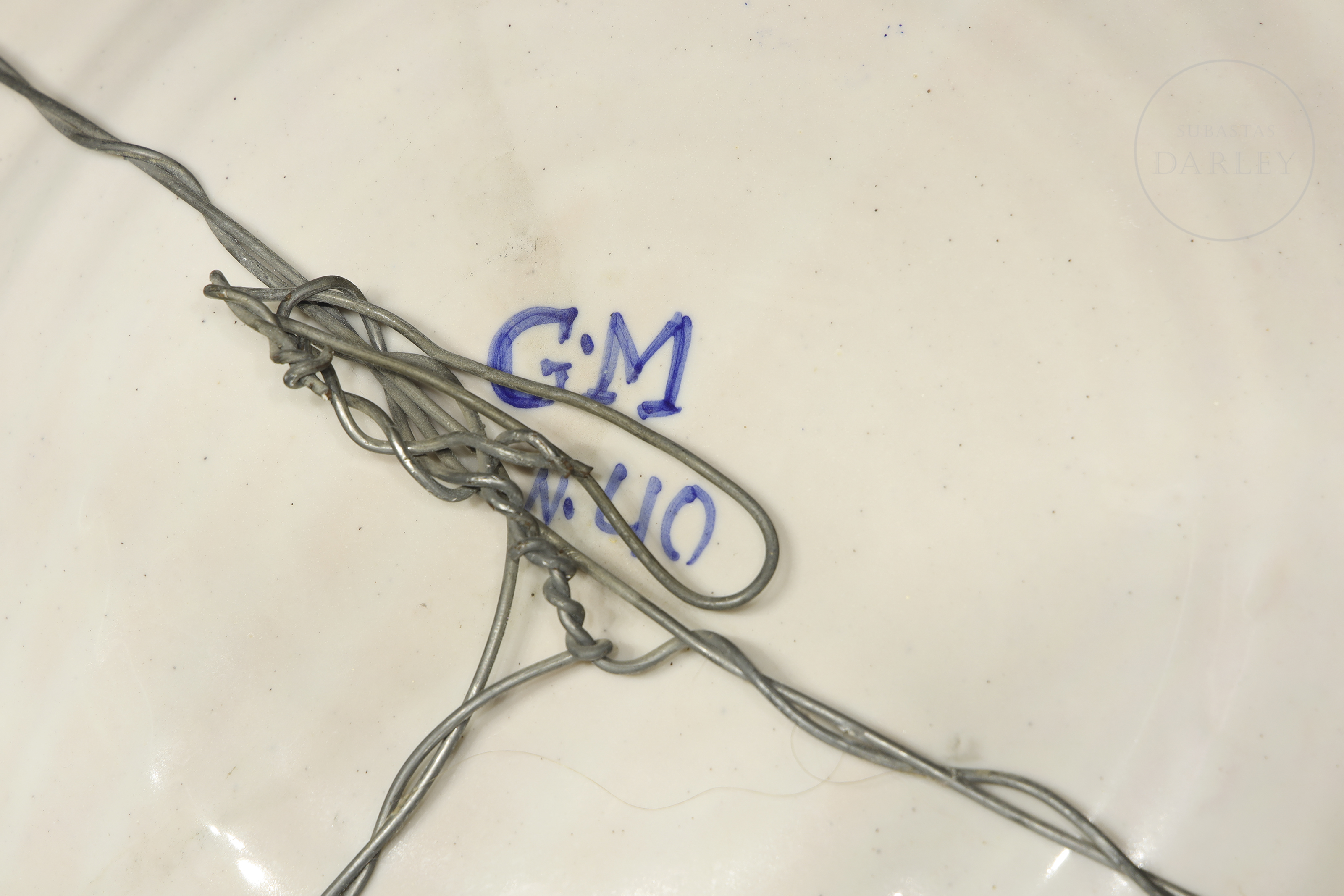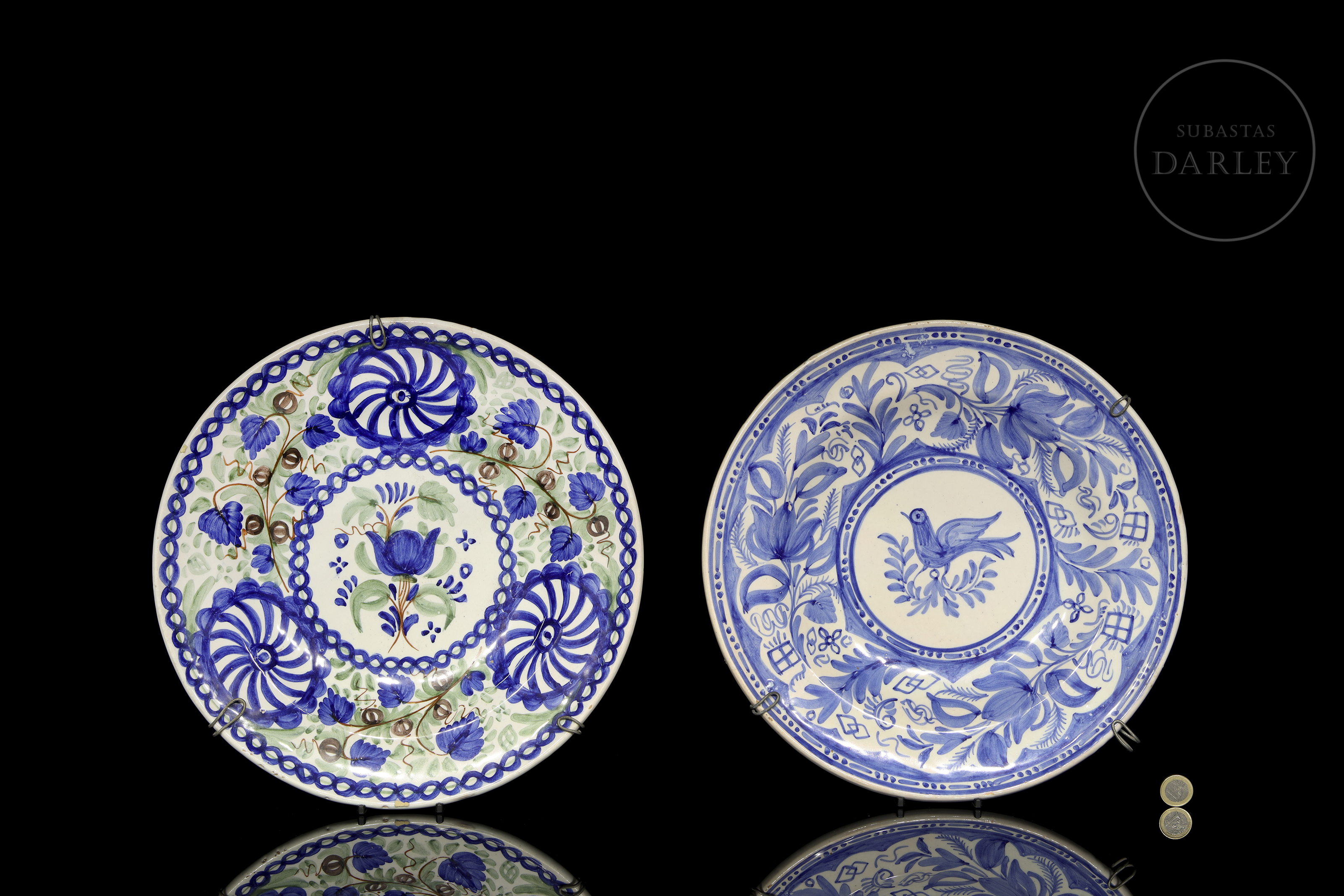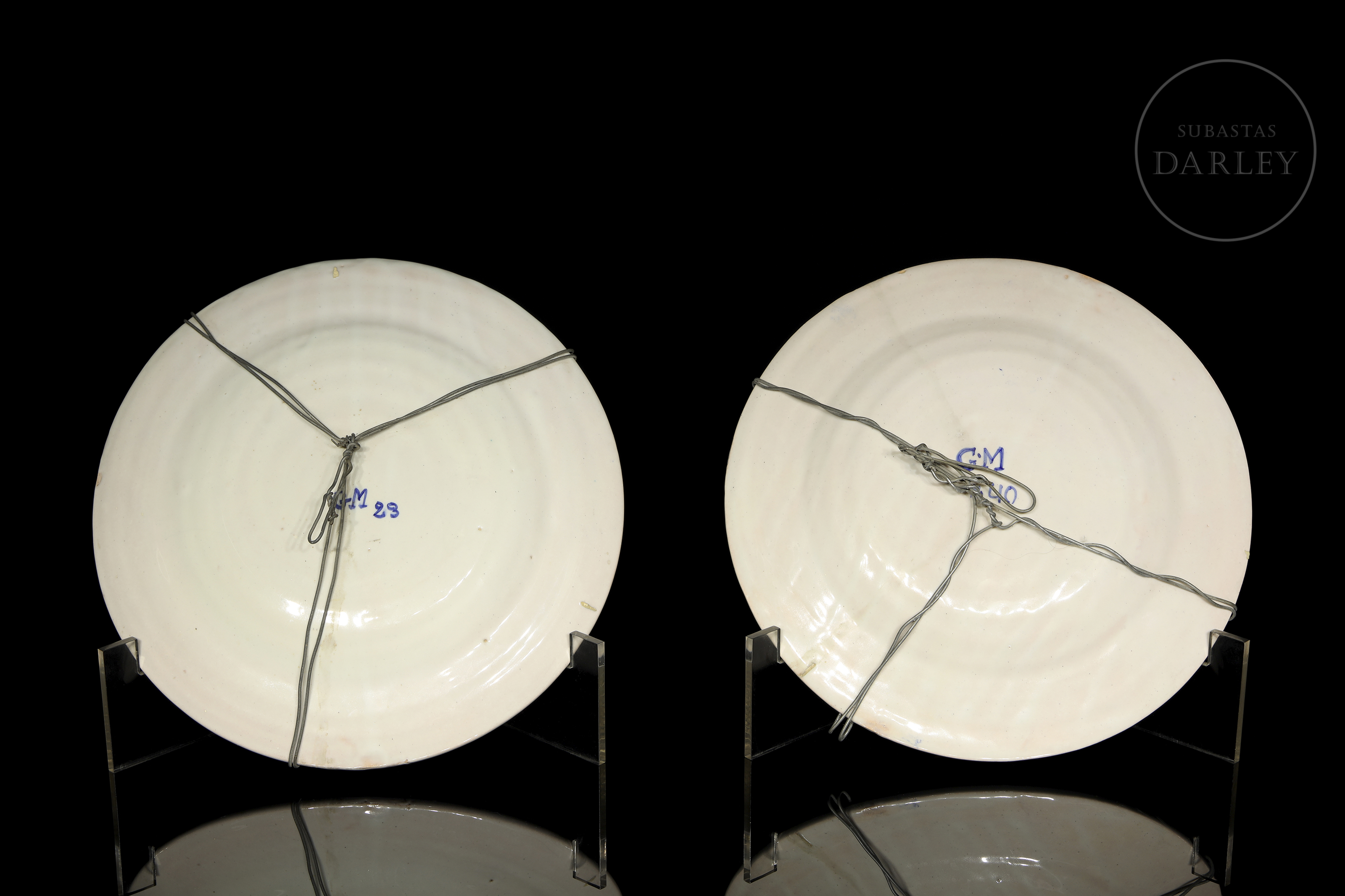 釉面陶瓷(马约利卡瓷)。两只装饰盘采用传统瓦伦西亚风格,以钴蓝与绿色装饰于白色底上。其一饰有风车与花卉纹样,其二中央绘鸟,背景为植物纹饰。底面标有“G. M.”字样。