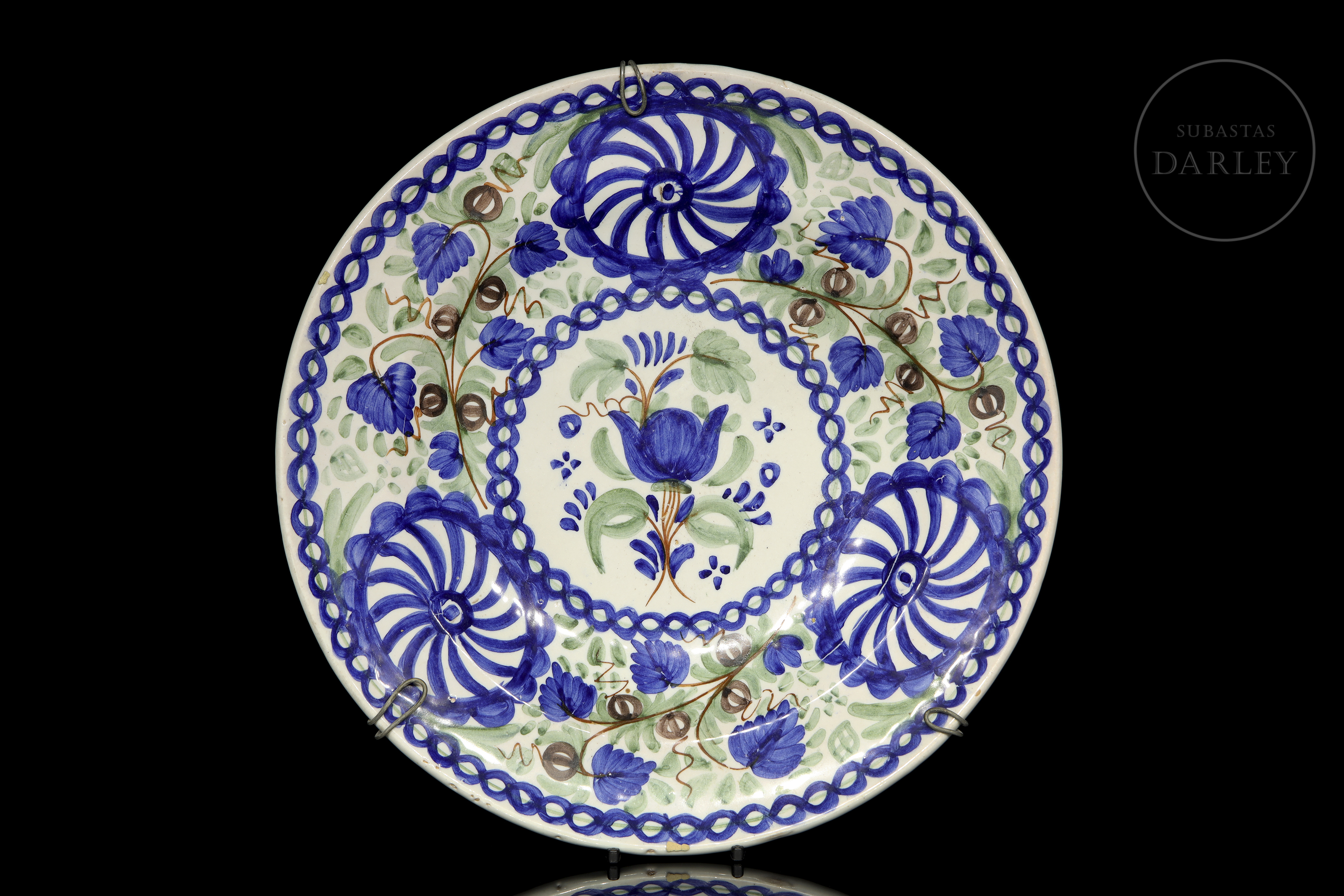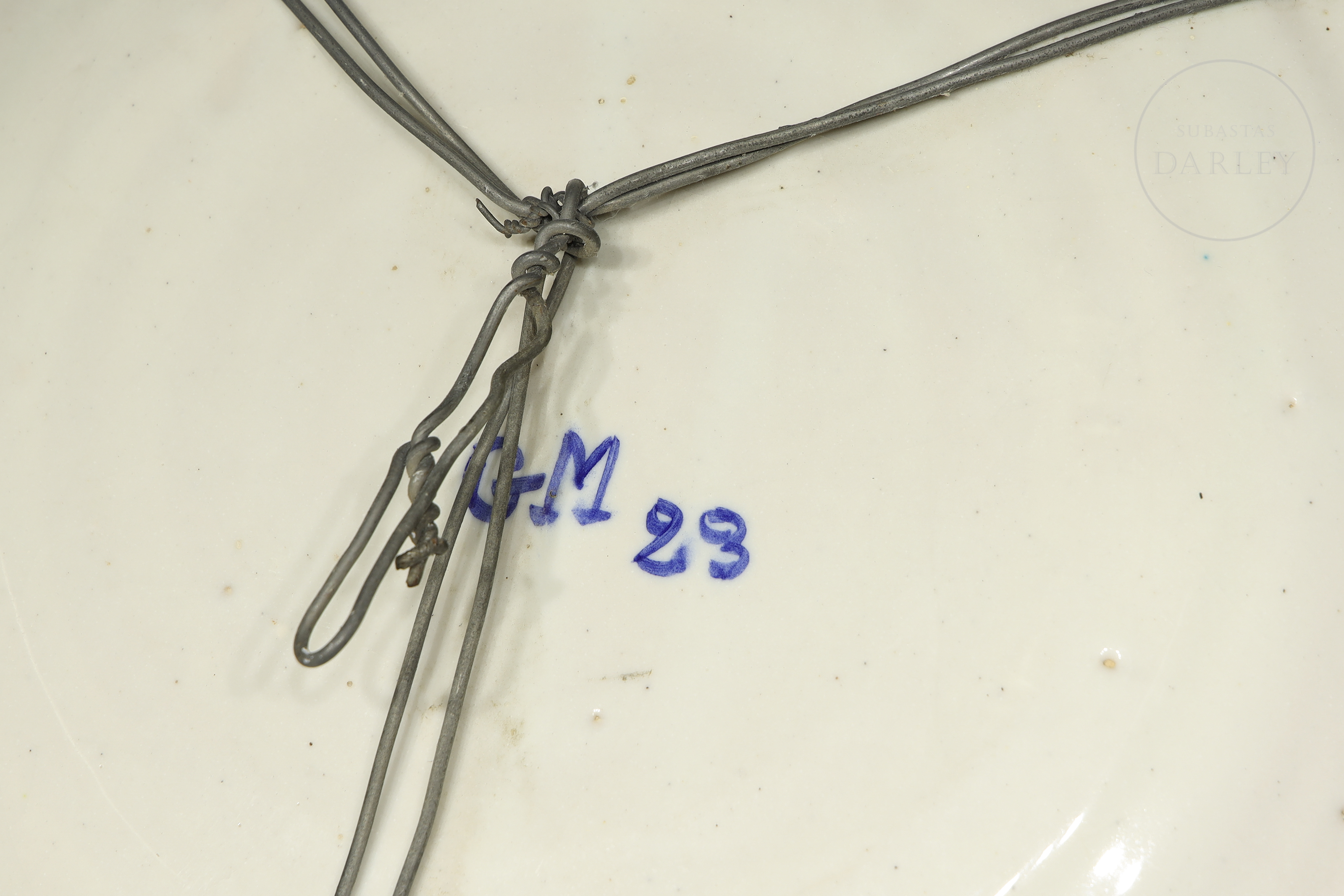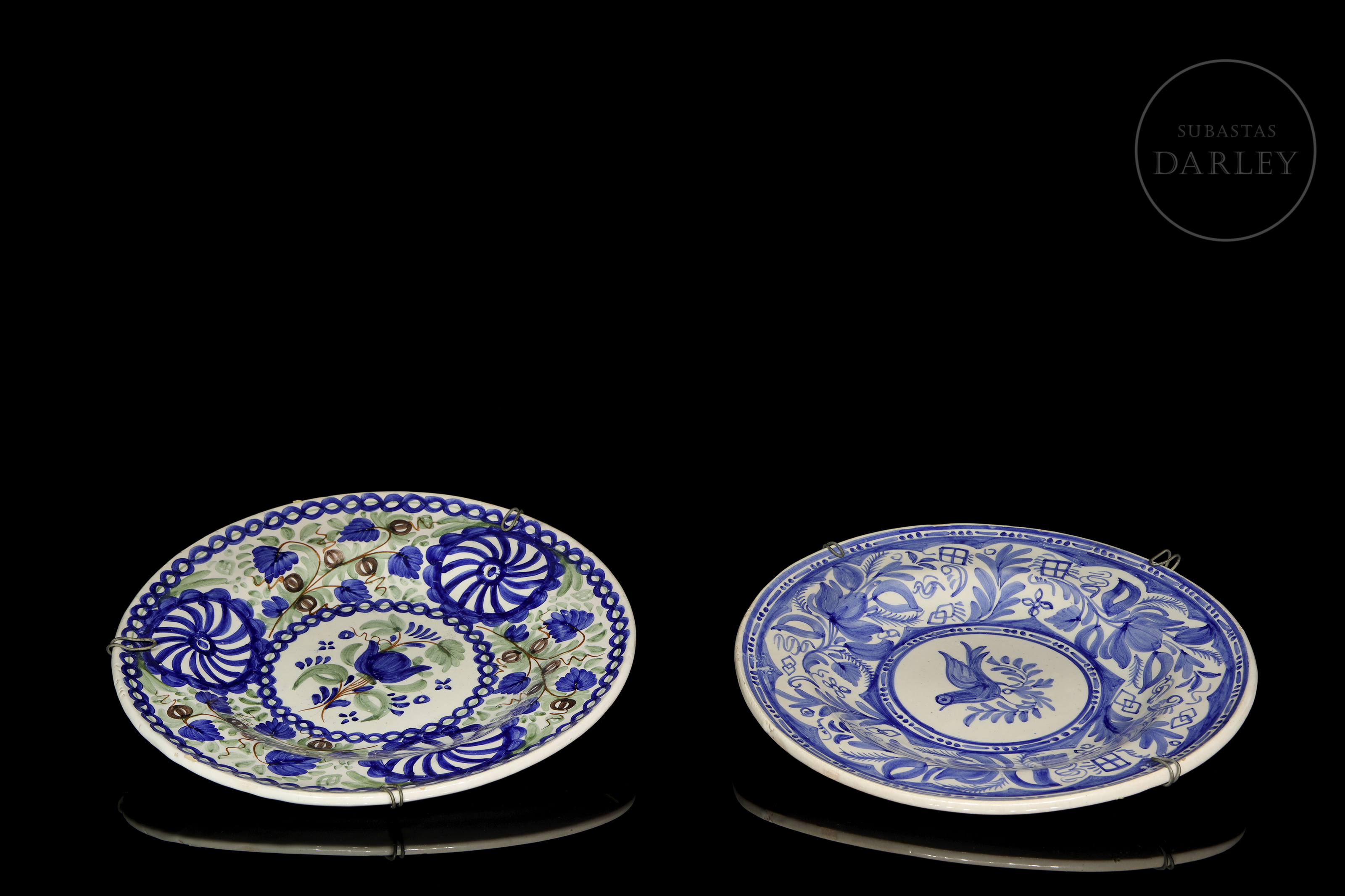 釉面陶瓷(马约利卡瓷)。两只装饰盘采用传统瓦伦西亚风格,以钴蓝与绿色装饰于白色底上。其一饰有风车与花卉纹样,其二中央绘鸟,背景为植物纹饰。底面标有“G. M.”字样。