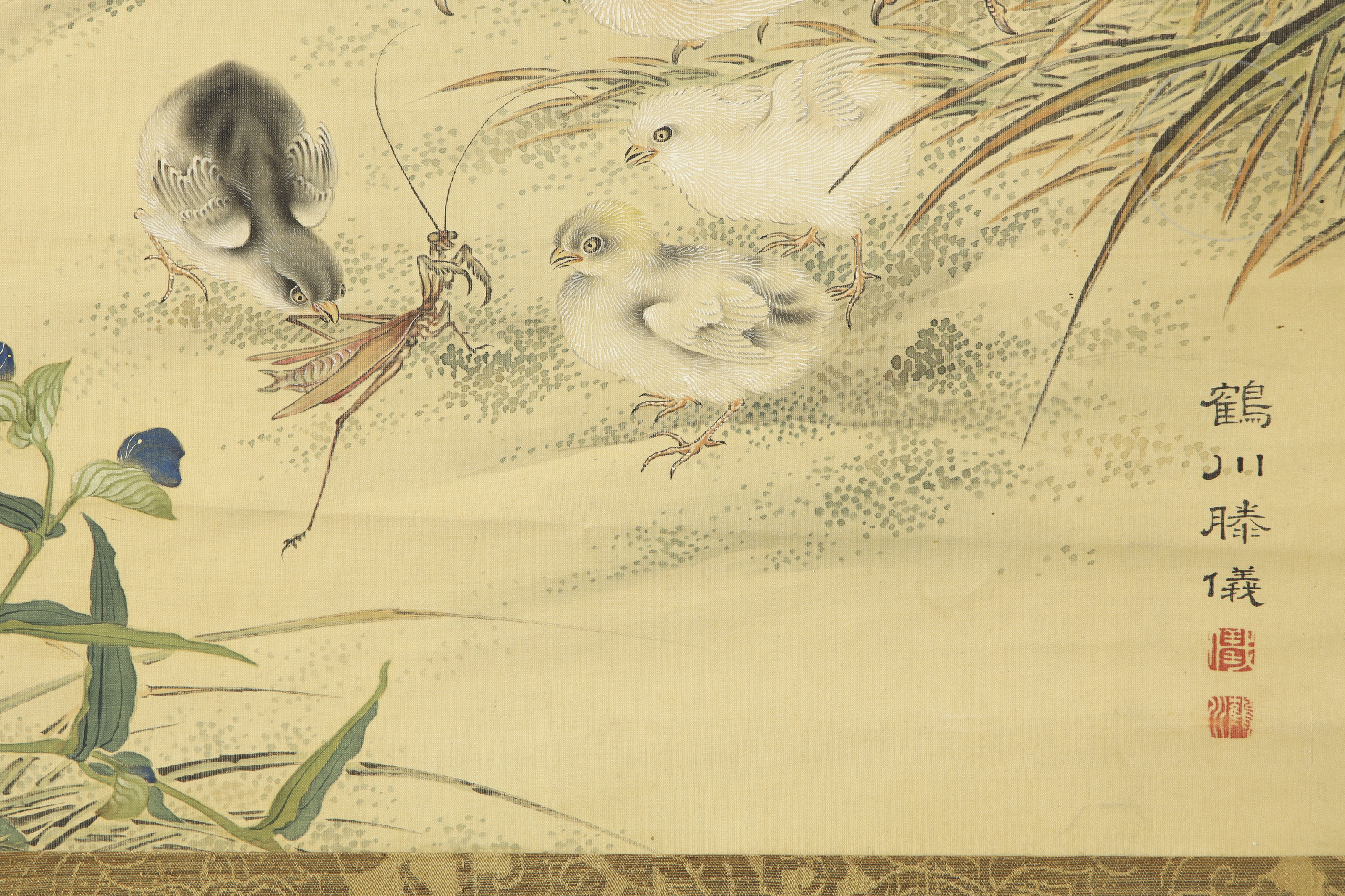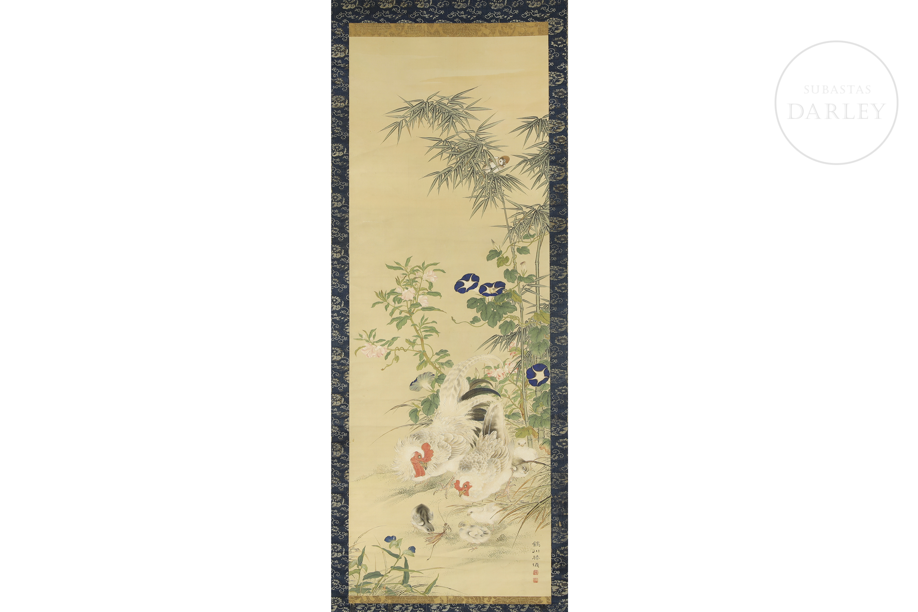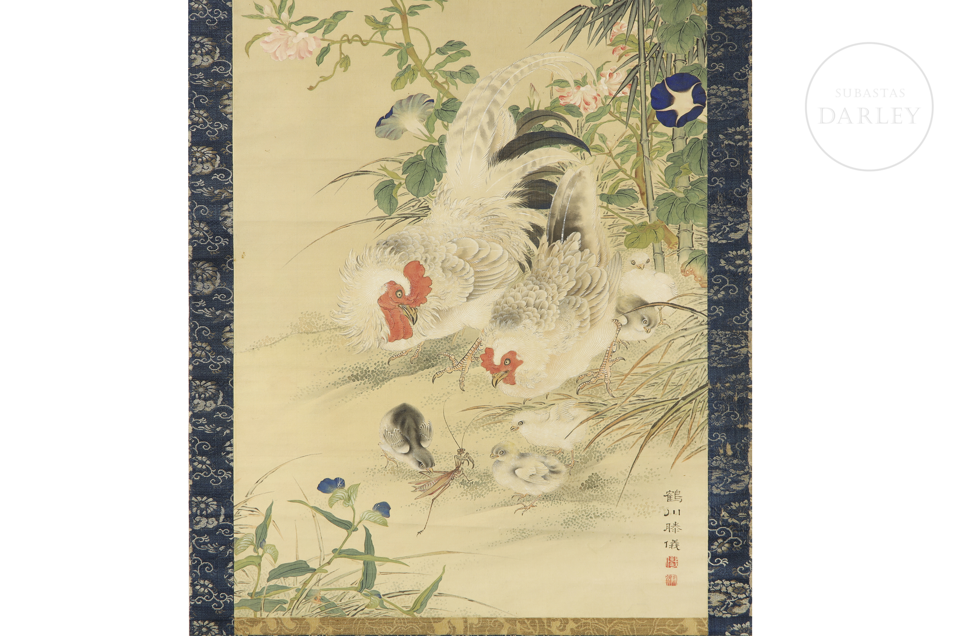 纸本水墨设色,裱于深蓝金丝框。画面描绘田园风光,竹篱野花间有母鸡携雏鸡成群。右下角有书法签名及艺术家两枚印章。