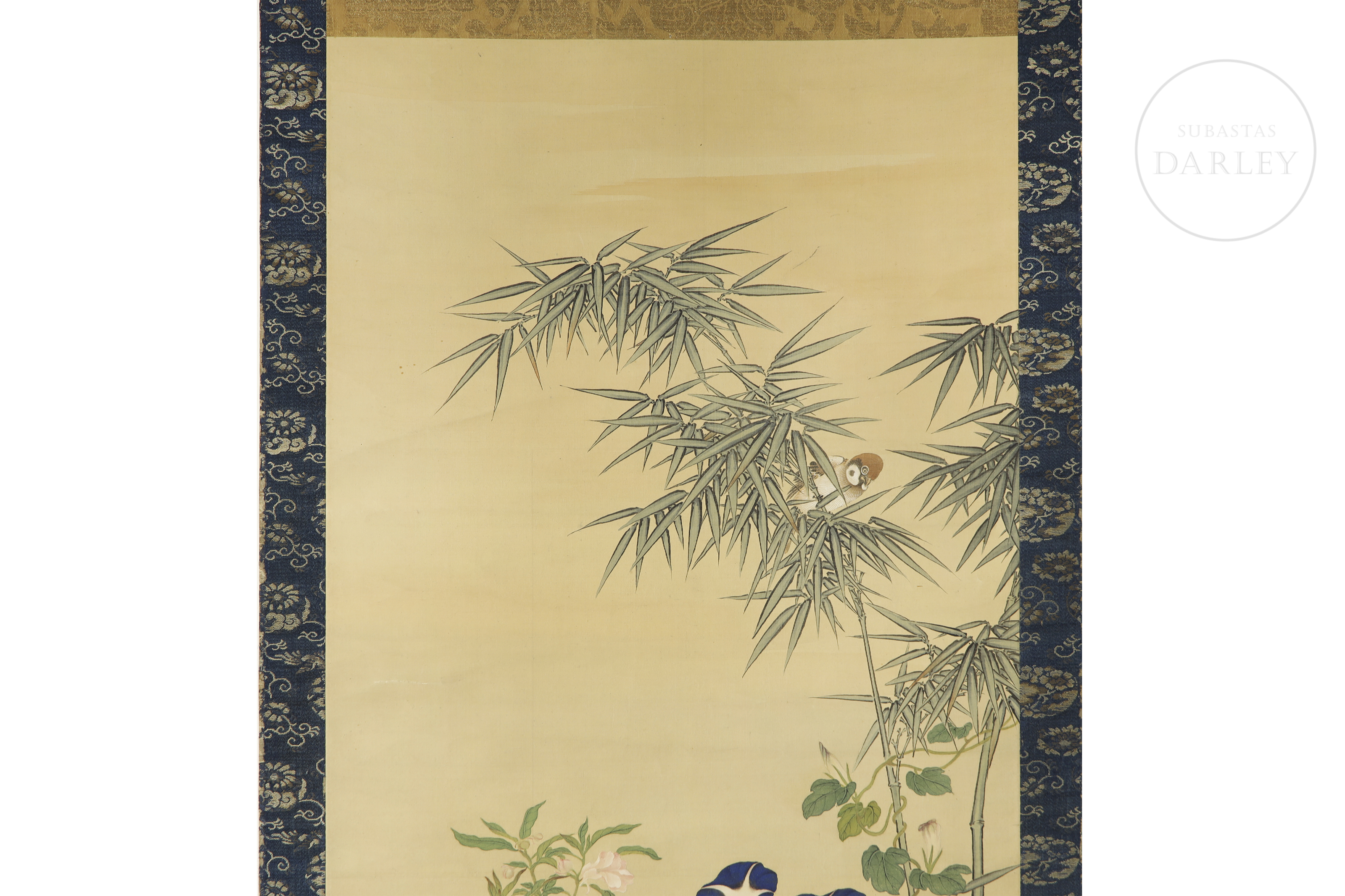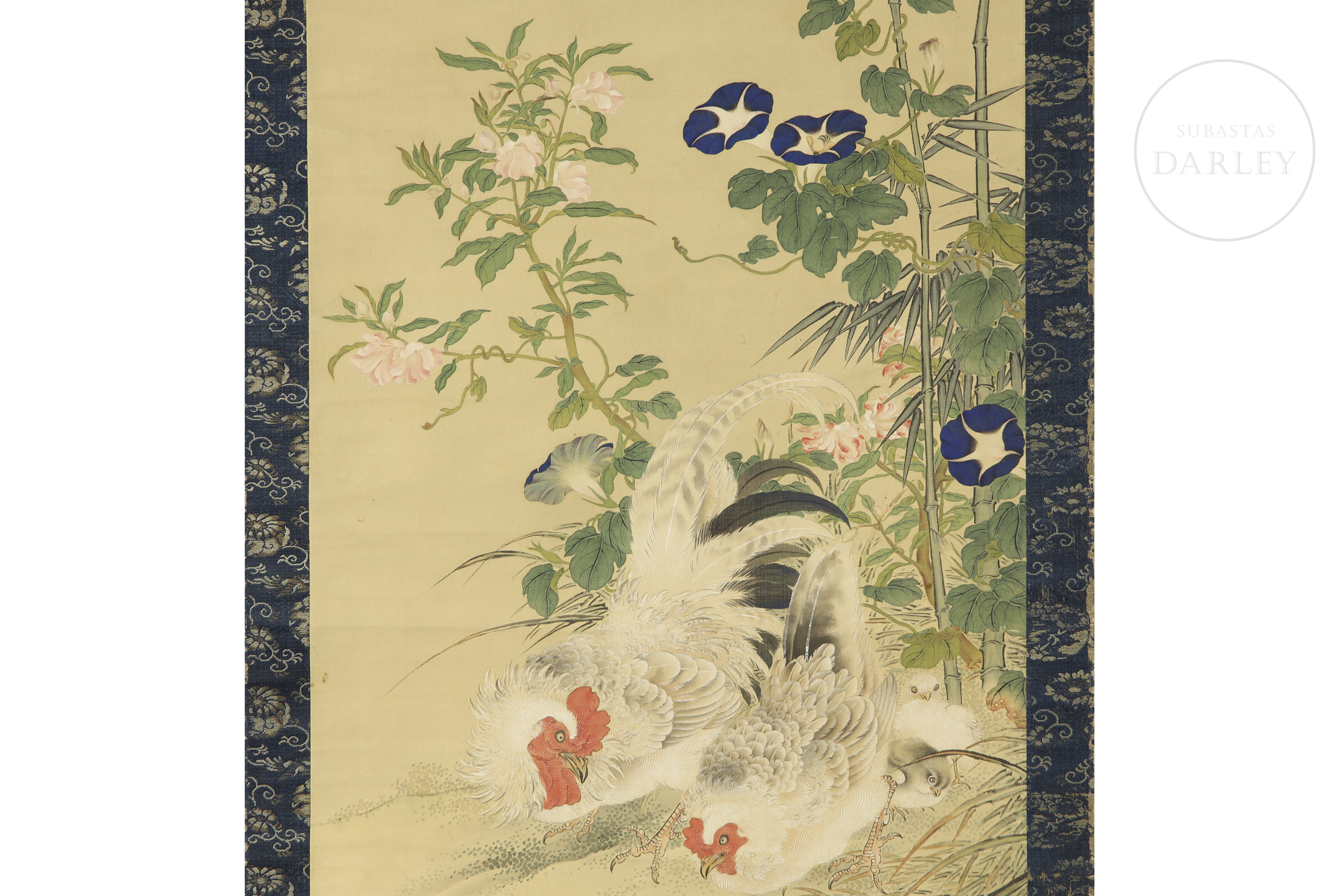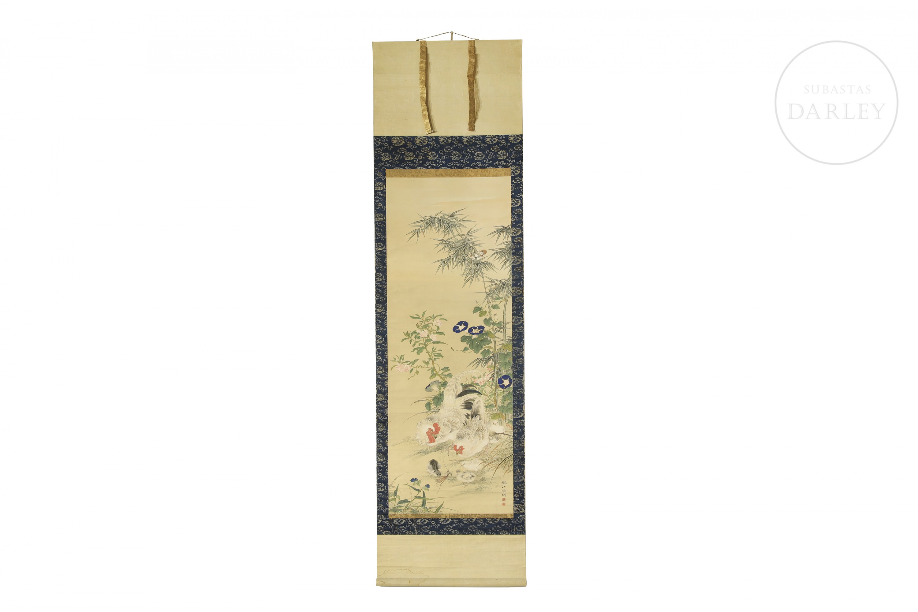 纸本水墨设色,裱于深蓝金丝框。画面描绘田园风光,竹篱野花间有母鸡携雏鸡成群。右下角有书法签名及艺术家两枚印章。